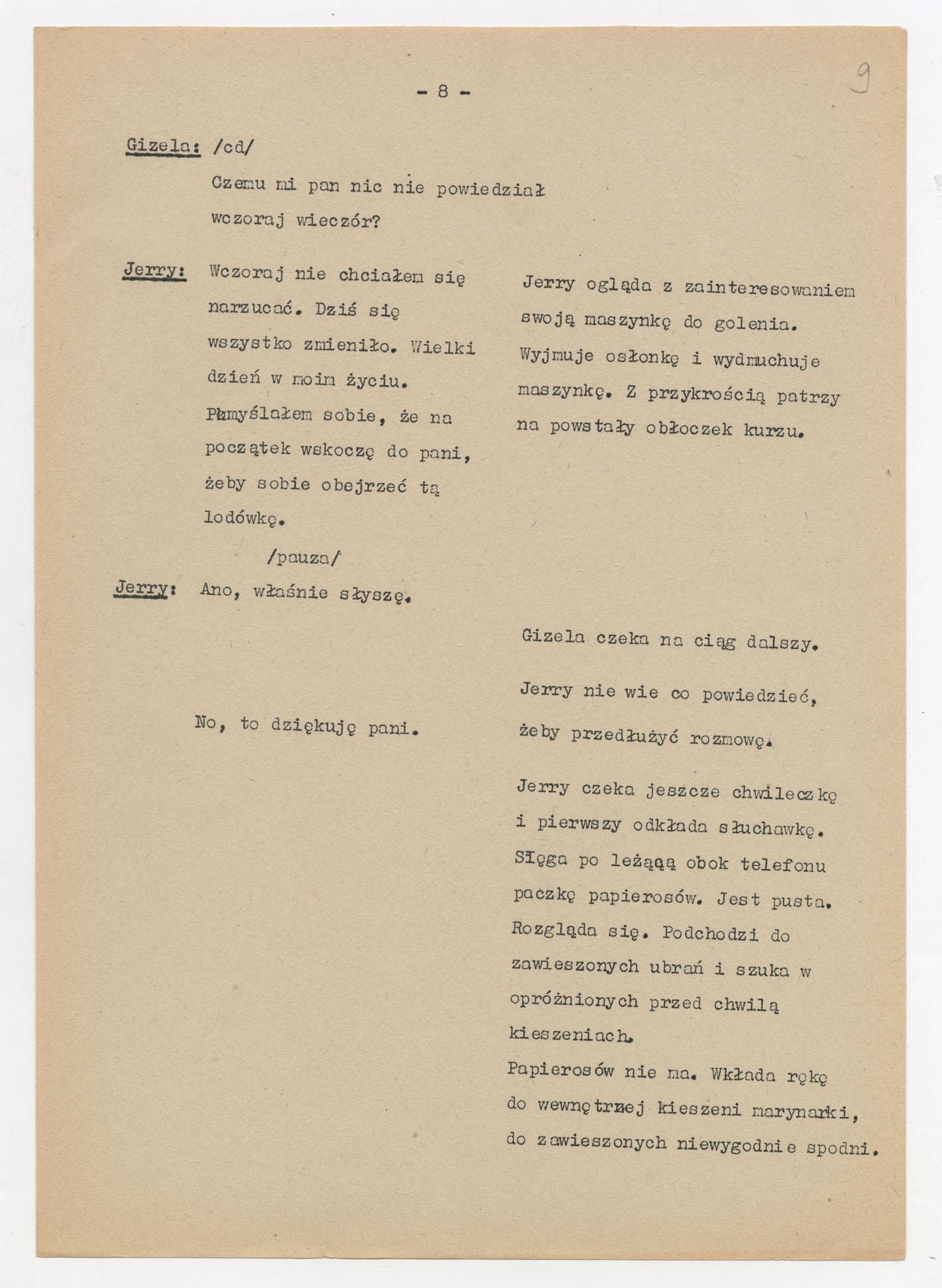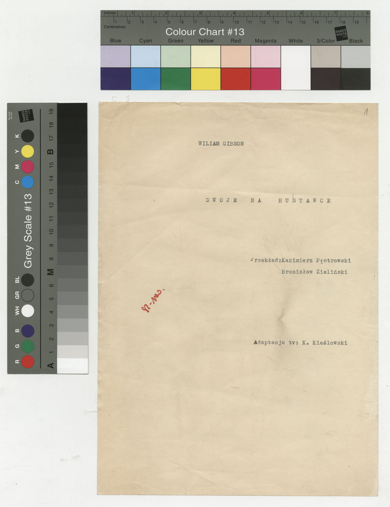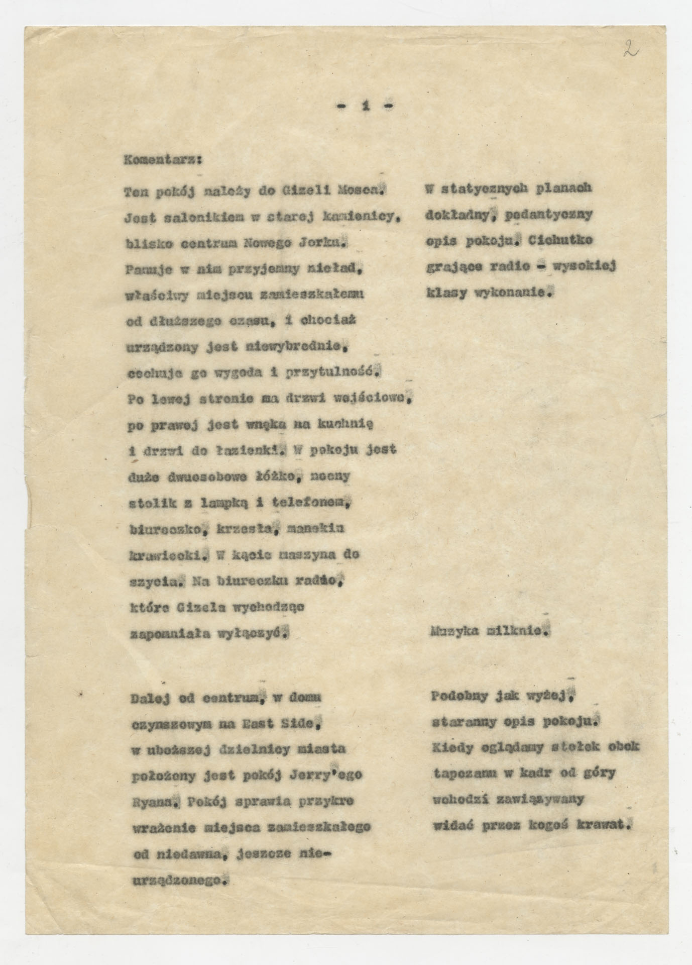 Maszynopis z adaptacją teatralną tekstu Williama Gibsona “Dwoje na huśtawce” do teatru telewizji Krzysztofa Kieślowskiego “Dwoje na huśtawce” (1976). Dokument ma postać scenariusza realizacyjnego. Zawiera szczegółowy opis dwóch głównych wnętrz, rozmieszczenie mebli, rekwizytów i źródeł dźwięku, a także ruch postaci i pracę kamery. W kolejnych scenach rozpisano dialogi bohaterów (Jerry Ryan, Gizela Mosca), uzupełnione didaskaliami oraz technicznymi uwagami dla realizatorów.