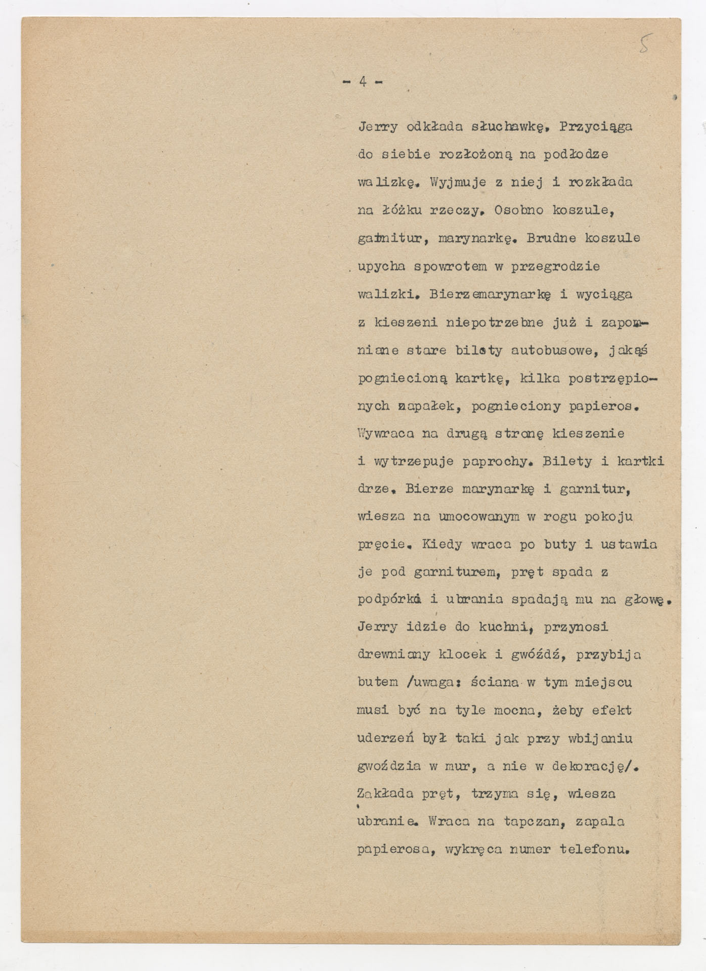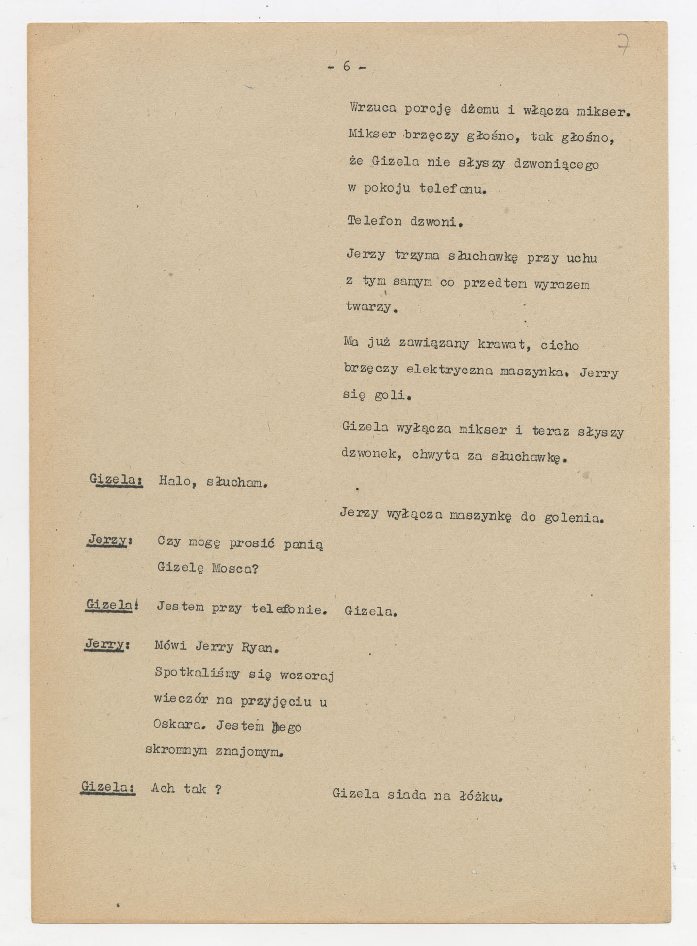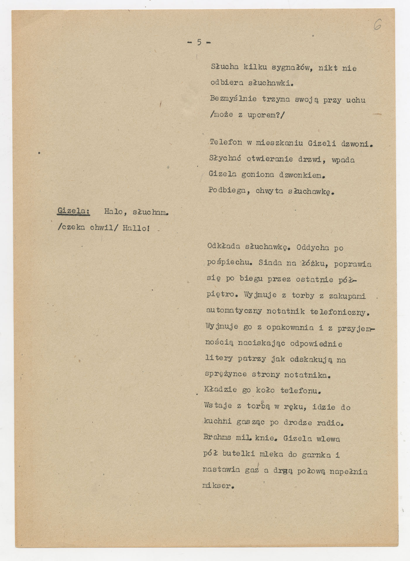 Maszynopis z adaptacją teatralną tekstu Williama Gibsona “Dwoje na huśtawce” do teatru telewizji Krzysztofa Kieślowskiego “Dwoje na huśtawce” (1976). Dokument ma postać scenariusza realizacyjnego. Zawiera szczegółowy opis dwóch głównych wnętrz, rozmieszczenie mebli, rekwizytów i źródeł dźwięku, a także ruch postaci i pracę kamery. W kolejnych scenach rozpisano dialogi bohaterów (Jerry Ryan, Gizela Mosca), uzupełnione didaskaliami oraz technicznymi uwagami dla realizatorów.