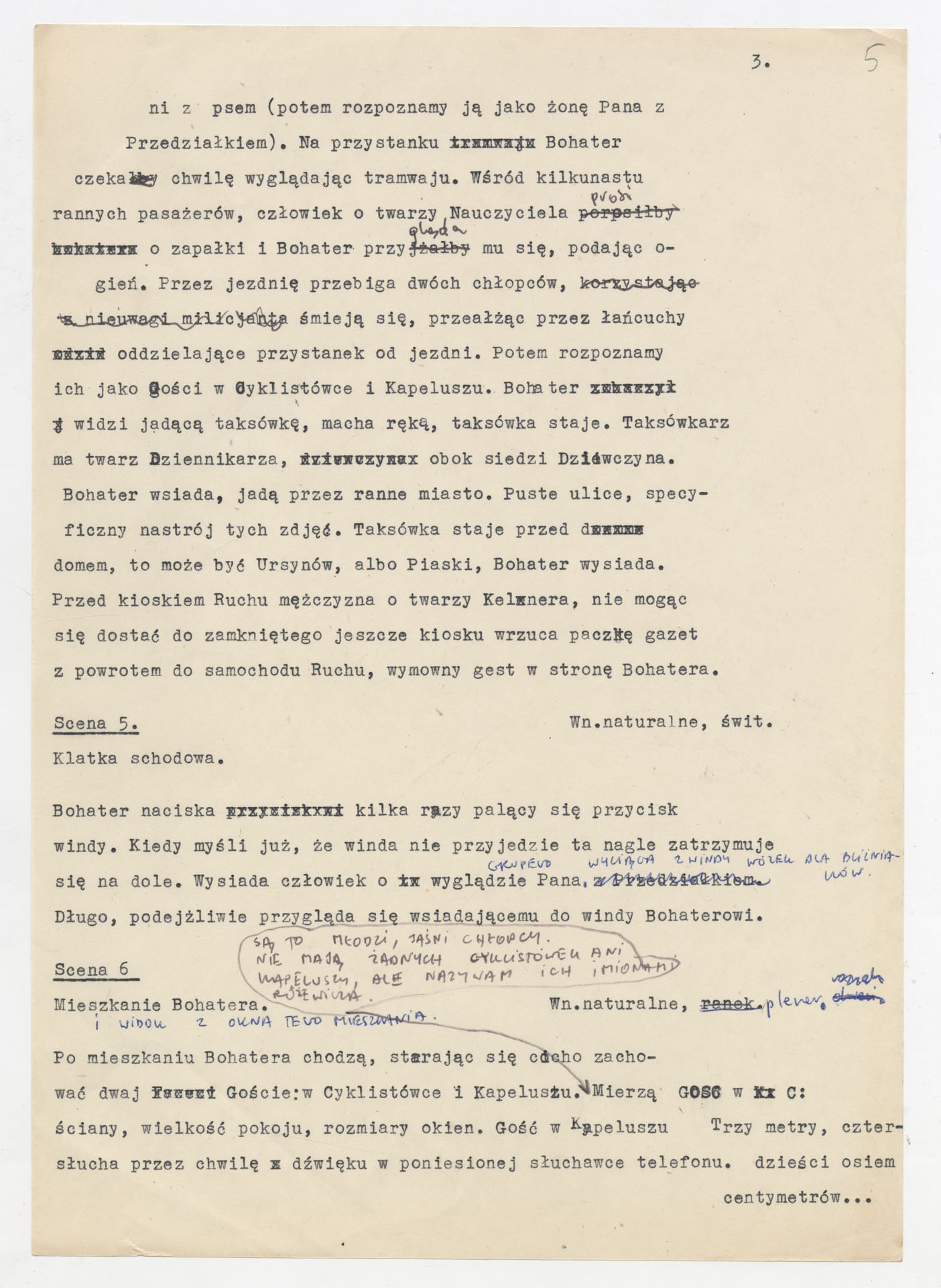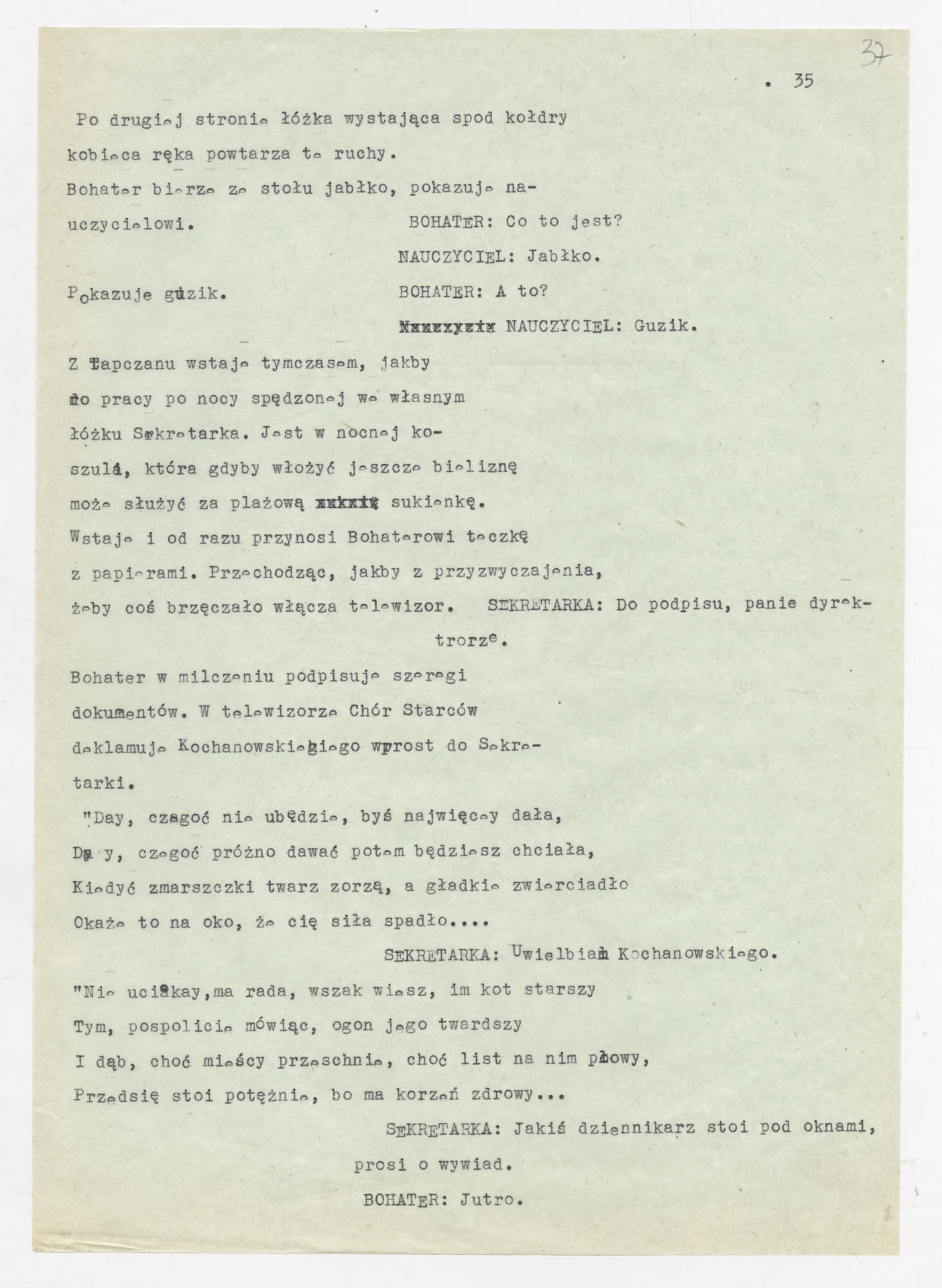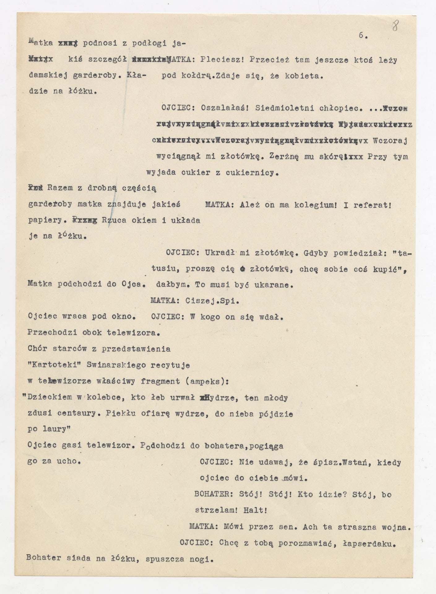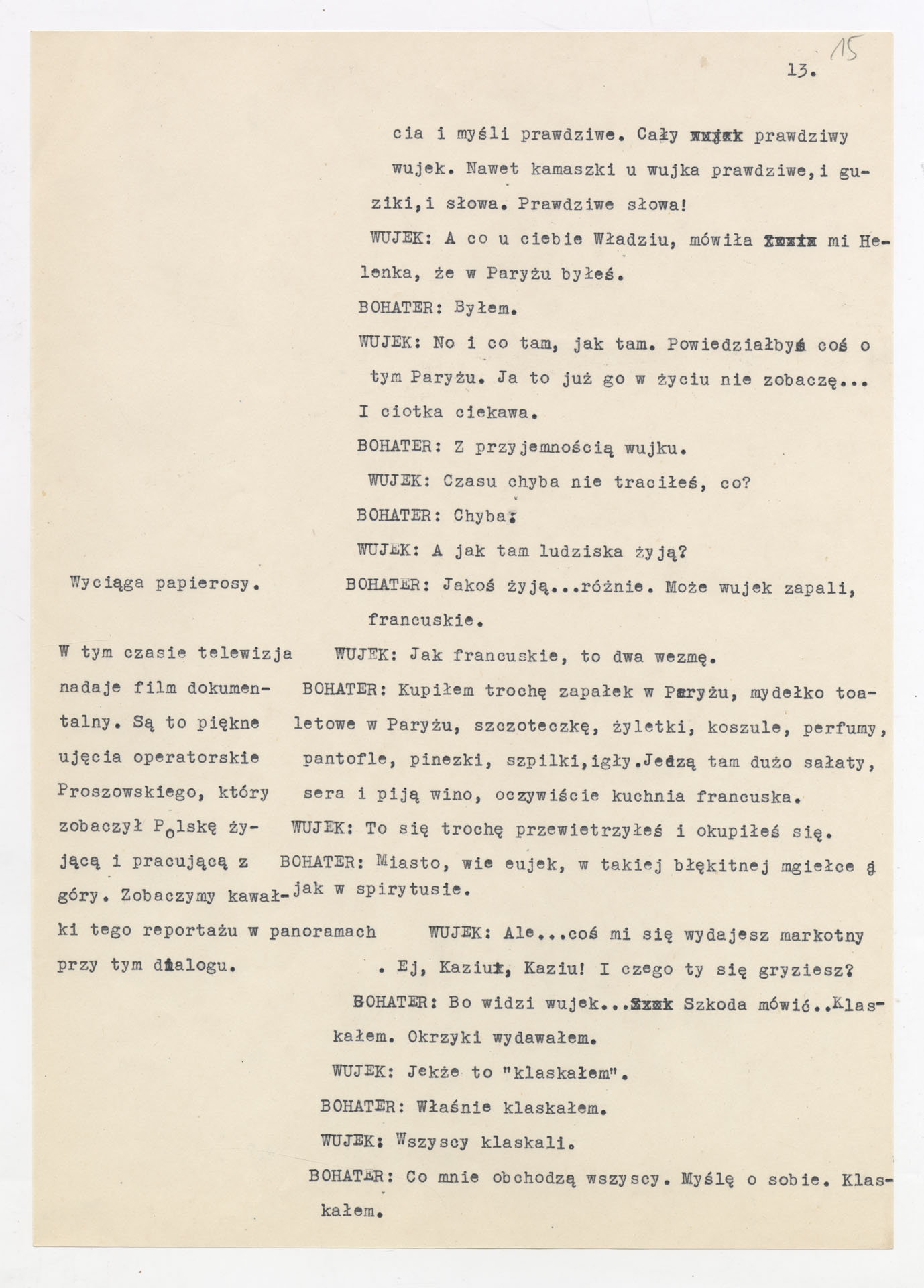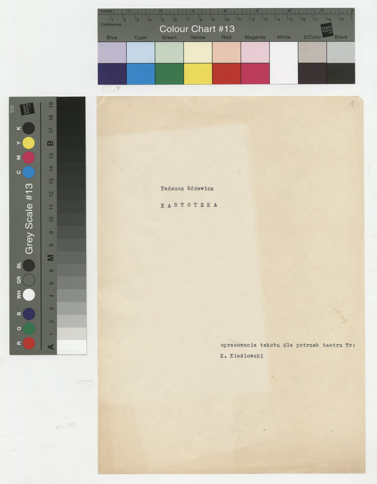Maszynopis z adaptacją teatralną tekstu Tadeusza Różewicza “Kartoteka” do teatru telewizji Krzysztofa Kieślowskiego “Kartoteka” (1979). Dokument ma postać scenariusza filmowo-telewizyjnego, zawierającego “spis osób” oraz ponumerowane sceny z określeniem miejsca i pory akcji (sad, bufet operetki, korytarze teatru, ulice Warszawy, mieszkanie bohatera). Rozpisano dialogi oraz szczegółowe didaskalia. Maszynopis ma charakter roboczej wersji scenopisu, z widocznymi poprawkami i skrótami technicznymi.
