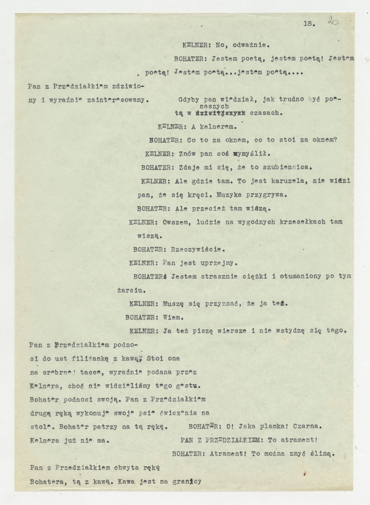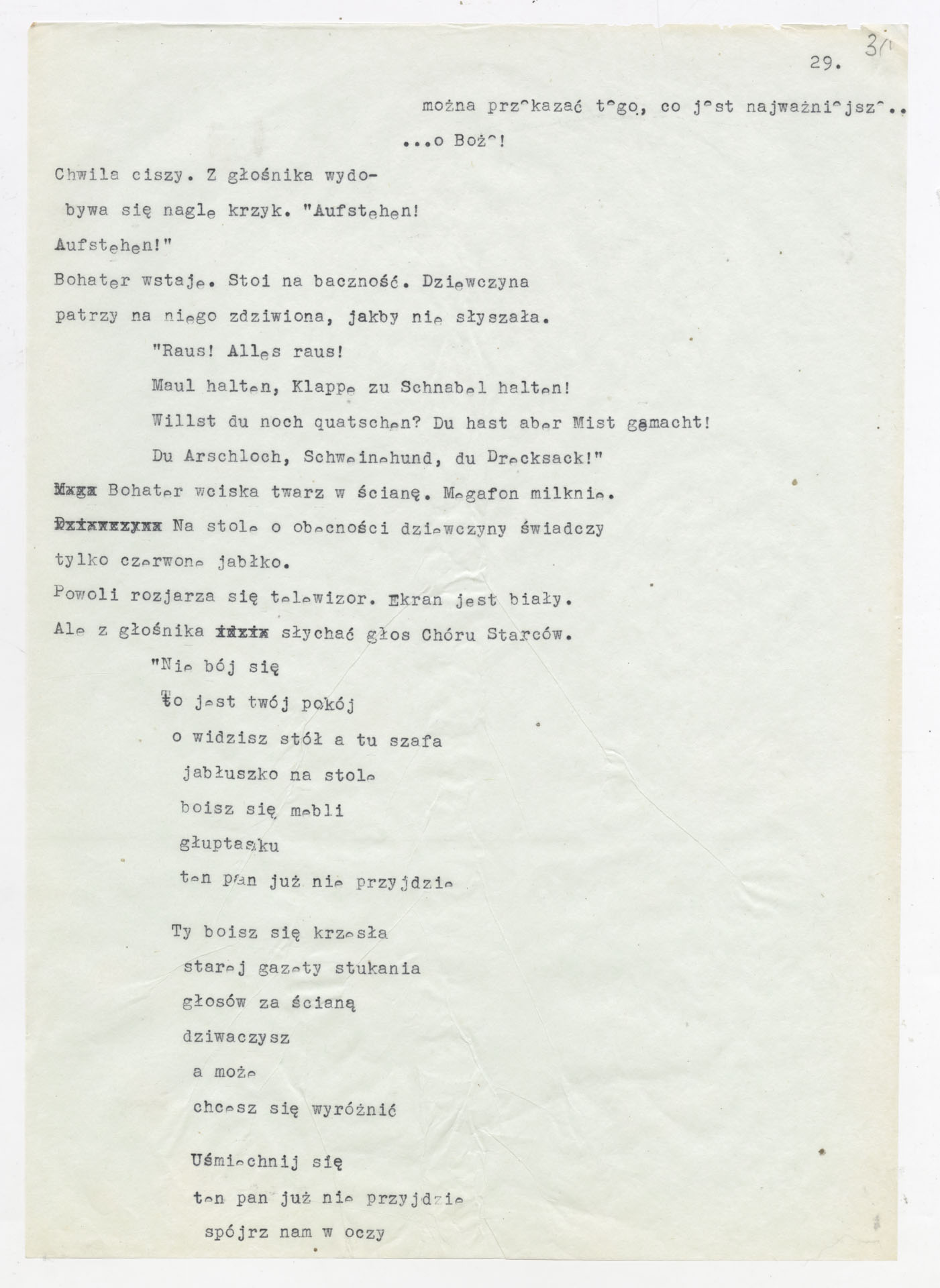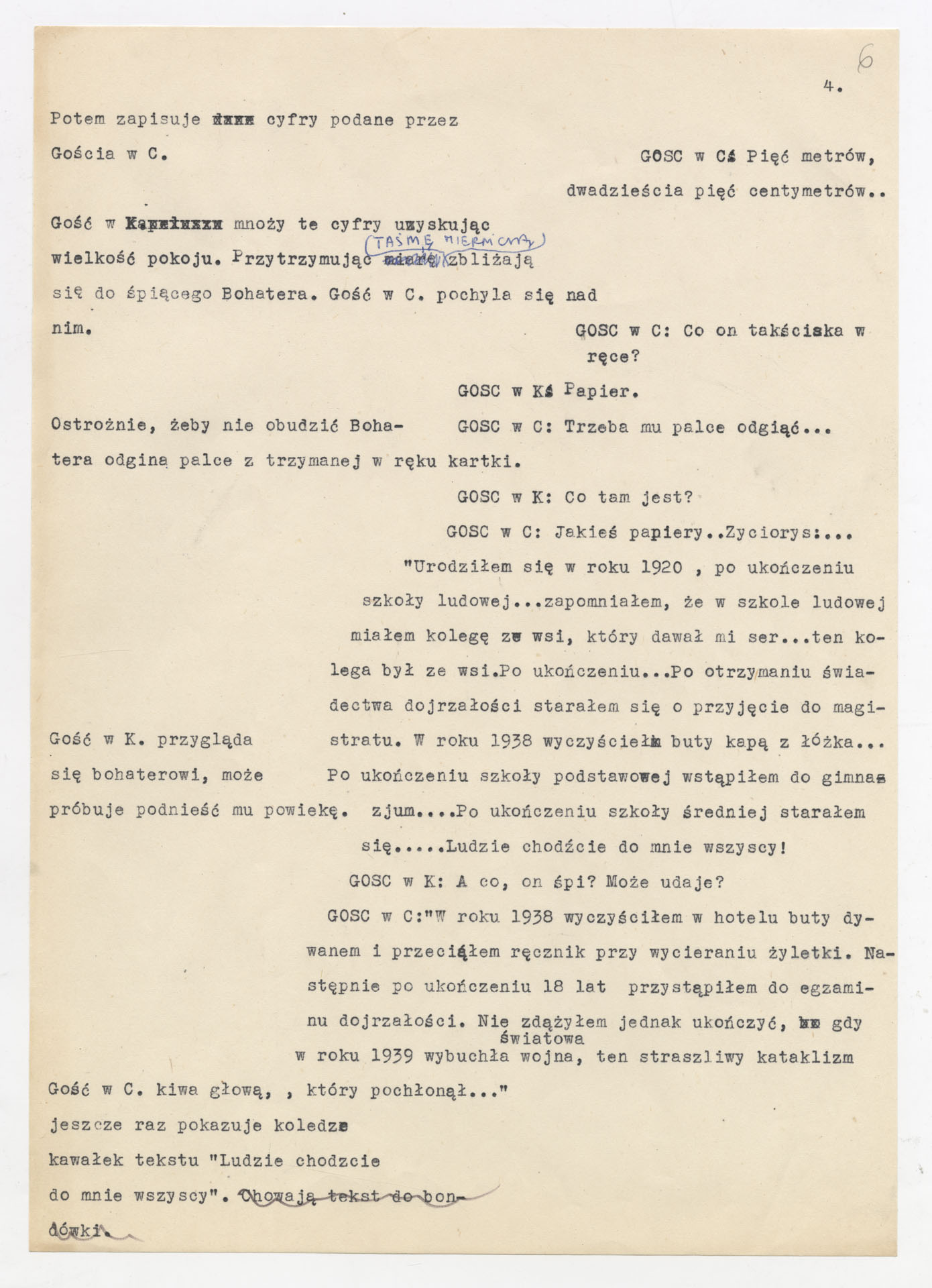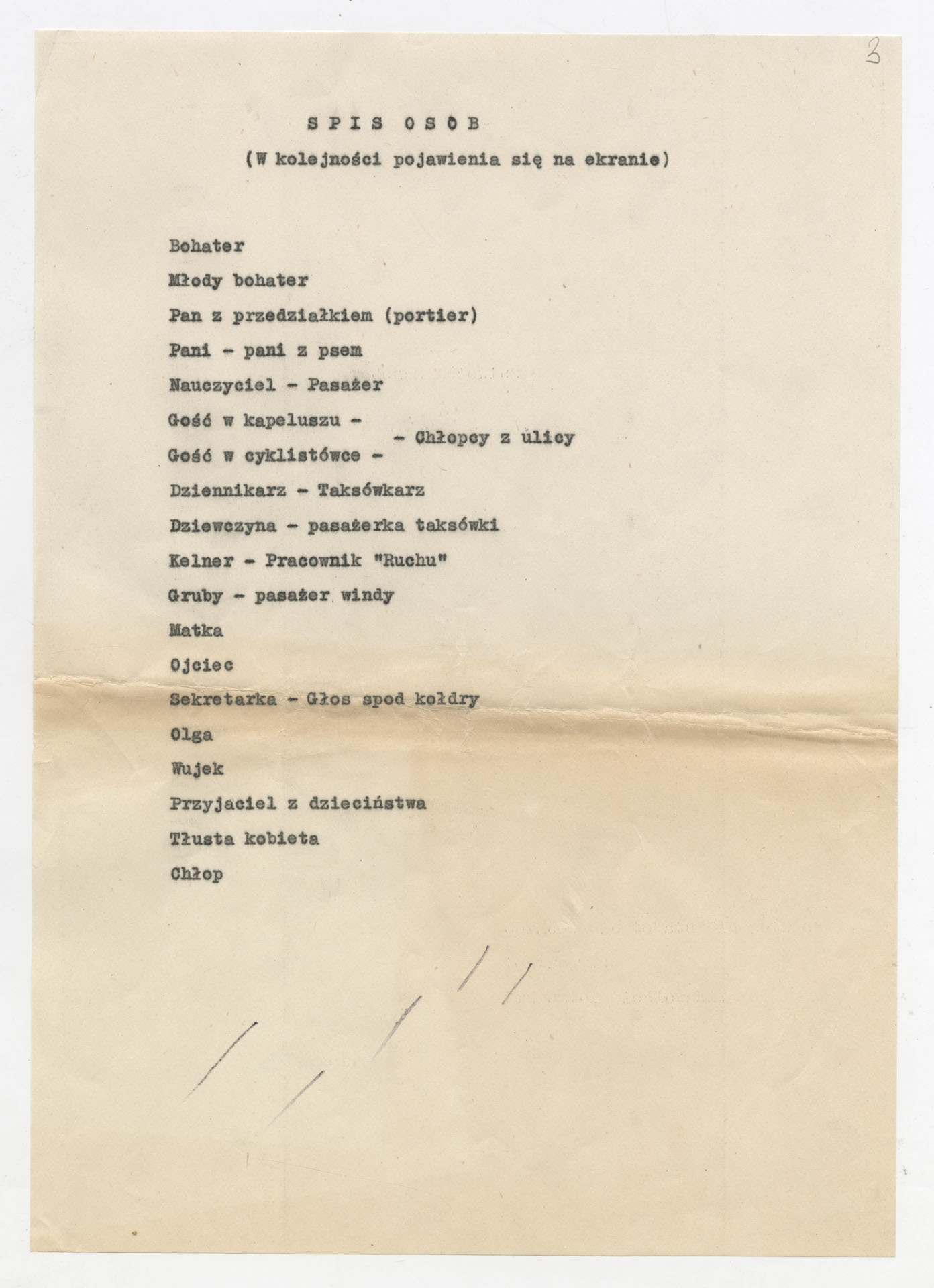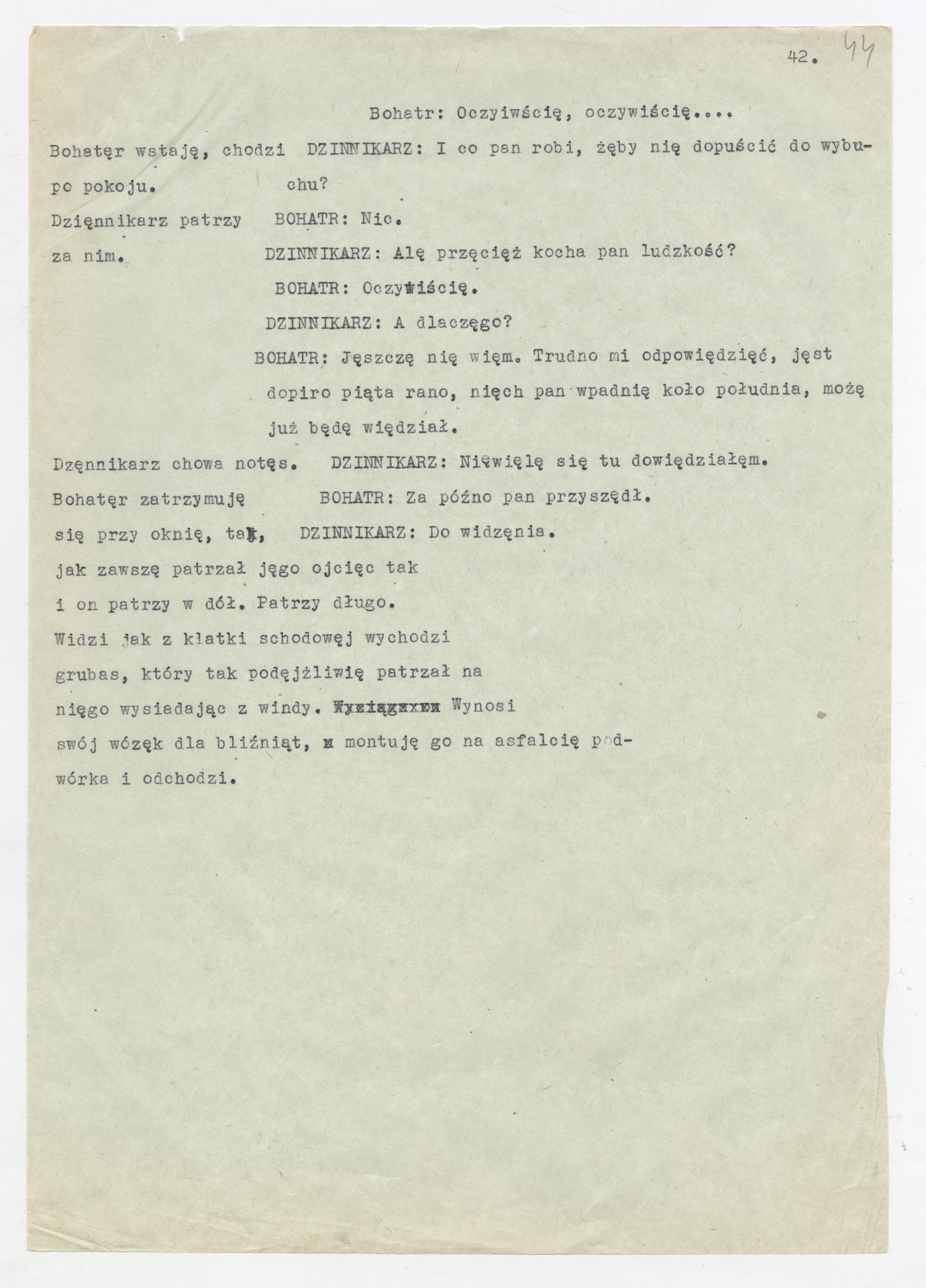 Maszynopis z adaptacją teatralną tekstu Tadeusza Różewicza “Kartoteka” do teatru telewizji Krzysztofa Kieślowskiego “Kartoteka” (1979). Dokument ma postać scenariusza filmowo-telewizyjnego, zawierającego “spis osób” oraz ponumerowane sceny z określeniem miejsca i pory akcji (sad, bufet operetki, korytarze teatru, ulice Warszawy, mieszkanie bohatera). Rozpisano dialogi oraz szczegółowe didaskalia. Maszynopis ma charakter roboczej wersji scenopisu, z widocznymi poprawkami i skrótami technicznymi.