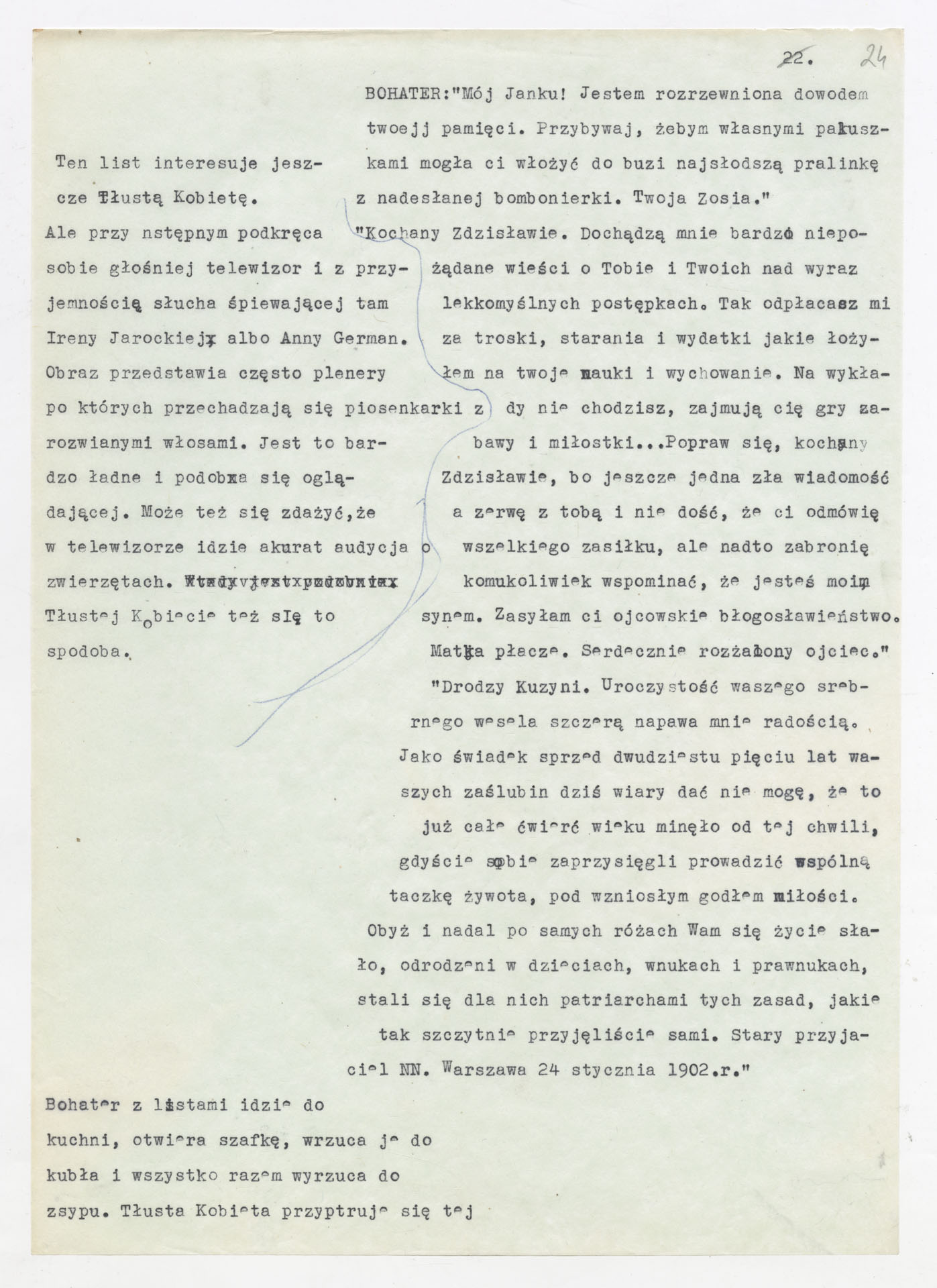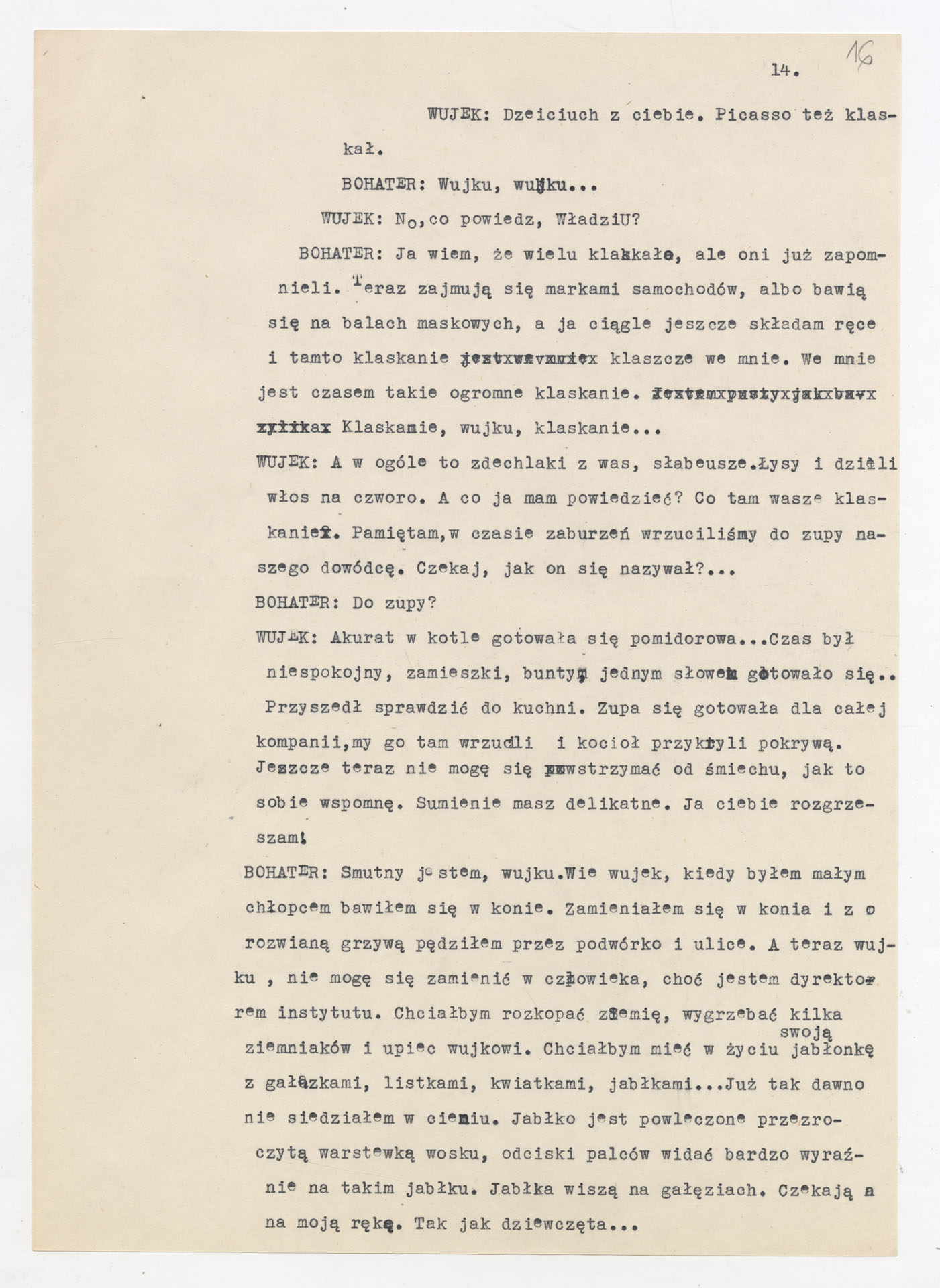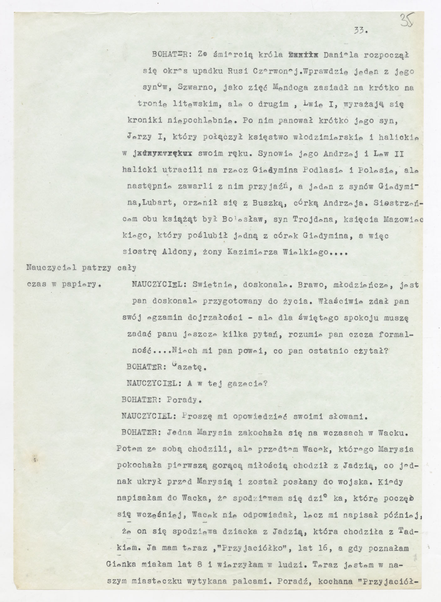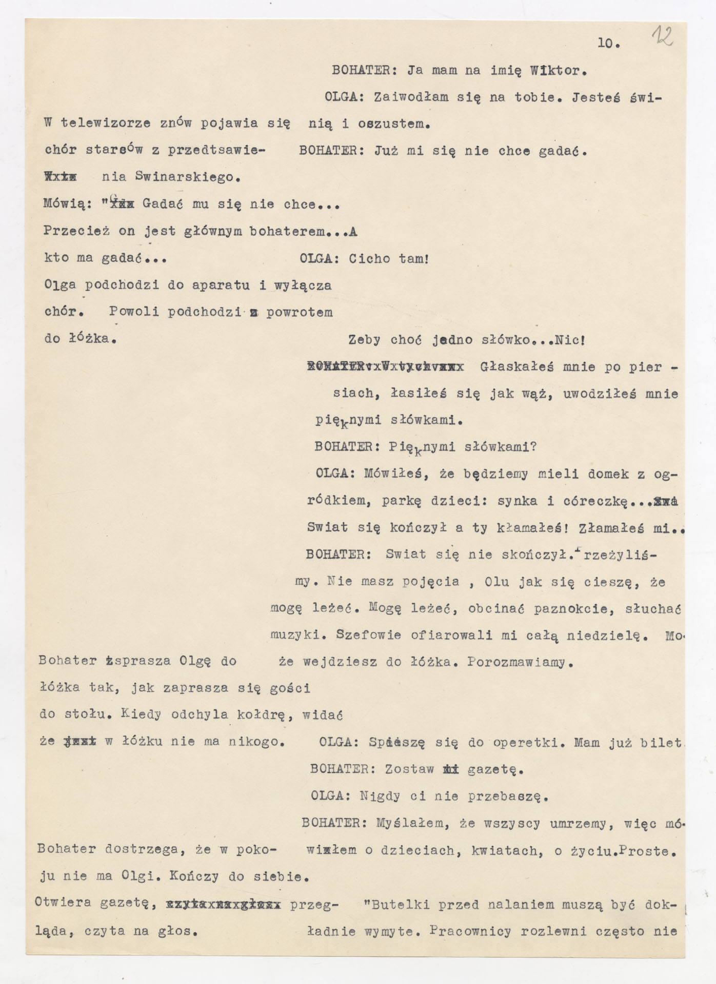 Maszynopis z adaptacją teatralną tekstu Tadeusza Różewicza “Kartoteka” do teatru telewizji Krzysztofa Kieślowskiego “Kartoteka” (1979). Dokument ma postać scenariusza filmowo-telewizyjnego, zawierającego “spis osób” oraz ponumerowane sceny z określeniem miejsca i pory akcji (sad, bufet operetki, korytarze teatru, ulice Warszawy, mieszkanie bohatera). Rozpisano dialogi oraz szczegółowe didaskalia. Maszynopis ma charakter roboczej wersji scenopisu, z widocznymi poprawkami i skrótami technicznymi.