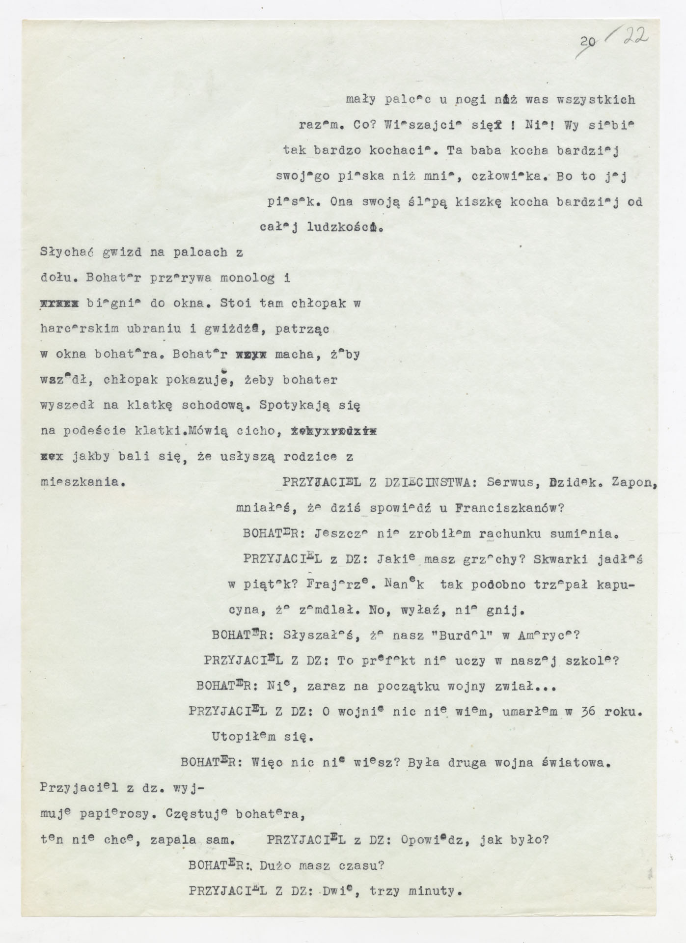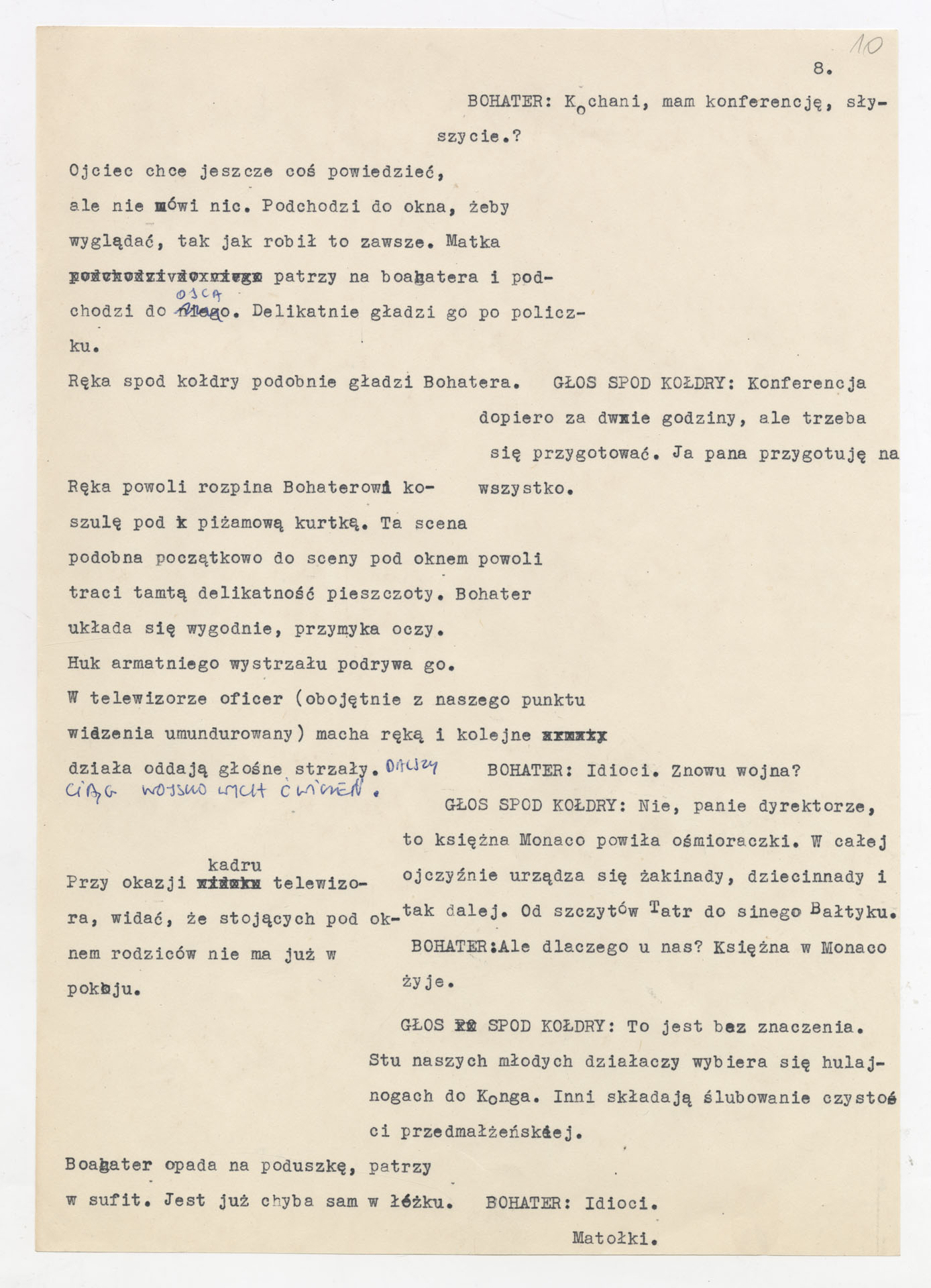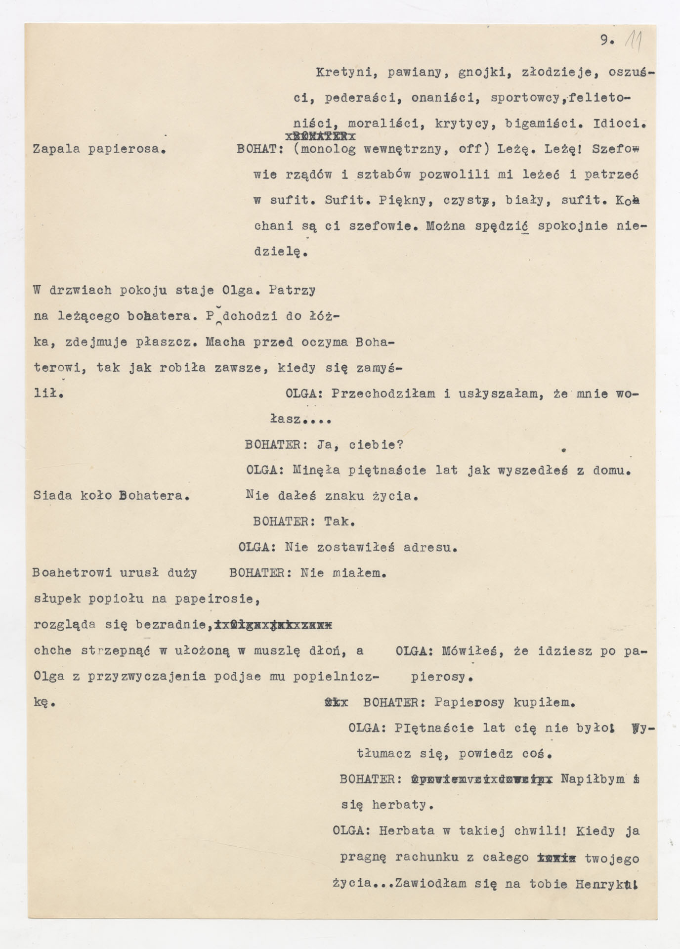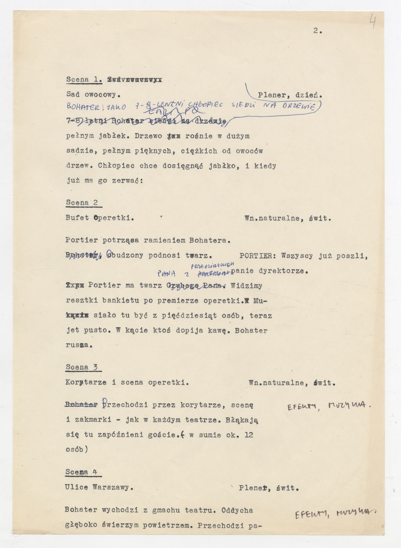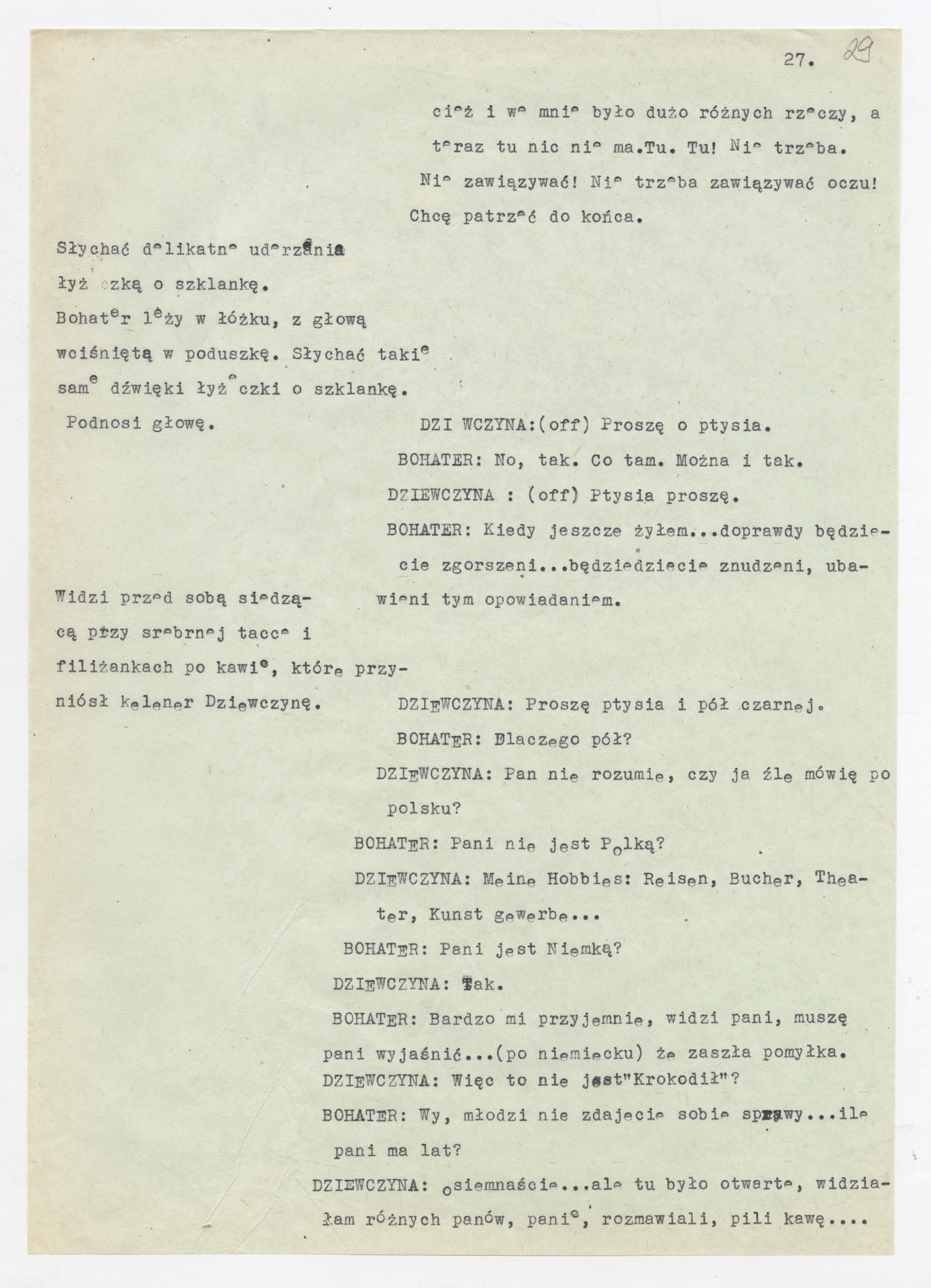 Maszynopis z adaptacją teatralną tekstu Tadeusza Różewicza “Kartoteka” do teatru telewizji Krzysztofa Kieślowskiego “Kartoteka” (1979). Dokument ma postać scenariusza filmowo-telewizyjnego, zawierającego “spis osób” oraz ponumerowane sceny z określeniem miejsca i pory akcji (sad, bufet operetki, korytarze teatru, ulice Warszawy, mieszkanie bohatera). Rozpisano dialogi oraz szczegółowe didaskalia. Maszynopis ma charakter roboczej wersji scenopisu, z widocznymi poprawkami i skrótami technicznymi.