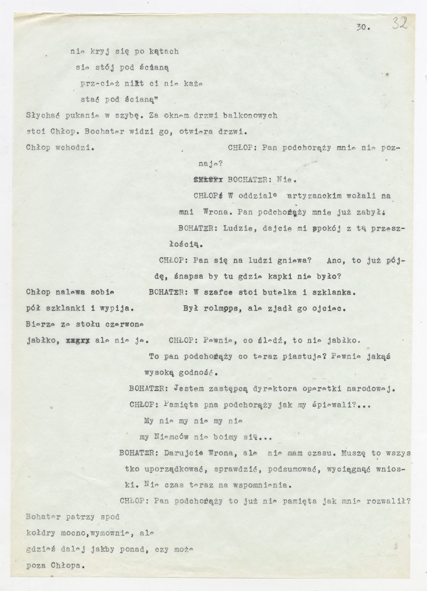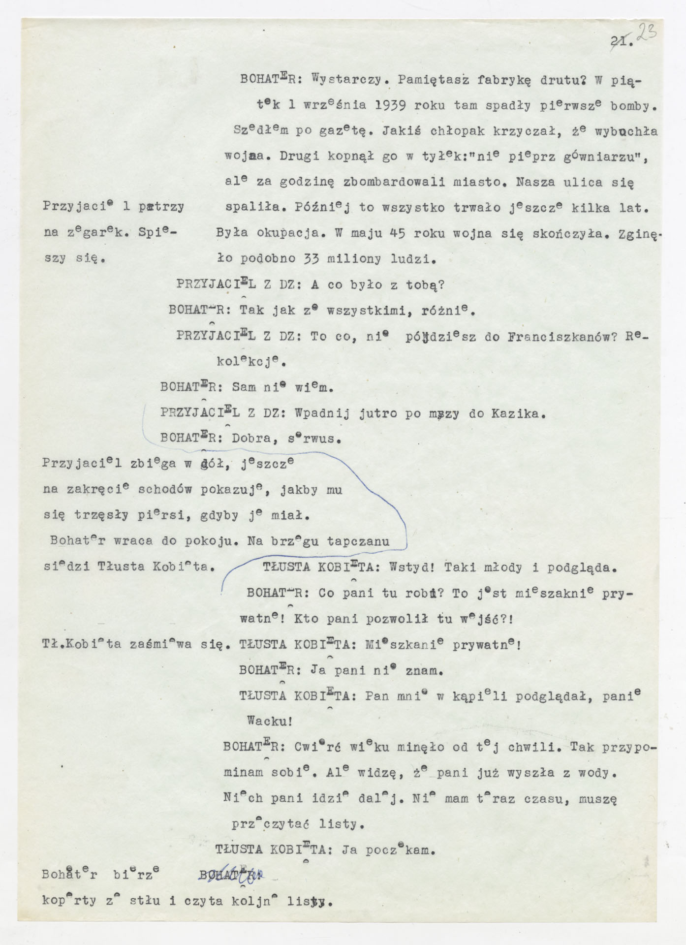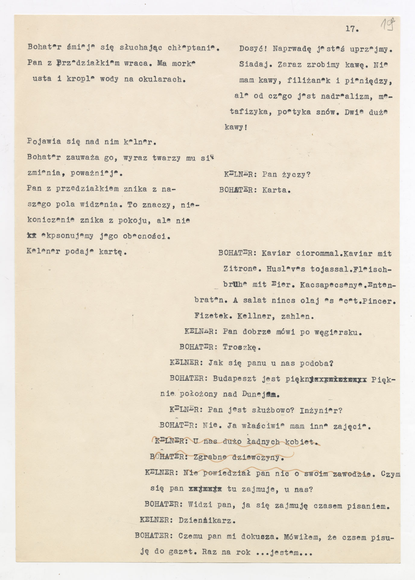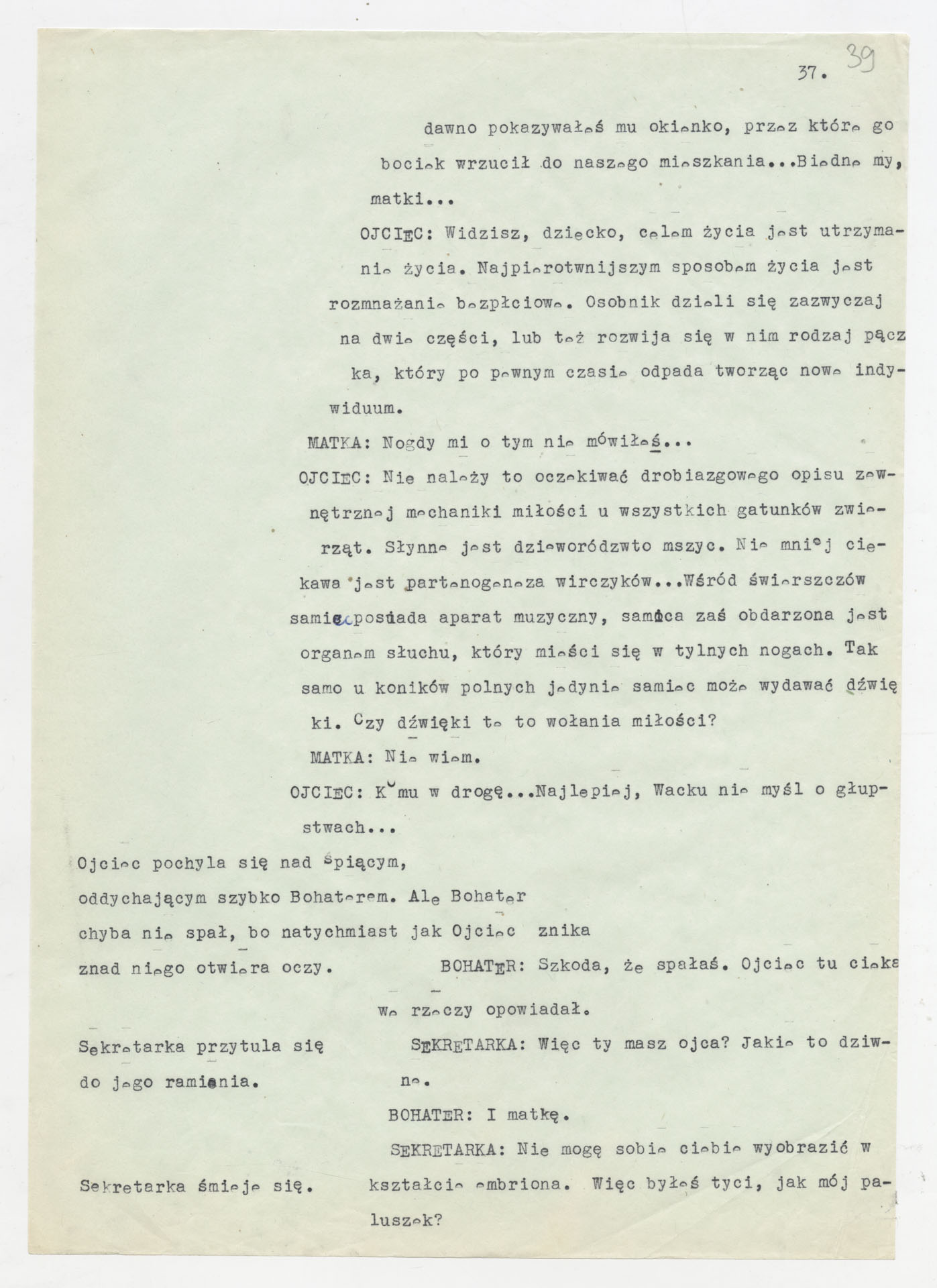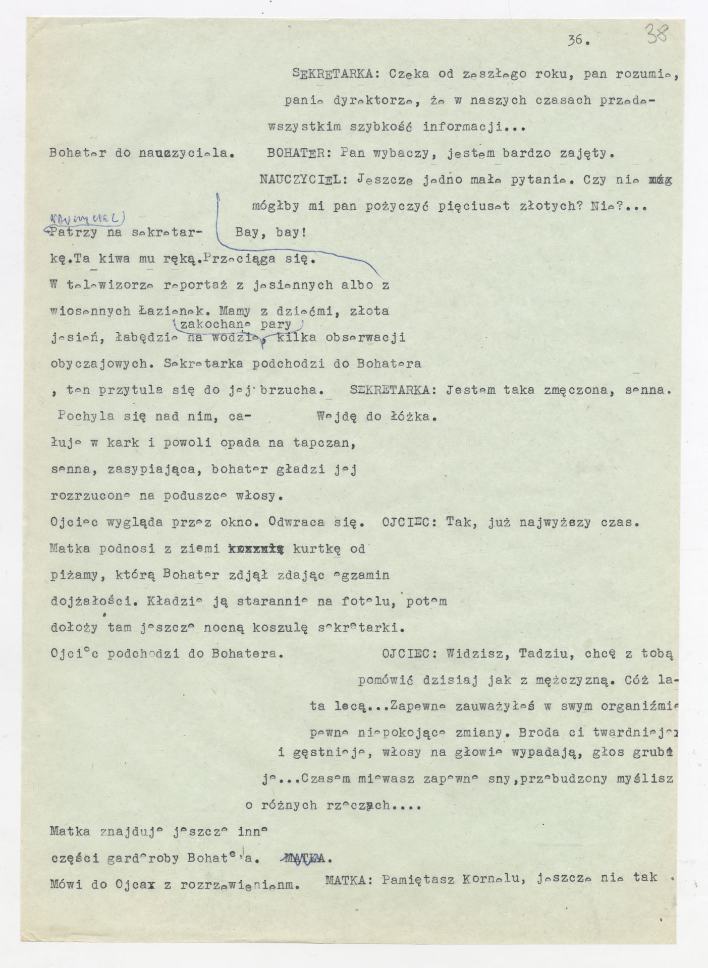 Maszynopis z adaptacją teatralną tekstu Tadeusza Różewicza “Kartoteka” do teatru telewizji Krzysztofa Kieślowskiego “Kartoteka” (1979). Dokument ma postać scenariusza filmowo-telewizyjnego, zawierającego “spis osób” oraz ponumerowane sceny z określeniem miejsca i pory akcji (sad, bufet operetki, korytarze teatru, ulice Warszawy, mieszkanie bohatera). Rozpisano dialogi oraz szczegółowe didaskalia. Maszynopis ma charakter roboczej wersji scenopisu, z widocznymi poprawkami i skrótami technicznymi.