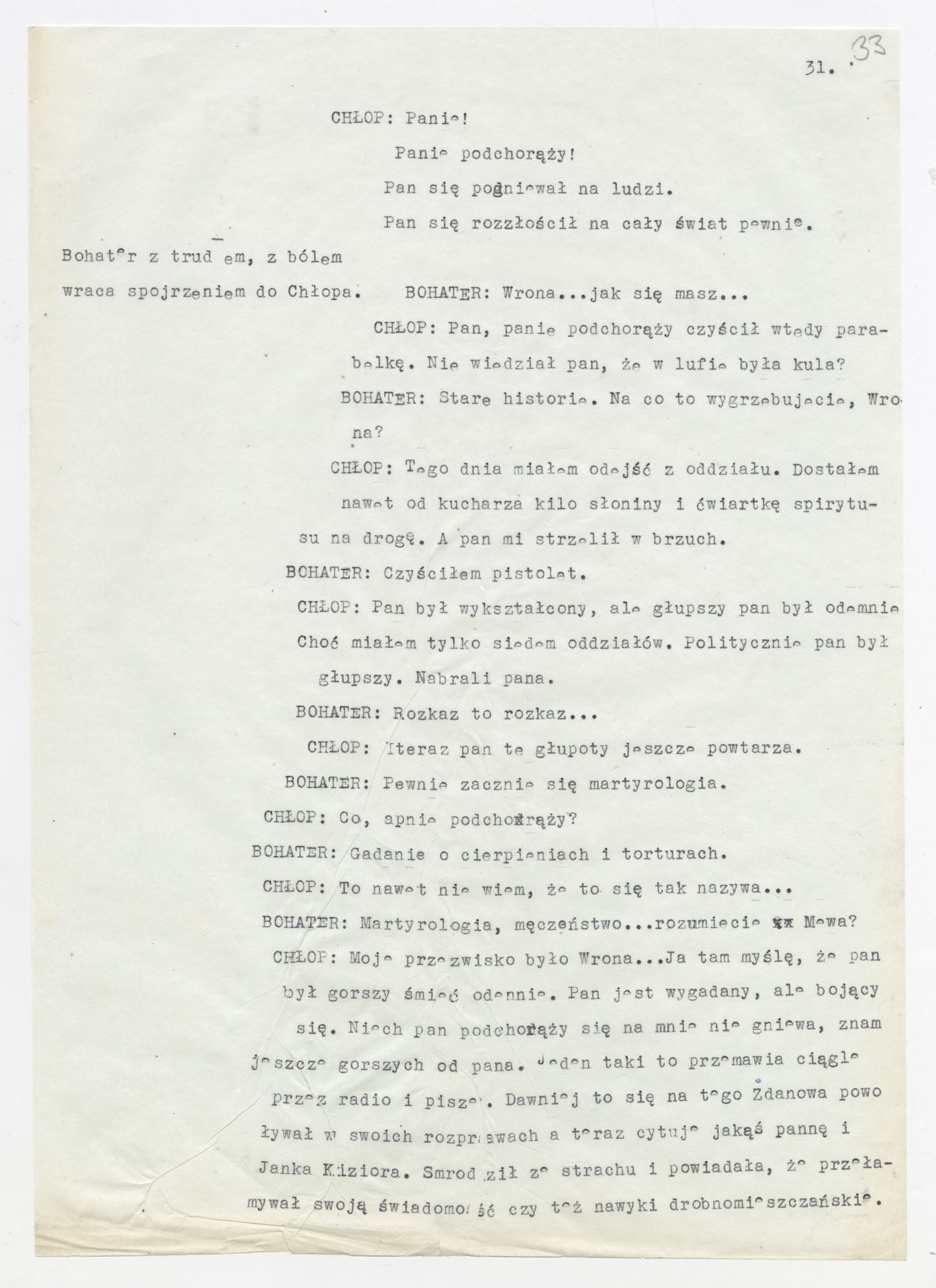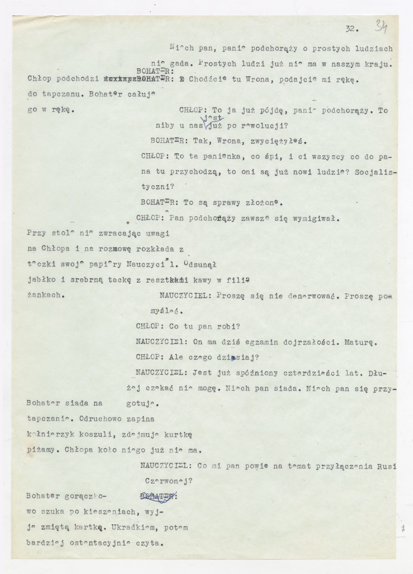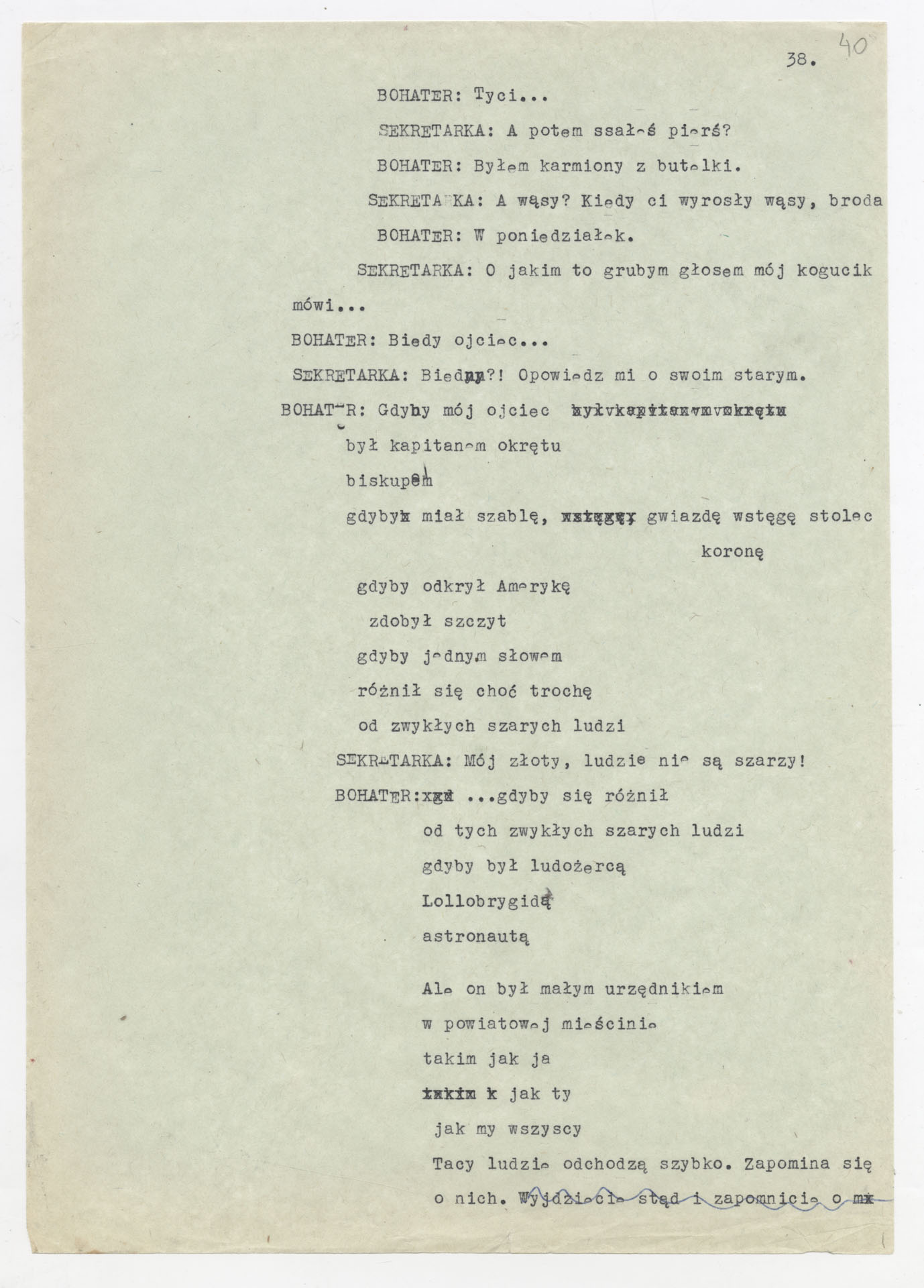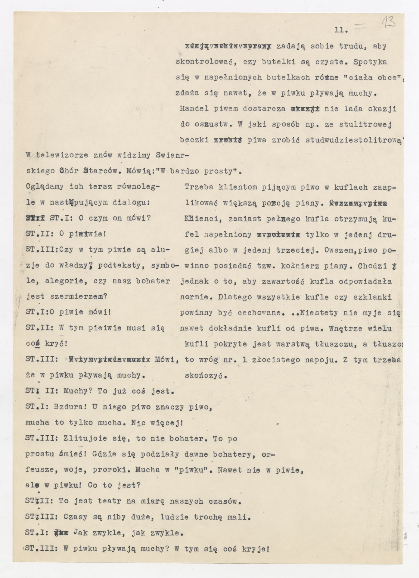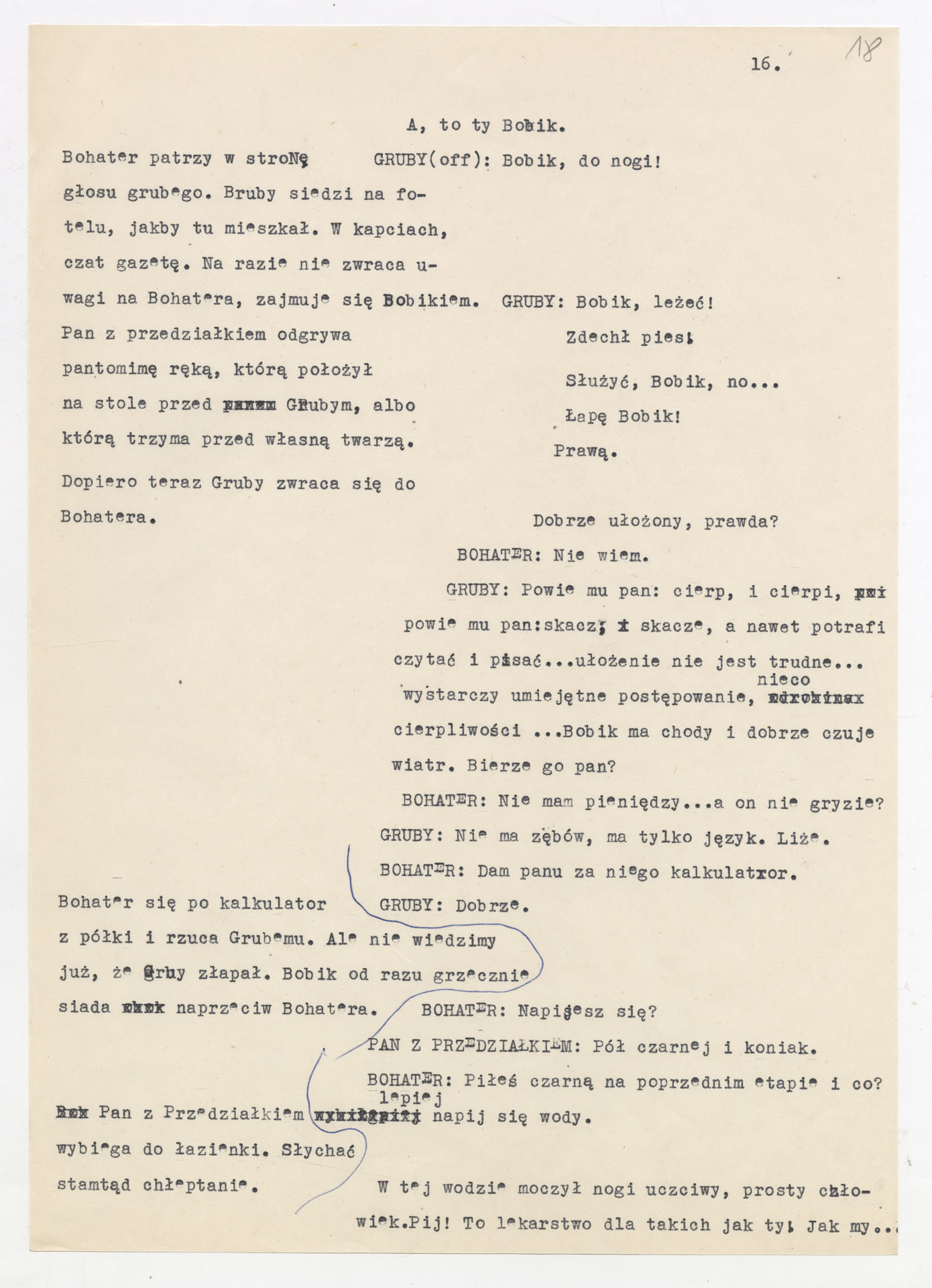 Maszynopis z adaptacją teatralną tekstu Tadeusza Różewicza “Kartoteka” do teatru telewizji Krzysztofa Kieślowskiego “Kartoteka” (1979). Dokument ma postać scenariusza filmowo-telewizyjnego, zawierającego “spis osób” oraz ponumerowane sceny z określeniem miejsca i pory akcji (sad, bufet operetki, korytarze teatru, ulice Warszawy, mieszkanie bohatera). Rozpisano dialogi oraz szczegółowe didaskalia. Maszynopis ma charakter roboczej wersji scenopisu, z widocznymi poprawkami i skrótami technicznymi.
