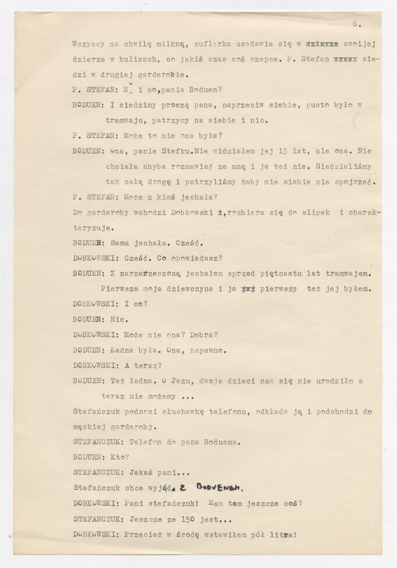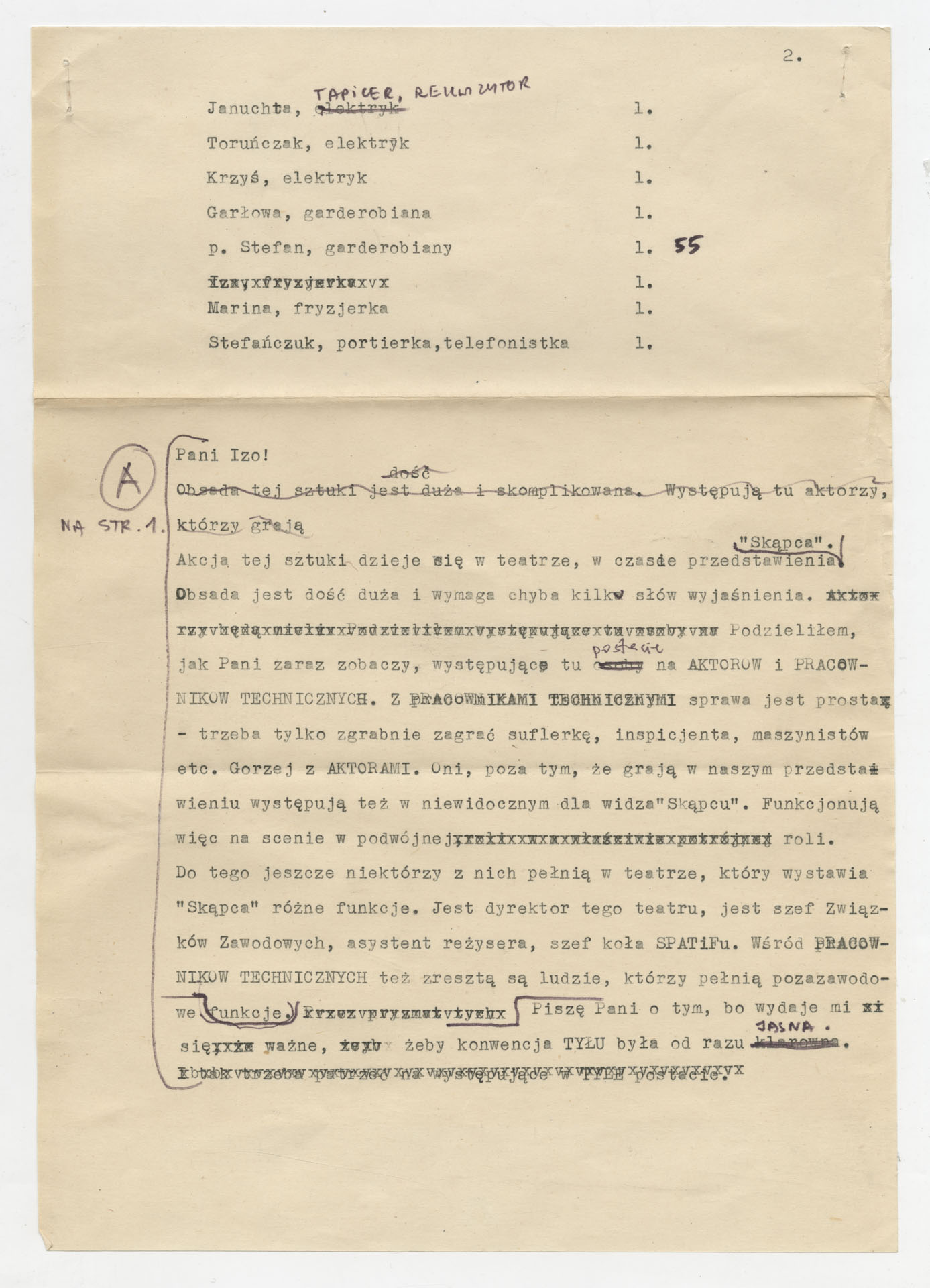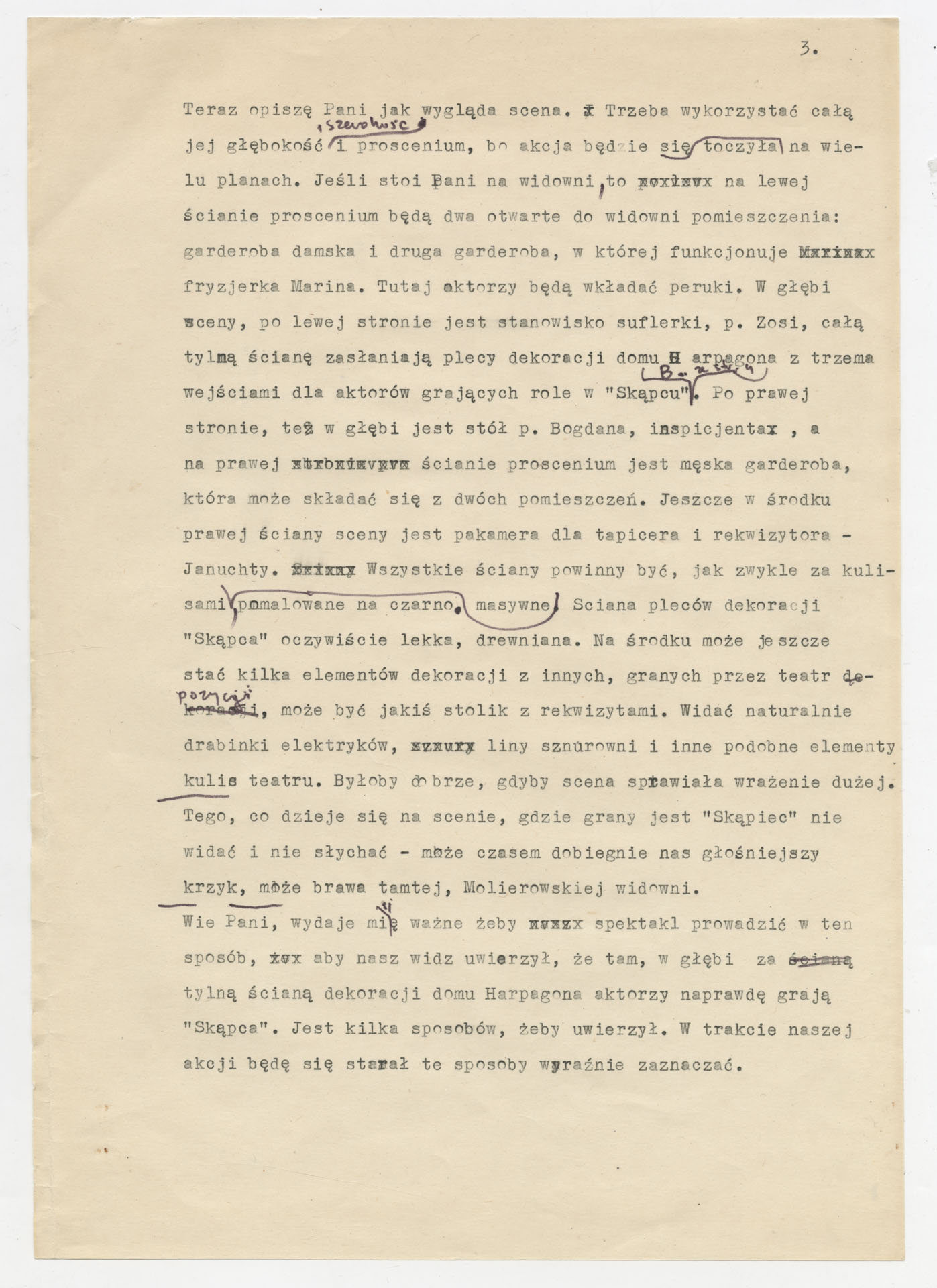 Maszynopis z pomysłem na autorski spektakt teatralny Krzysztofa Kieślowskiego zatytułowany “Tył”. Tekst został napisany na zamówienie Teatru Nowego w Poznaniu. Akcja toczy się za kulisami spektaklu “Skąpiec” i pokazuje jednocześnie aktorów grających Moliera oraz ich “prawdziwe” role w teatrze (dyrektor, szef związków, asystent reżysera, działacz SPATiF) oraz pracowników technicznych (suflerka, inspicjent, maszyniści, garderobiani, elektrycy). Dokument zawiera obszerny spis osób i szczegółowy opis przestrzeni sceny: garderoby, stanowisko suflerki, stół inspicjenta, plecy dekoracji domu Harpagona, kulisy z drabinkami i linami, okno z widokiem na grany “Skąpiec” i urządzenie do sztucznego śniegu. We wstępnym liście do współpracowniczki autor objaśnia konwencję utworu – akcję rozgrywającą się na wielu planach, w czasie rzeczywistego przedstawienia.