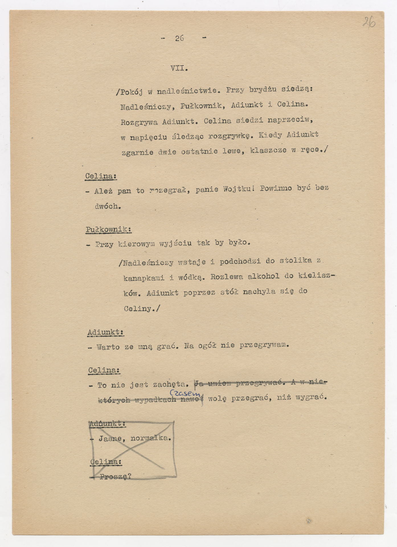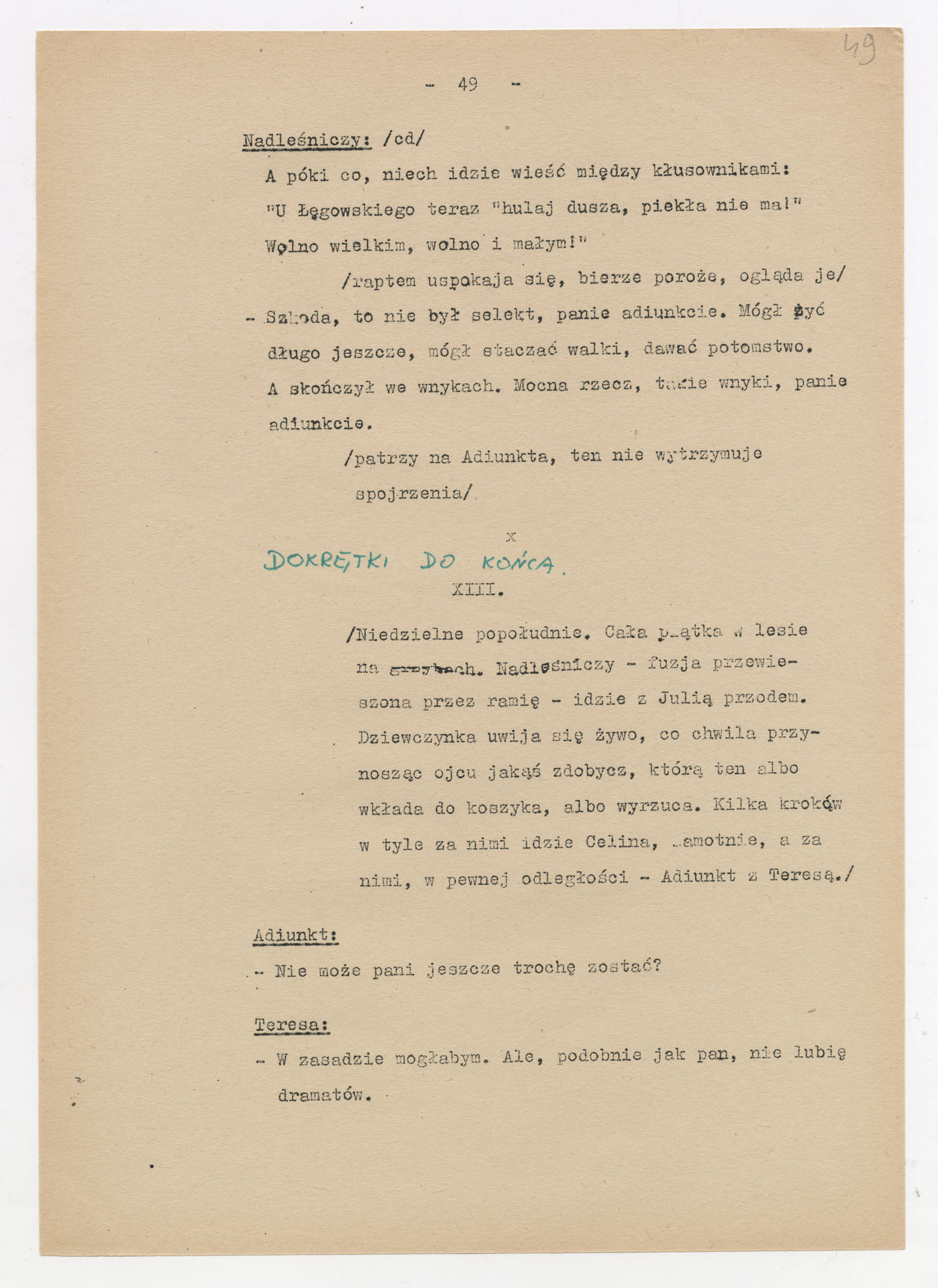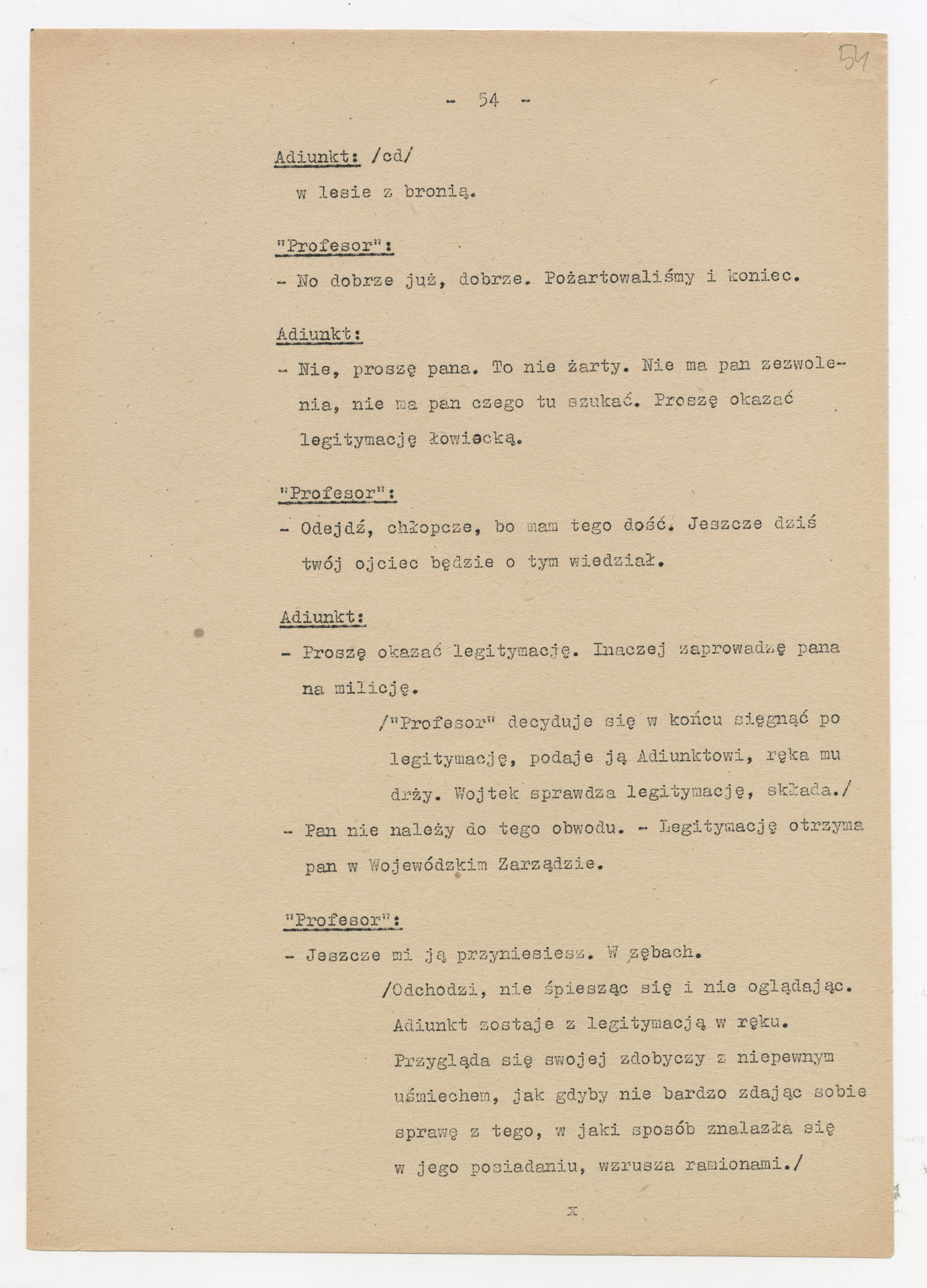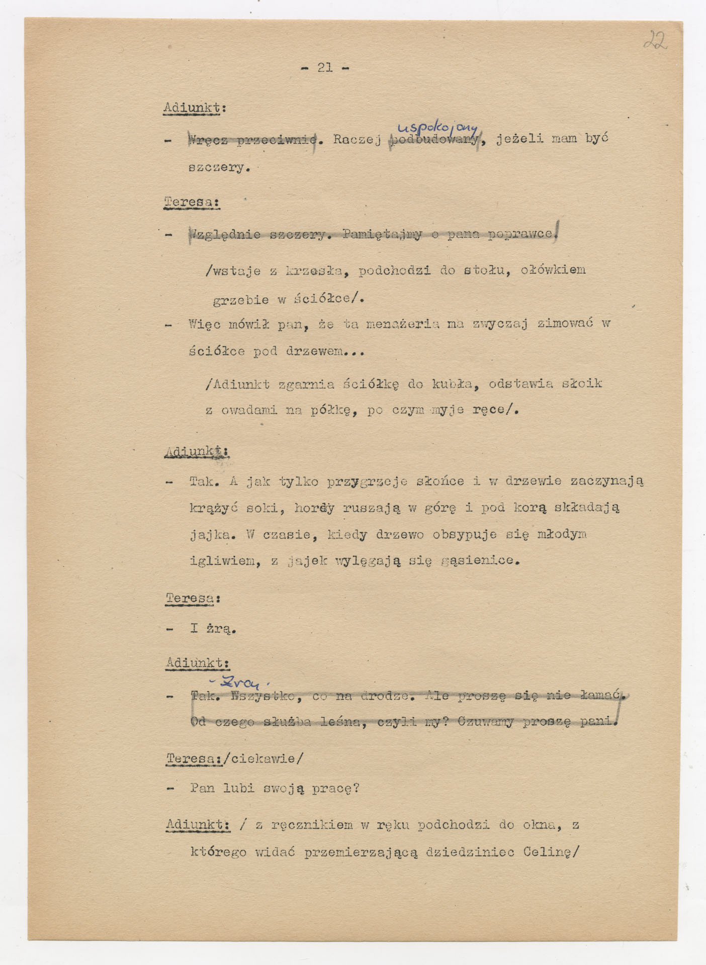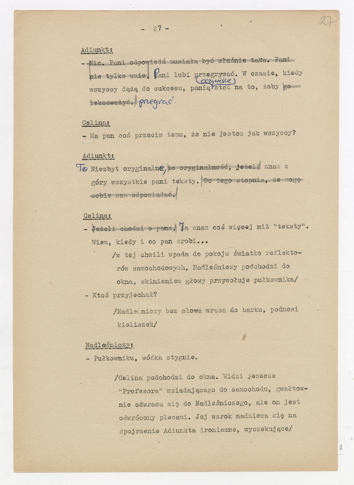 Maszynopis z adaptacją teatralną tekstu Zofii Posmysz “Wnyki” do teatru telewizji Krzysztofa Kieślowskiego “Wnyki”. Dokument ma postać wielostronicowego dialogowego scenariusza z didaskaliami, opisem miejsc, ruchu postaci, dźwięków i rekwizytów. Zawiera fragmenty w różnych redakcyjnych wersjach, miejscami z poprawkami, skreśleniami i dopisanymi wariantami kwestii.