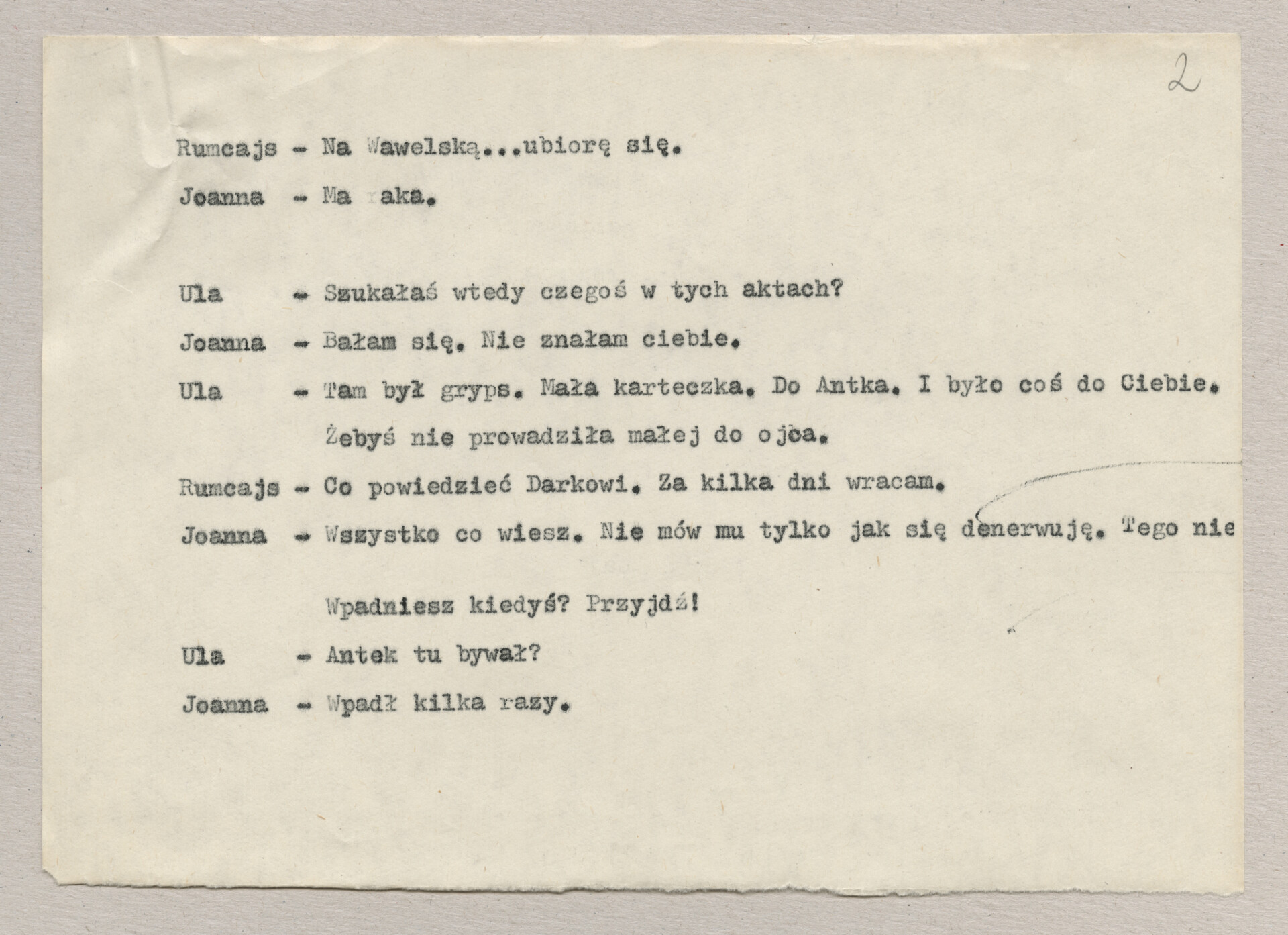 Kopia maszynopisu z dialogami do filmu Krzysztofa Kieślowskiego “Bez końca” (1984). Nosi on tu jeszcze pierwotny tytuł “Szczęśliwy koniec”. Zdjęcia do tego filmu zrealizował Jacek Petrycki. Film został wyprodukowany przez Zespół Filmowy Tor. Scenariusz został napisany wspólnie przez Krzysztofa Kieślowskiego i Krzysztofa Piesiewicza. Od tego filmu zaczęła się współpraca obu autorów i trwała do śmierci Kieślowskiego w 1996 roku. Są to dwie strony maszynopisu, nienumerowane, z nagłówkiem “scena 14”, stanowiąca fragment całości. Być może jest to suplement do scenopisu. Format strony 2. niestandardowy – arkusz papieru stanowi 1_2 całego arkusza. Zawiera odręczne poprawki i notatki autora. Maszynopis tego dokumentu ma sygnaturę ATKK-BK-I-016.