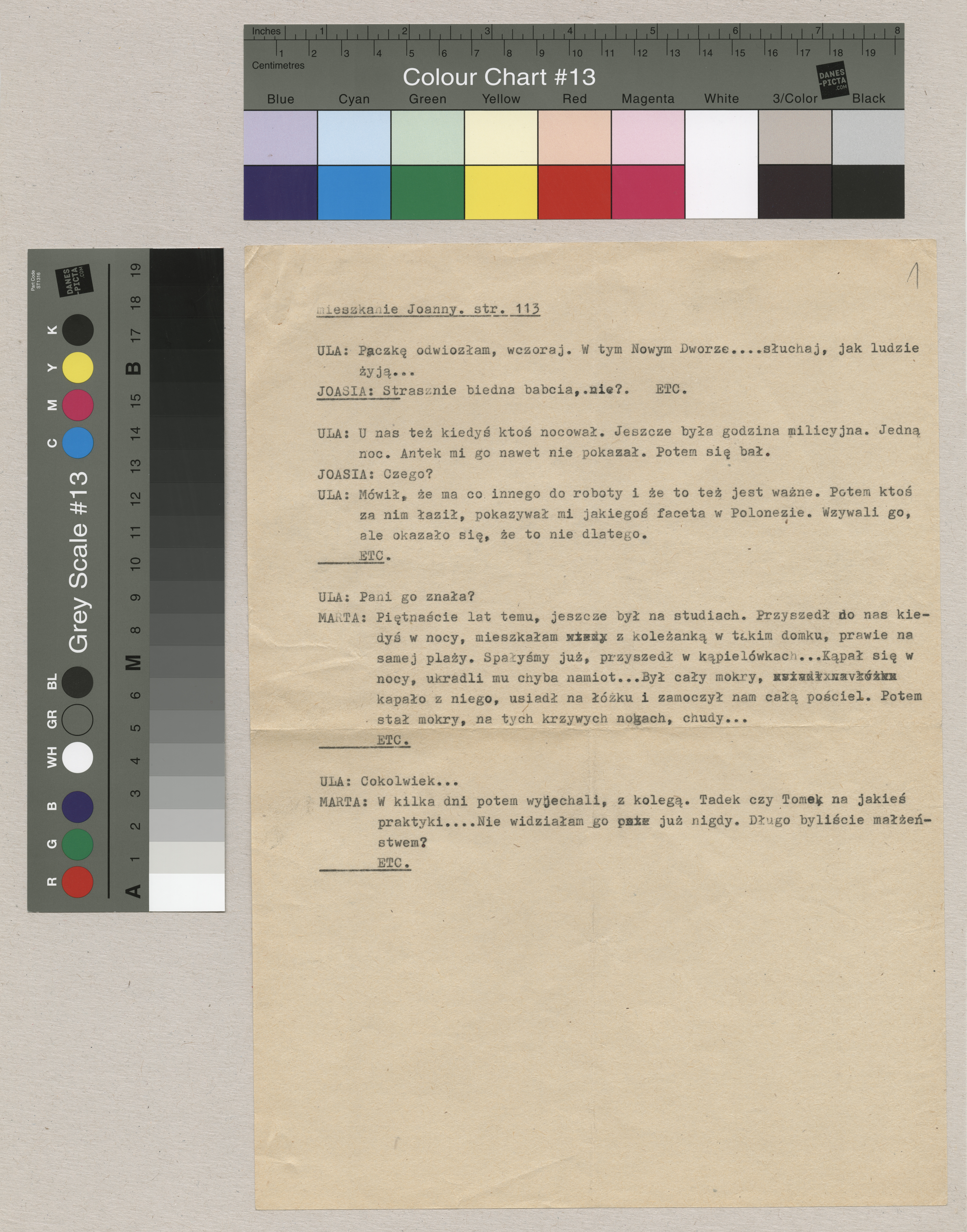 Maszynopis z dialogami do filmu Krzysztofa Kieślowskiego “Bez końca” (1984). Nosi on tu jeszcze pierwotny tytuł “Szczęśliwy koniec”. Zdjęcia do tego filmu zrealizował Jacek Petrycki. Film został wyprodukowany przez Zespół Filmowy Tor. Scenariusz został napisany wspólnie przez Krzysztofa Kieślowskiego i Krzysztofa Piesiewicza. Od tego filmu zaczęła się współpraca obu autorów i trwała do śmierci Kieślowskiego w 1996 roku. Jest to jedna strona maszynopisu, nienumerowana, z nagłówkiem “mieszkanie Joanny, str. 113”, stanowiąca fragment całości. Być może jest to suplement do scenopisu. Zawiera odręczne poprawki i notatki autora.