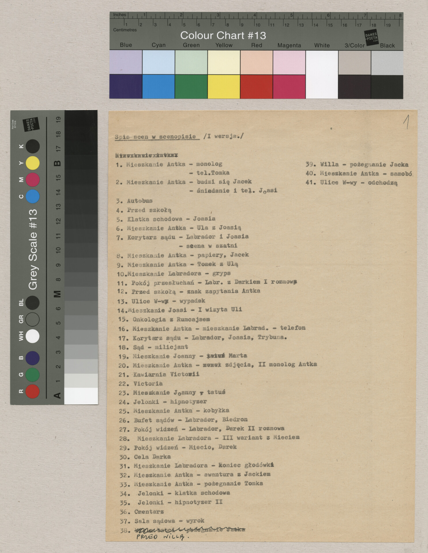 Kopia maszynopisu ze spisem scen w scenopisie do filmu Krzysztofa Kieślowskiego “Bez końca” (1984). Nosi on tu jeszcze pierwotny tytuł “Szczęśliwy koniec”. Zdjęcia do tego filmu zrealizował Jacek Petrycki. Film został wyprodukowany przez Zespół Filmowy Tor. Scenariusz został napisany wspólnie przez Krzysztofa Kieślowskiego i Krzysztofa Piesiewicza. Od tego filmu zaczęła się współpraca obu autorów i trwała do śmierci Kieślowskiego w 1996 roku. Zawiera odręczne poprawki i notatki autora. Zawiera odręczne poprawki i notatki autora. Kalkowa kopia maszynopisu tego dokumentu z odręcznymi poprawkami i notatkami autora w innej wersji ma sygnaturę ATKK-BK-I-025.