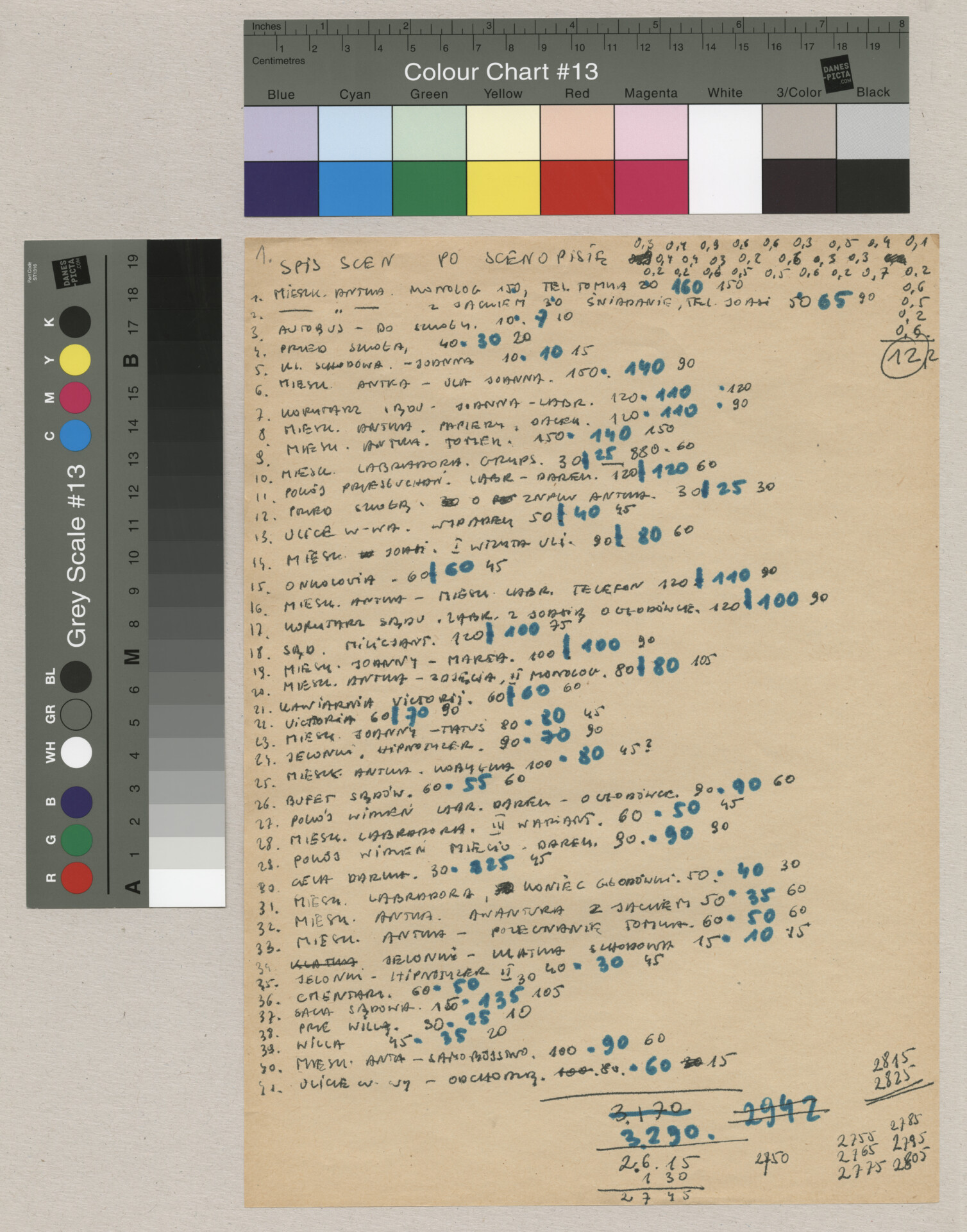Rękopis ze spisem scen po scenopisie do filmu Krzysztofa Kieślowskiego “Bez końca” (1984). Nosi on tu jeszcze pierwotny tytuł “Szczęśliwy koniec”. Zdjęcia do tego filmu zrealizował Jacek Petrycki. Film został wyprodukowany przez Zespół Filmowy Tor. Scenariusz został napisany wspólnie przez Krzysztofa Kieślowskiego i Krzysztofa Piesiewicza. Od tego filmu zaczęła się współpraca obu autorów i trwała do śmierci Kieślowskiego w 1996 roku.