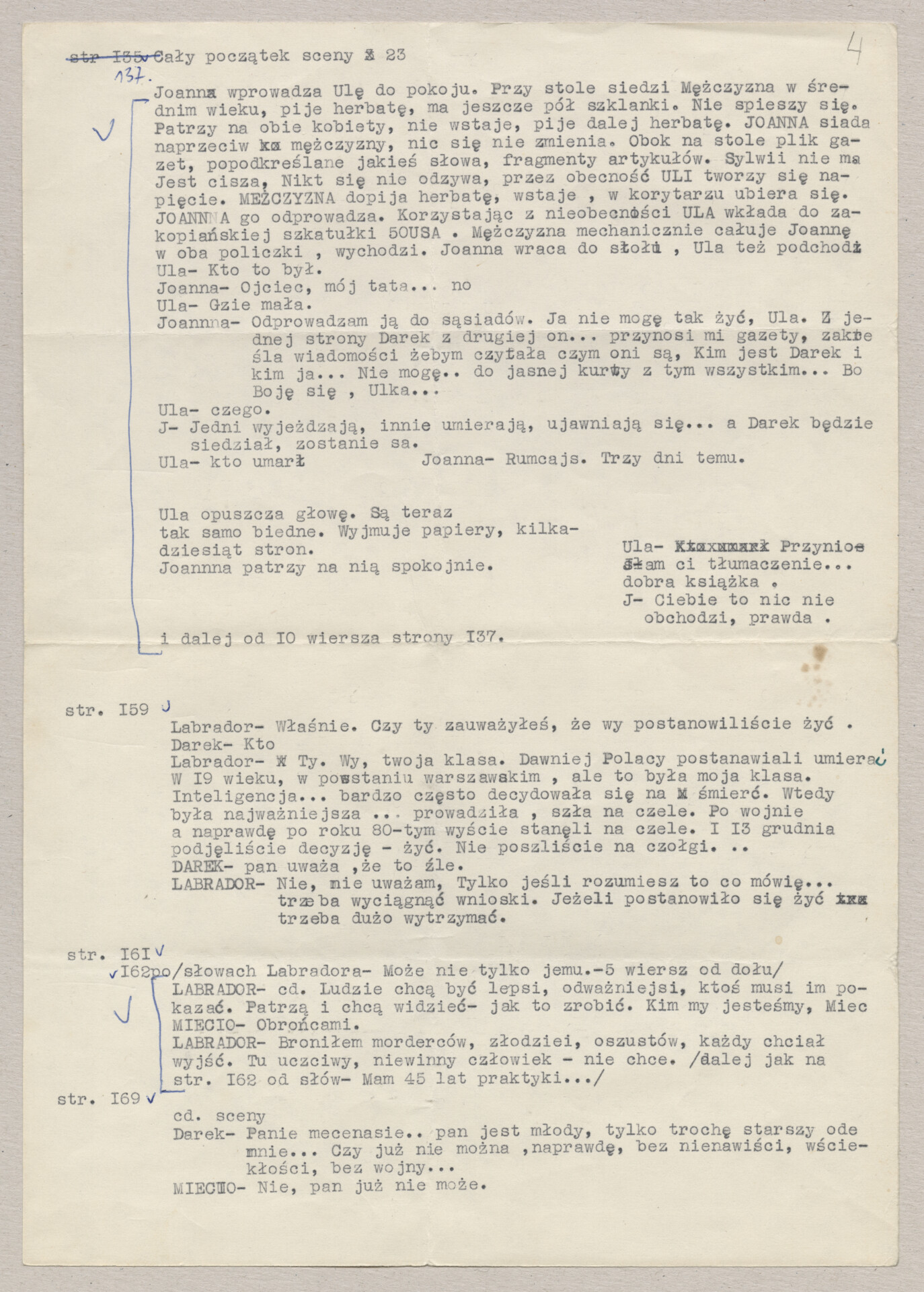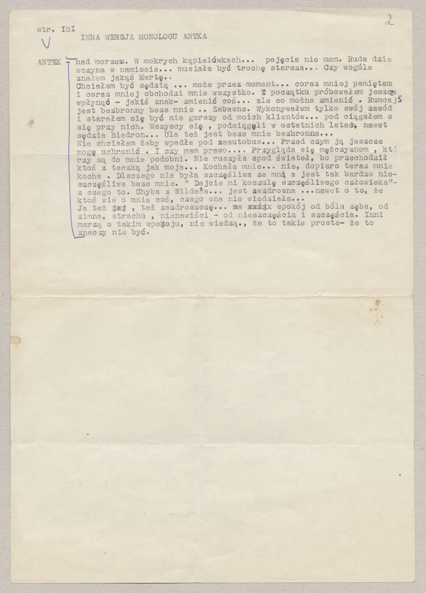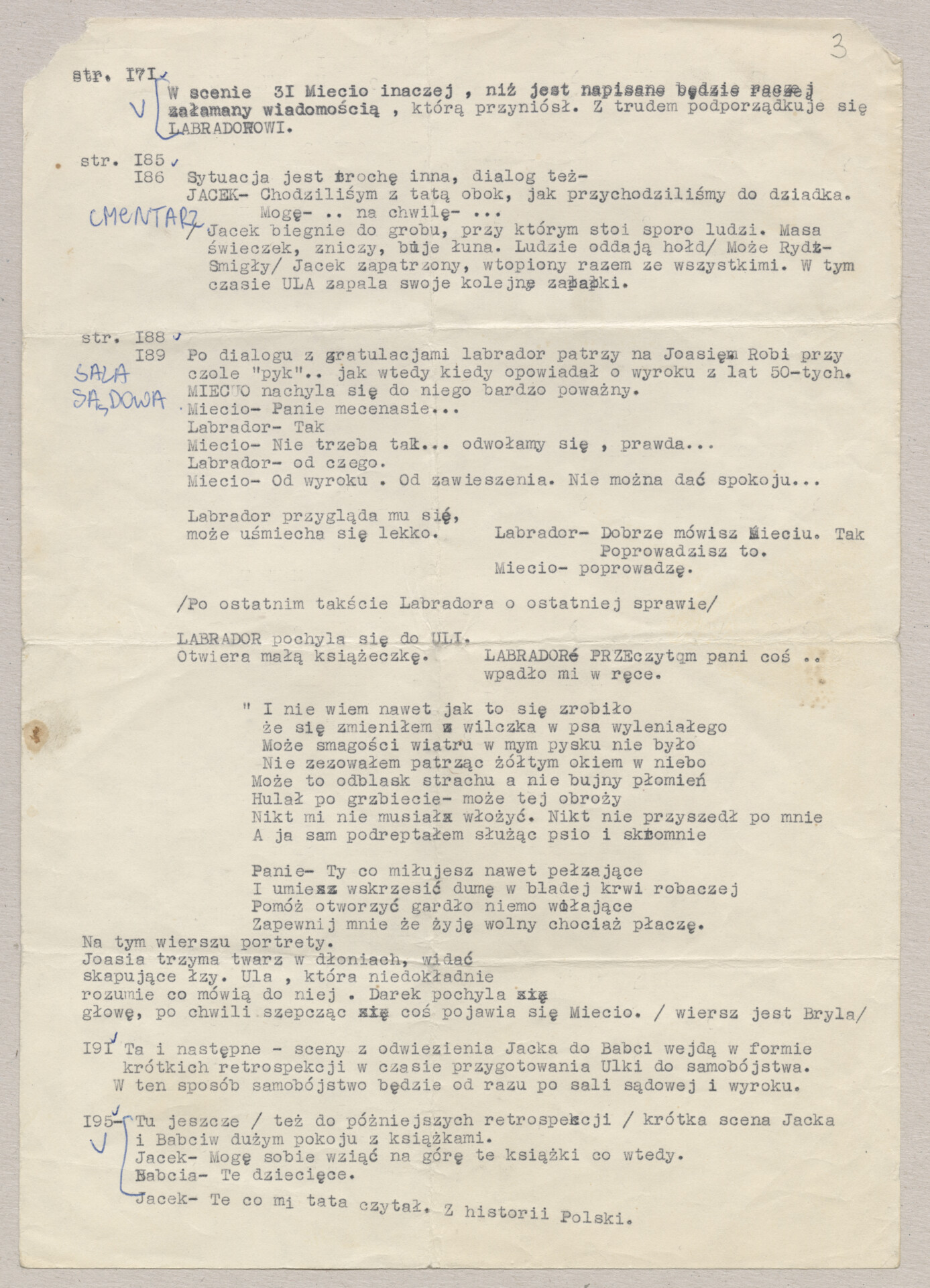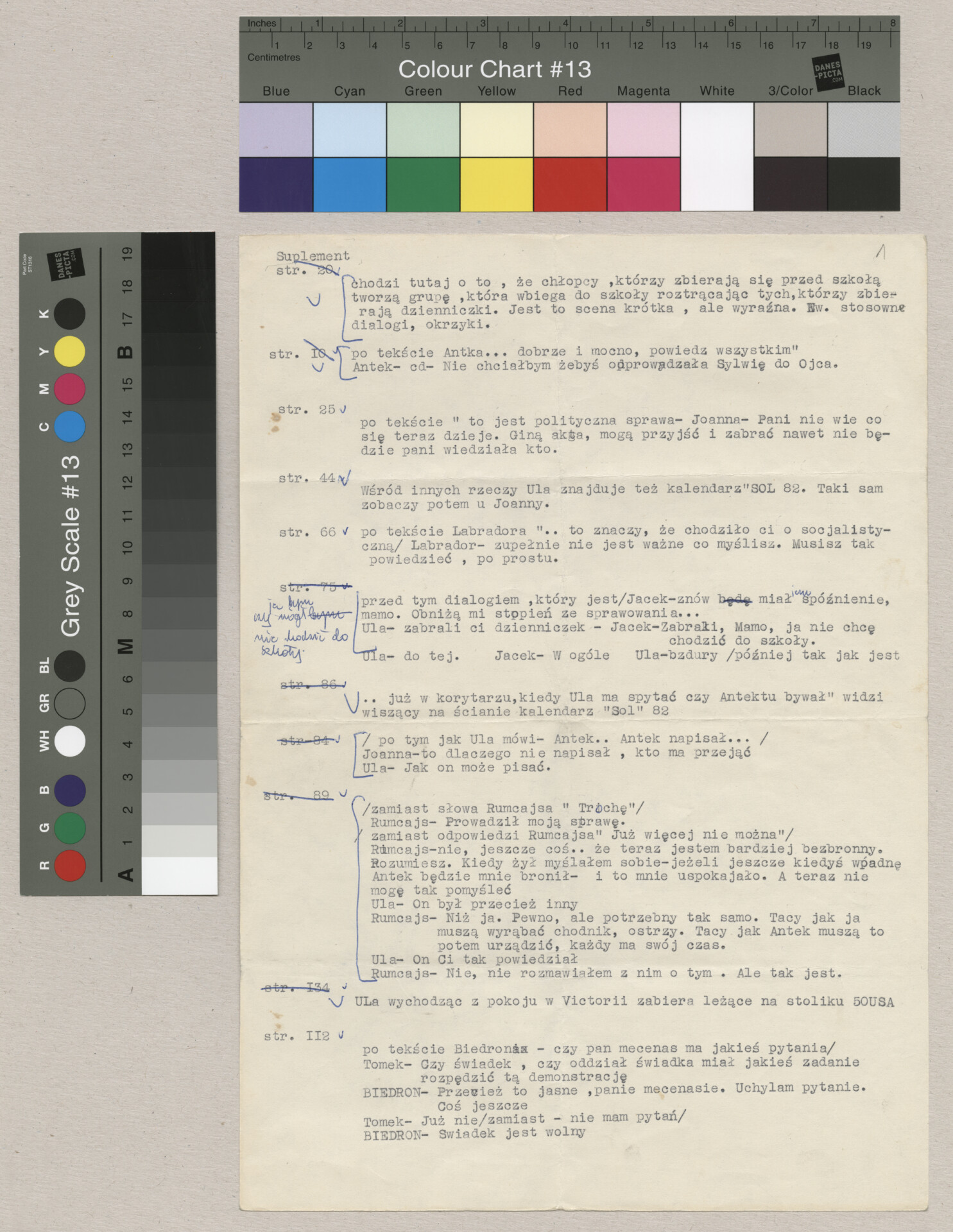 Maszynopis z suplementem do filmu Krzysztofa Kieślowskiego “Bez końca” (1984). Nosi on tu jeszcze pierwotny tytuł “Szczęśliwy koniec”. Zdjęcia do tego filmu zrealizował Jacek Petrycki. Film został wyprodukowany przez Zespół Filmowy Tor. Scenariusz został napisany wspólnie przez Krzysztofa Kieślowskiego i Krzysztofa Piesiewicza. Od tego filmu zaczęła się współpraca obu autorów i trwała do śmierci Kieślowskiego w 1996 roku. Dokument zawiera wykaz numeru stron scenopisu, do którego odnoszą się kolejne zmiany. Arkusz 3. ma naderwany lewy górny róg. Zawiera odręczne poprawki i notatki autora.