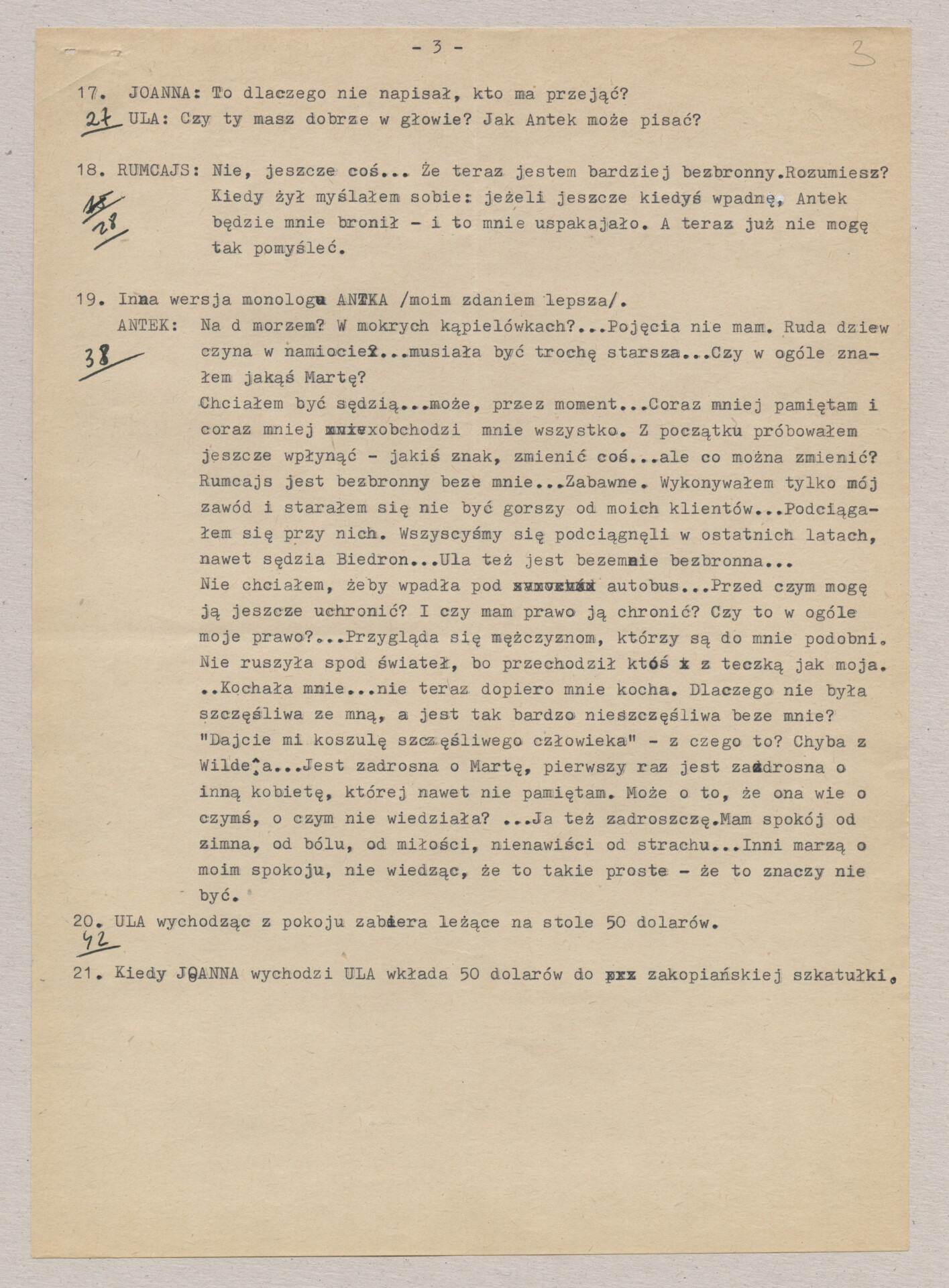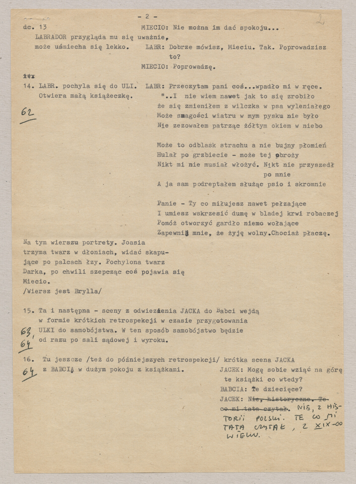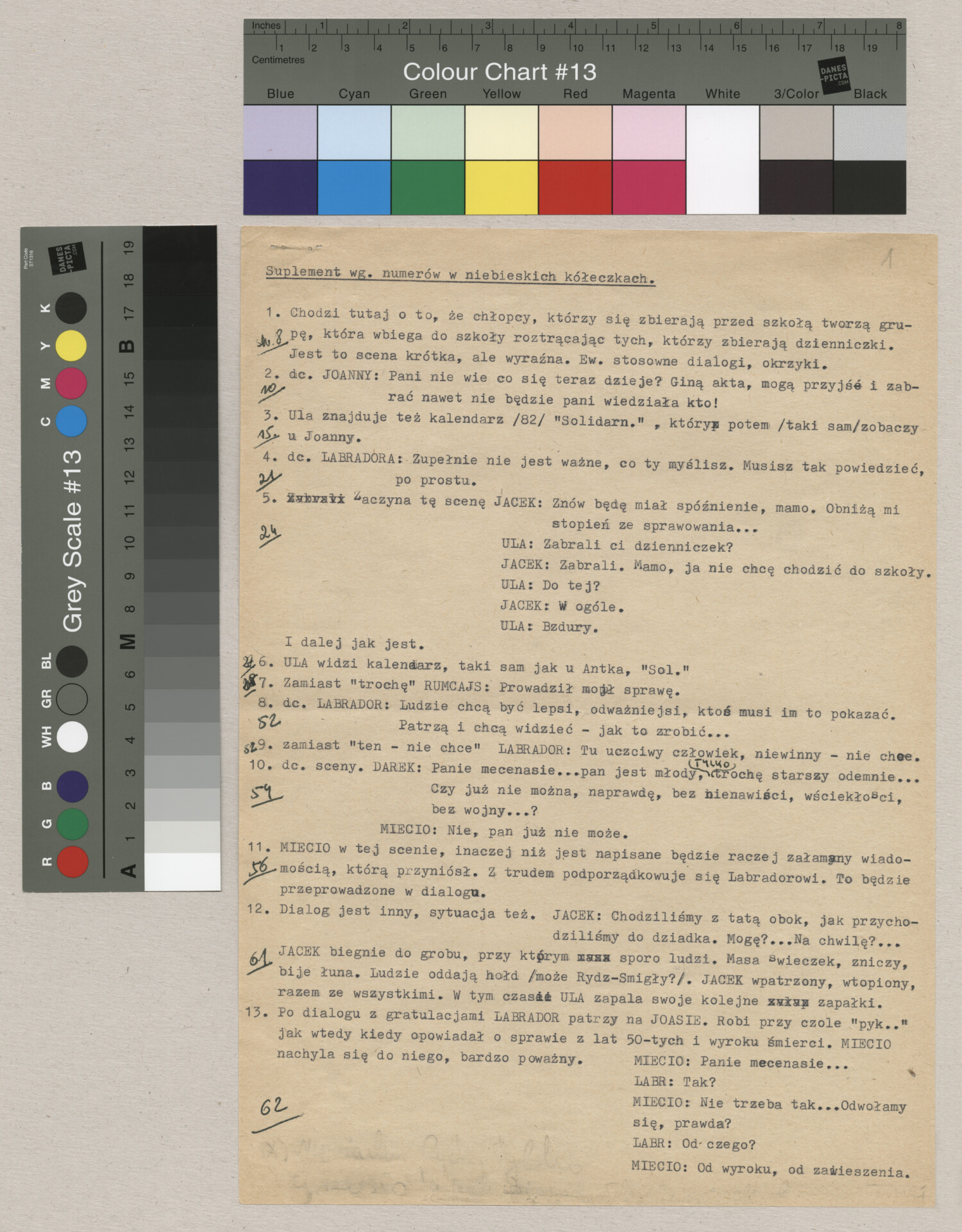 Maszynopis z suplementem do filmu Krzysztofa Kieślowskiego “Bez końca” (1984). Nosi on tu jeszcze pierwotny tytuł “Szczęśliwy koniec”. Zdjęcia do tego filmu zrealizował Jacek Petrycki. Film został wyprodukowany przez Zespół Filmowy Tor. Scenariusz został napisany wspólnie przez Krzysztofa Kieślowskiego i Krzysztofa Piesiewicza. Od tego filmu zaczęła się współpraca obu autorów i trwała do śmierci Kieślowskiego w 1996 roku. Dokument zawiera wykaz numeru stron scenopisu, do którego odnoszą się kolejne zmiany. Zawiera odręczne poprawki i notatki autora.