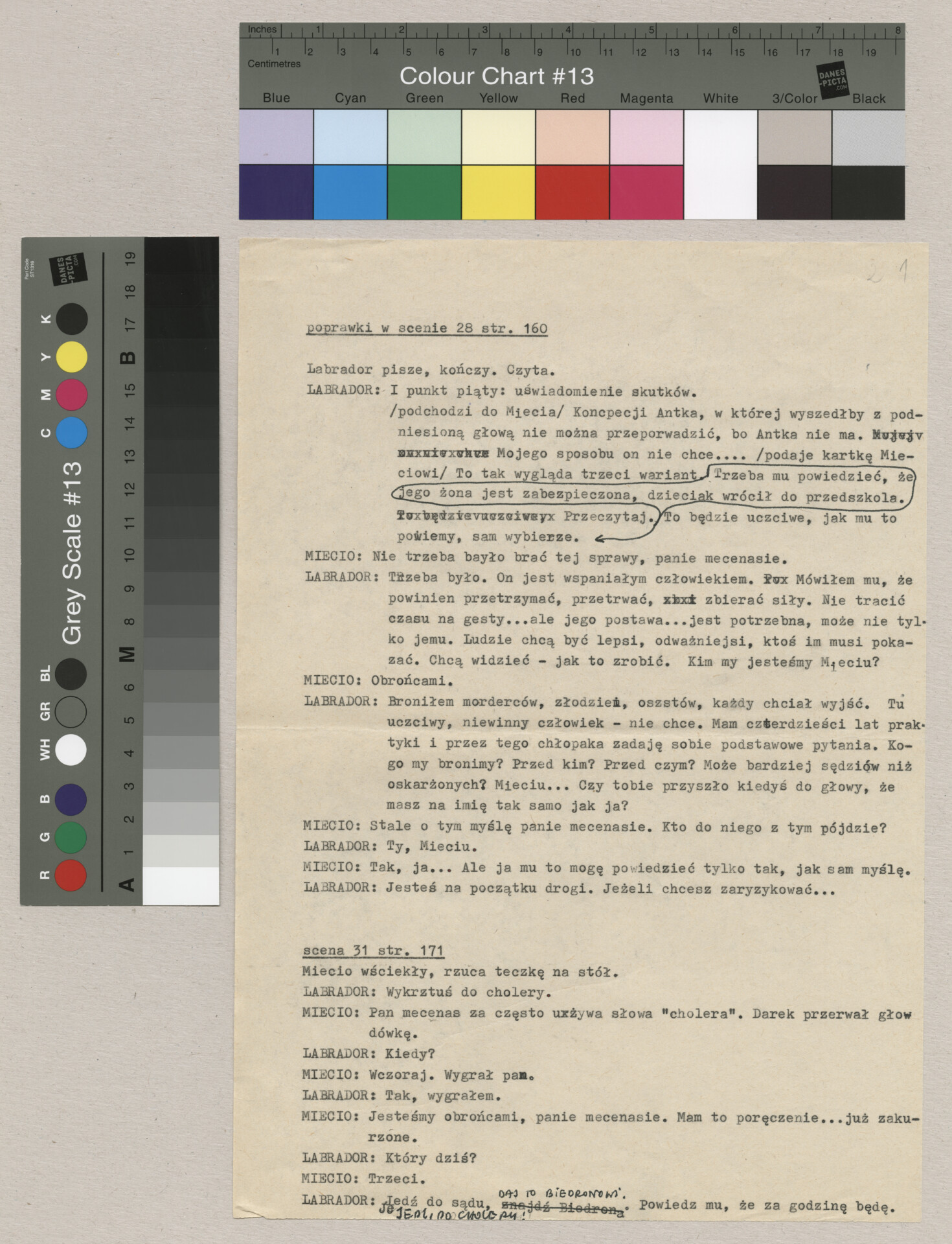 Maszynopis z poprawkami w scenie 28. i 31. do filmu Krzysztofa Kieślowskiego “Bez końca” (1984). Nosi on tu jeszcze pierwotny tytuł “Szczęśliwy koniec”. Zdjęcia do tego filmu zrealizował Jacek Petrycki. Film został wyprodukowany przez Zespół Filmowy Tor. Scenariusz został napisany wspólnie przez Krzysztofa Kieślowskiego i Krzysztofa Piesiewicza. Od tego filmu zaczęła się współpraca obu autorów i trwała do śmierci Kieślowskiego w 1996 roku. Jest to jedna strona maszynopisu, nienumerowana, z nagłówkami “Poprawki w scenie 28, str. 160” oraz “Scena 31, str. 171”. Zawiera odręczne poprawki i notatki autora. Różne wersje tego dokumentu mają sygnatury: ATKK-BK-I-030, ATKK-BK-I-031, ATKK-BK-I-035, ATKK-BK-I-033, ATKK-BK-I-040.