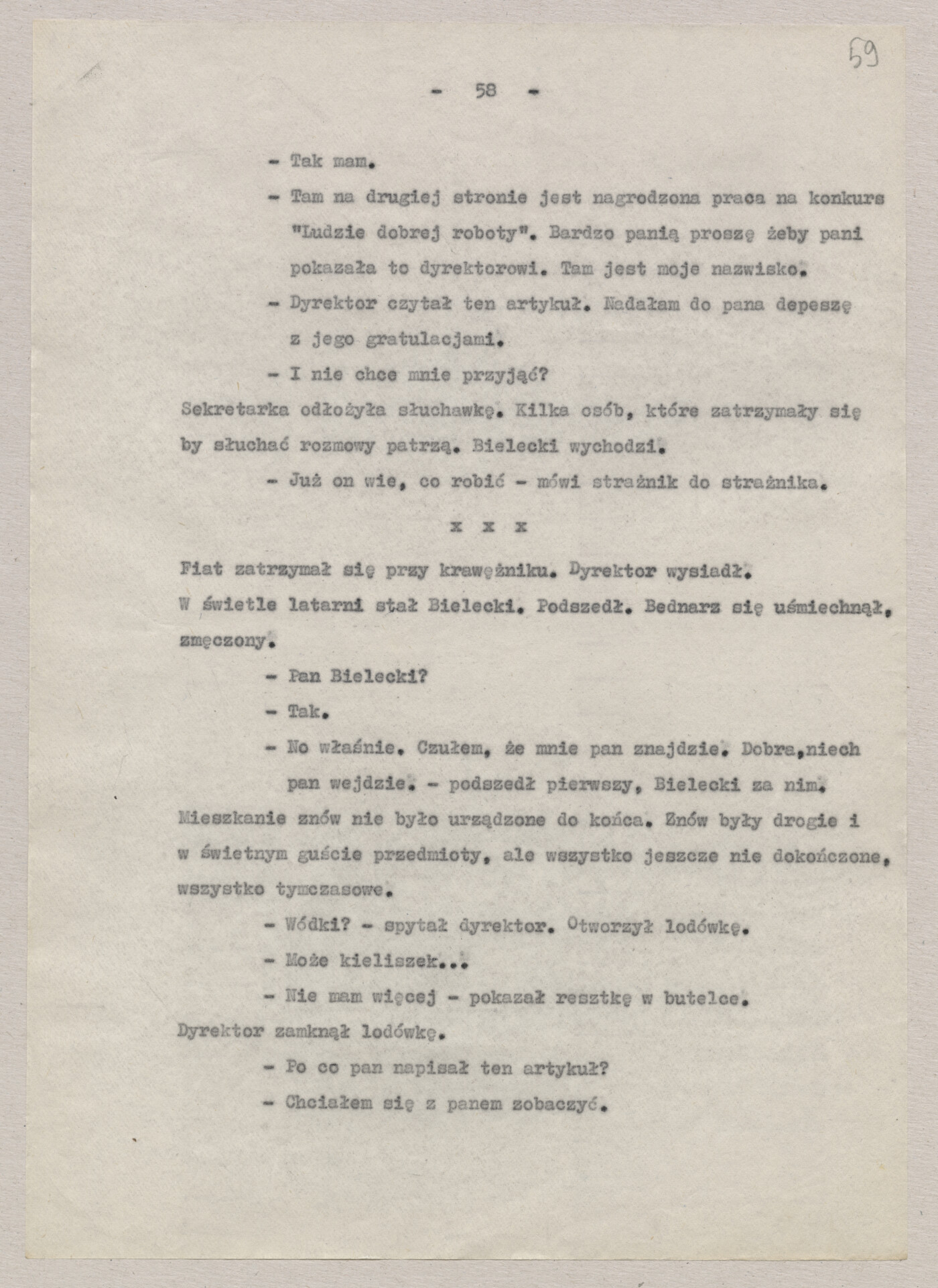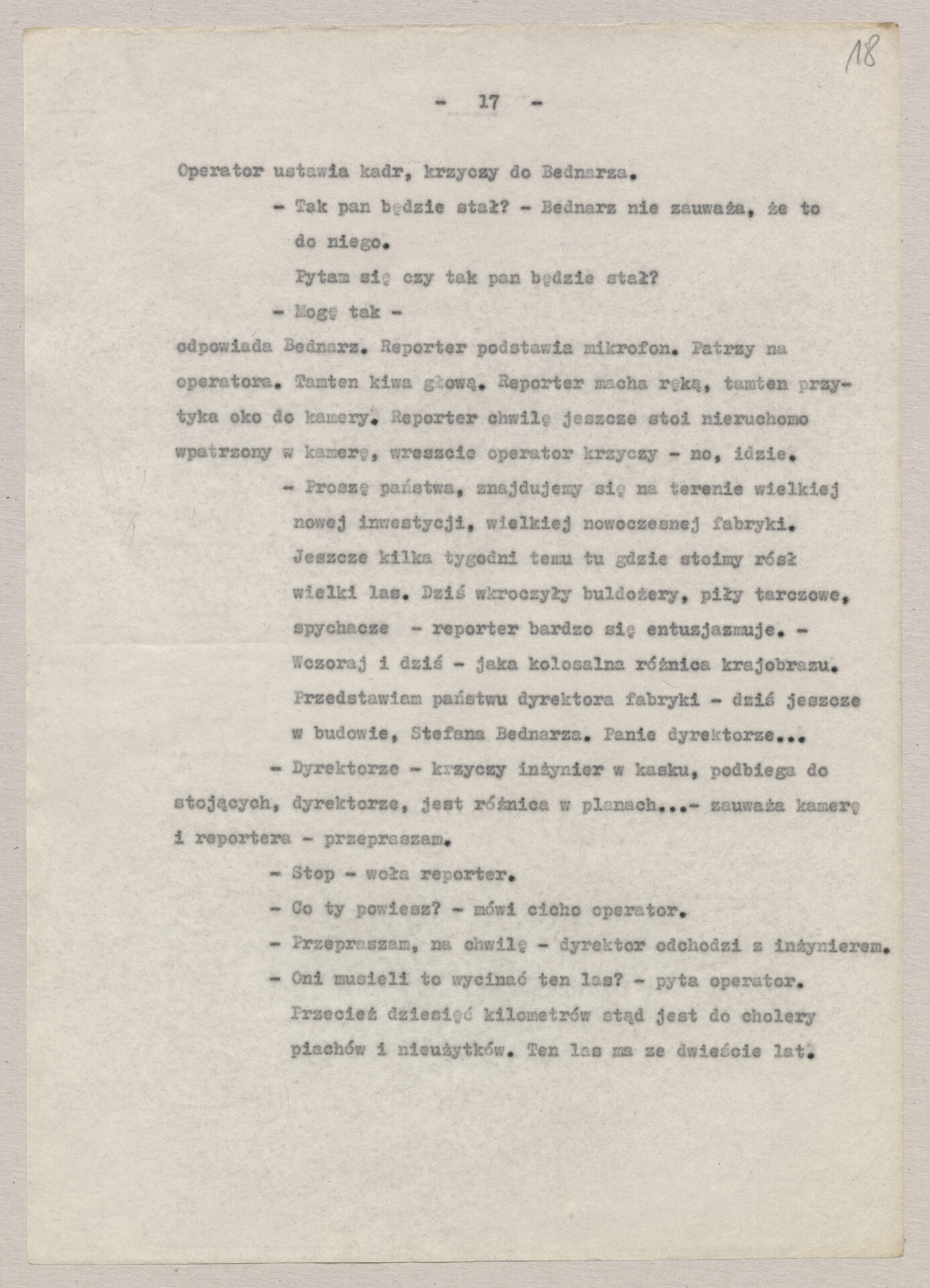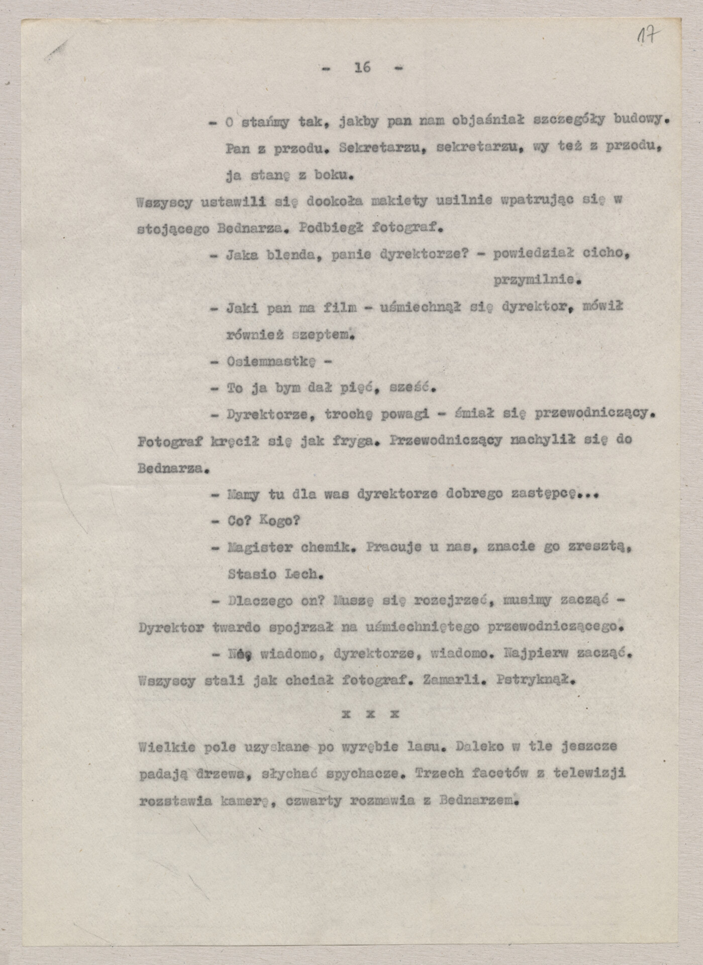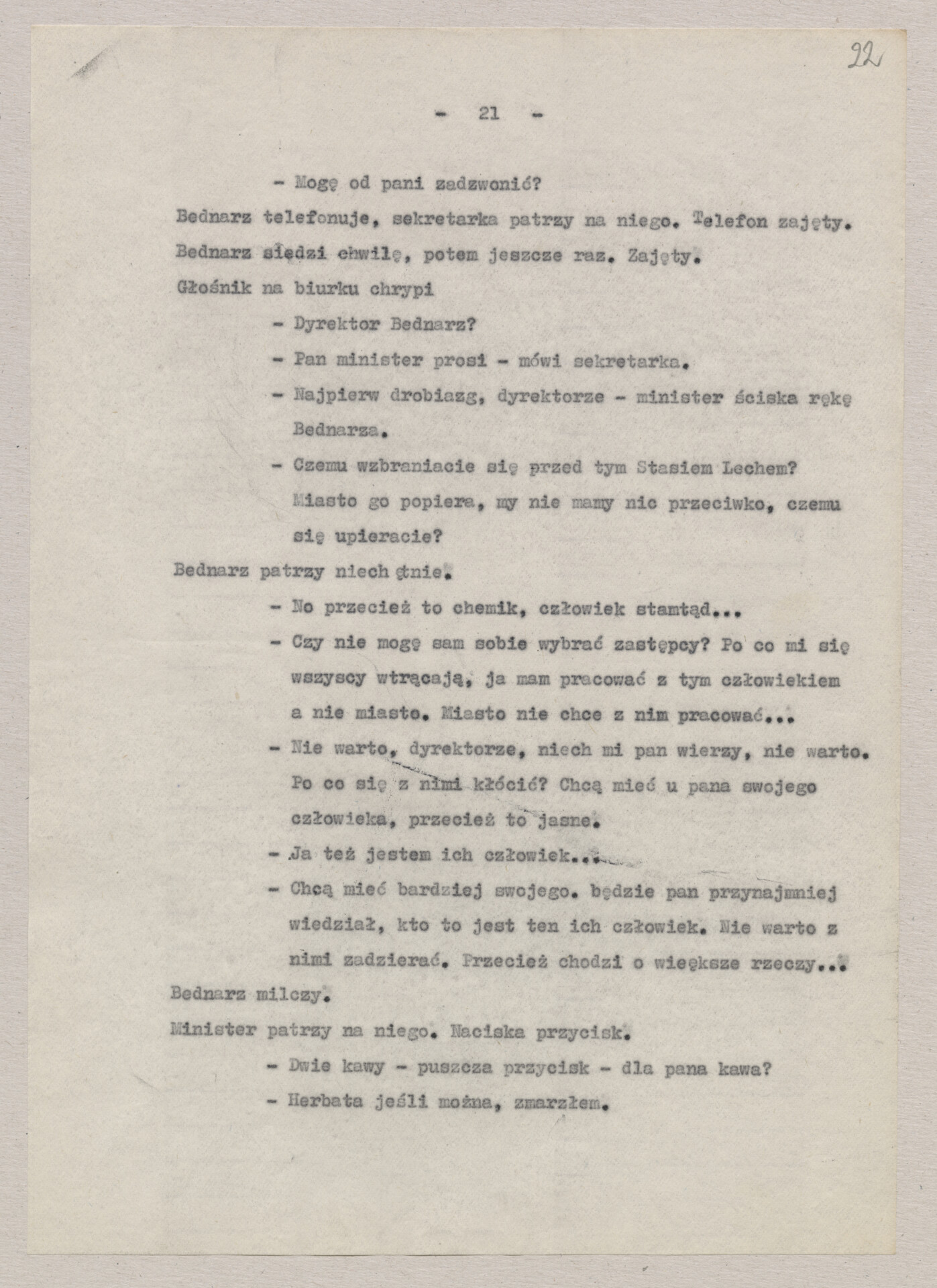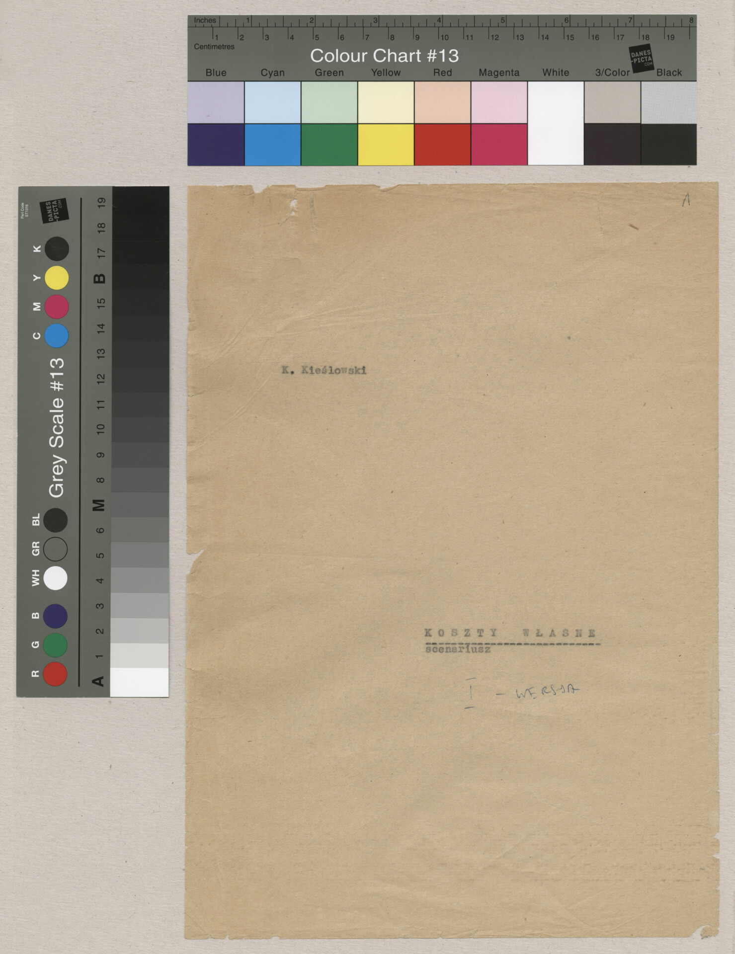 Kopia maszynopisu ze scenariuszem do filmu Krzysztofa Kieślowskiego “Blizna” (1976). Początkowo scenariusz nosił tytuł “Koszty własne”, później tytuł zmieniono na “Nasz człowiek”. Scenariusz napisany przez Krzysztofa Kieślowskiego powstał na bazie reportażu Romualda Karasia o budowie Zakładów Azotowych w Puławach, co było pomysłem Witolda Zalewskiego, kierownika literackiego “Toru”. Scenariusz został złożony w 1974 roku w Zespole Filmowym “Tor”. Inna wersja tego dokumentu ma sygnaturę ATKK-BLI-I-004.