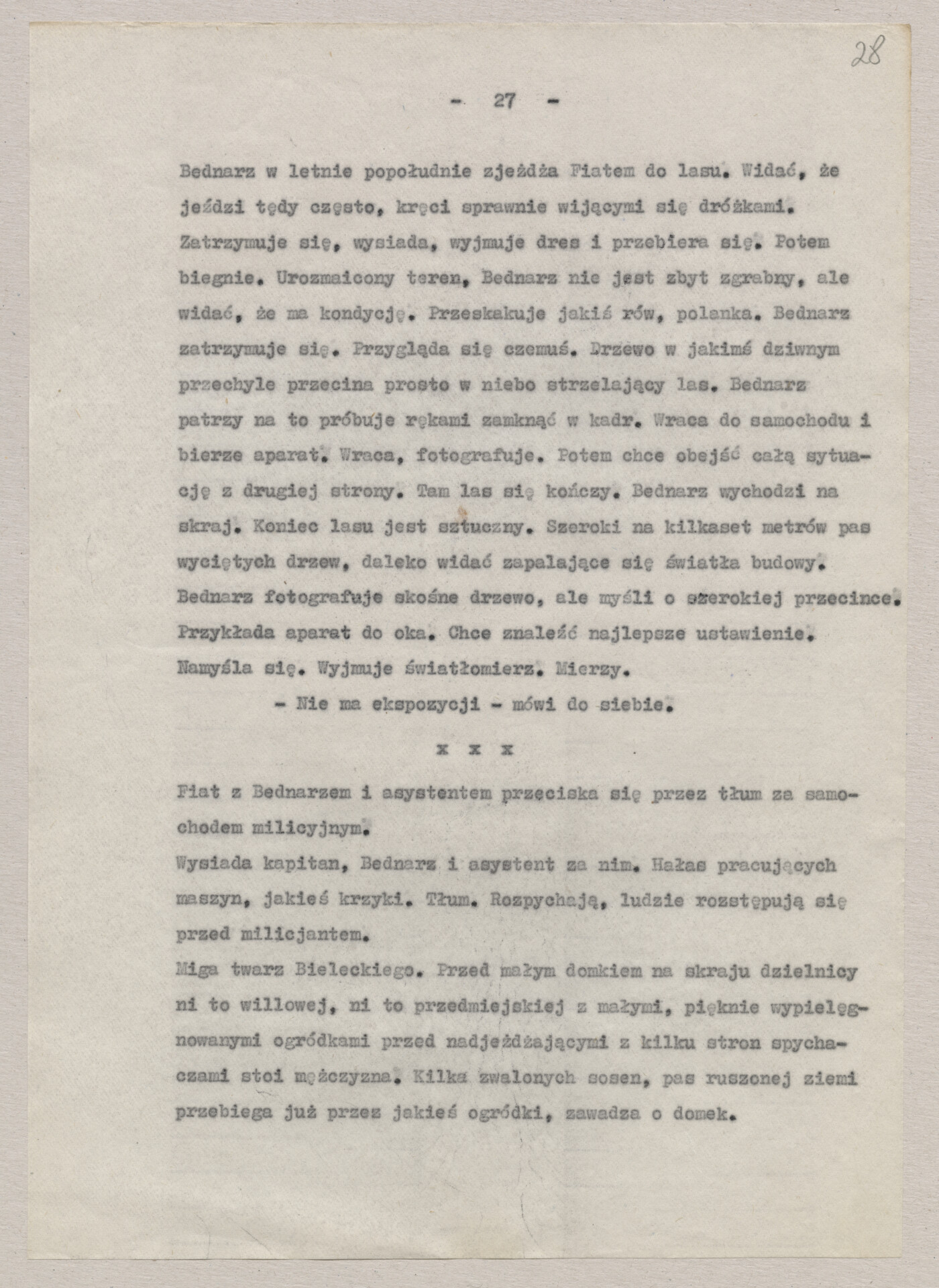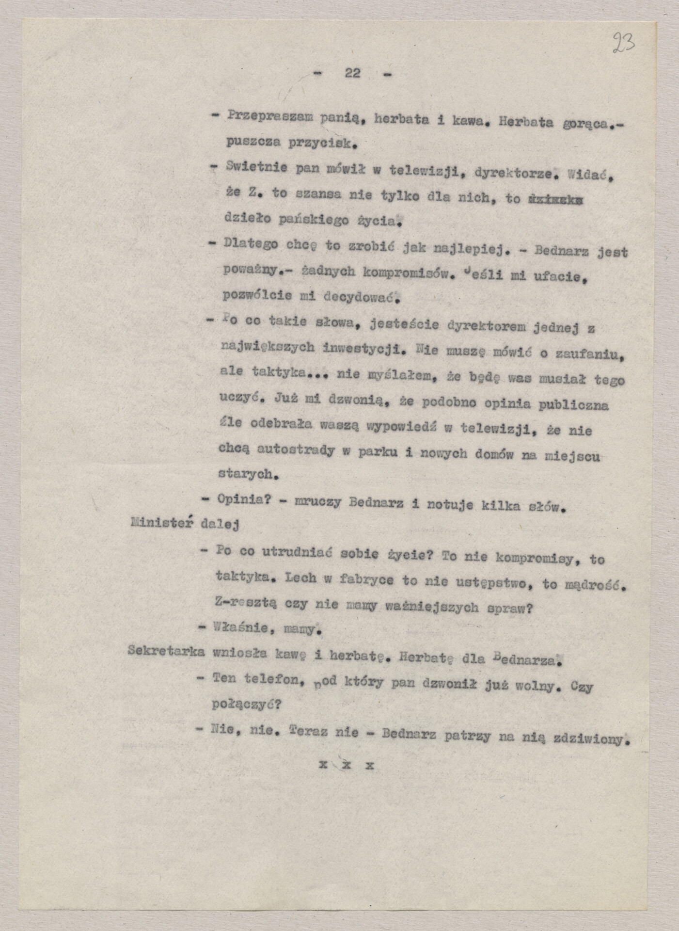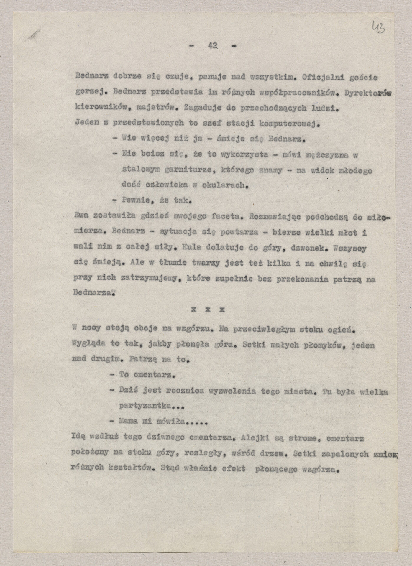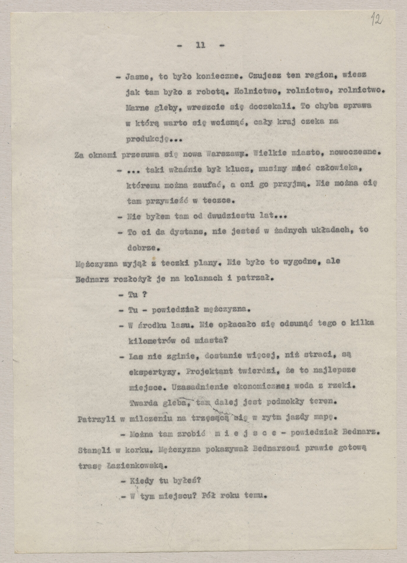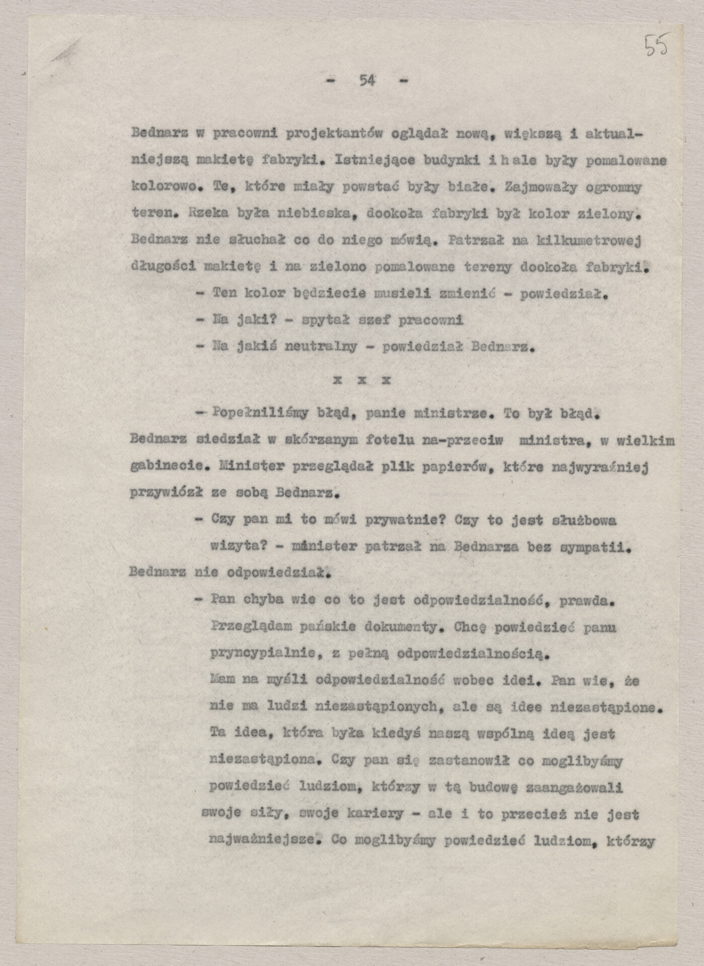 Kopia maszynopisu ze scenariuszem do filmu Krzysztofa Kieślowskiego “Blizna” (1976). Początkowo scenariusz nosił tytuł “Koszty własne”, później tytuł zmieniono na “Nasz człowiek”. Scenariusz napisany przez Krzysztofa Kieślowskiego powstał na bazie reportażu Romualda Karasia o budowie Zakładów Azotowych w Puławach, co było pomysłem Witolda Zalewskiego, kierownika literackiego “Toru”. Scenariusz został złożony w 1974 roku w Zespole Filmowym “Tor”. Inna wersja tego dokumentu ma sygnaturę ATKK-BLI-I-004.