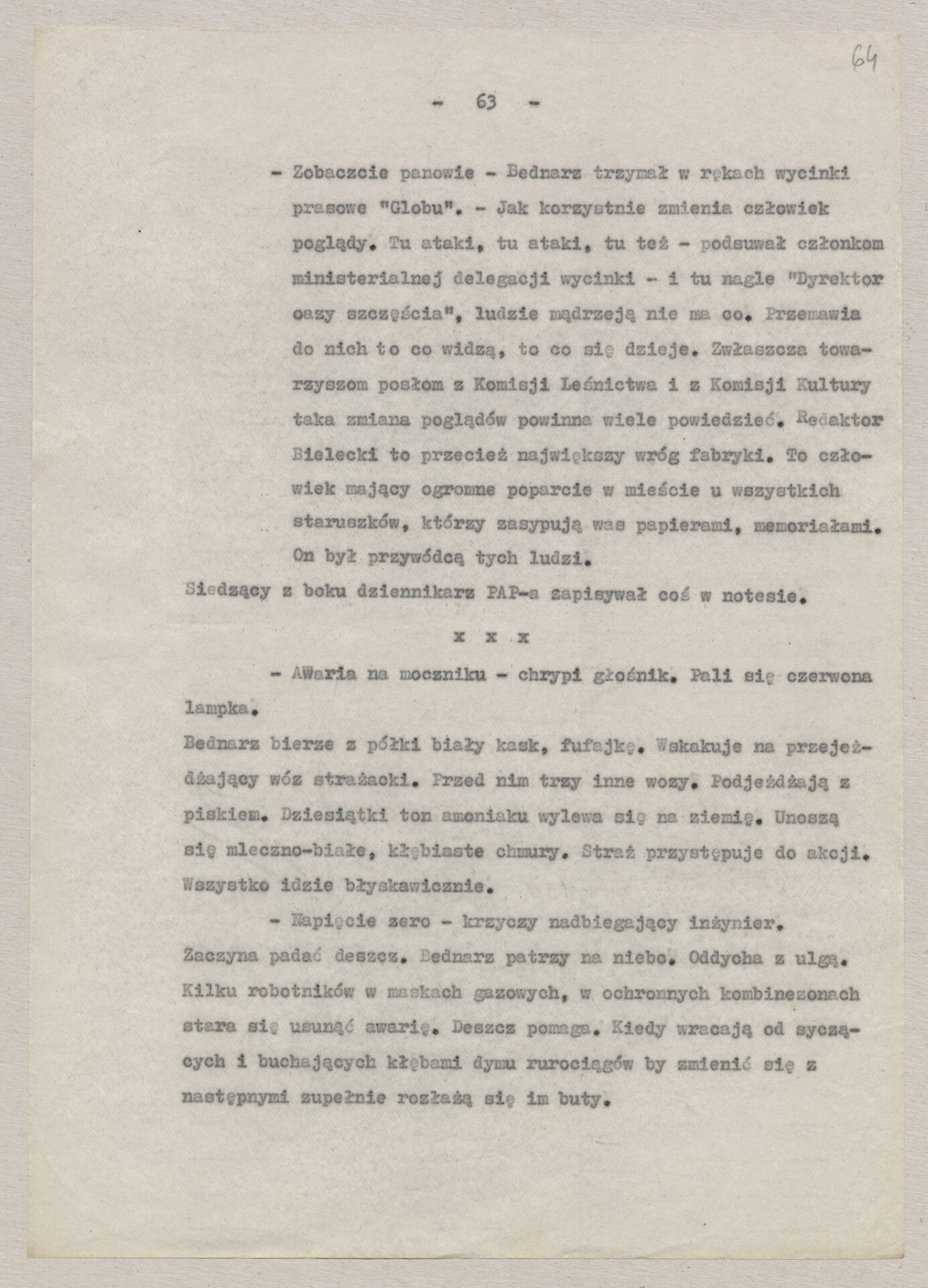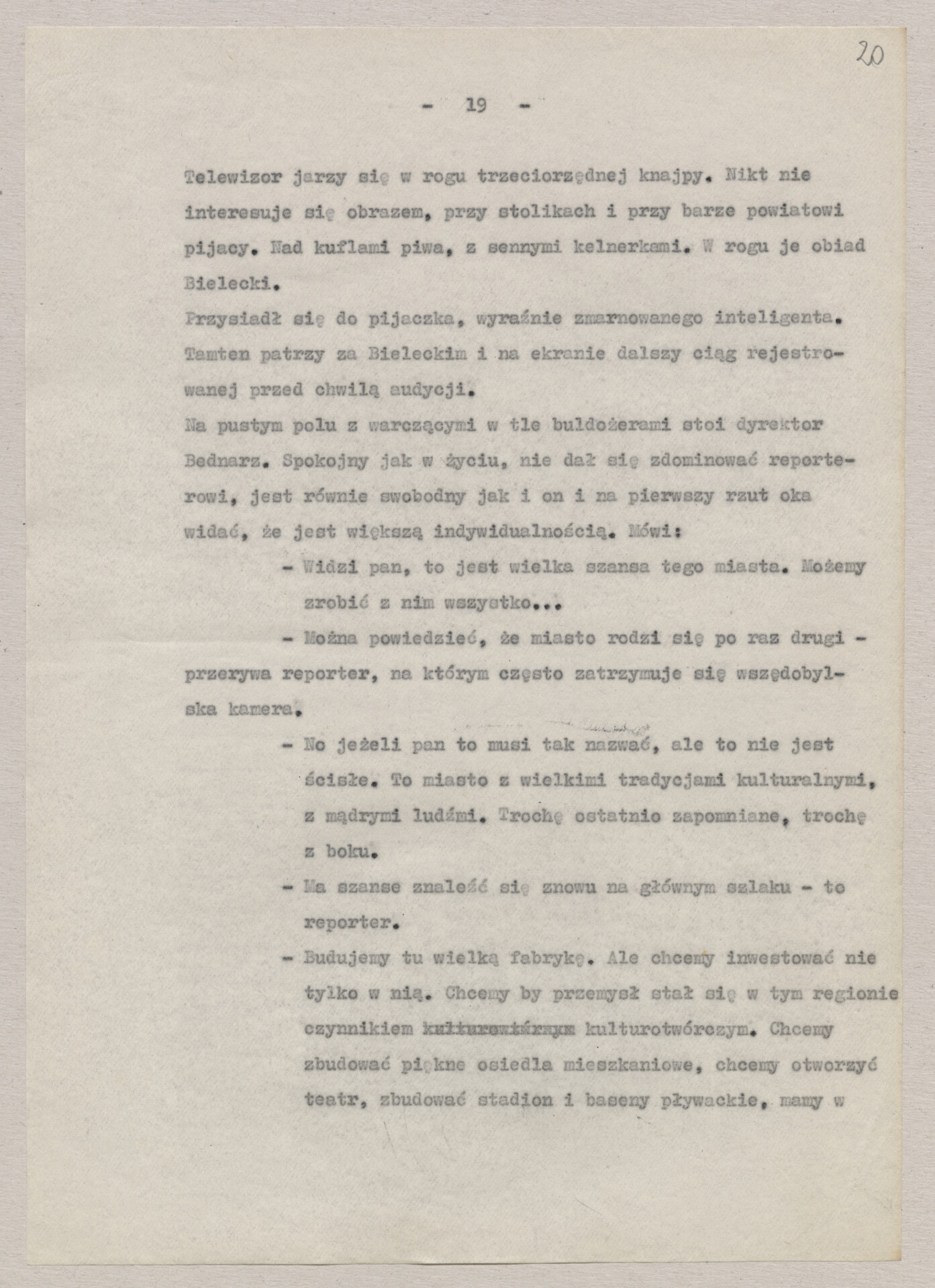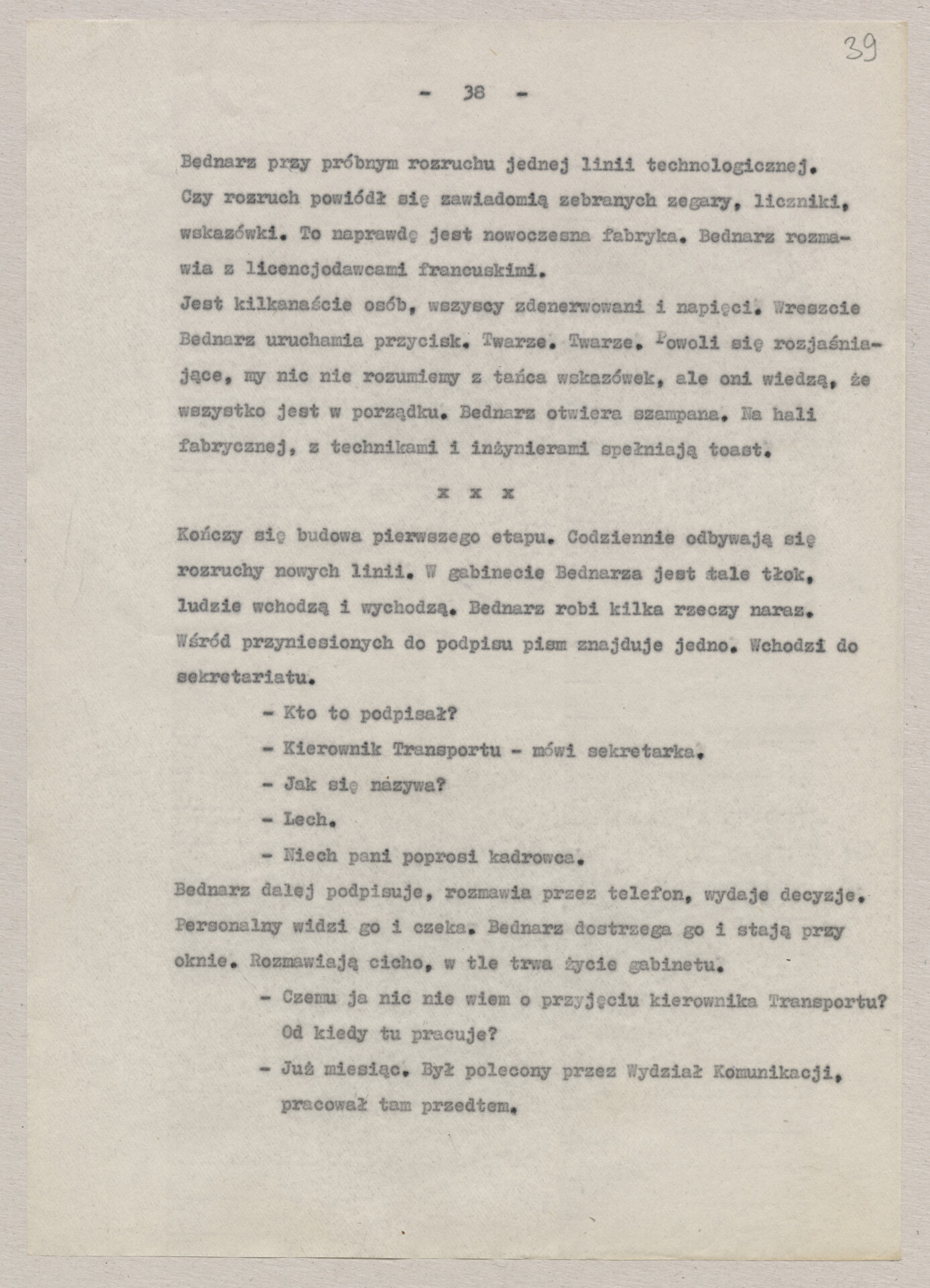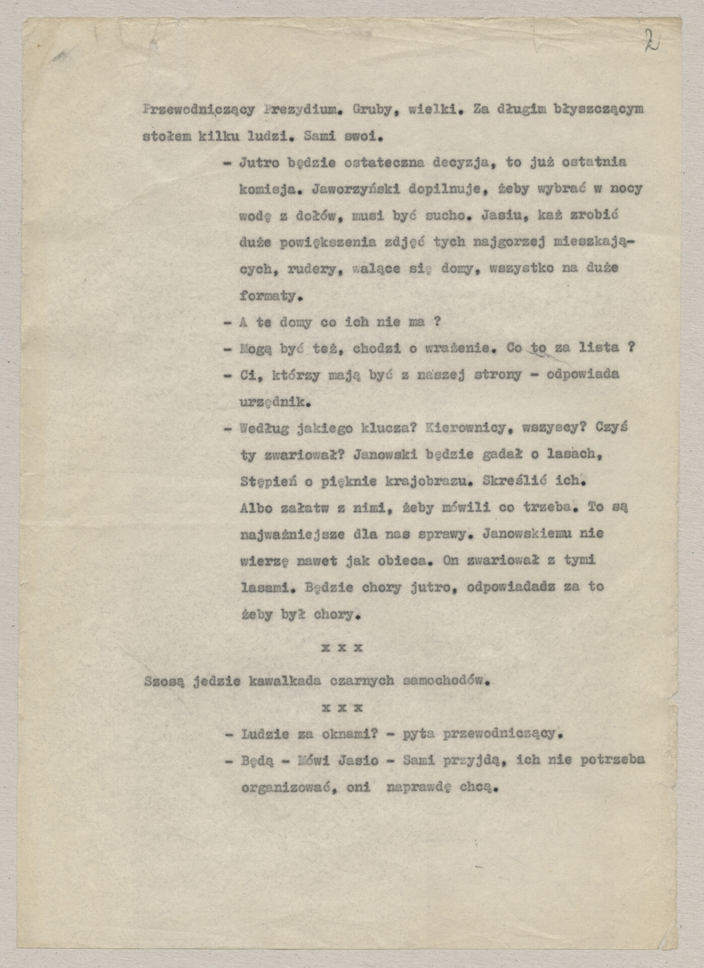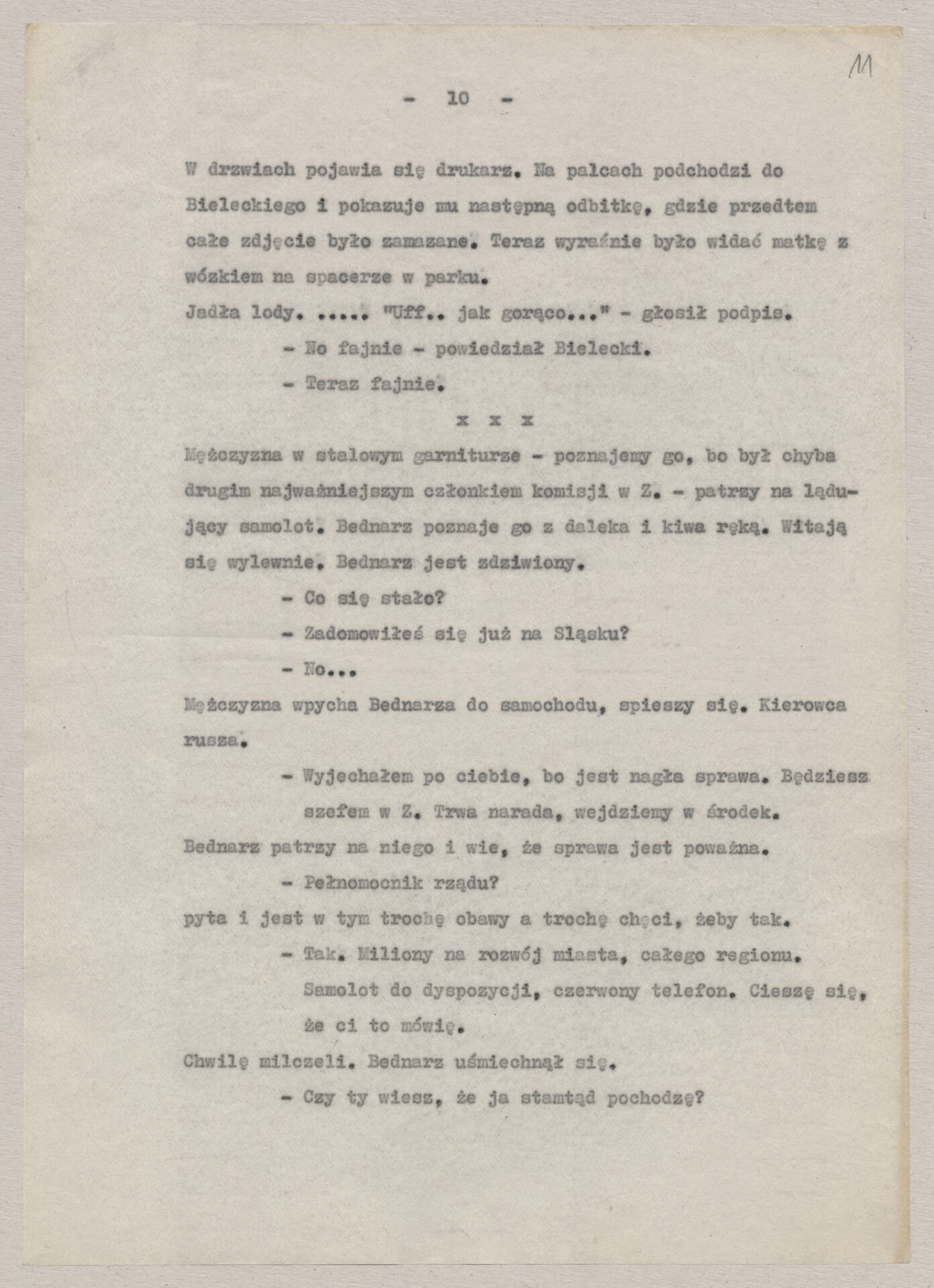 Kopia maszynopisu ze scenariuszem do filmu Krzysztofa Kieślowskiego “Blizna” (1976). Początkowo scenariusz nosił tytuł “Koszty własne”, później tytuł zmieniono na “Nasz człowiek”. Scenariusz napisany przez Krzysztofa Kieślowskiego powstał na bazie reportażu Romualda Karasia o budowie Zakładów Azotowych w Puławach, co było pomysłem Witolda Zalewskiego, kierownika literackiego “Toru”. Scenariusz został złożony w 1974 roku w Zespole Filmowym “Tor”. Inna wersja tego dokumentu ma sygnaturę ATKK-BLI-I-004.