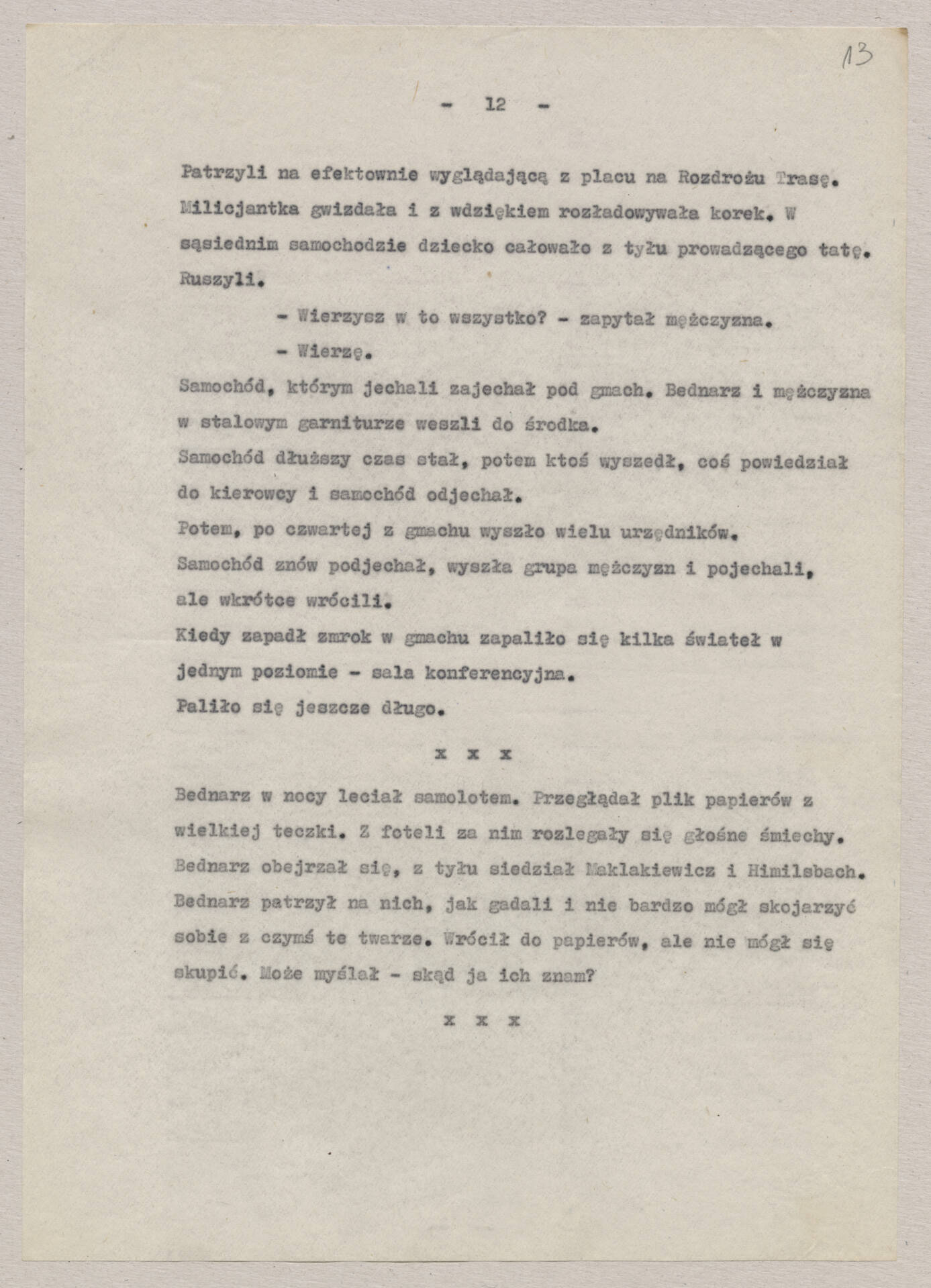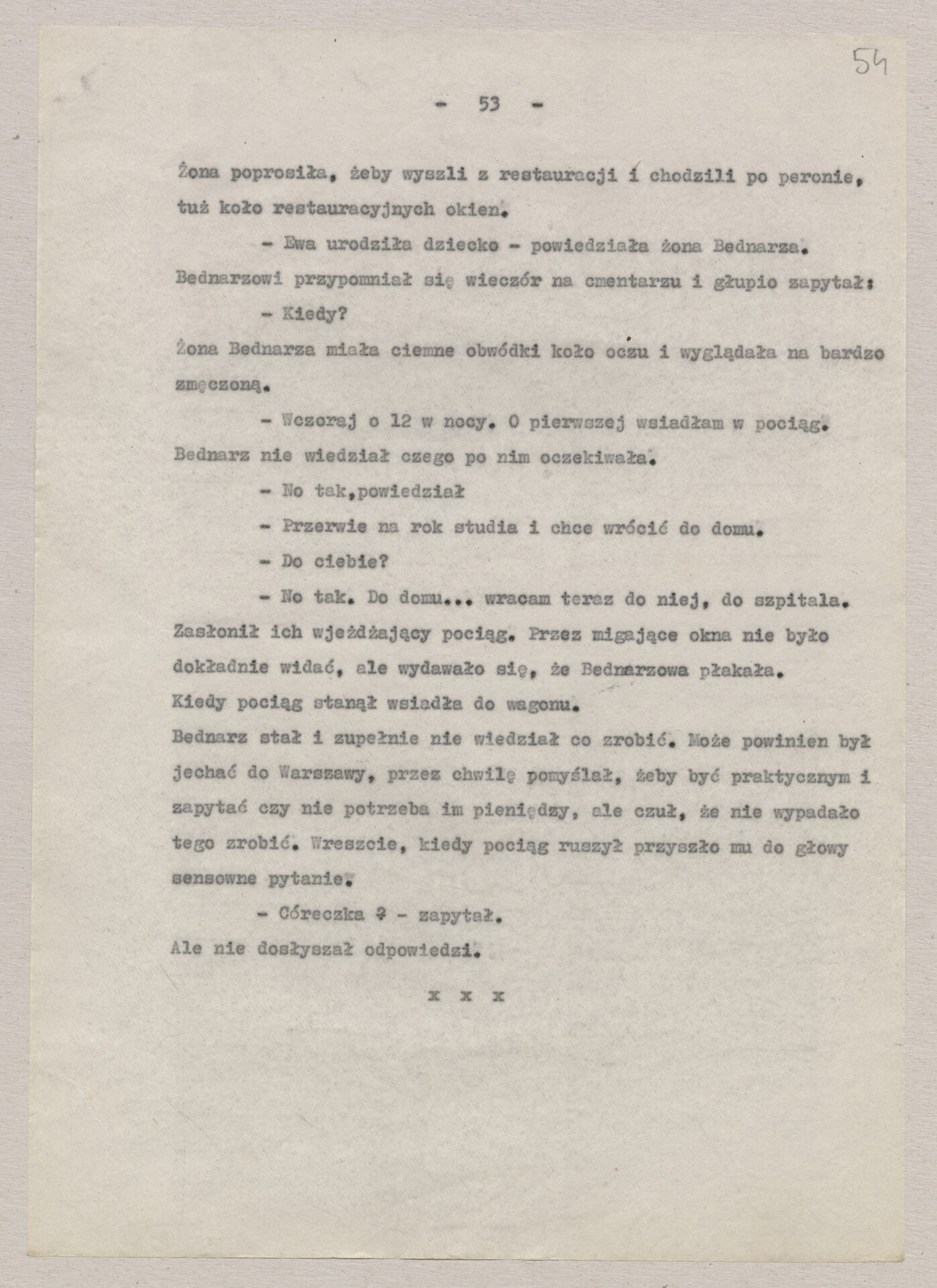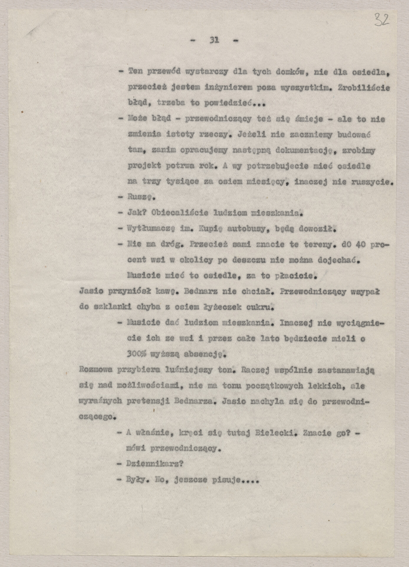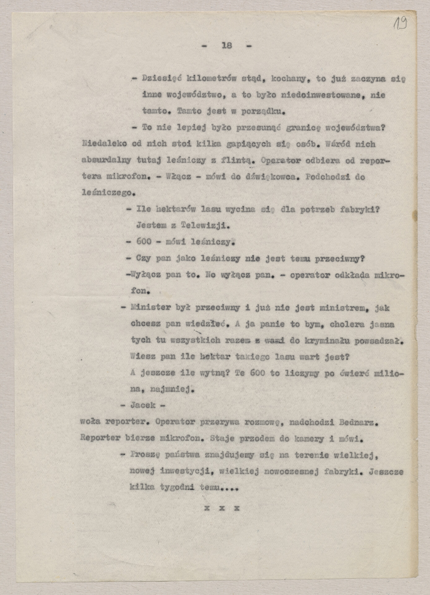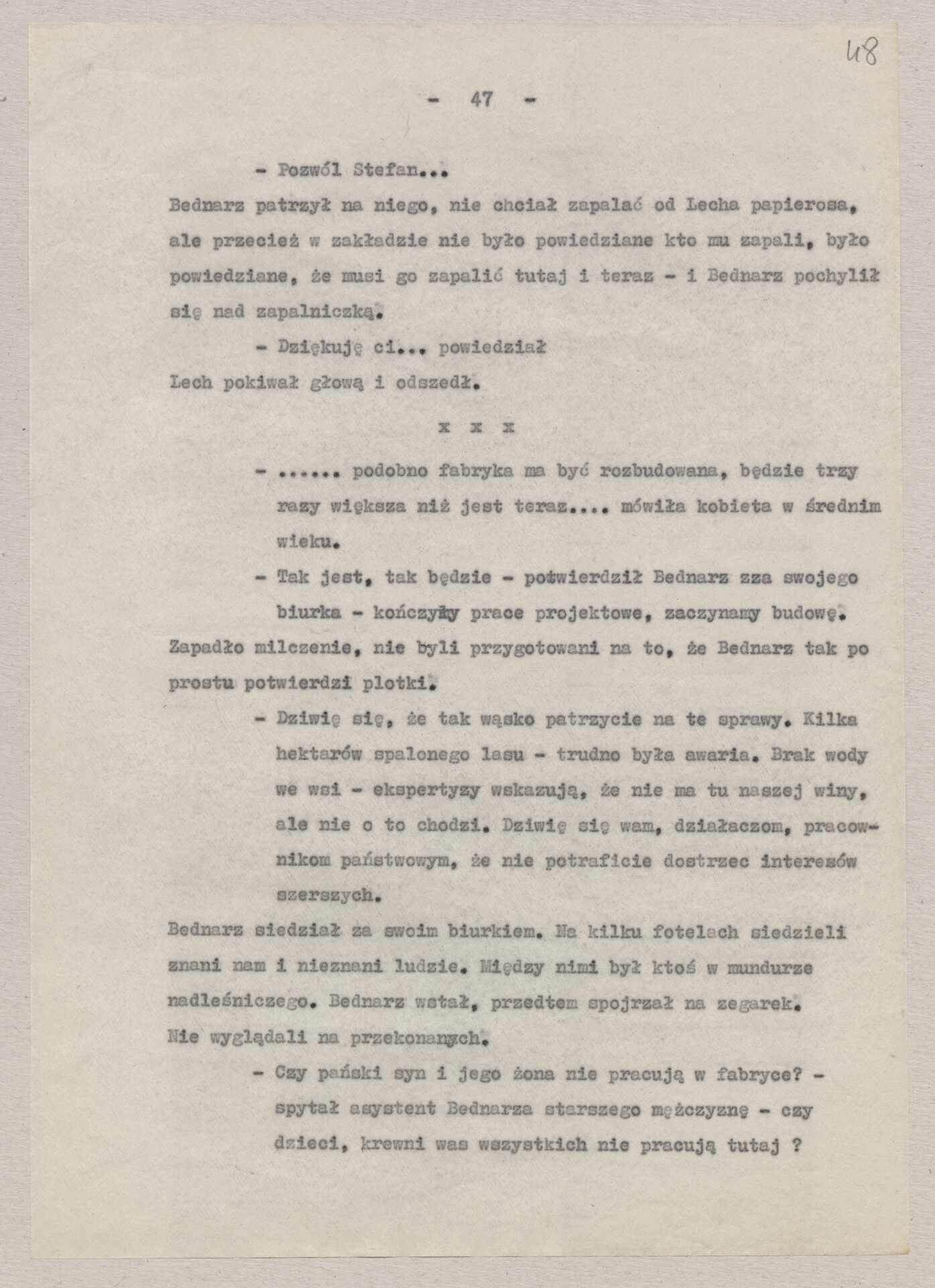 Kopia maszynopisu ze scenariuszem do filmu Krzysztofa Kieślowskiego “Blizna” (1976). Początkowo scenariusz nosił tytuł “Koszty własne”, później tytuł zmieniono na “Nasz człowiek”. Scenariusz napisany przez Krzysztofa Kieślowskiego powstał na bazie reportażu Romualda Karasia o budowie Zakładów Azotowych w Puławach, co było pomysłem Witolda Zalewskiego, kierownika literackiego “Toru”. Scenariusz został złożony w 1974 roku w Zespole Filmowym “Tor”. Inna wersja tego dokumentu ma sygnaturę ATKK-BLI-I-004.
