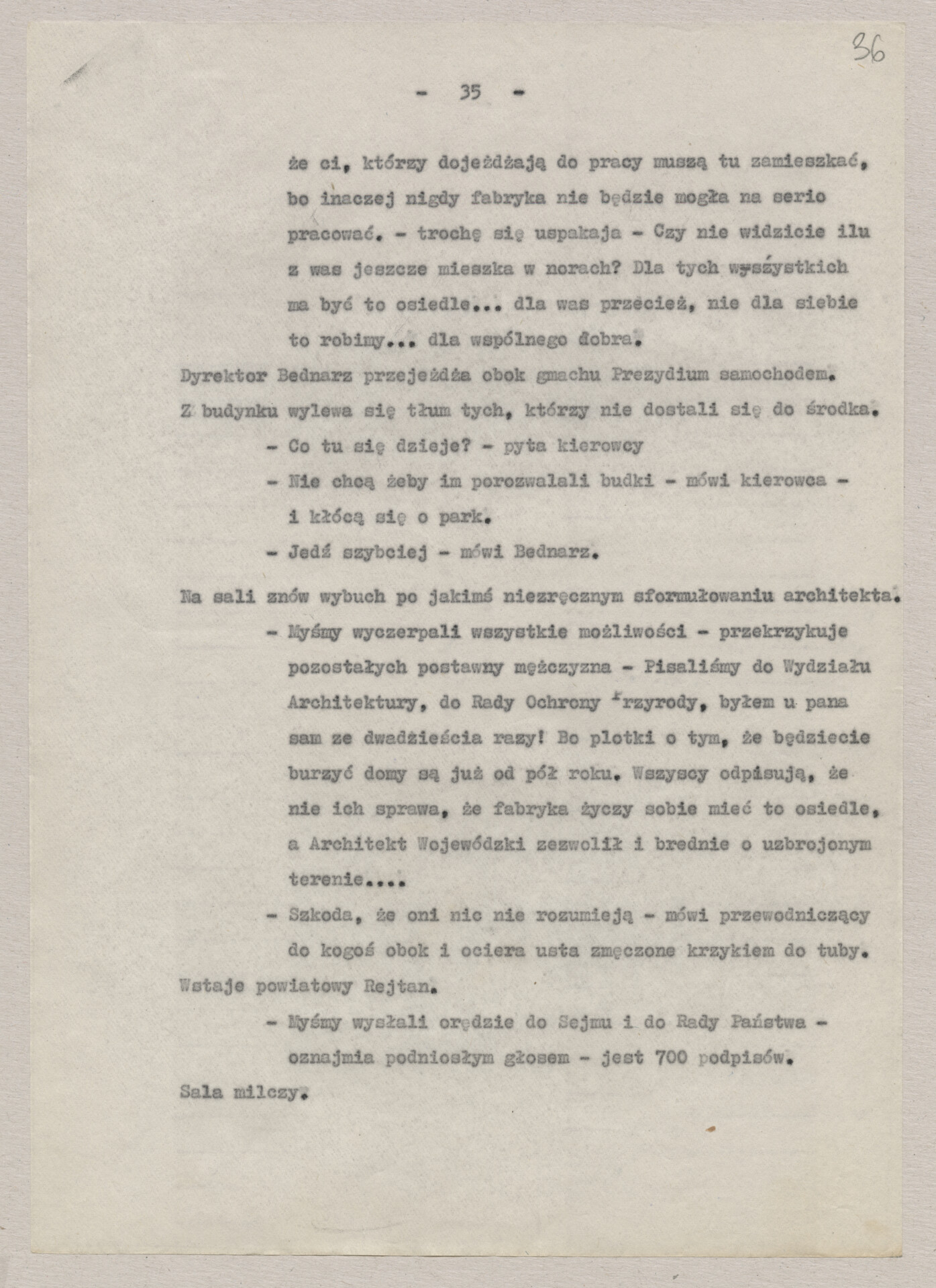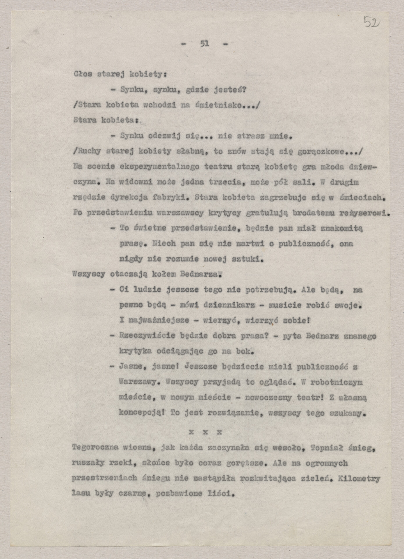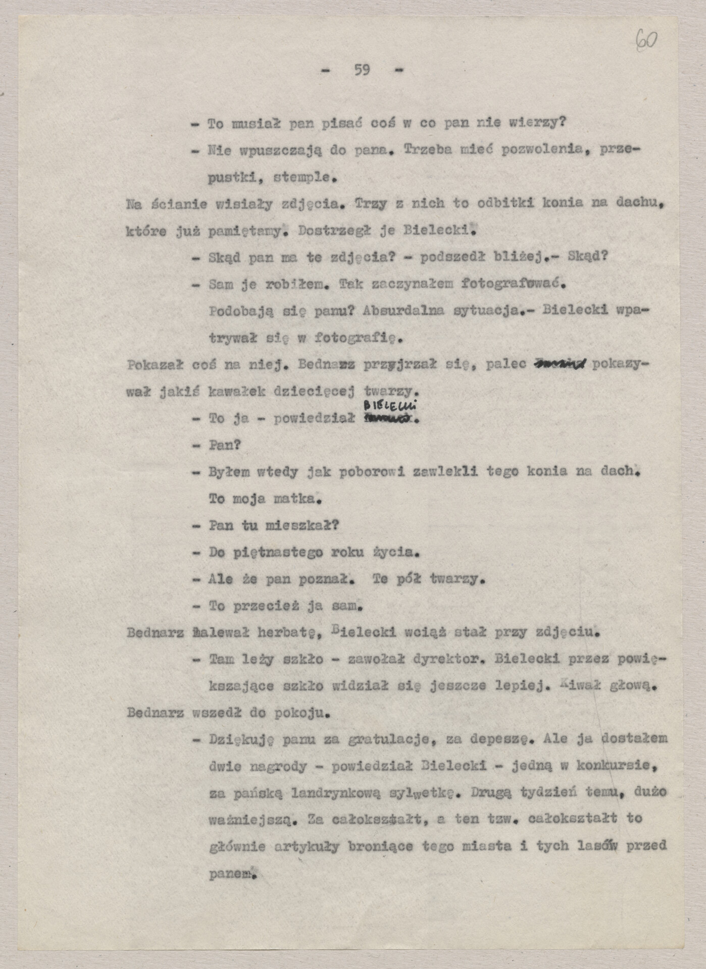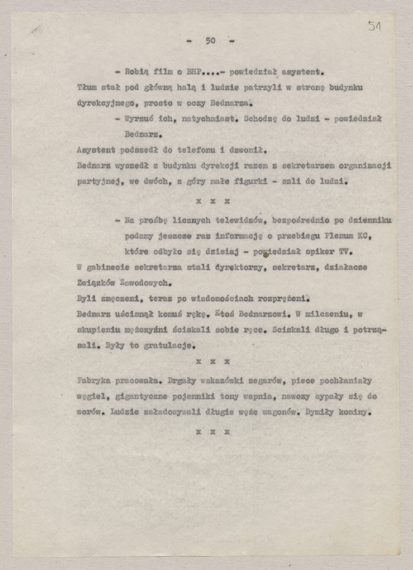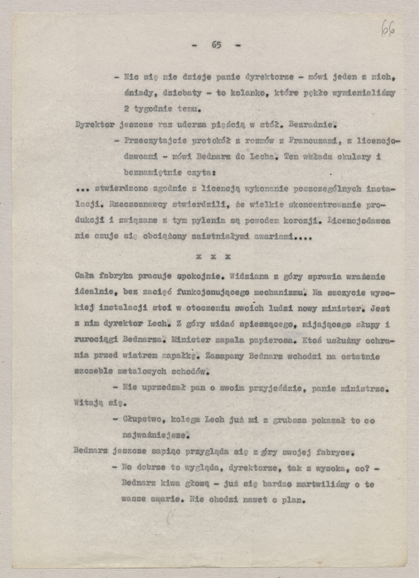 Kopia maszynopisu ze scenariuszem do filmu Krzysztofa Kieślowskiego “Blizna” (1976). Początkowo scenariusz nosił tytuł “Koszty własne”, później tytuł zmieniono na “Nasz człowiek”. Scenariusz napisany przez Krzysztofa Kieślowskiego powstał na bazie reportażu Romualda Karasia o budowie Zakładów Azotowych w Puławach, co było pomysłem Witolda Zalewskiego, kierownika literackiego “Toru”. Scenariusz został złożony w 1974 roku w Zespole Filmowym “Tor”. Inna wersja tego dokumentu ma sygnaturę ATKK-BLI-I-004.