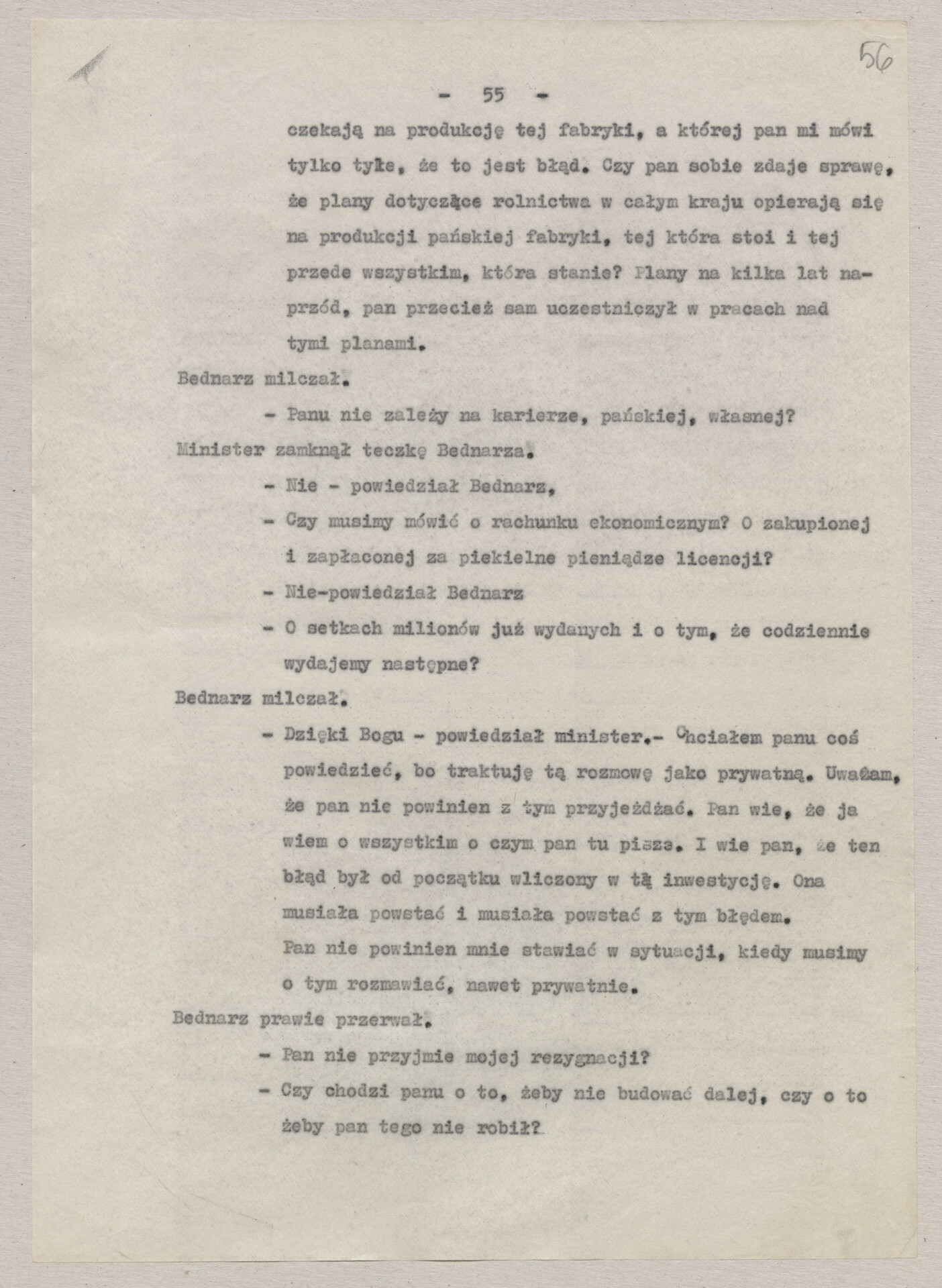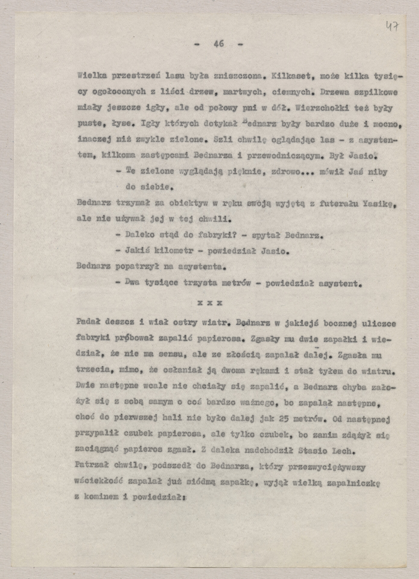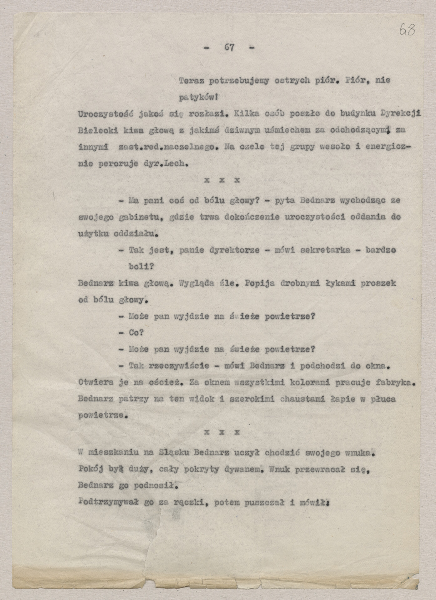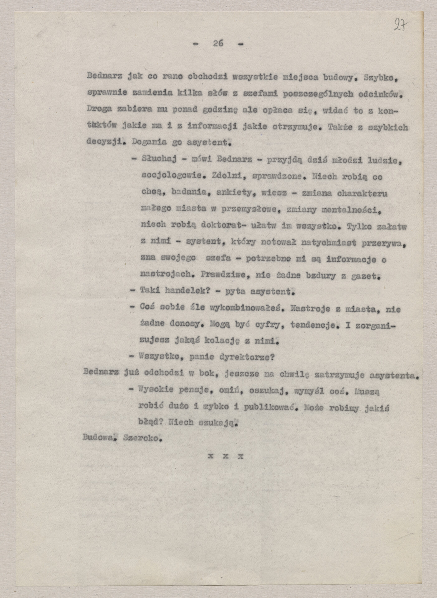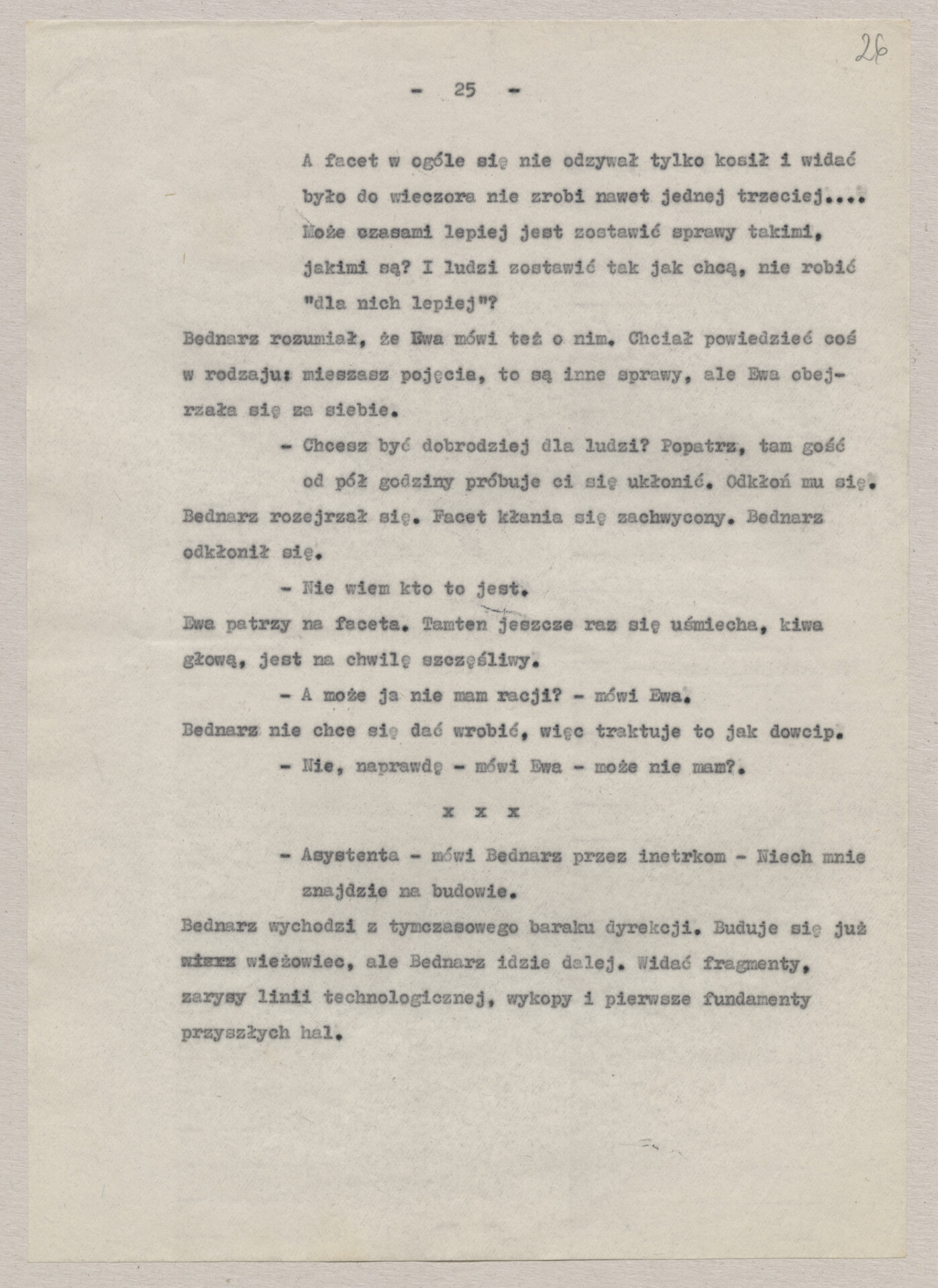 Kopia maszynopisu ze scenariuszem do filmu Krzysztofa Kieślowskiego “Blizna” (1976). Początkowo scenariusz nosił tytuł “Koszty własne”, później tytuł zmieniono na “Nasz człowiek”. Scenariusz napisany przez Krzysztofa Kieślowskiego powstał na bazie reportażu Romualda Karasia o budowie Zakładów Azotowych w Puławach, co było pomysłem Witolda Zalewskiego, kierownika literackiego “Toru”. Scenariusz został złożony w 1974 roku w Zespole Filmowym “Tor”. Inna wersja tego dokumentu ma sygnaturę ATKK-BLI-I-004.