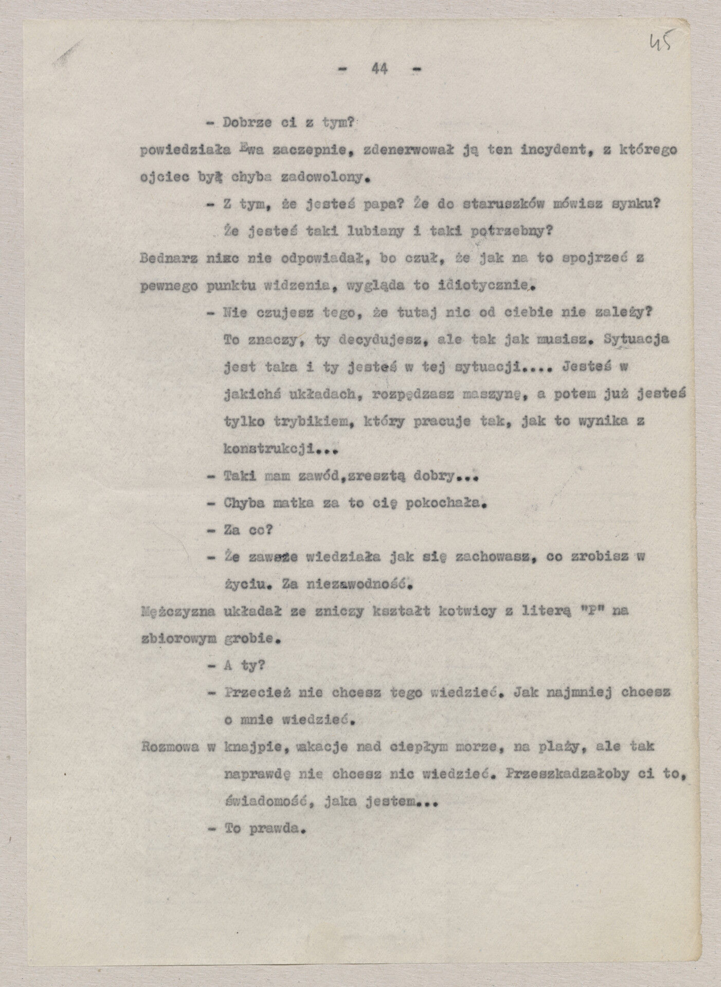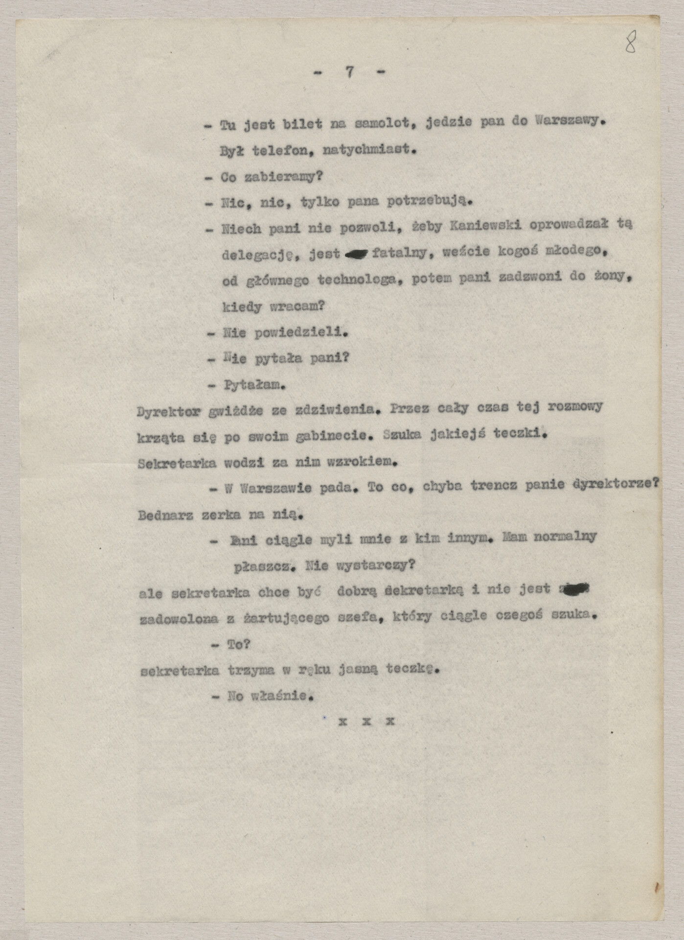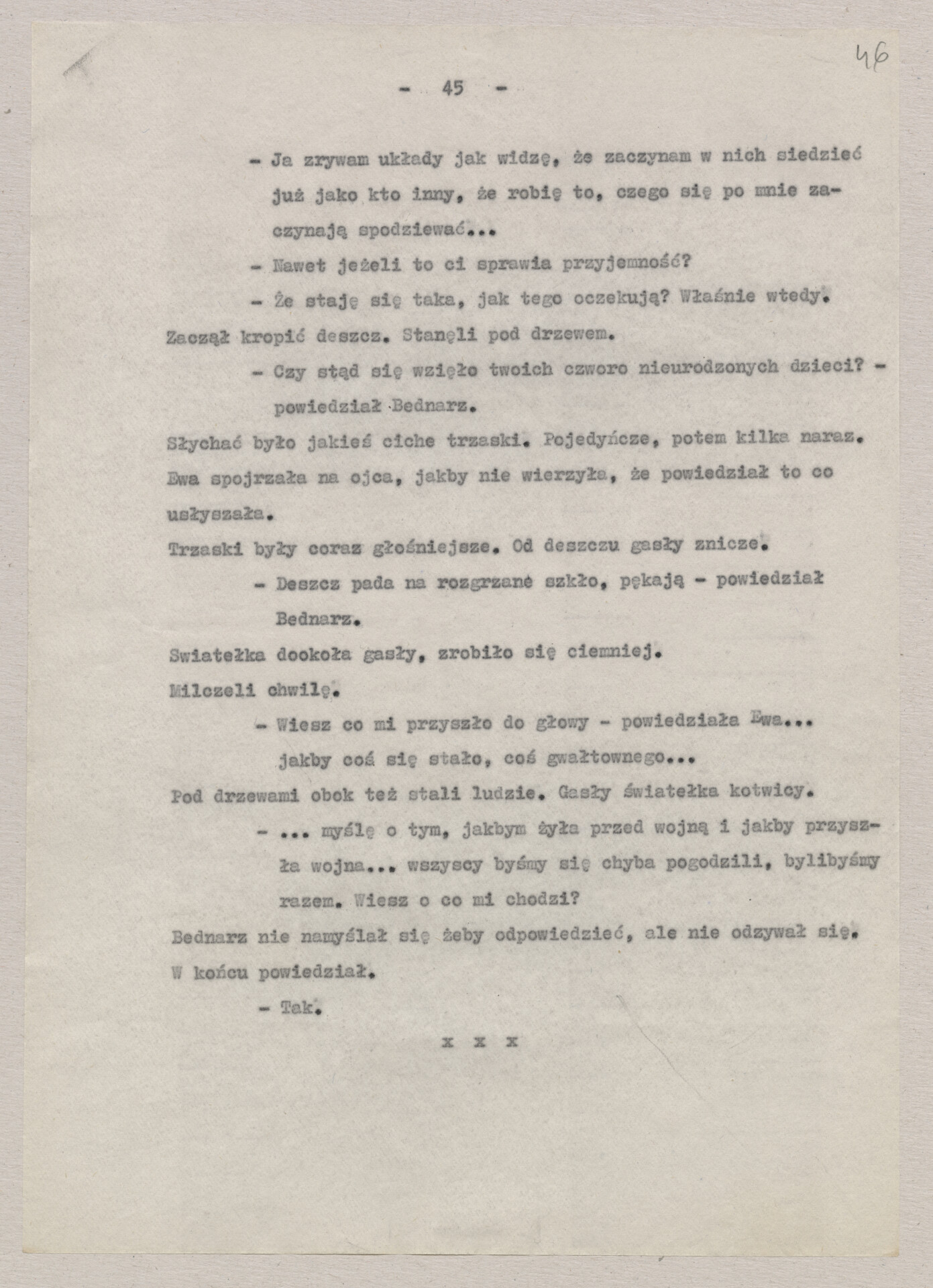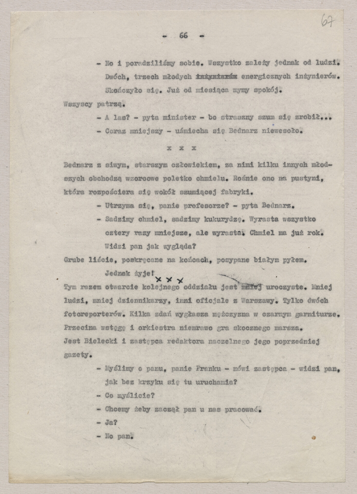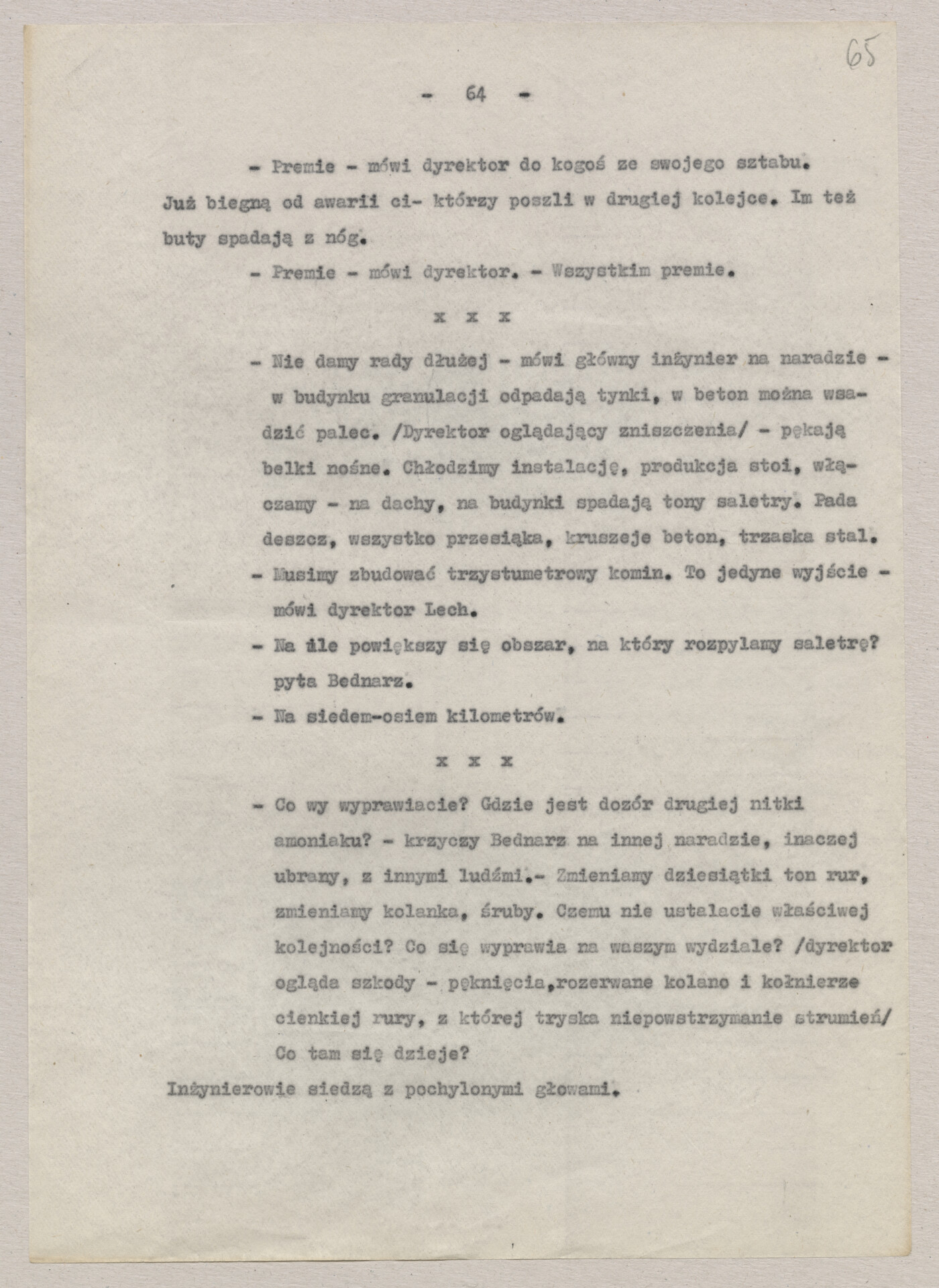 Kopia maszynopisu ze scenariuszem do filmu Krzysztofa Kieślowskiego “Blizna” (1976). Początkowo scenariusz nosił tytuł “Koszty własne”, później tytuł zmieniono na “Nasz człowiek”. Scenariusz napisany przez Krzysztofa Kieślowskiego powstał na bazie reportażu Romualda Karasia o budowie Zakładów Azotowych w Puławach, co było pomysłem Witolda Zalewskiego, kierownika literackiego “Toru”. Scenariusz został złożony w 1974 roku w Zespole Filmowym “Tor”. Inna wersja tego dokumentu ma sygnaturę ATKK-BLI-I-004.