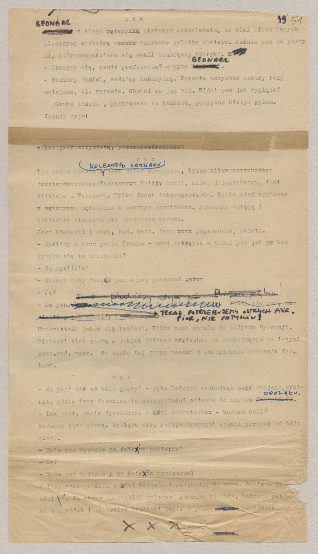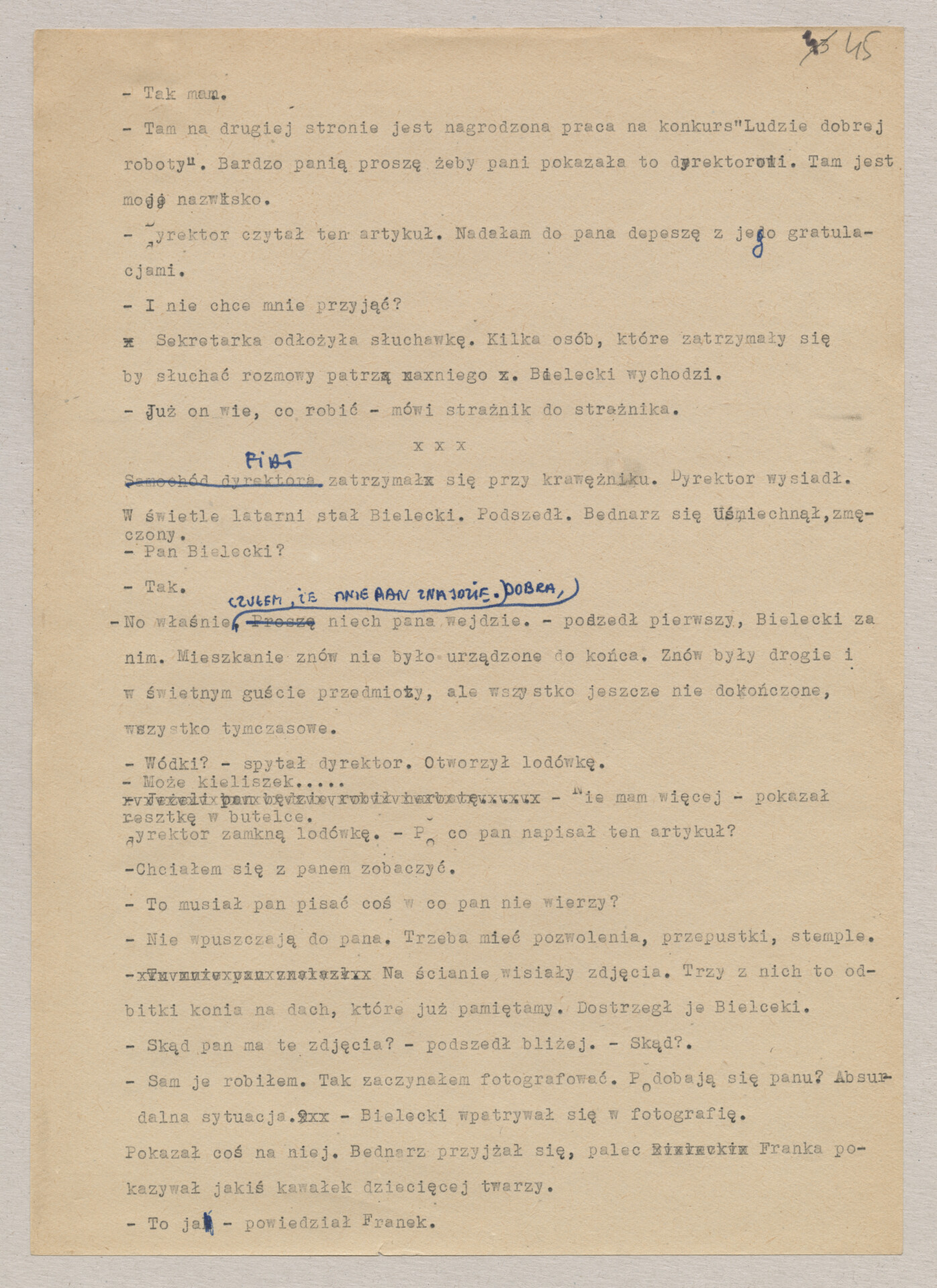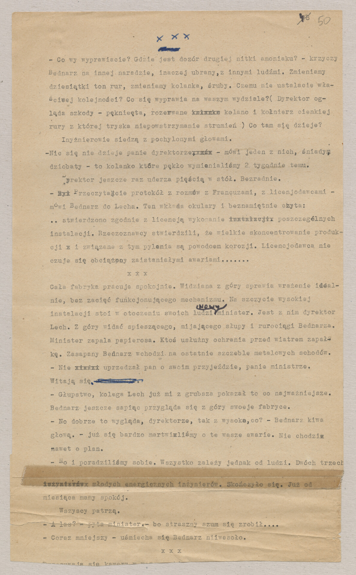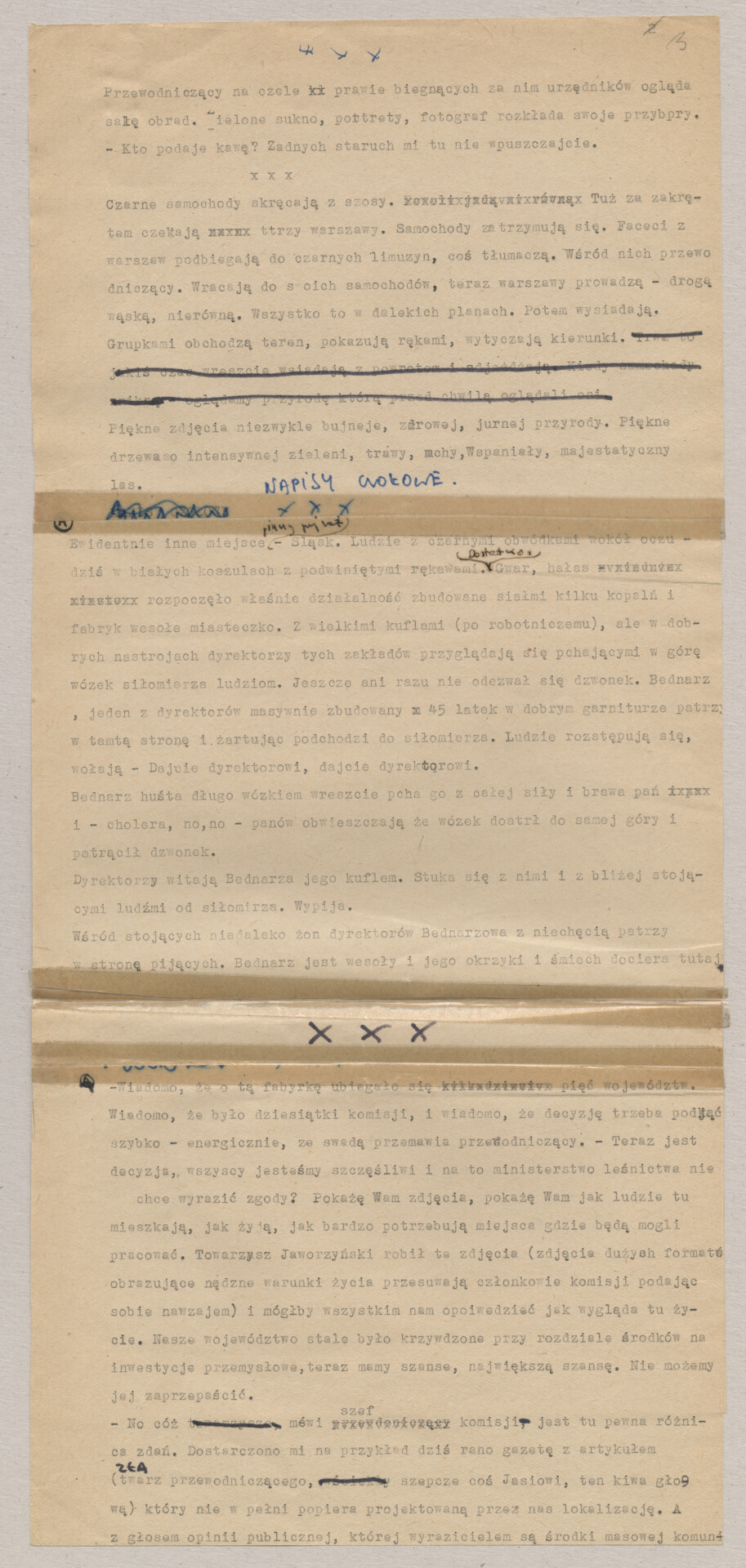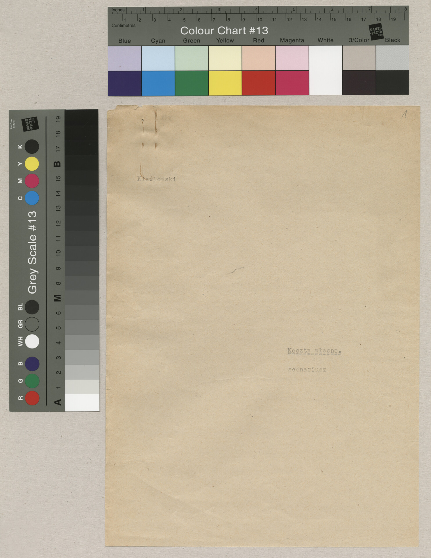 Maszynopis ze scenariuszem do filmu Krzysztofa Kieślowskiego “Blizna” (1976). Początkowo scenariusz nosił tytuł “Koszty własne”, później tytuł zmieniono na “Nasz człowiek”. Scenariusz napisany przez Krzysztofa Kieślowskiego powstał na bazie reportażu Romualda Karasia o budowie Zakładów Azotowych w Puławach, co było pomysłem Witolda Zalewskiego, kierownika literackiego “Toru”. Scenariusz został złożony w 1974 roku w Zespole Filmowym “Tor”. Formaty stron niestandardowe – klejone taśmą klejącą. Dokument zawiera liczne odręczne poprawki i notatki autora.