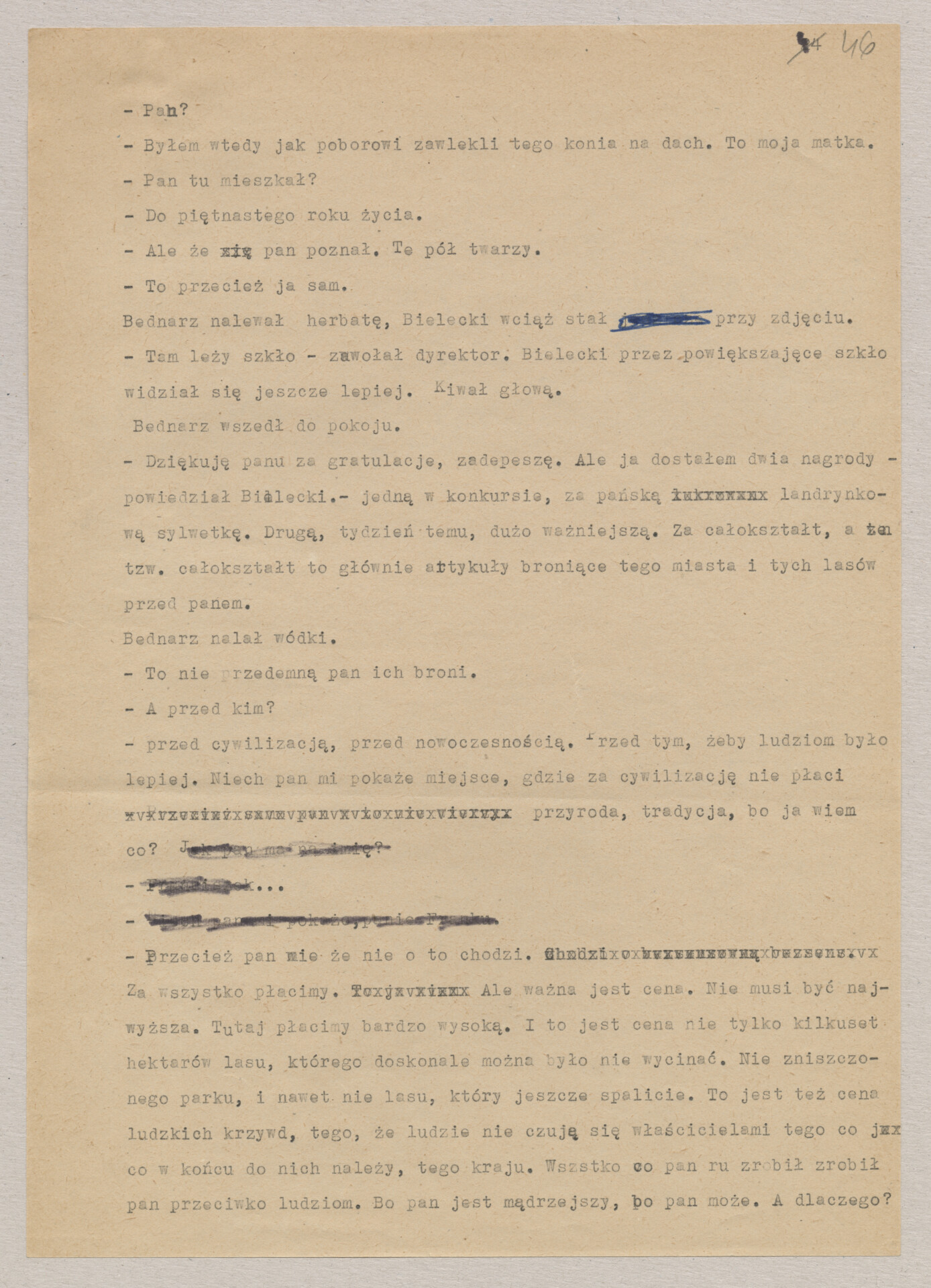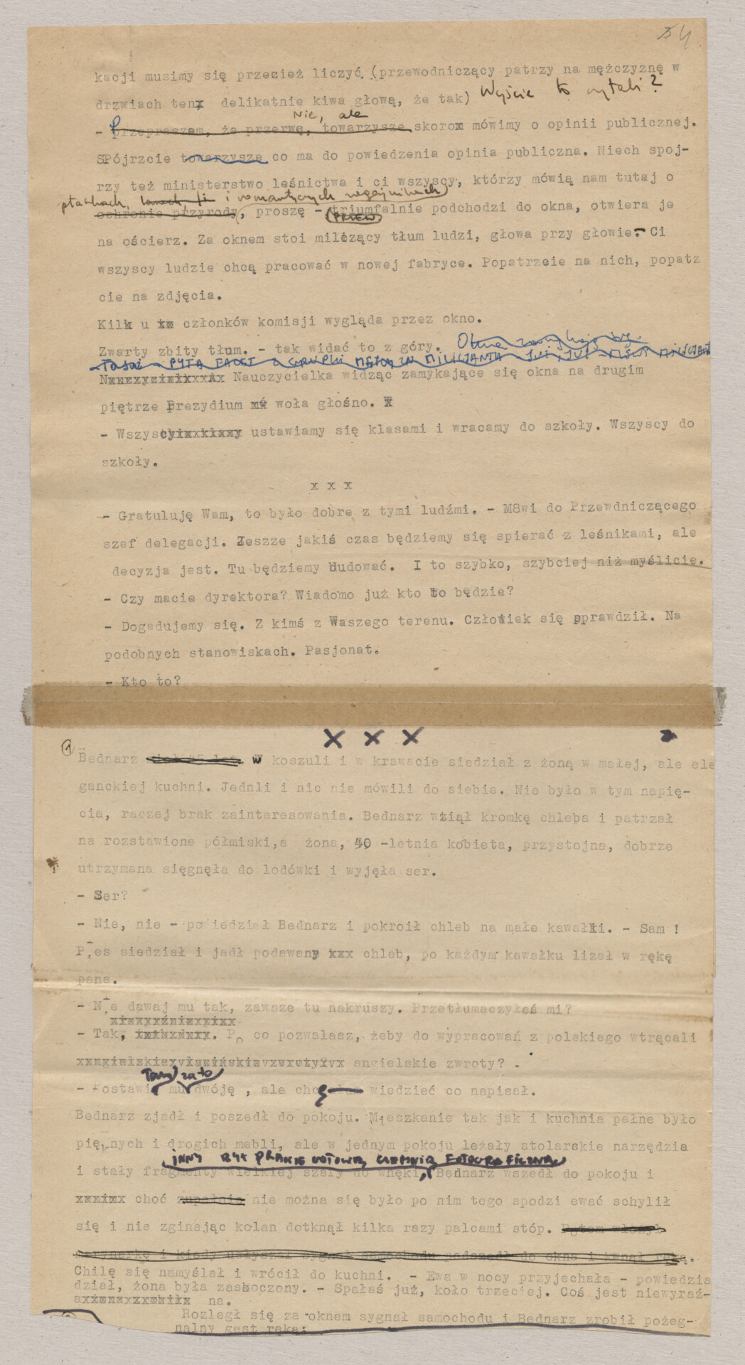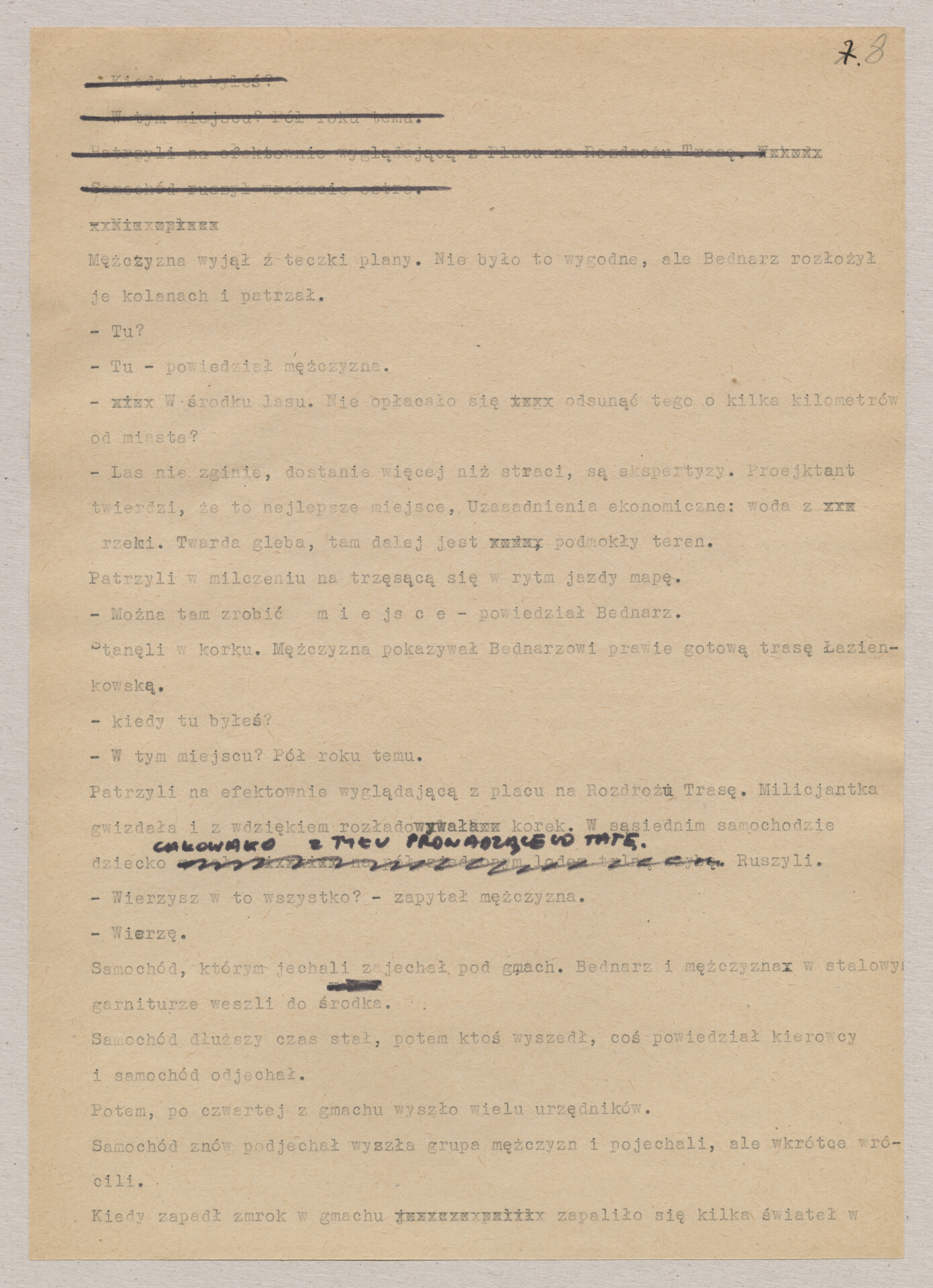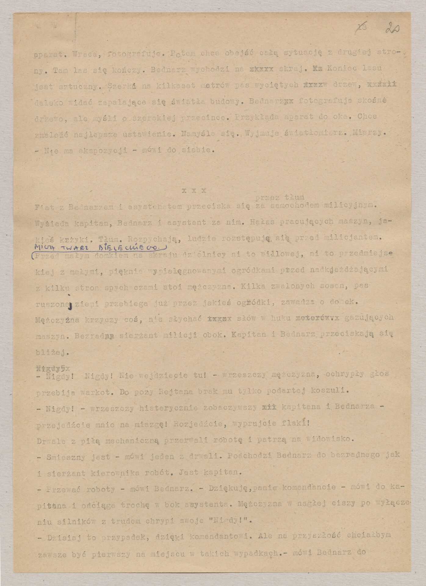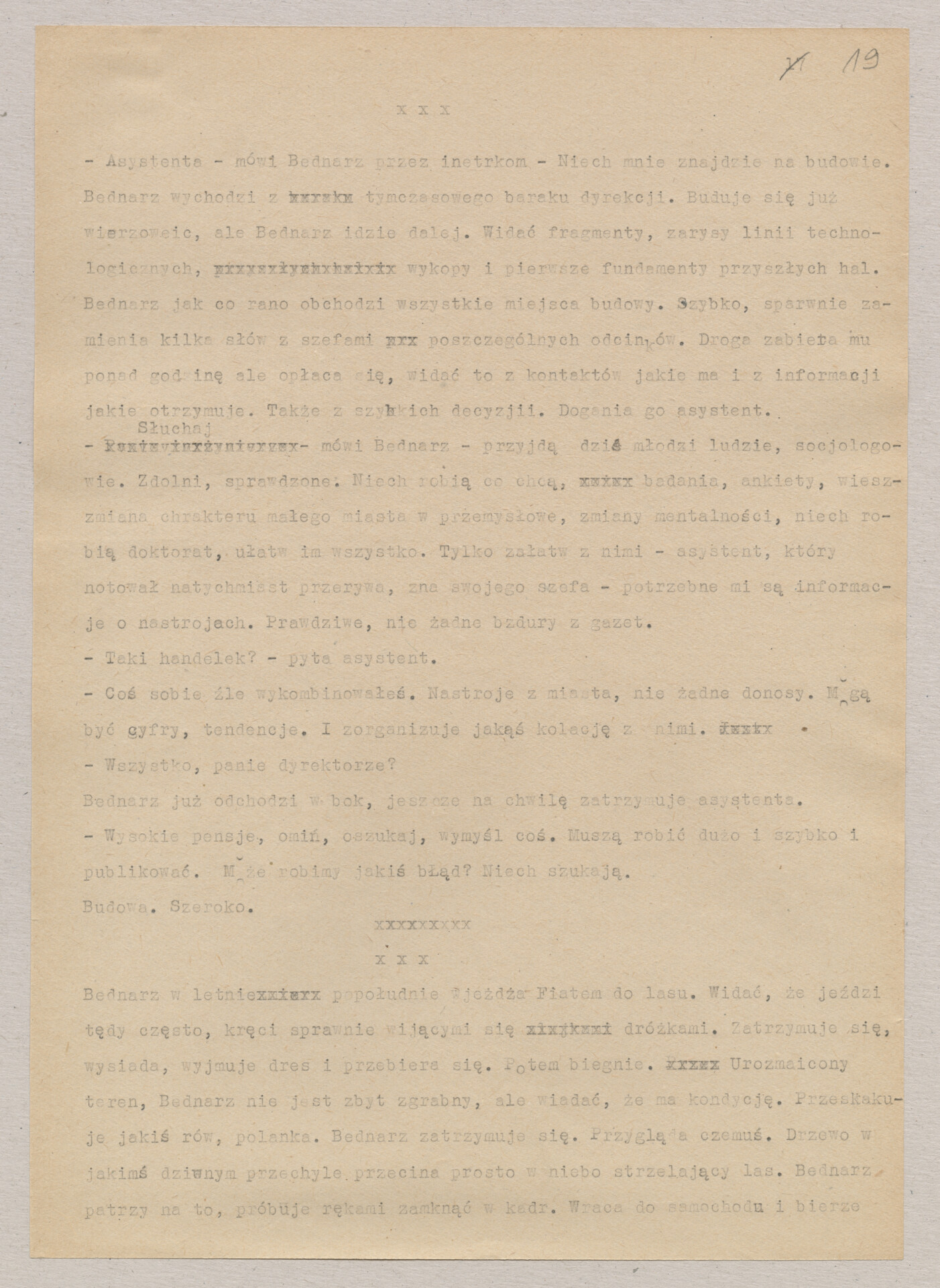Maszynopis ze scenariuszem do filmu Krzysztofa Kieślowskiego “Blizna” (1976). Początkowo scenariusz nosił tytuł “Koszty własne”, później tytuł zmieniono na “Nasz człowiek”. Scenariusz napisany przez Krzysztofa Kieślowskiego powstał na bazie reportażu Romualda Karasia o budowie Zakładów Azotowych w Puławach, co było pomysłem Witolda Zalewskiego, kierownika literackiego “Toru”. Scenariusz został złożony w 1974 roku w Zespole Filmowym “Tor”. Formaty stron niestandardowe – klejone taśmą klejącą. Dokument zawiera liczne odręczne poprawki i notatki autora.