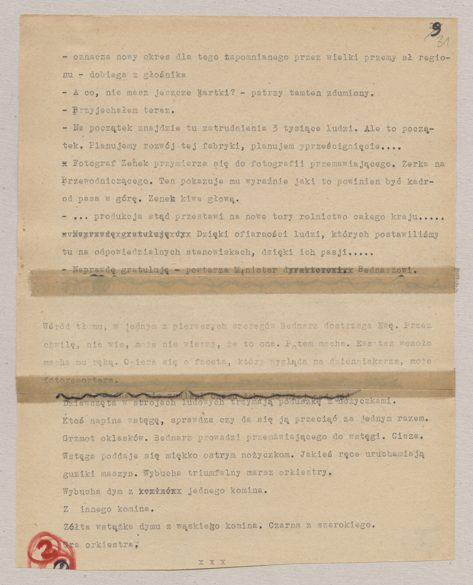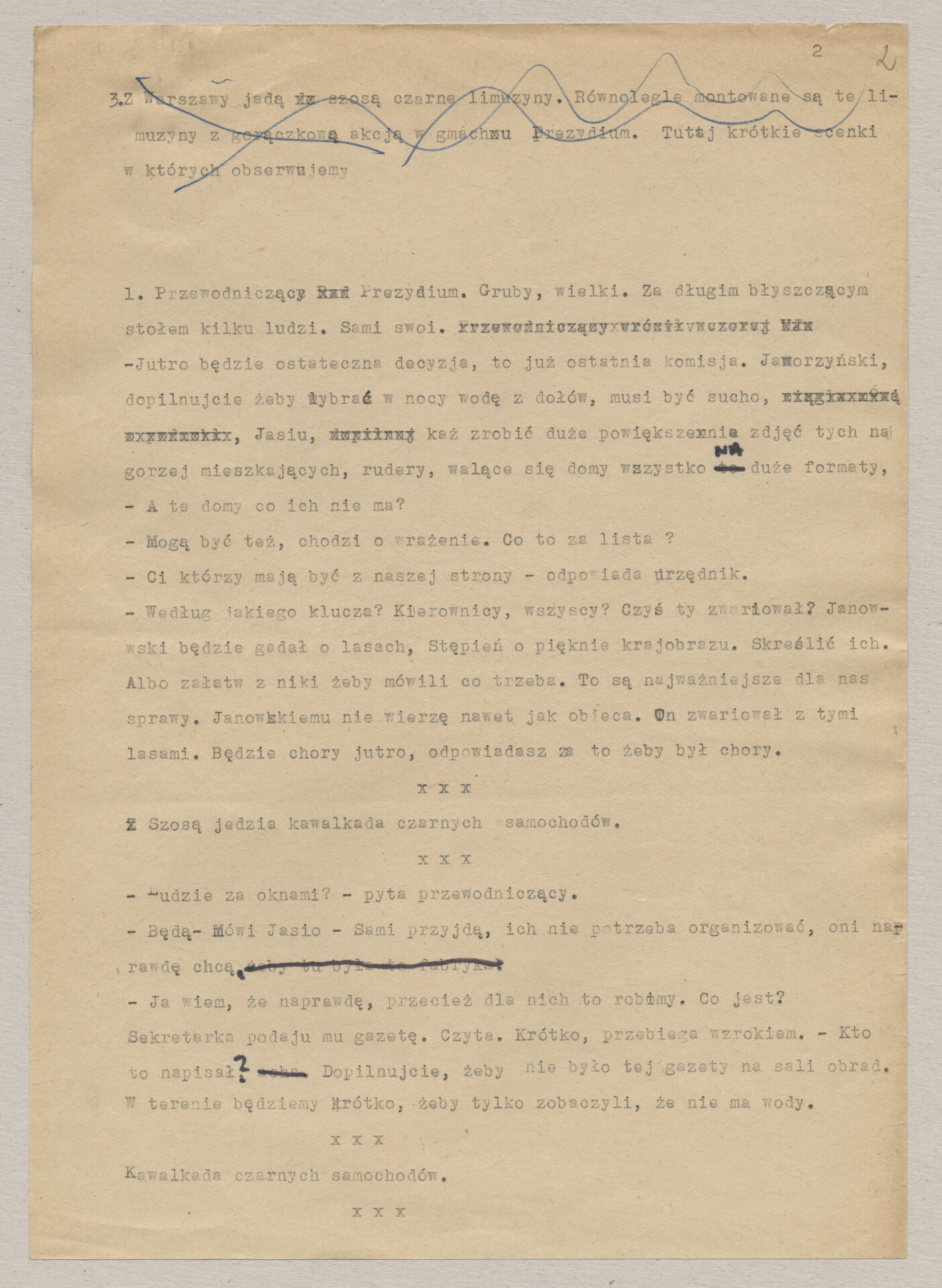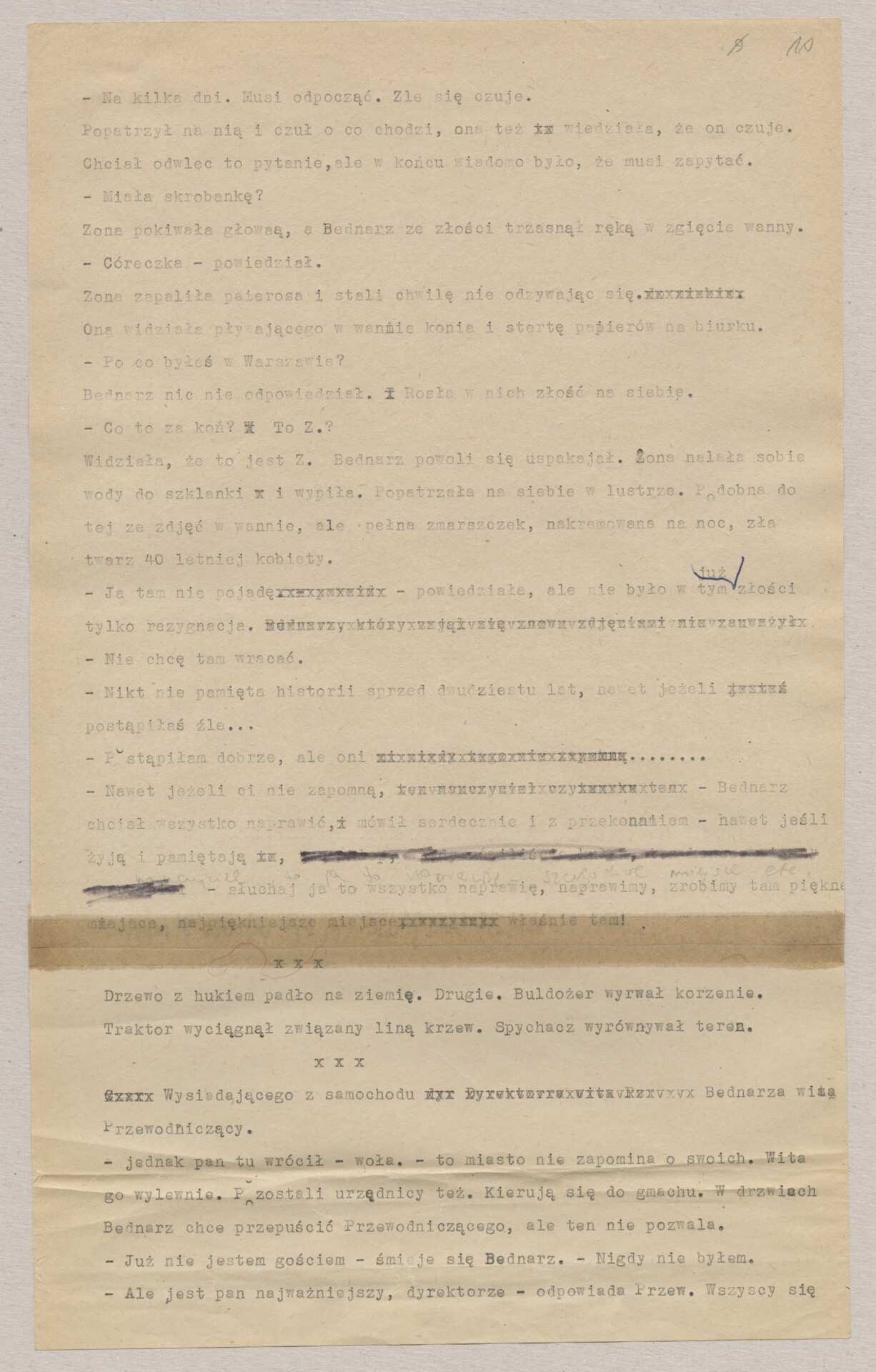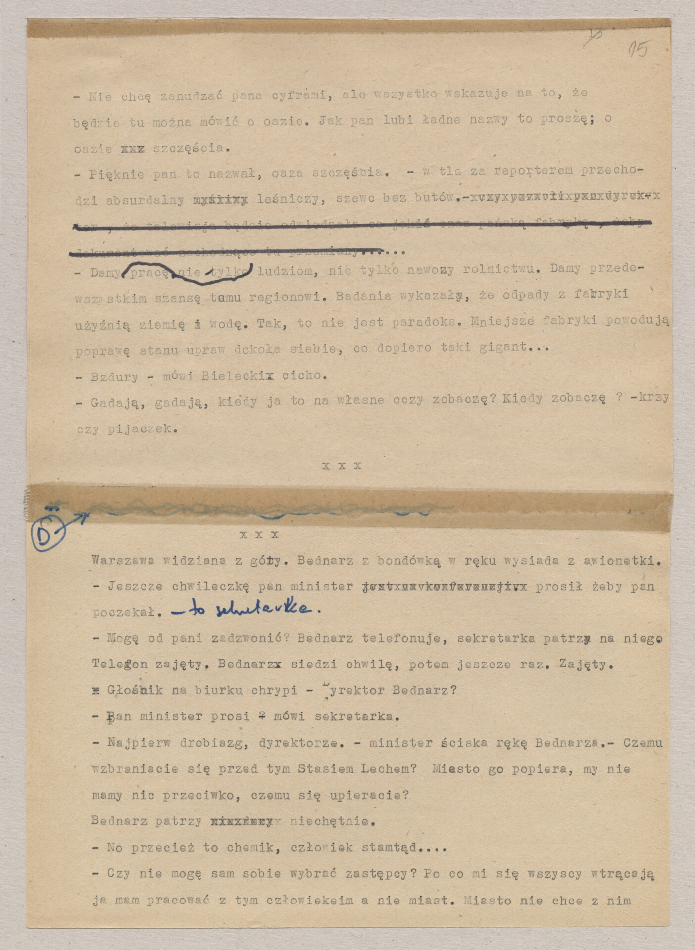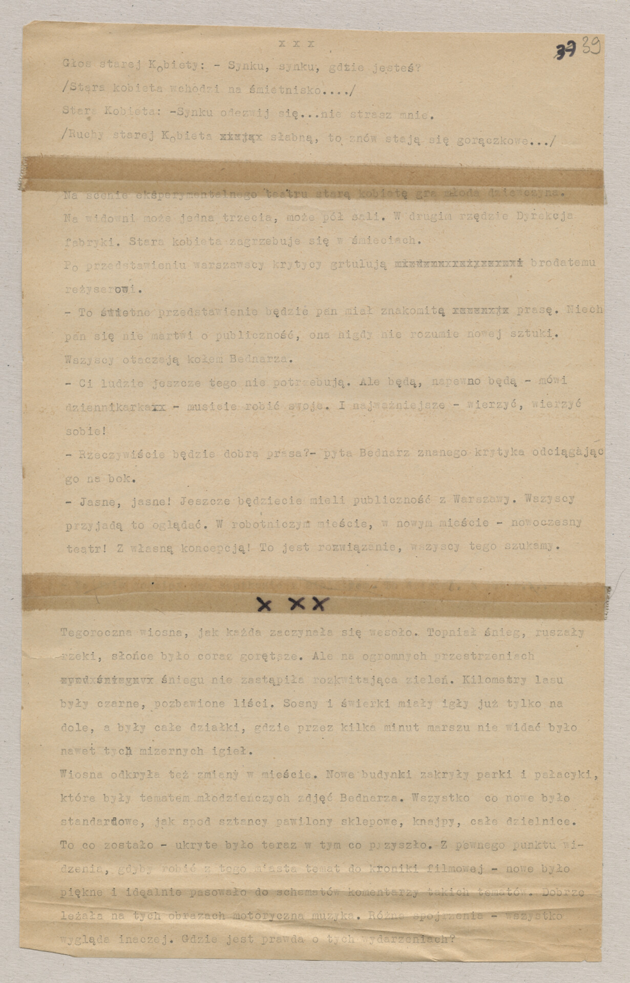 Maszynopis ze scenariuszem do filmu Krzysztofa Kieślowskiego “Blizna” (1976). Początkowo scenariusz nosił tytuł “Koszty własne”, później tytuł zmieniono na “Nasz człowiek”. Scenariusz napisany przez Krzysztofa Kieślowskiego powstał na bazie reportażu Romualda Karasia o budowie Zakładów Azotowych w Puławach, co było pomysłem Witolda Zalewskiego, kierownika literackiego “Toru”. Scenariusz został złożony w 1974 roku w Zespole Filmowym “Tor”. Formaty stron niestandardowe – klejone taśmą klejącą. Dokument zawiera liczne odręczne poprawki i notatki autora.