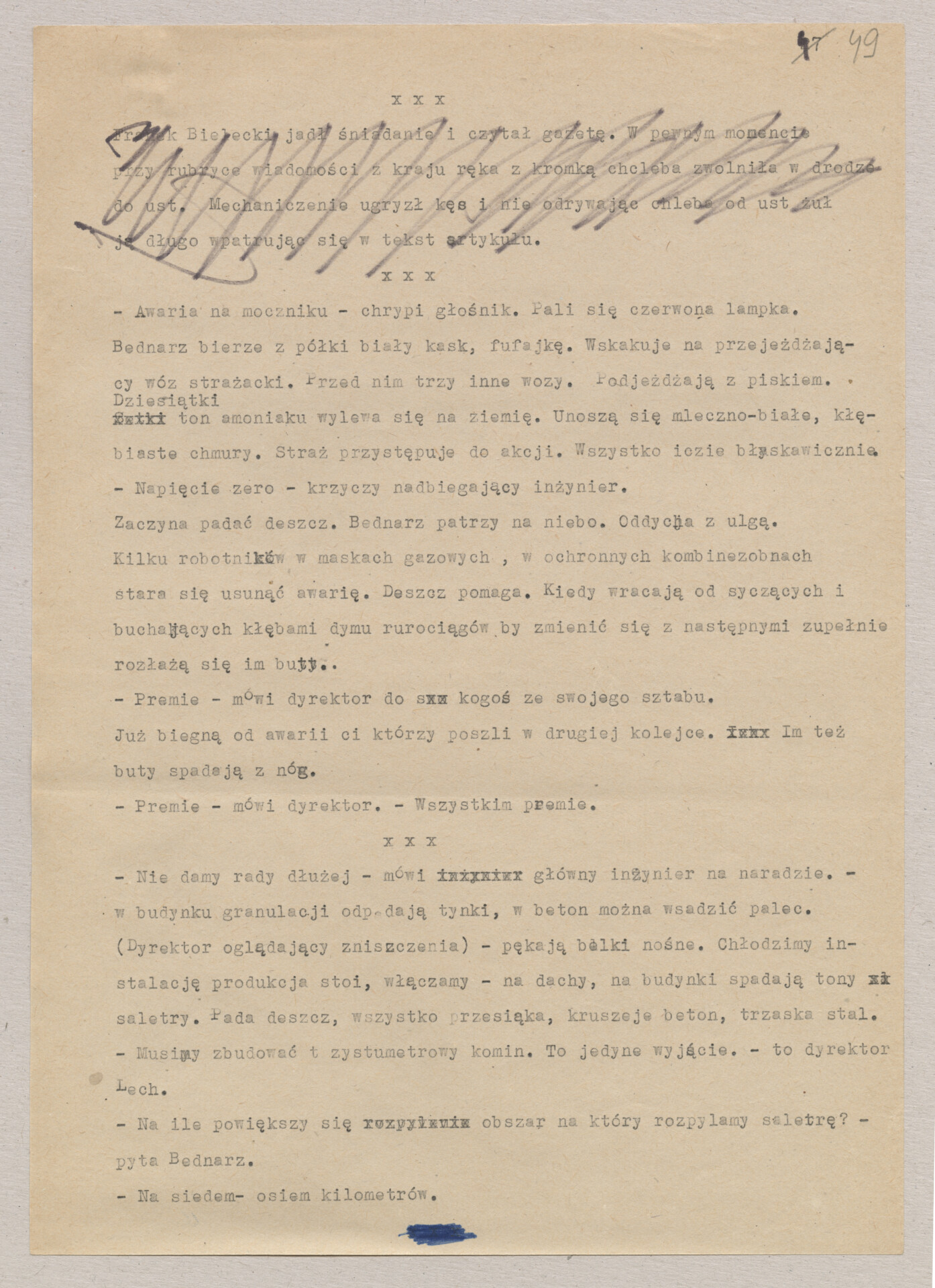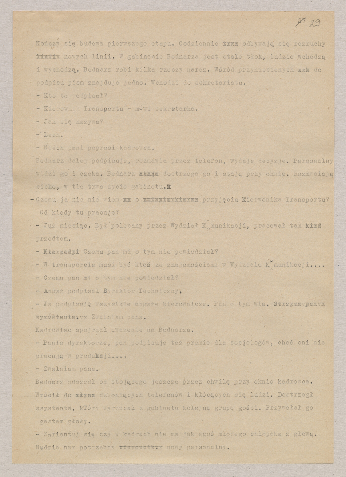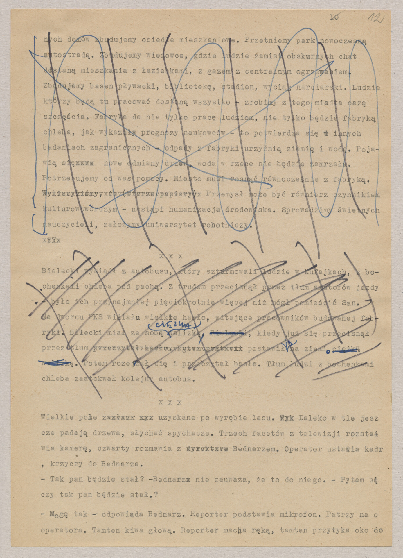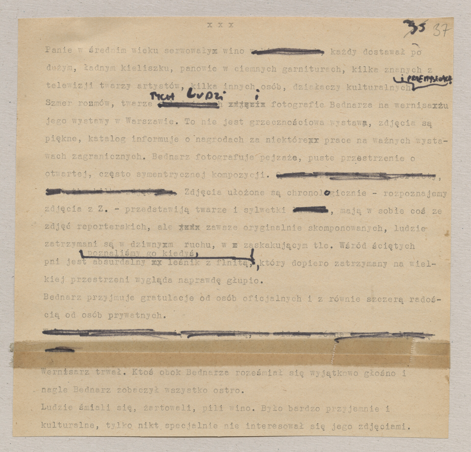 Maszynopis ze scenariuszem do filmu Krzysztofa Kieślowskiego “Blizna” (1976). Początkowo scenariusz nosił tytuł “Koszty własne”, później tytuł zmieniono na “Nasz człowiek”. Scenariusz napisany przez Krzysztofa Kieślowskiego powstał na bazie reportażu Romualda Karasia o budowie Zakładów Azotowych w Puławach, co było pomysłem Witolda Zalewskiego, kierownika literackiego “Toru”. Scenariusz został złożony w 1974 roku w Zespole Filmowym “Tor”. Formaty stron niestandardowe – klejone taśmą klejącą. Dokument zawiera liczne odręczne poprawki i notatki autora.