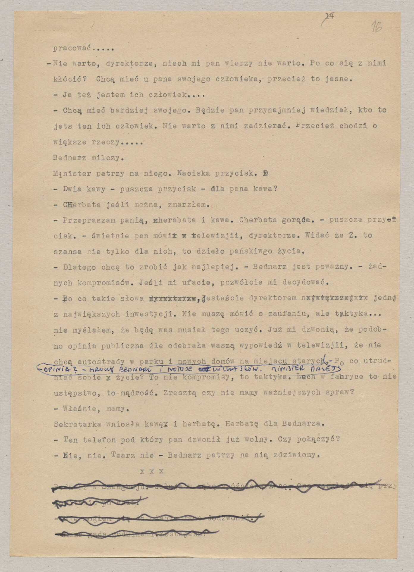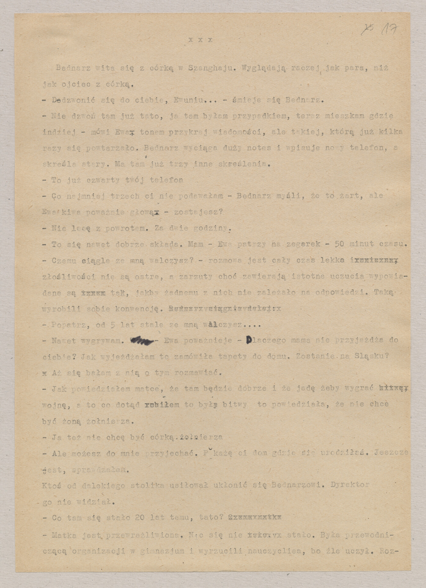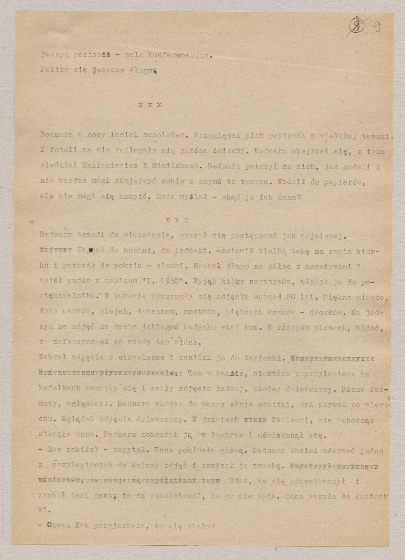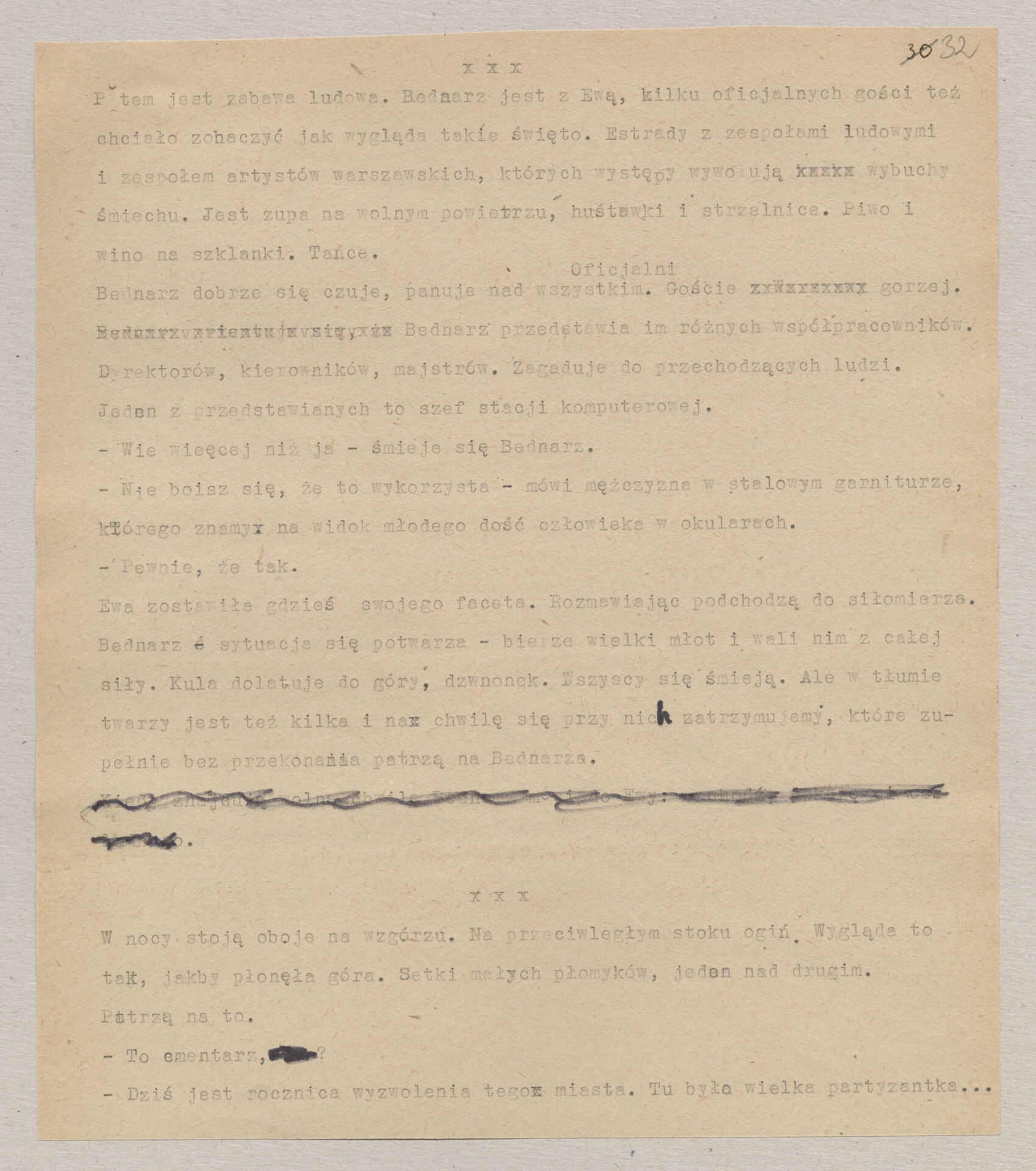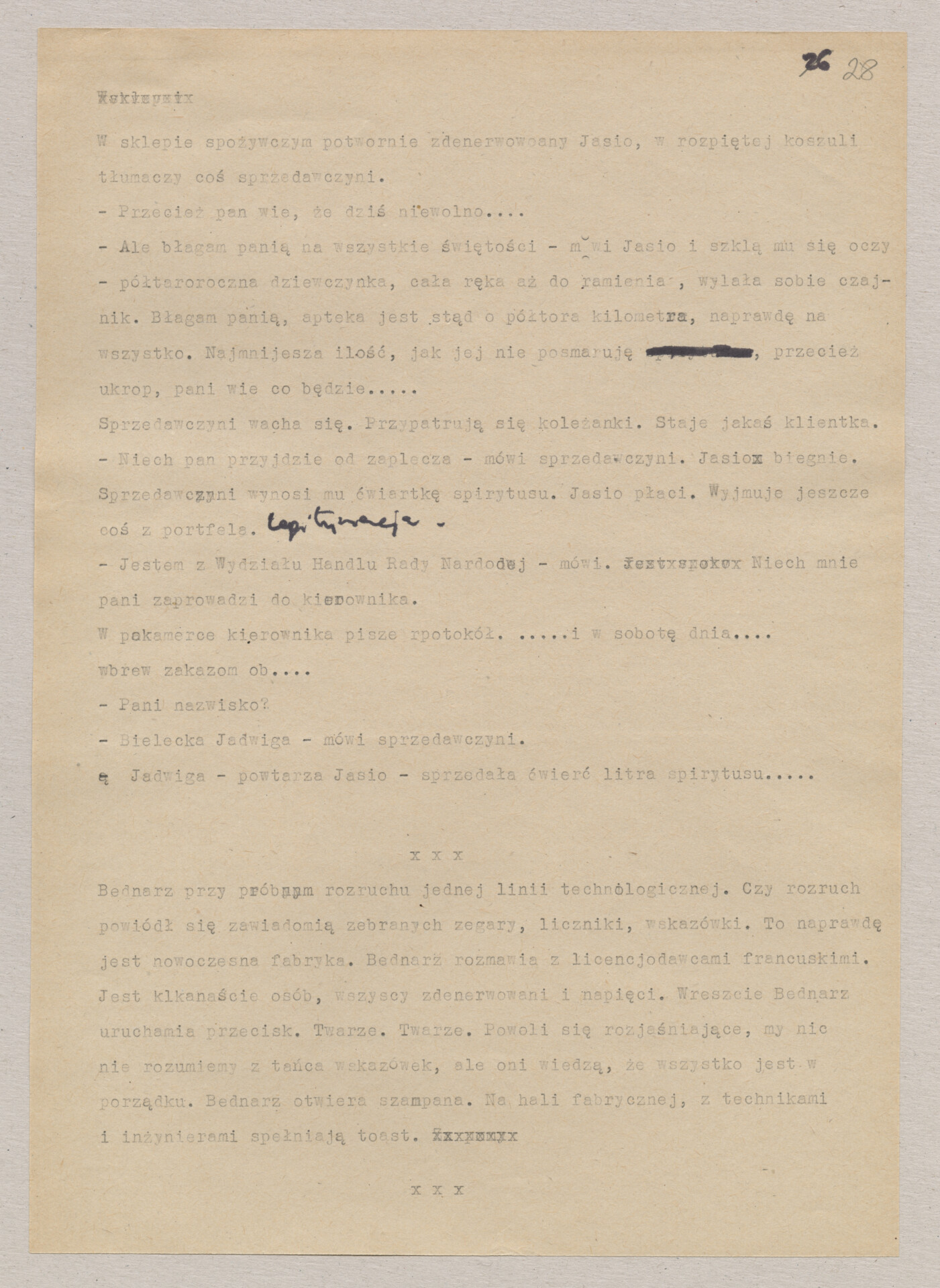 Maszynopis ze scenariuszem do filmu Krzysztofa Kieślowskiego “Blizna” (1976). Początkowo scenariusz nosił tytuł “Koszty własne”, później tytuł zmieniono na “Nasz człowiek”. Scenariusz napisany przez Krzysztofa Kieślowskiego powstał na bazie reportażu Romualda Karasia o budowie Zakładów Azotowych w Puławach, co było pomysłem Witolda Zalewskiego, kierownika literackiego “Toru”. Scenariusz został złożony w 1974 roku w Zespole Filmowym “Tor”. Formaty stron niestandardowe – klejone taśmą klejącą. Dokument zawiera liczne odręczne poprawki i notatki autora.