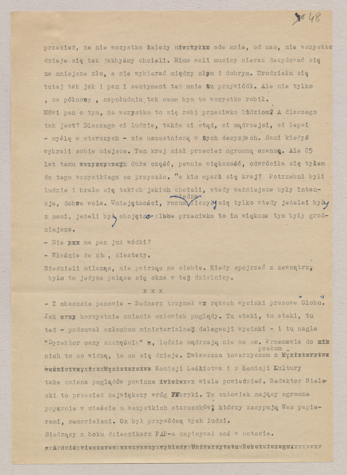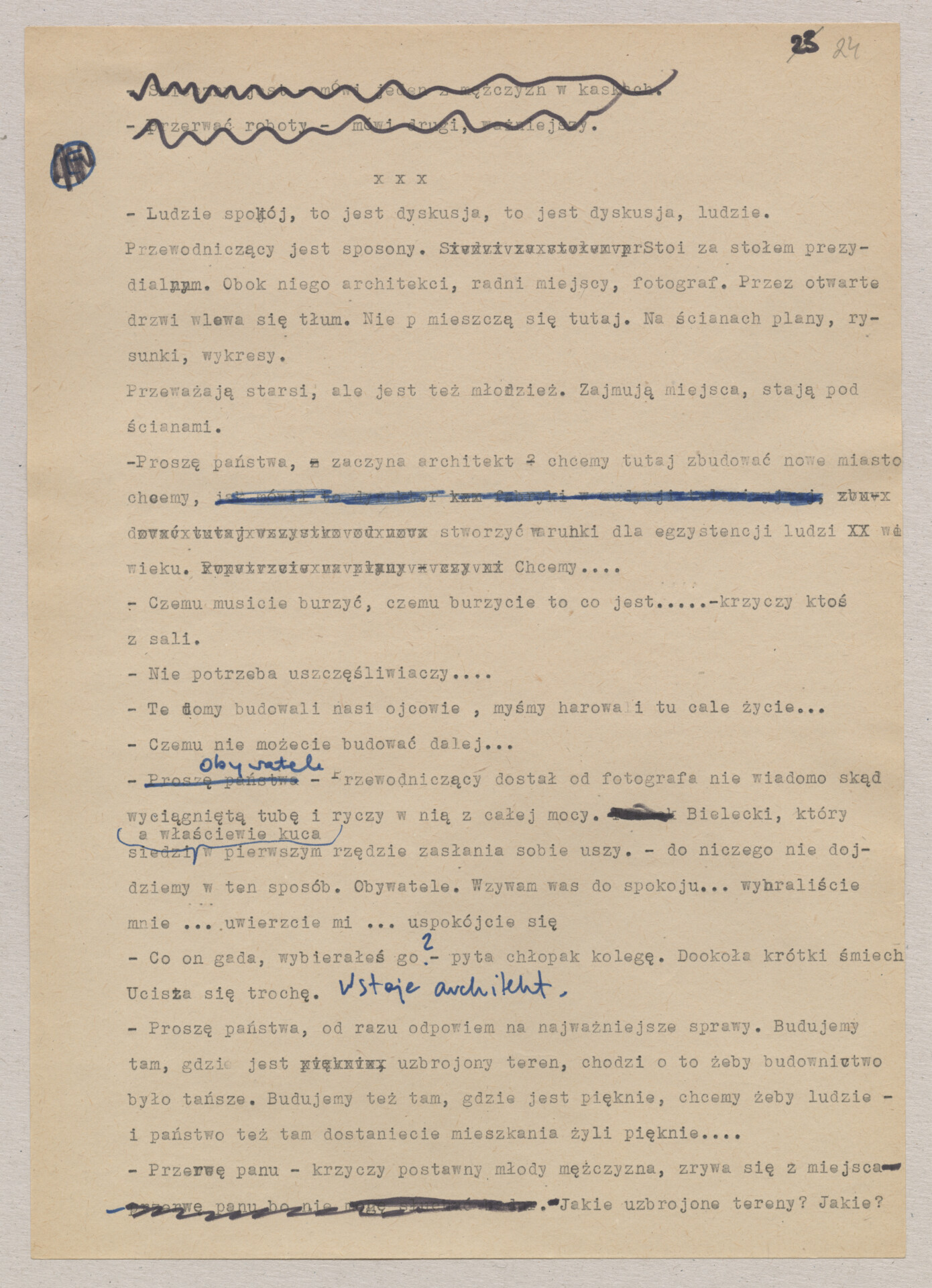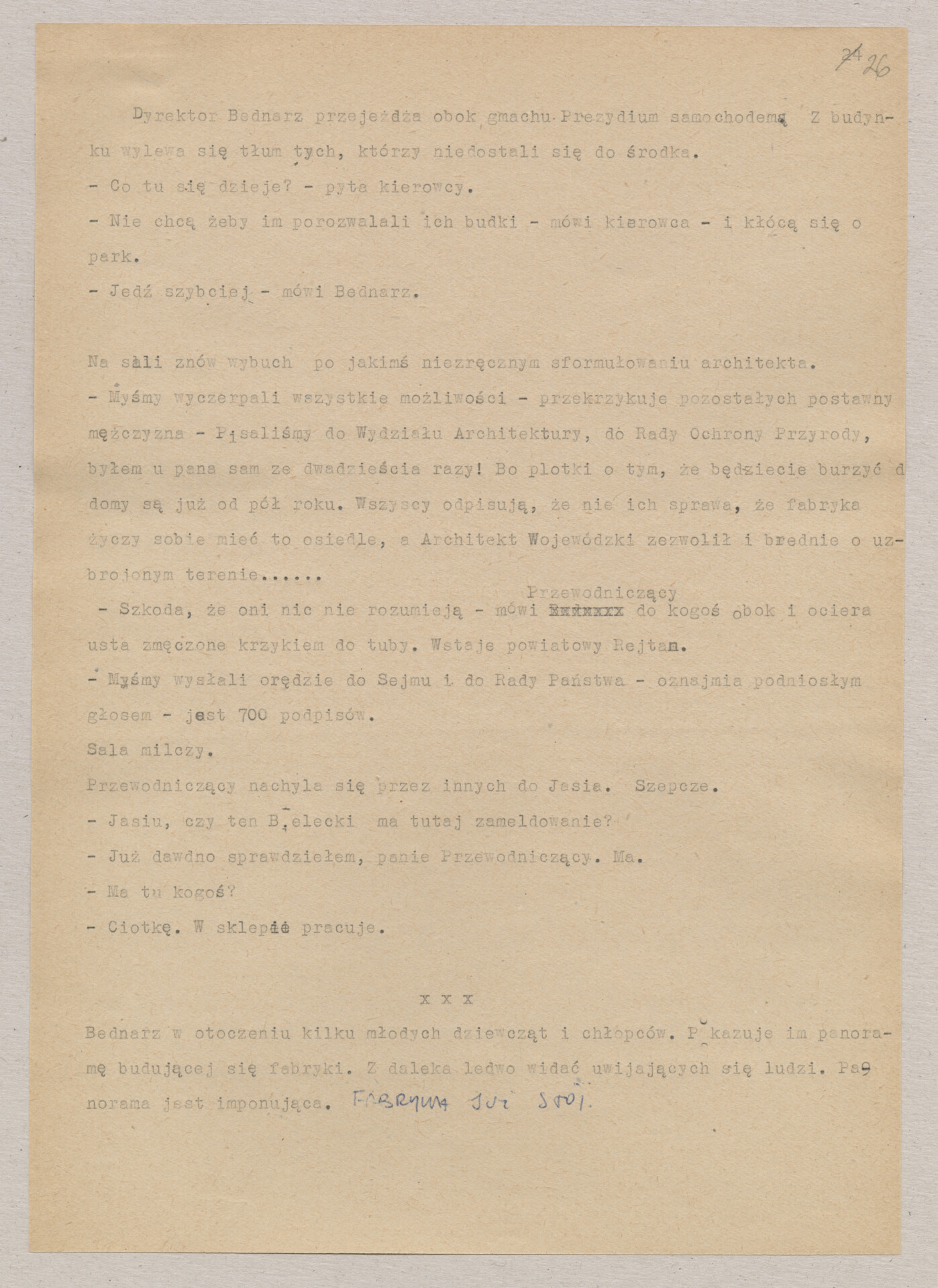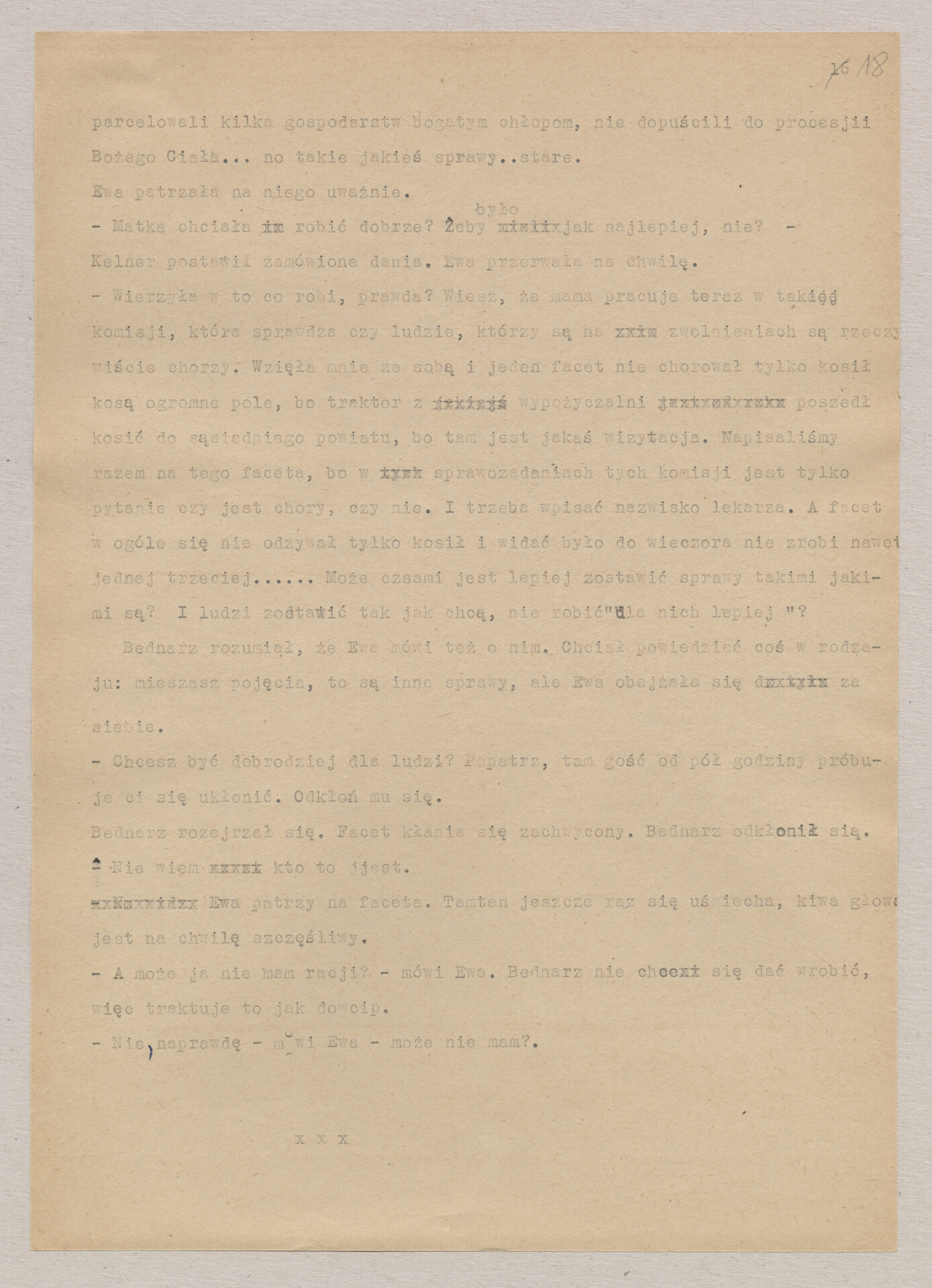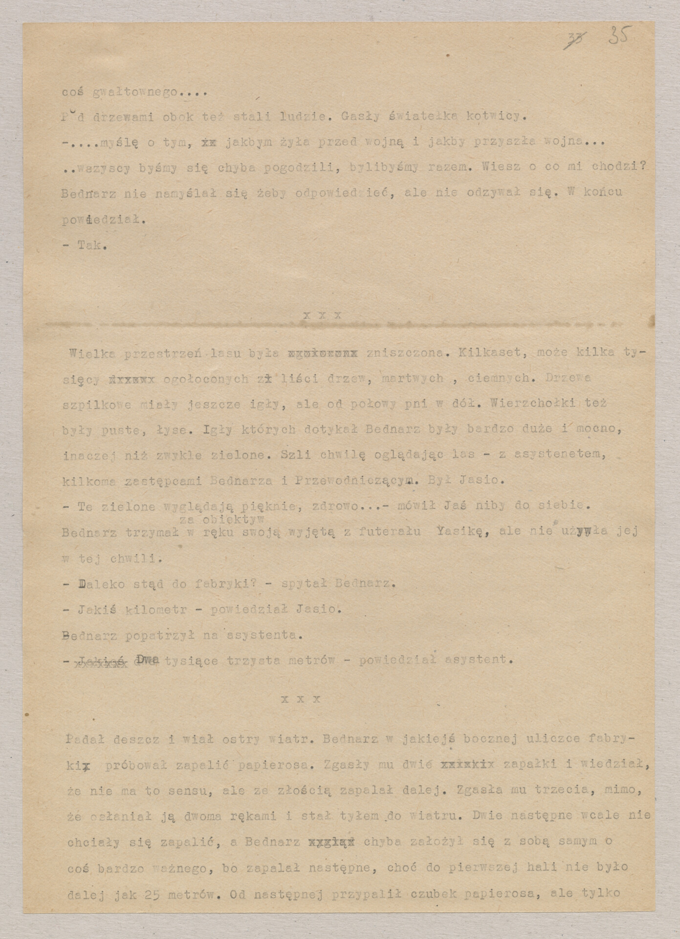 Maszynopis ze scenariuszem do filmu Krzysztofa Kieślowskiego “Blizna” (1976). Początkowo scenariusz nosił tytuł “Koszty własne”, później tytuł zmieniono na “Nasz człowiek”. Scenariusz napisany przez Krzysztofa Kieślowskiego powstał na bazie reportażu Romualda Karasia o budowie Zakładów Azotowych w Puławach, co było pomysłem Witolda Zalewskiego, kierownika literackiego “Toru”. Scenariusz został złożony w 1974 roku w Zespole Filmowym “Tor”. Formaty stron niestandardowe – klejone taśmą klejącą. Dokument zawiera liczne odręczne poprawki i notatki autora.