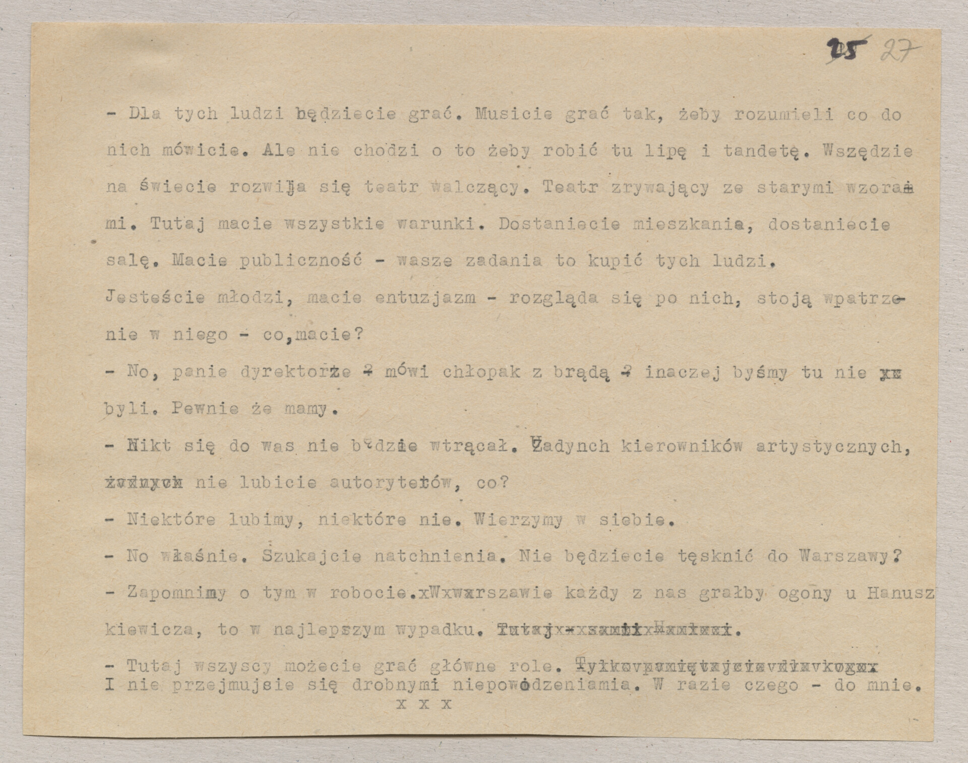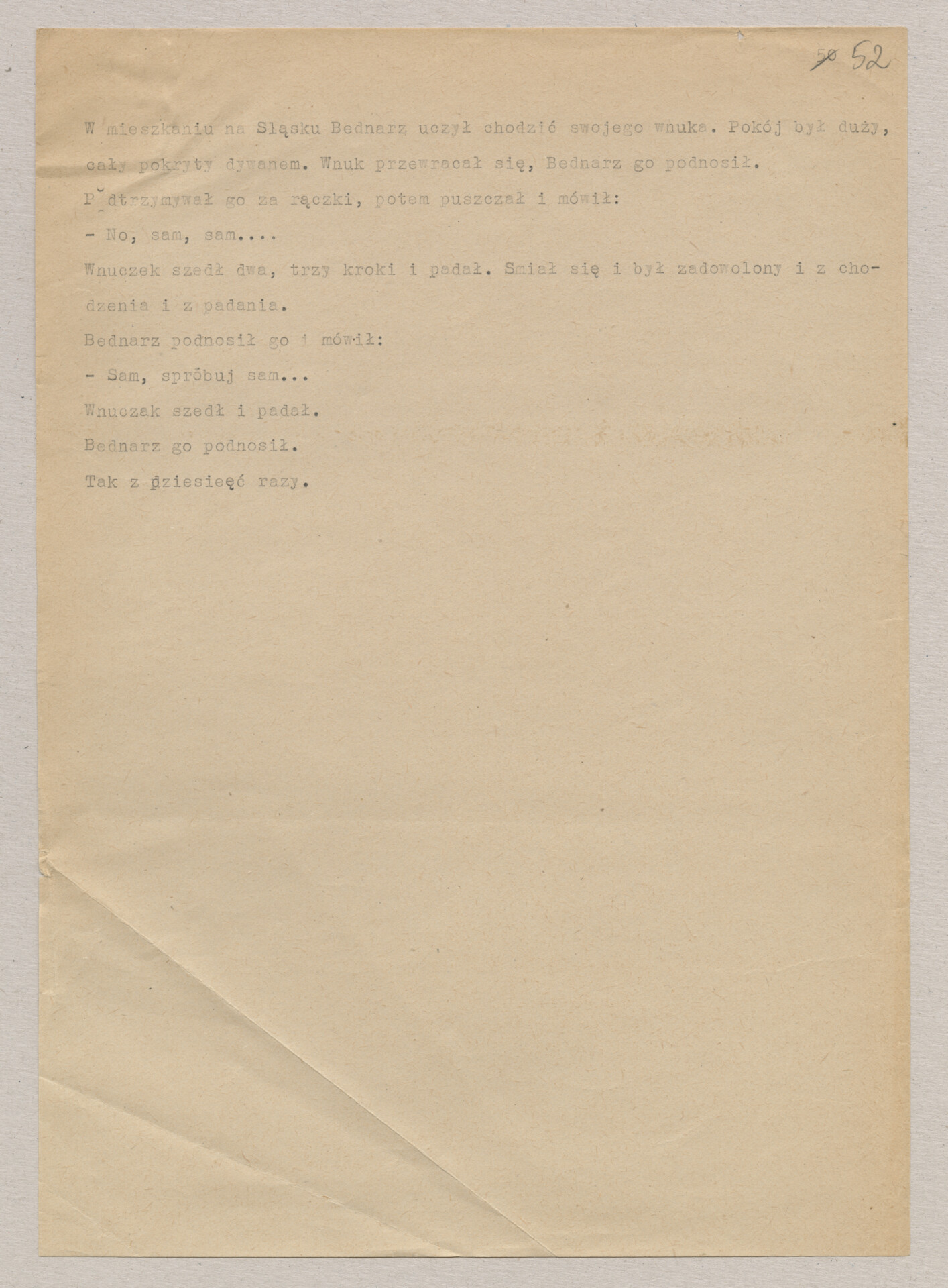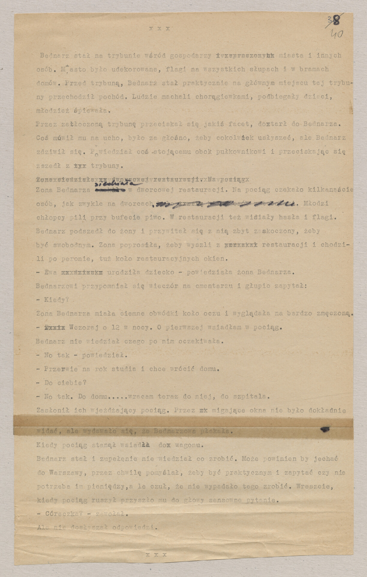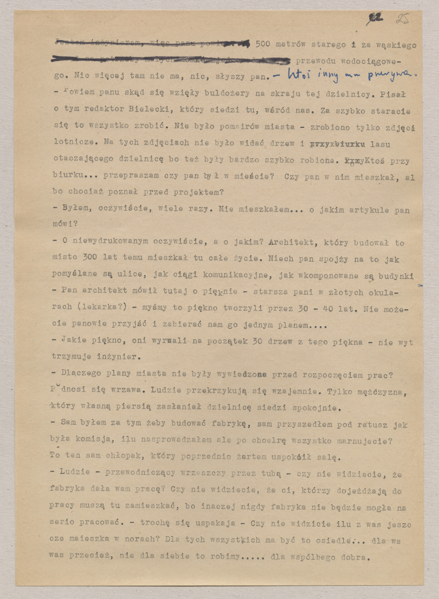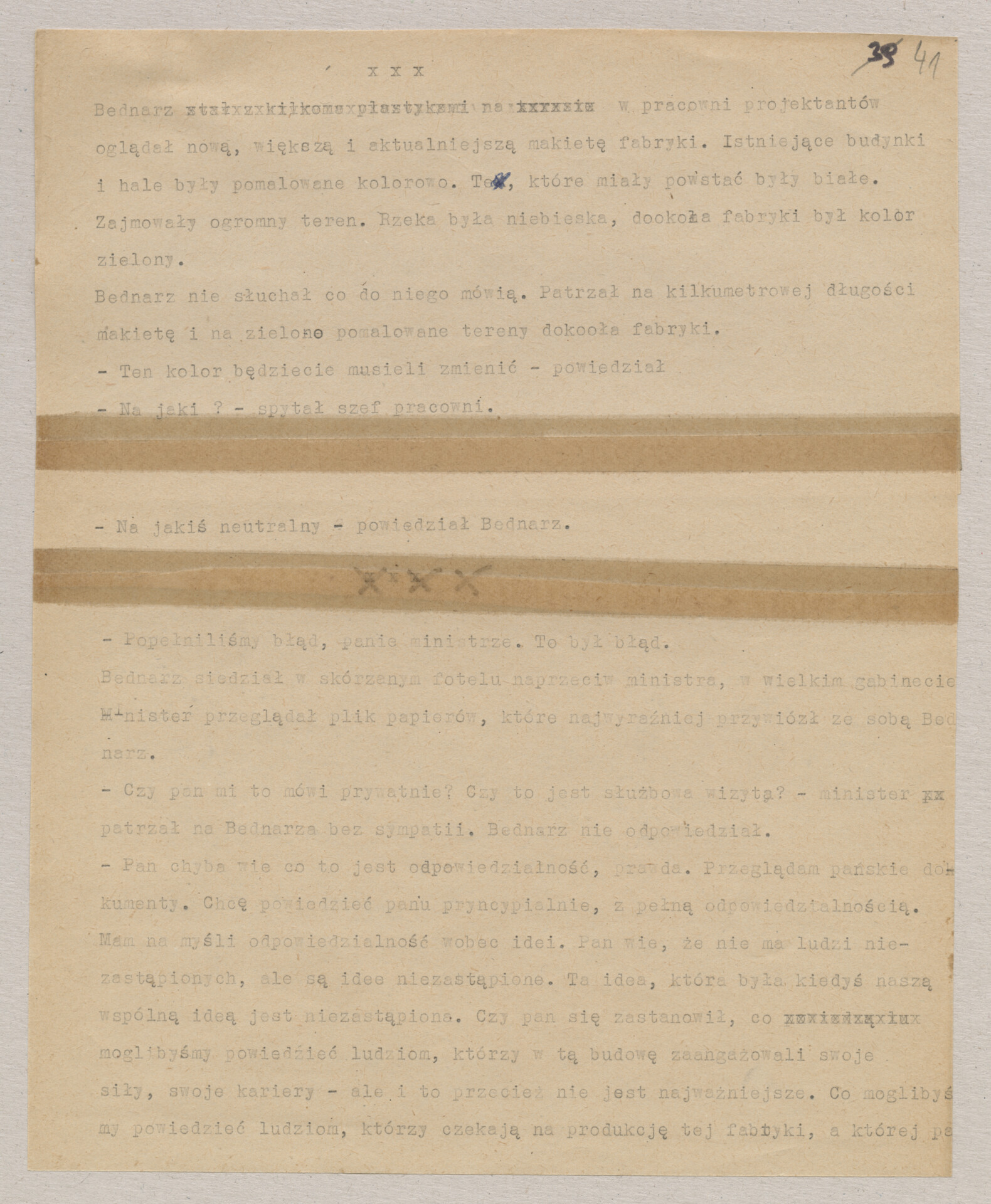 Maszynopis ze scenariuszem do filmu Krzysztofa Kieślowskiego “Blizna” (1976). Początkowo scenariusz nosił tytuł “Koszty własne”, później tytuł zmieniono na “Nasz człowiek”. Scenariusz napisany przez Krzysztofa Kieślowskiego powstał na bazie reportażu Romualda Karasia o budowie Zakładów Azotowych w Puławach, co było pomysłem Witolda Zalewskiego, kierownika literackiego “Toru”. Scenariusz został złożony w 1974 roku w Zespole Filmowym “Tor”. Formaty stron niestandardowe – klejone taśmą klejącą. Dokument zawiera liczne odręczne poprawki i notatki autora.