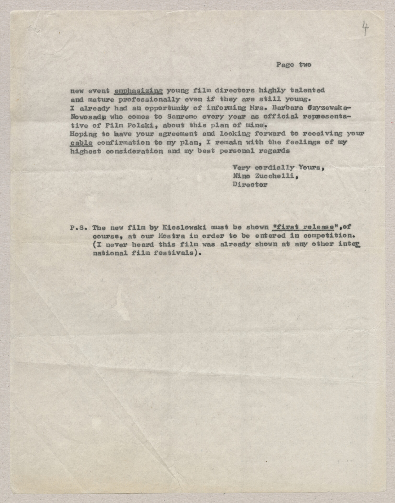 Kopia maszynopisu listu od Nino Zucchelli, dyrektora “Mostra Internazionale del Film d’Autore” do Edwarda Burby, dyrektora Filmu Polskiego argumentujący pomysł pokazania filmów “Persona” i “Bliza” w ramach festiwalu filmowego w Sanremo we Włoszech oraz innych filmów krótkometrzażowych Krzysztofa Kieślowskiego w ramach “Retrospective Show” – retrospektywy filmowej reżysera. Autor listu argumentuje to swoimi prywatnymi wrażeniami po obejrzeniu filmów fabularnych Krzysztofa Kieślowskiego podczas Krakowskiego Festiwalu Filmowego oraz filmów krótkometrażówych podczas Festiwalu Filmów Fabularnych w Gdańsku. W swojej argumentacji wspomina również o sukcesach innych Polaków pokazujących swoje filmy w Sanremo, między innymi Mieczysława Waśkowskiego ze swoim filmem “Nie zaznasz spokoju”. Jest również wzmianka o tym, że autor listu rozmawiał już o tym pomyśle z Barbarą Czyżewską-Nowosad, która co roku obecna jest podczas festiwalu filmowego w Sanremo jako oficjalna reprezentantka Filmu Polskiego. Dodatkowo autor listu wspomina też o nowym pełnometrażowym filmie Krzysztofa Kieślowskiego, który jest w trakcie realizacji – w kontekście tego, aby w przyszłości również pokazać go na festiwalu filmowym w Sanremo. List stanowi załącznik listu od Nino Zucchelli, dyrektora “Mostra Internazionale del Film d’Autore” do Krzysztofa Kieślowskiego o sygnaturze ATKK-BLI-I-009.