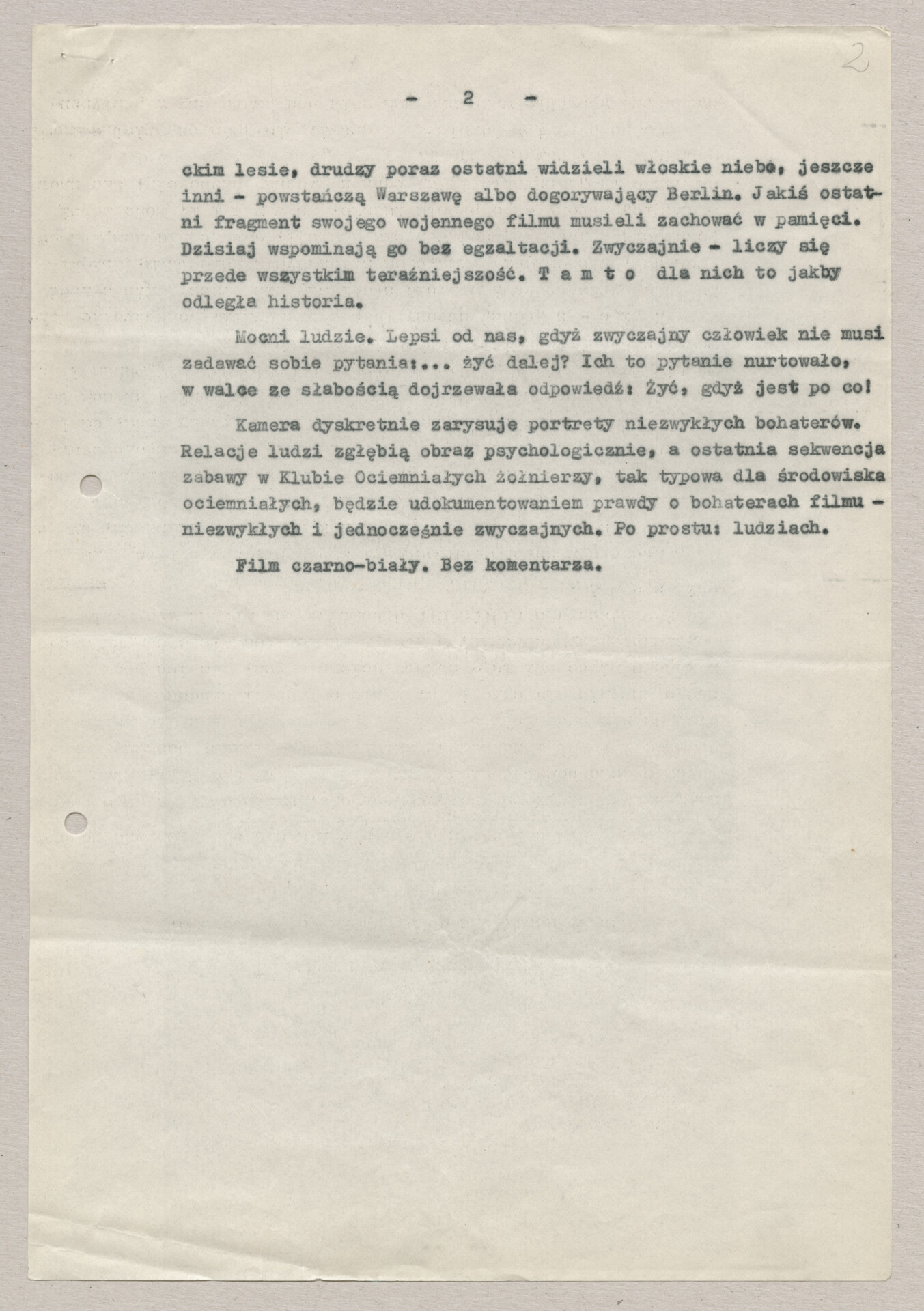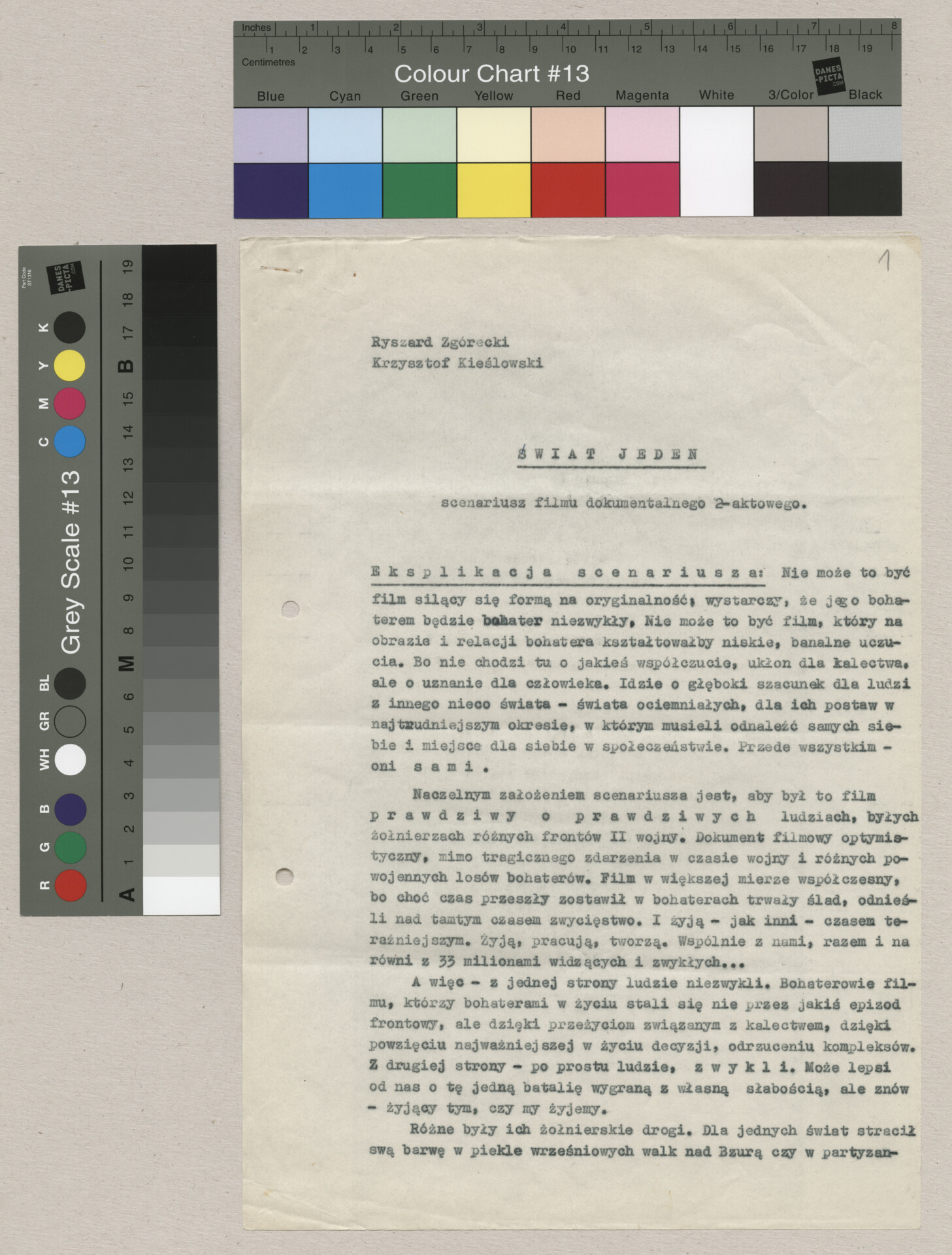 Maszynopis z eksplikacją poprzedzającą scenariusz do filmu Krzysztofa Kieślowskiego “Byłem żołnierzem” (1970). Zanim film nosił ten tytuł, praca nad nim trwała pod roboczymi tytułami “Świat jeden dla wszystkich” i “Ociemniali”. Film został zrealizowany wspólnie z Andrzejem Titkowem, kolegą reżysera ze Szkoły Filmowej w Łodzi. Produkcja odbyła się poza macierzystą Wytwórnią Filmów Dokumentalną, w Wytwórni Filmowej “Czołówka”. W eksplikacji reżyser podkreśla wyjątkową rolę bohaterów filmu – żołnierzy, którzy utracili wzrok w czasie wojny. Wyjątkowość bohaterów zestawia również z wytłumaczeniem, że są to po prostu zwykli ludzie, którzy ze względu na swoje kalectwo zmagali się z pytaniem, czy żyć dalej.