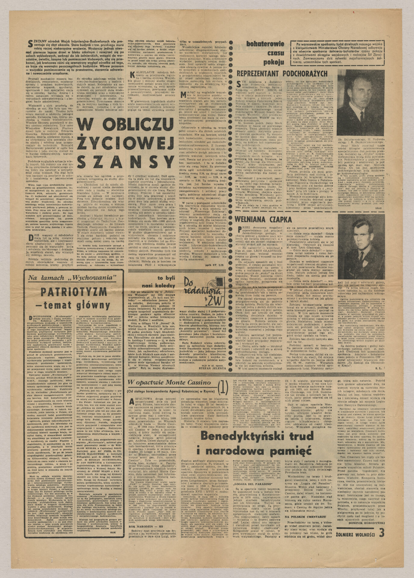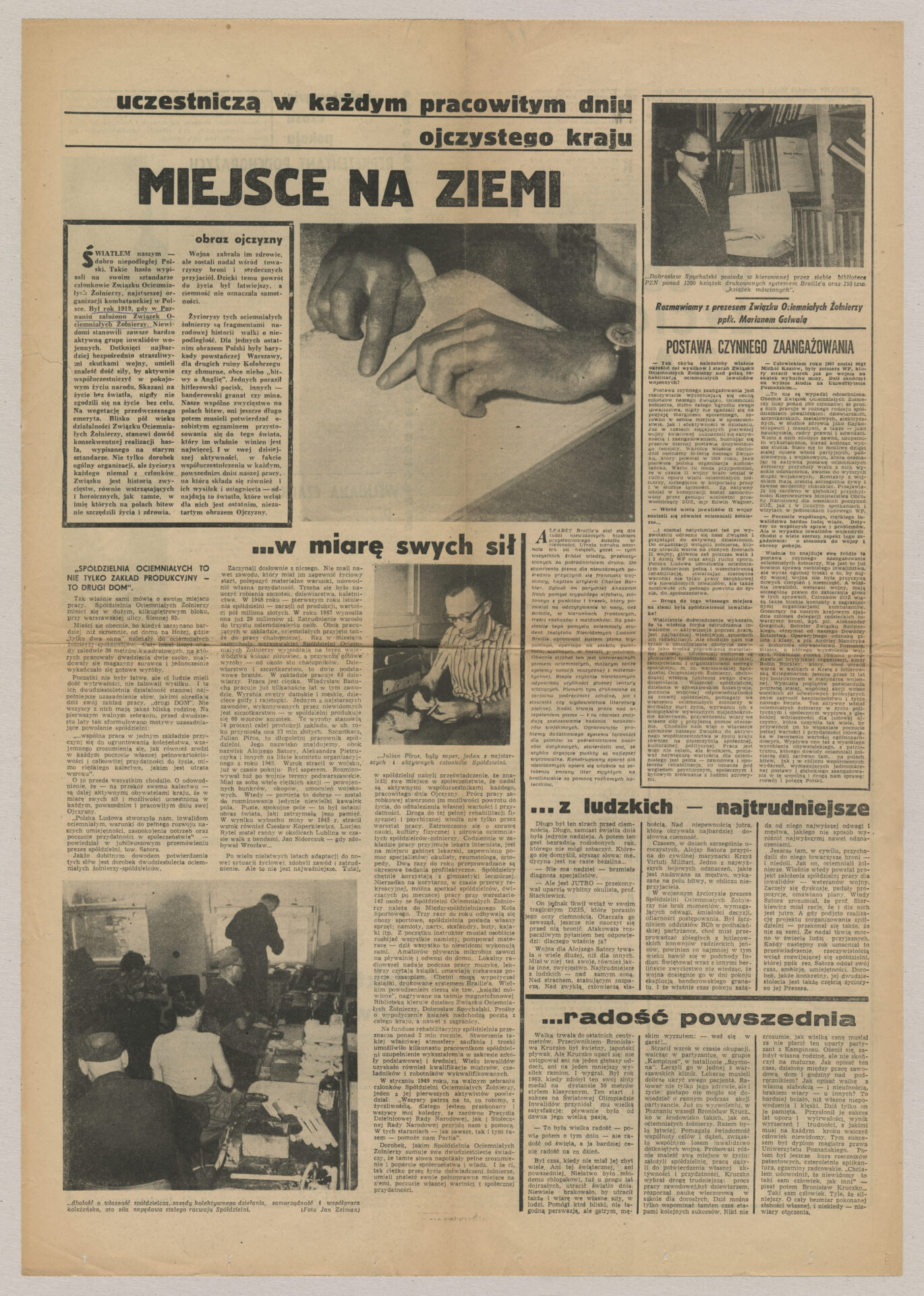 Strony z gazety “Żołnierz wolności” na temat ociemniałych żołnierzy, która mogła stanowić notatkę do filmu Krzysztofa Kieślowskiego “Byłem żołnierzem” (1970). Zanim film nosił ten tytuł, praca nad nim trwała pod roboczymi tytułami “Świat jeden dla wszystkich” i “Ociemniali”. Film został zrealizowany wspólnie z Andrzejem Titkowem, kolegą reżysera ze Szkoły Filmowej w Łodzi. Produkcja odbyła się poza macierzystą Wytwórnią Filmów Dokumentalną, w Wytwórni Filmowej “Czołówka”.