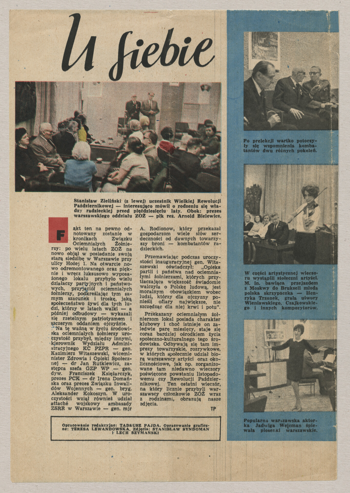 Strony z gazety, suplement “Żołnierza wolności”, na temat ociemniałych żołnierzy, która mogła stanowić notatkę do filmu Krzysztofa Kieślowskiego “Byłem żołnierzem” (1970). Zanim film nosił ten tytuł, praca nad nim trwała pod roboczymi tytułami “Świat jeden dla wszystkich” i “Ociemniali”. Film został zrealizowany wspólnie z Andrzejem Titkowem, kolegą reżysera ze Szkoły Filmowej w Łodzi. Produkcja odbyła się poza macierzystą Wytwórnią Filmów Dokumentalną, w Wytwórni Filmowej “Czołówka”.
