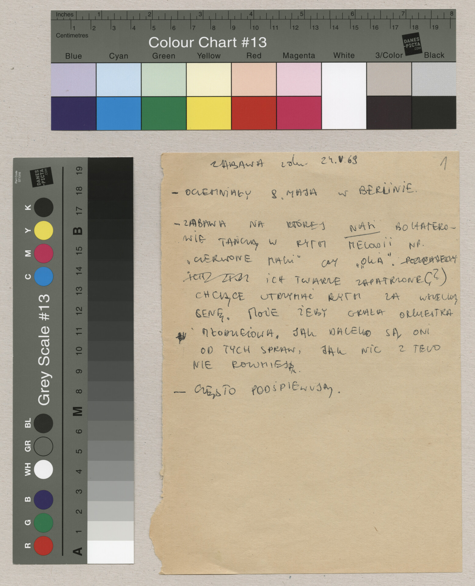 Rękopis z notatkami do filmu Krzysztofa Kieślowskiego “Byłem żołnierzem” (1970). Zanim film nosił ten tytuł, praca nad nim trwała pod roboczymi tytułami “Świat jeden dla wszystkich” i “Ociemniali”. Film został zrealizowany wspólnie z Andrzejem Titkowem, kolegą reżysera ze Szkoły Filmowej w Łodzi. Produkcja odbyła się poza macierzystą Wytwórnią Filmów Dokumentalną, w Wytwórni Filmowej “Czołówka”. Notatka stanowi zapisek zatytułowany “Zabawa z dn. 24.05.1969” na temat pomysłu sceny zabawy ociemniałych żołnierzy w Berlinie tańczących i podśpiewujących w rytm melodii “Czerwone maki”. Format niestandardowy – arkusz papieru stanowi 1_2 całego arkusza.