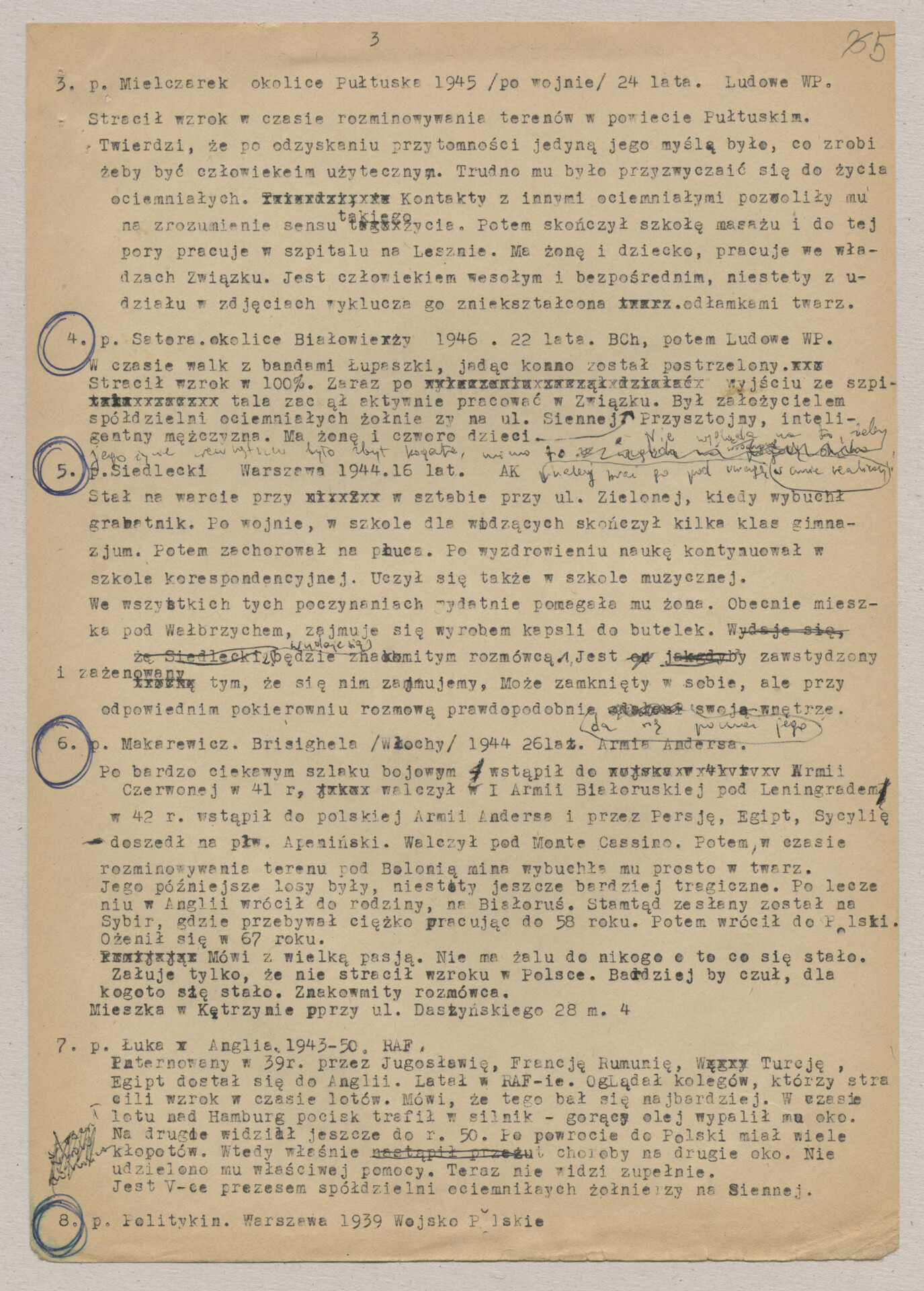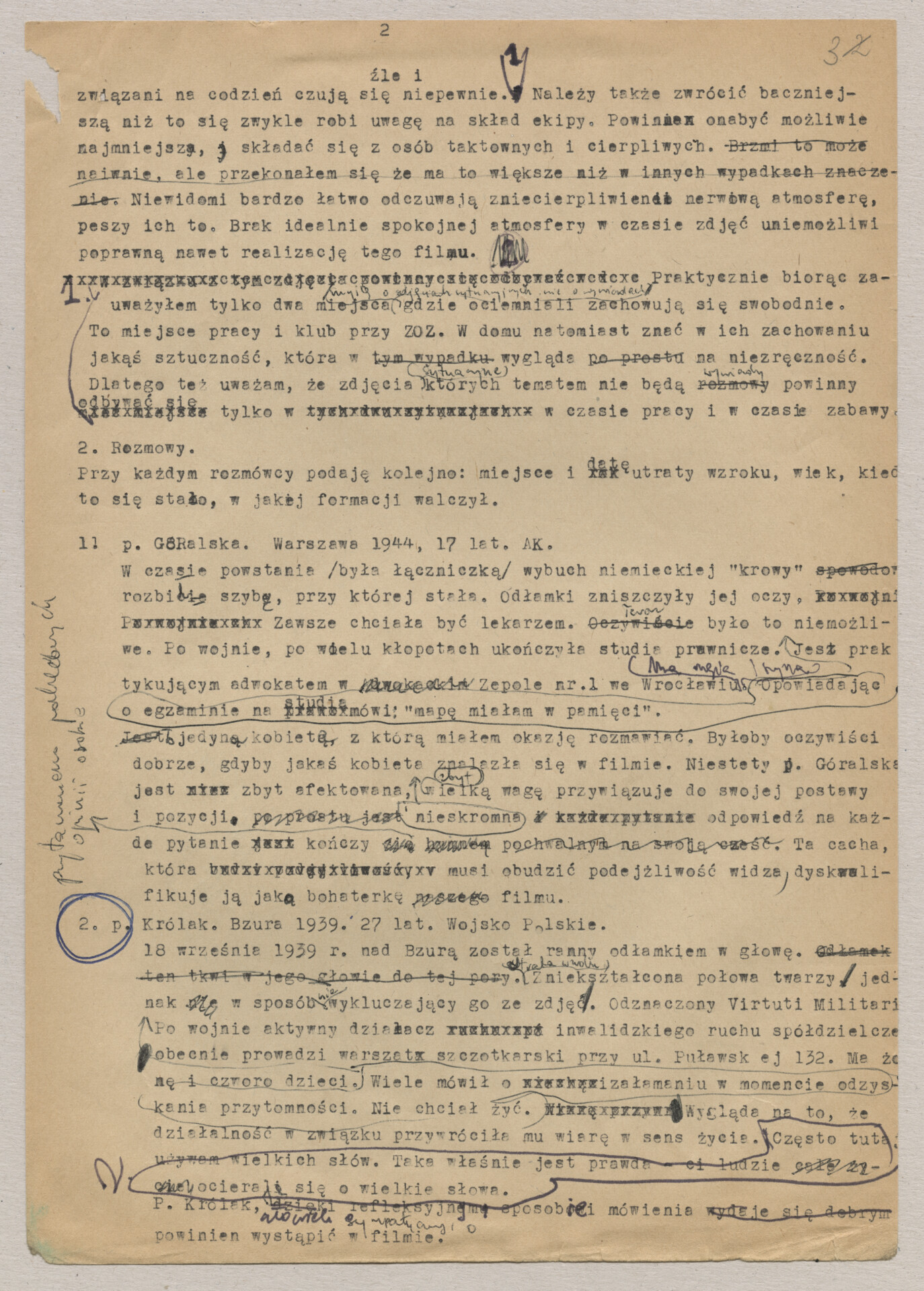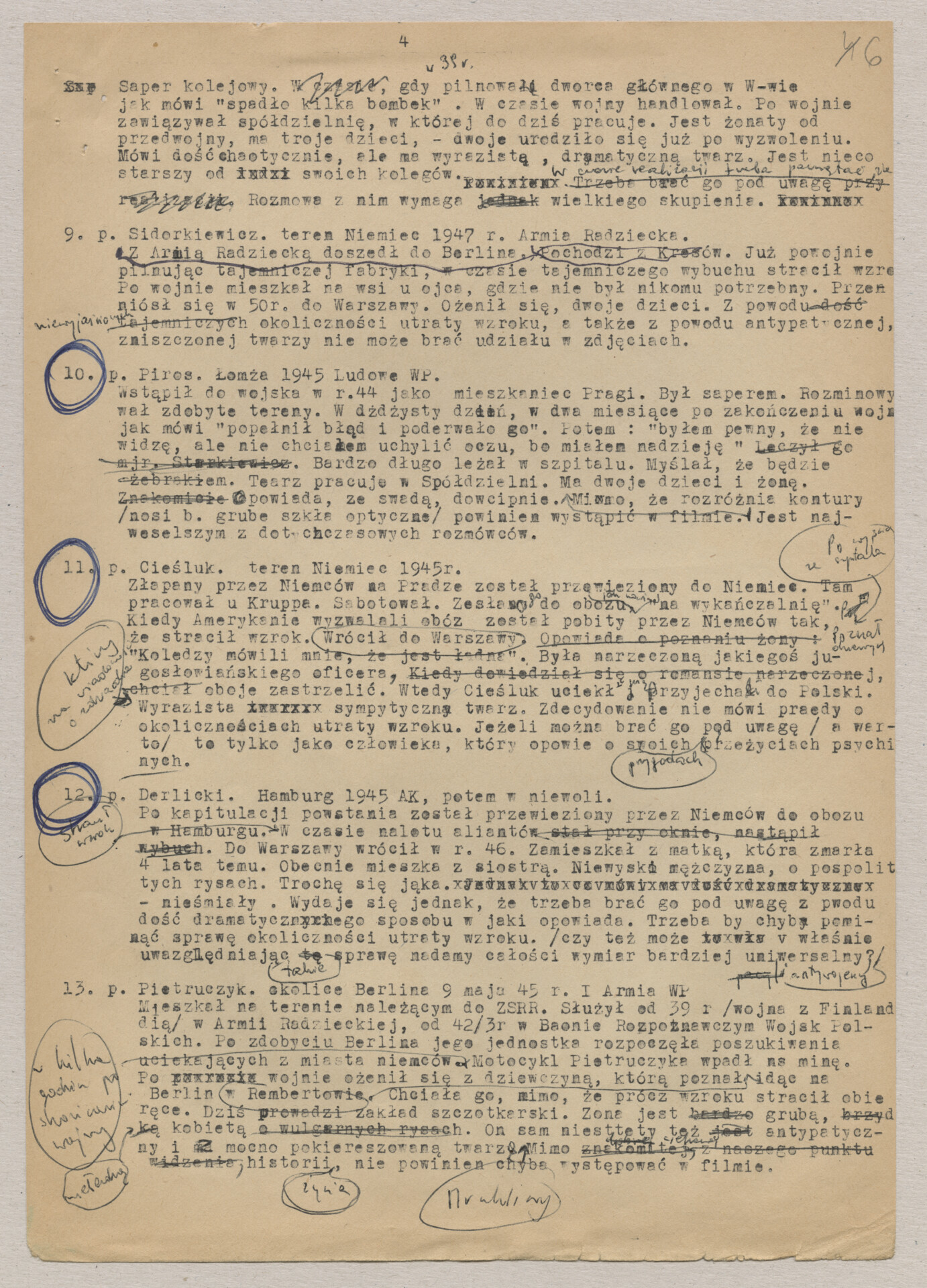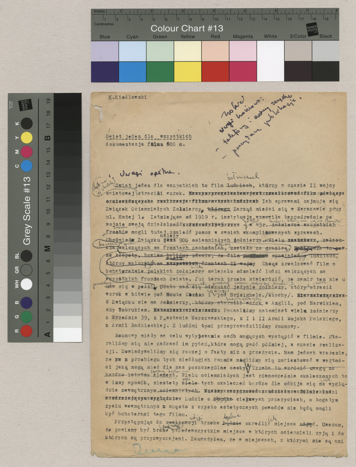 Maszynopis z dokumentacją do filmu Krzysztofa Kieślowskiego “Byłem żołnierzem” (1970). Zanim film nosił ten tytuł, praca nad nim trwała pod roboczymi tytułami “Świat jeden dla wszystkich” i “Ociemniali”. Film został zrealizowany wspólnie z Andrzejem Titkowem, kolegą reżysera ze Szkoły Filmowej w Łodzi. Produkcja odbyła się poza macierzystą Wytwórnią Filmów Dokumentalną, w Wytwórni Filmowej “Czołówka”. Dokumentacja zawiera akapity zatytułowane: “Uwagi ogólne”, “Rozmowy”, “Uwagi końcowe”. Dokument zawiera odręczne notatki autora. Dokument powiązany jest z dokumentem o sygnaturze ATKK-BZ-I-026.