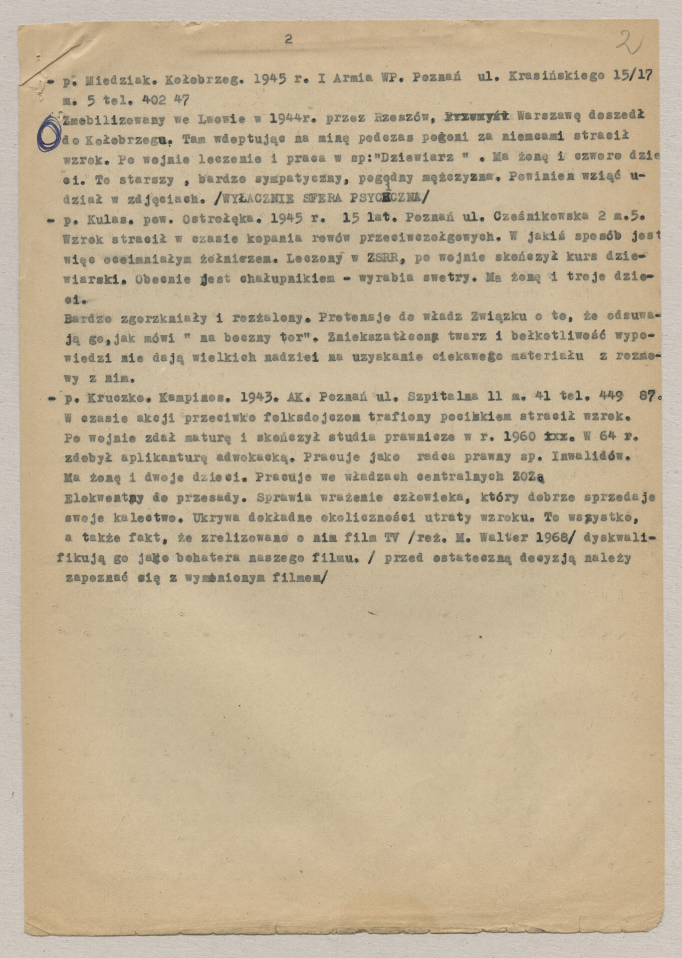 Maszynopis z dodatkową dokumentacją do filmu Krzysztofa Kieślowskiego “Byłem żołnierzem” (1970). Zanim film nosił ten tytuł, praca nad nim trwała pod roboczymi tytułami “Świat jeden dla wszystkich” i “Ociemniali”. Film został zrealizowany wspólnie z Andrzejem Titkowem, kolegą reżysera ze Szkoły Filmowej w Łodzi. Produkcja odbyła się poza macierzystą Wytwórnią Filmów Dokumentalną, w Wytwórni Filmowej “Czołówka”. Dokument powiązany jest z dokumentem o sygnaturze ATKK-BZ-I-024.