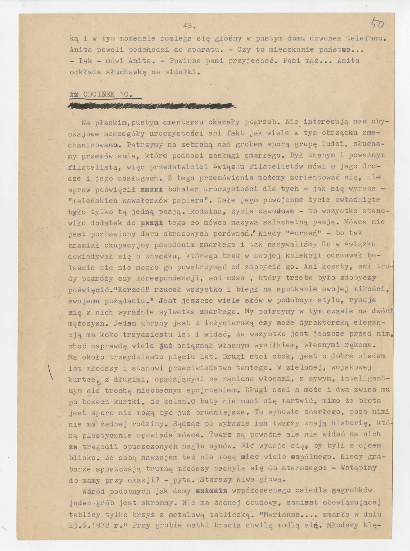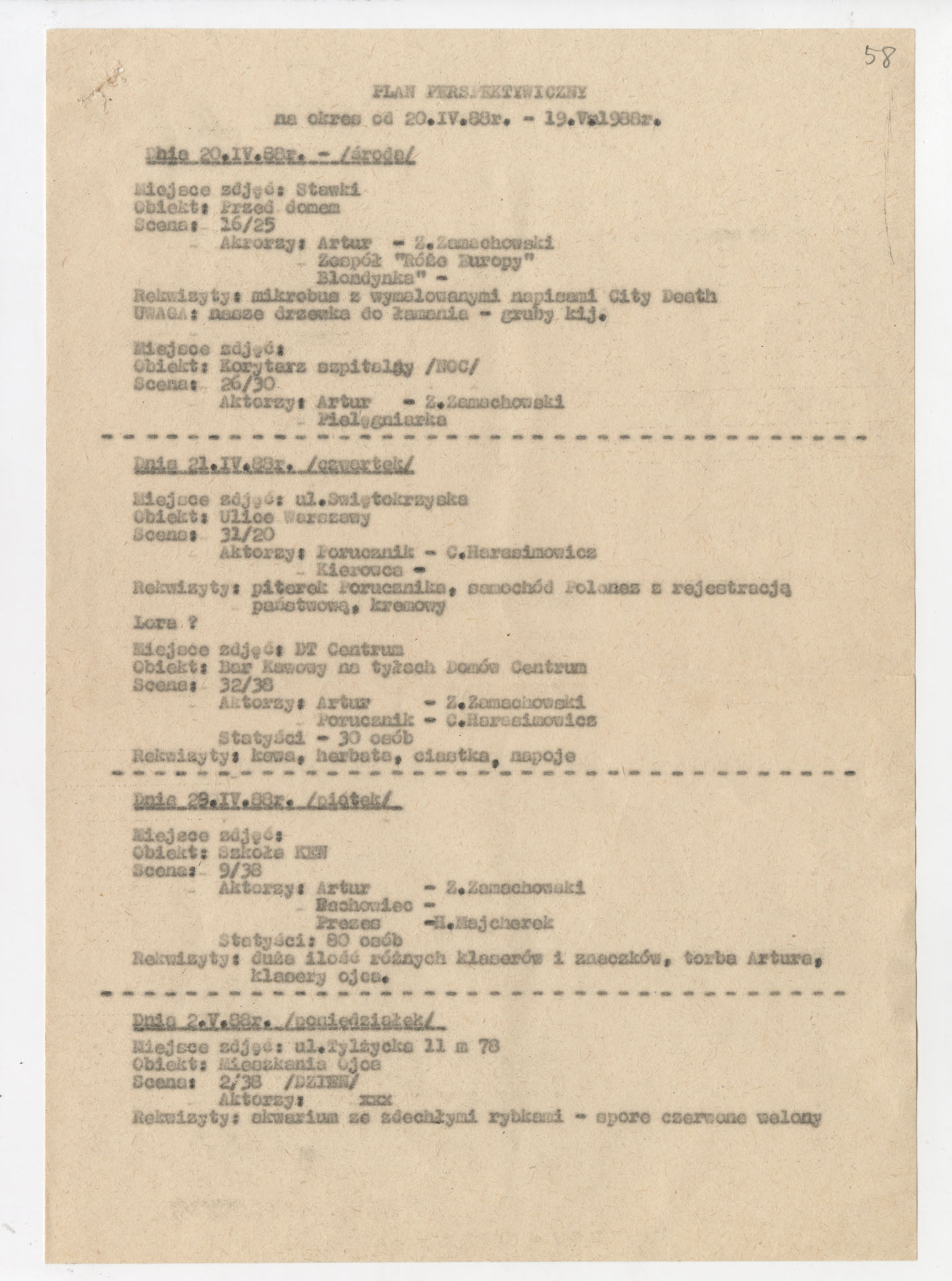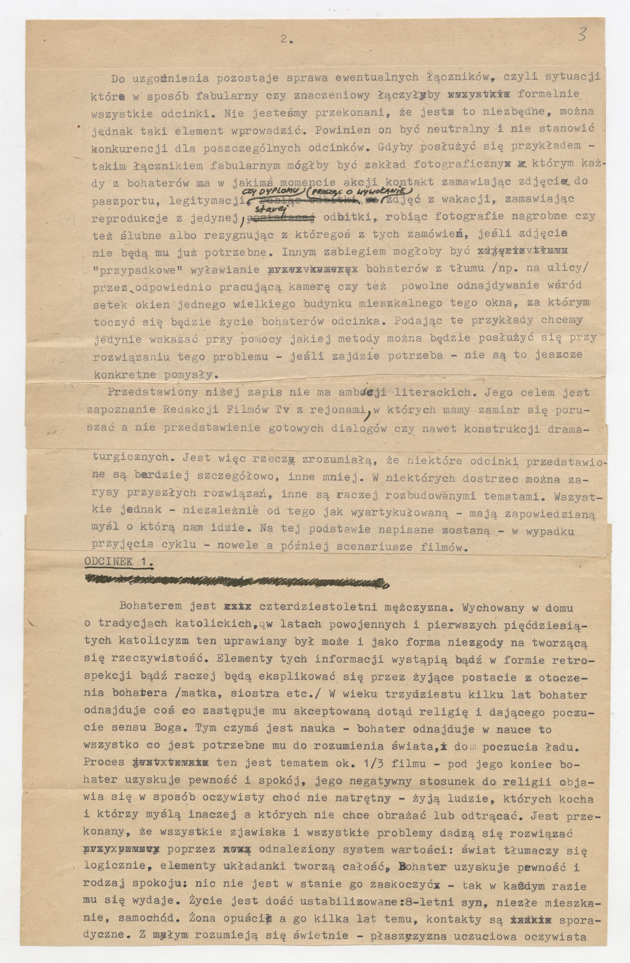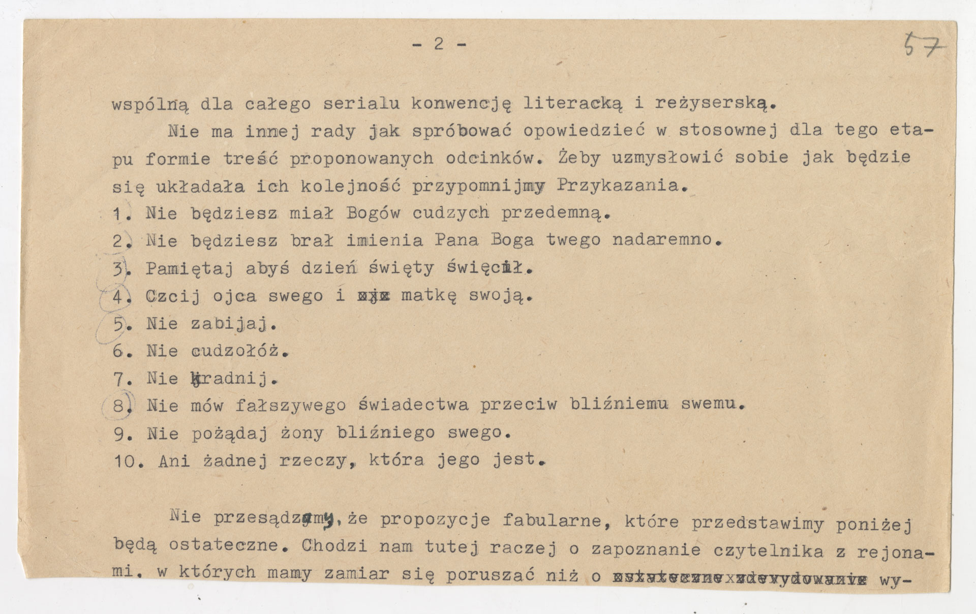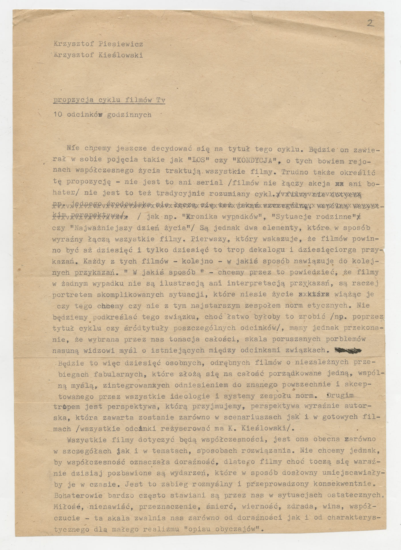 Maszynopis z propozycją cyklu telewizyjnego “Dekalog” autorstwa Krzysztofa Kieślowskiego i Krzysztofa Piesiewicza, który stał się podstawą telewizyjnego cyklu filmowego “Dekalog” (1988-1989), zrealizowanego według scenariuszy obu autorów i wyprodukowanego przez Zespół Filmowy Tor dla Telewizji Polskiej. Dokument nosi tytuł “Dekalog – propozycja cyklu / serialu TV. 10 odcinków godzinnych” i ma postać wielostronicowego maszynopisu. Zawiera część wstępną – esejowy opis założeń artystycznych cyklu (refleksje o współczesnym kryzysie rozróżnienia dobra i zła, o roli Dziesięciu Przykazań jako najstarszego zbioru norm etycznych) – oraz szczegółowe konspekty wszystkich dziesięciu odcinków, oznaczonych nagłówkami “Odcinek 1”, “Odcinek 2”, “Odcinek 10”. Każdy z nich przedstawia zarys fabuły z głównymi bohaterami, sytuacjami dramatycznymi, relacjami rodzinnymi i zawodowymi, a także sygnalizuje związek z jednym z przykazań (bez dosłownego przywoływania go w tytule). Tekst ma charakter materiału koncepcyjnego: zapisany ciągłą prozą, bez numeracji scen, służy jako punkt wyjścia do późniejszych nowel i scenariuszy odcinków, określając tonację całego cyklu (odejście od publicystyki i polityki na rzecz opowieści o odpowiedzialności, winie, miłości, wierze i przypadkach kształtujących ludzkie losy).