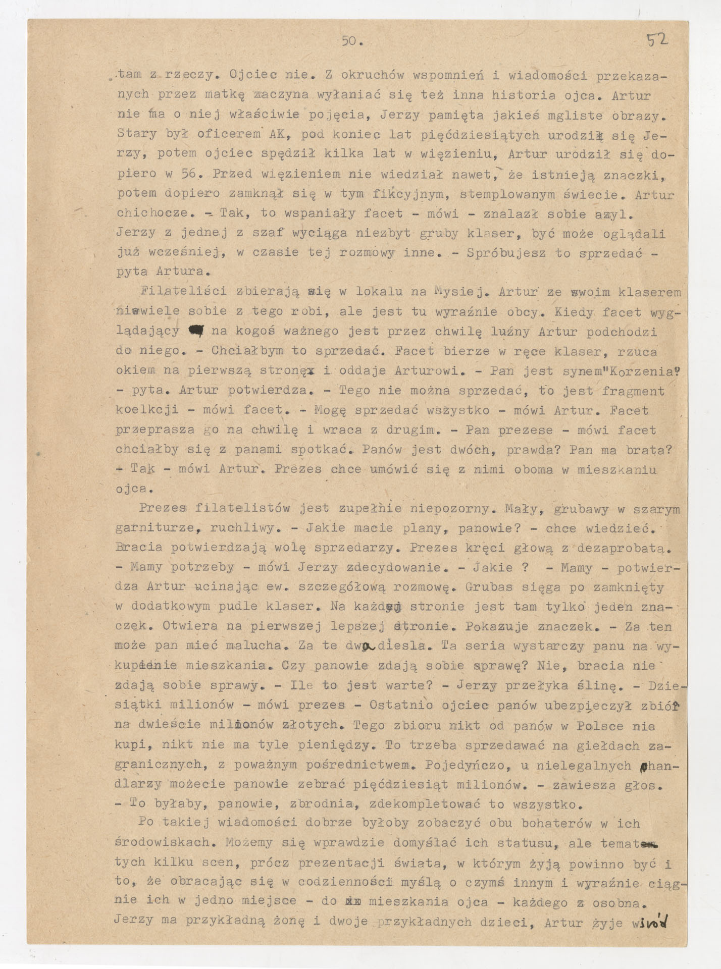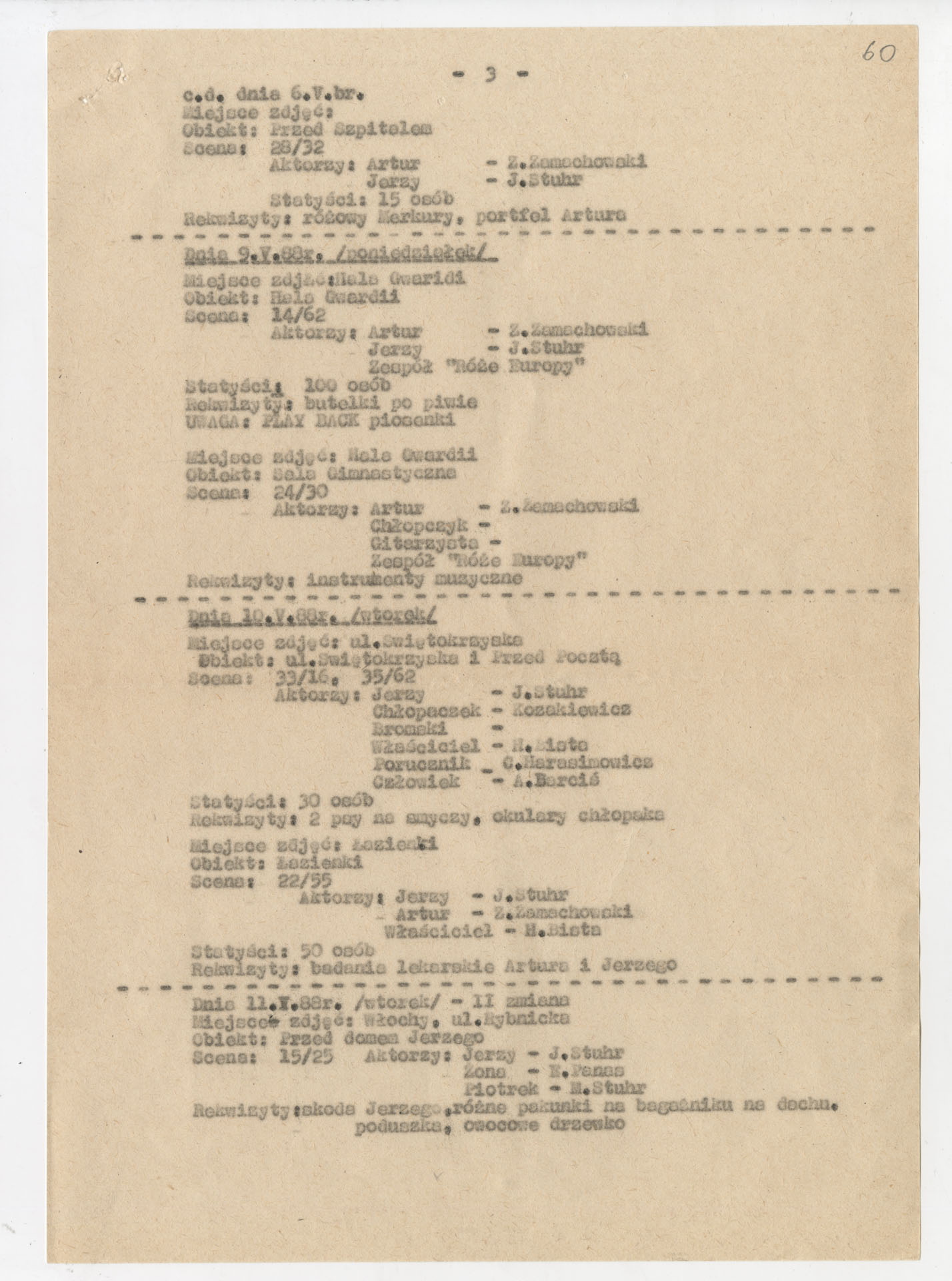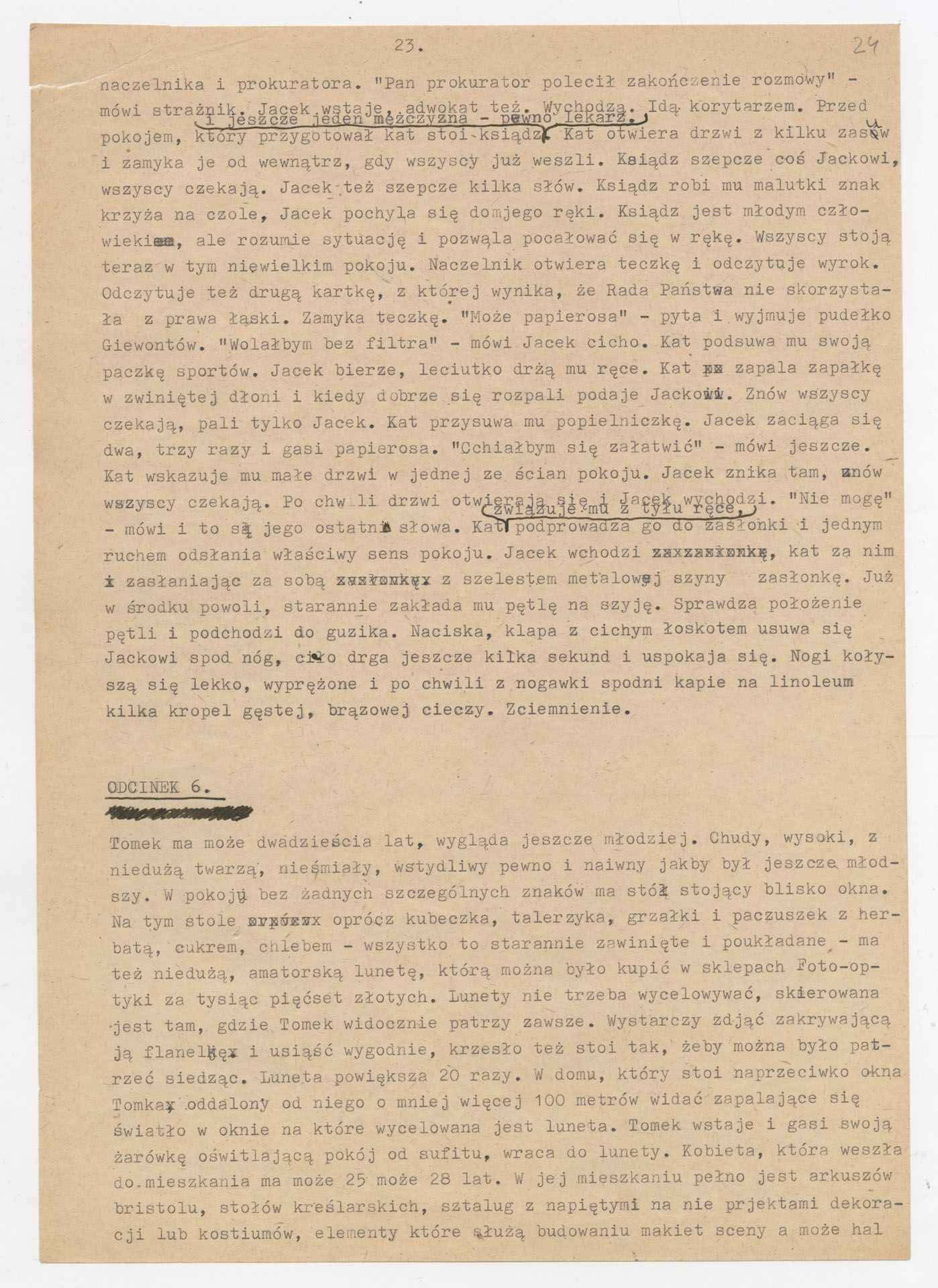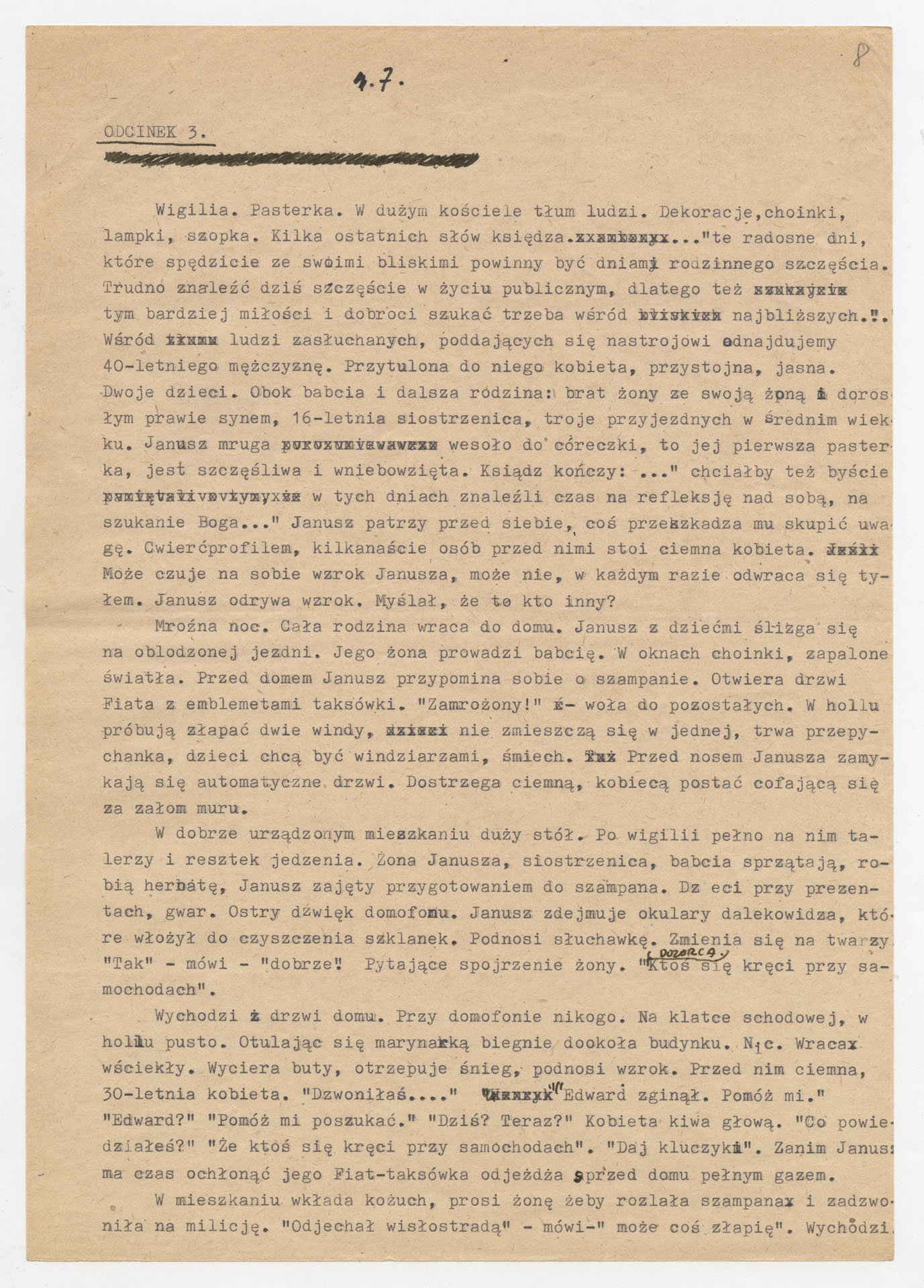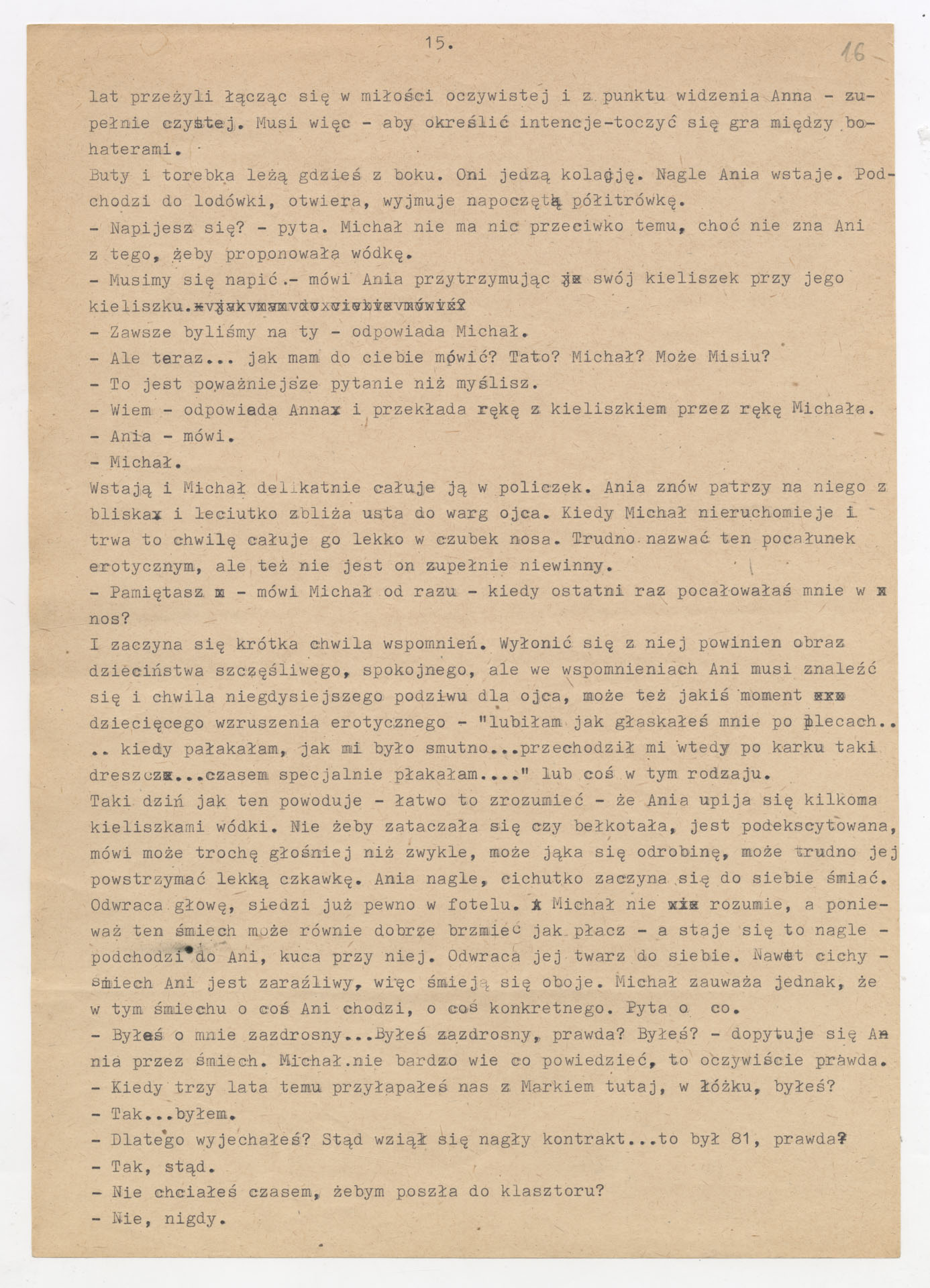 Maszynopis z propozycją cyklu telewizyjnego “Dekalog” autorstwa Krzysztofa Kieślowskiego i Krzysztofa Piesiewicza, który stał się podstawą telewizyjnego cyklu filmowego “Dekalog” (1988-1989), zrealizowanego według scenariuszy obu autorów i wyprodukowanego przez Zespół Filmowy Tor dla Telewizji Polskiej. Dokument nosi tytuł “Dekalog – propozycja cyklu / serialu TV. 10 odcinków godzinnych” i ma postać wielostronicowego maszynopisu. Zawiera część wstępną – esejowy opis założeń artystycznych cyklu (refleksje o współczesnym kryzysie rozróżnienia dobra i zła, o roli Dziesięciu Przykazań jako najstarszego zbioru norm etycznych) – oraz szczegółowe konspekty wszystkich dziesięciu odcinków, oznaczonych nagłówkami “Odcinek 1”, “Odcinek 2”, “Odcinek 10”. Każdy z nich przedstawia zarys fabuły z głównymi bohaterami, sytuacjami dramatycznymi, relacjami rodzinnymi i zawodowymi, a także sygnalizuje związek z jednym z przykazań (bez dosłownego przywoływania go w tytule). Tekst ma charakter materiału koncepcyjnego: zapisany ciągłą prozą, bez numeracji scen, służy jako punkt wyjścia do późniejszych nowel i scenariuszy odcinków, określając tonację całego cyklu (odejście od publicystyki i polityki na rzecz opowieści o odpowiedzialności, winie, miłości, wierze i przypadkach kształtujących ludzkie losy).