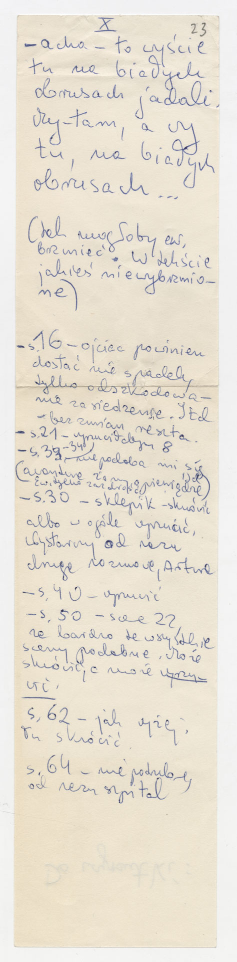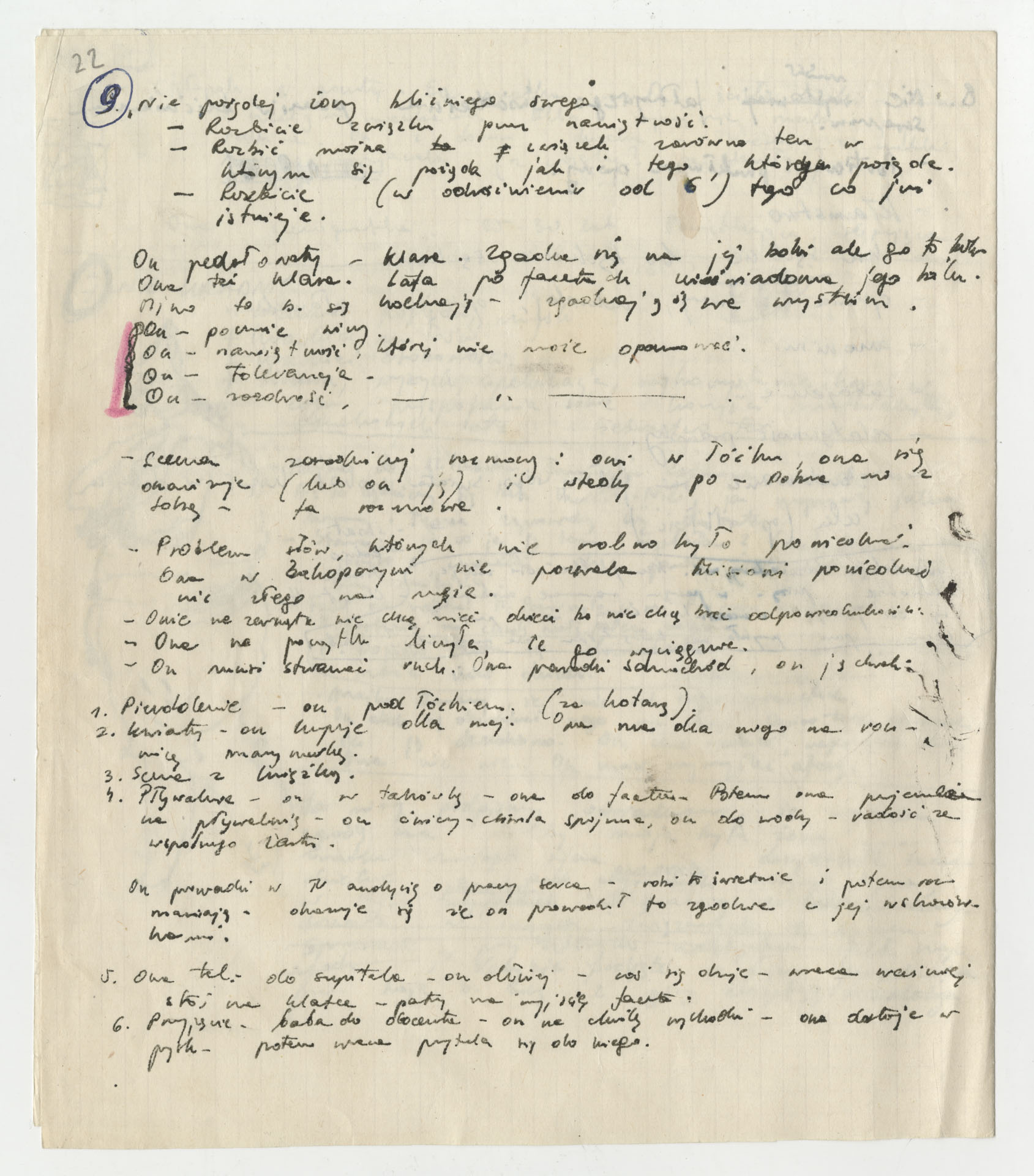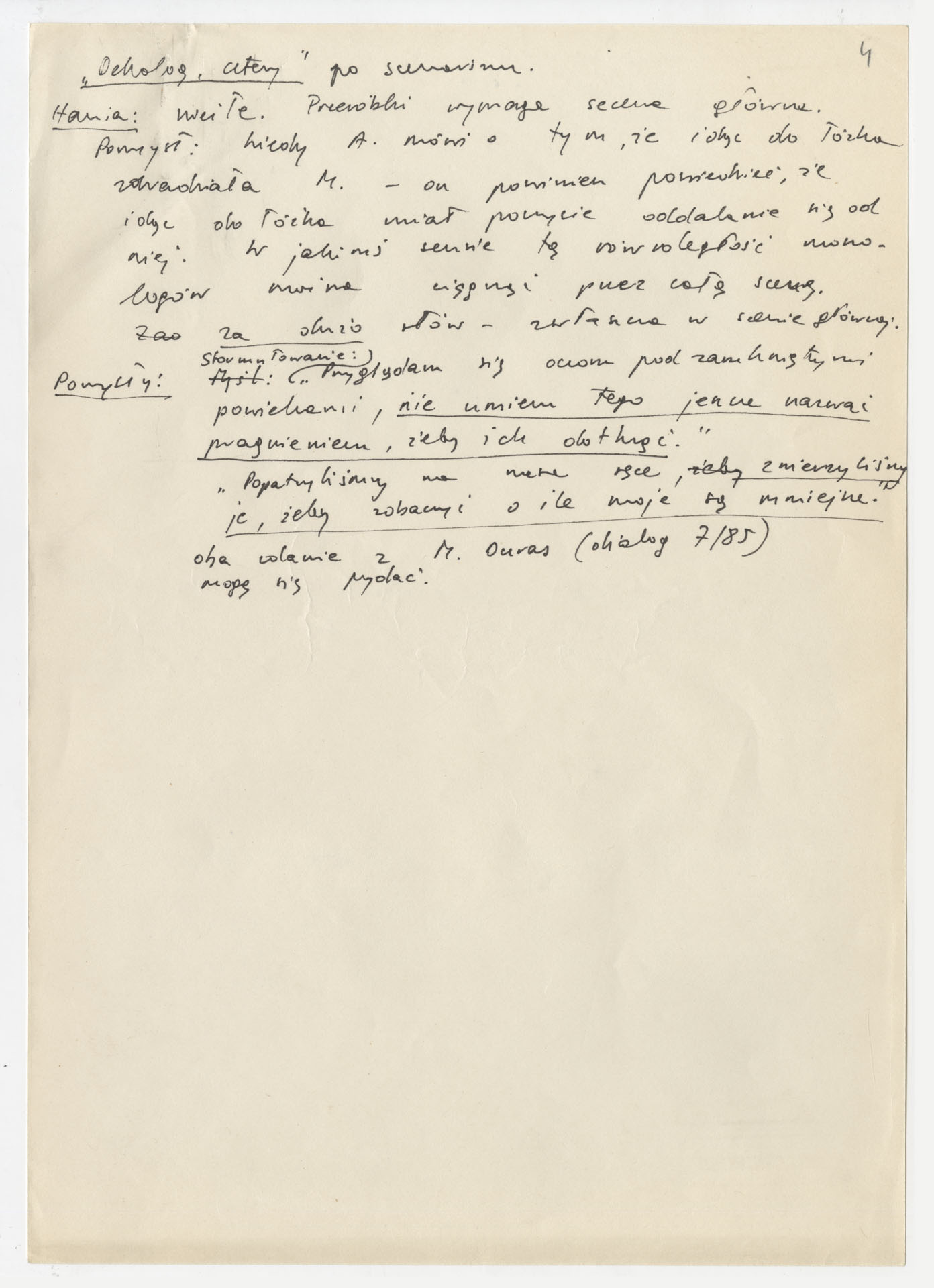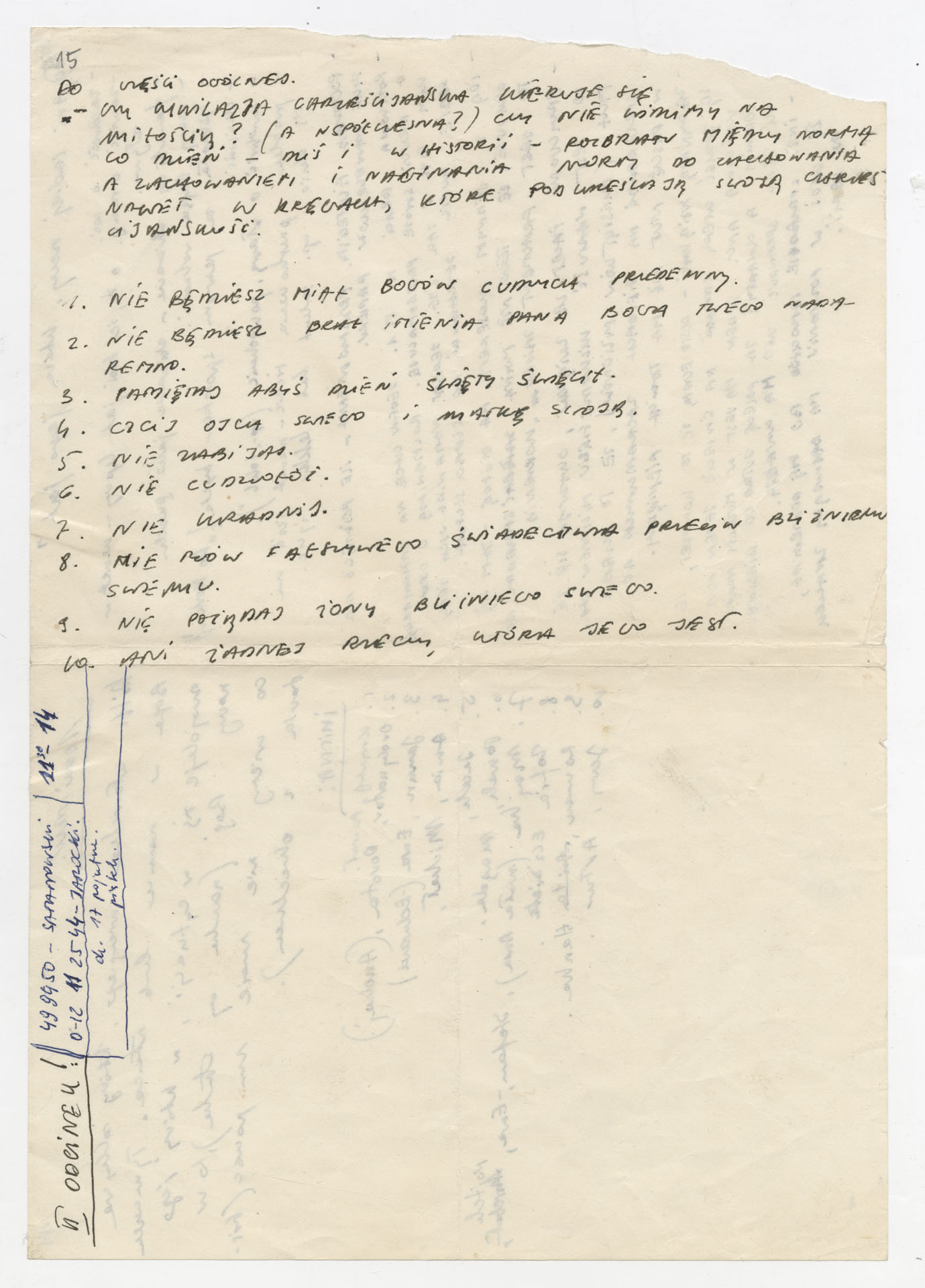 Rękopis z notatkami związanymi z pracą nad cyklem telewizyjnym “Dekalog” (1988-1989) w reżyserii Krzysztofa Kieślowskiego, zrealizowanym według scenariuszy Krzysztofa Kieślowskiego i Krzysztofa Piesiewicza i wyprodukowanym przez Zespół Filmowy Tor dla Telewizji Polskiej. Dokument ma formę kilku zapisanych stron notowanych uwag na temat poszczególnych odcinków “Dekalogu”. Notatki sporządzone w toku przygotowań lub realizacji cyklu wskazują na roboczy charakter materiału. Dokument pełni funkcję pomocniczych zapisków towarzyszących procesowi twórczemu i organizacyjnemu przy “Dekalogu”.