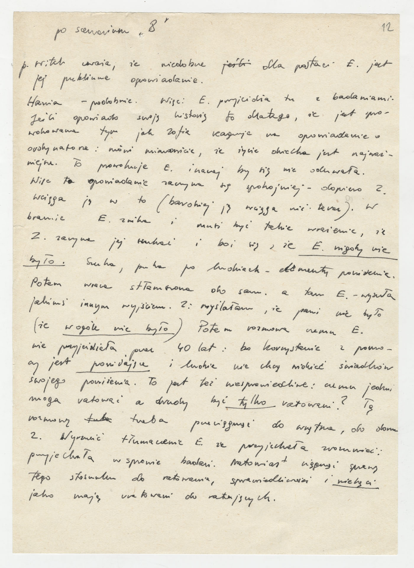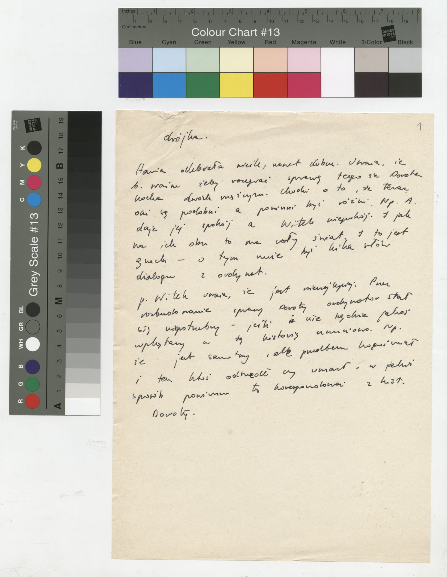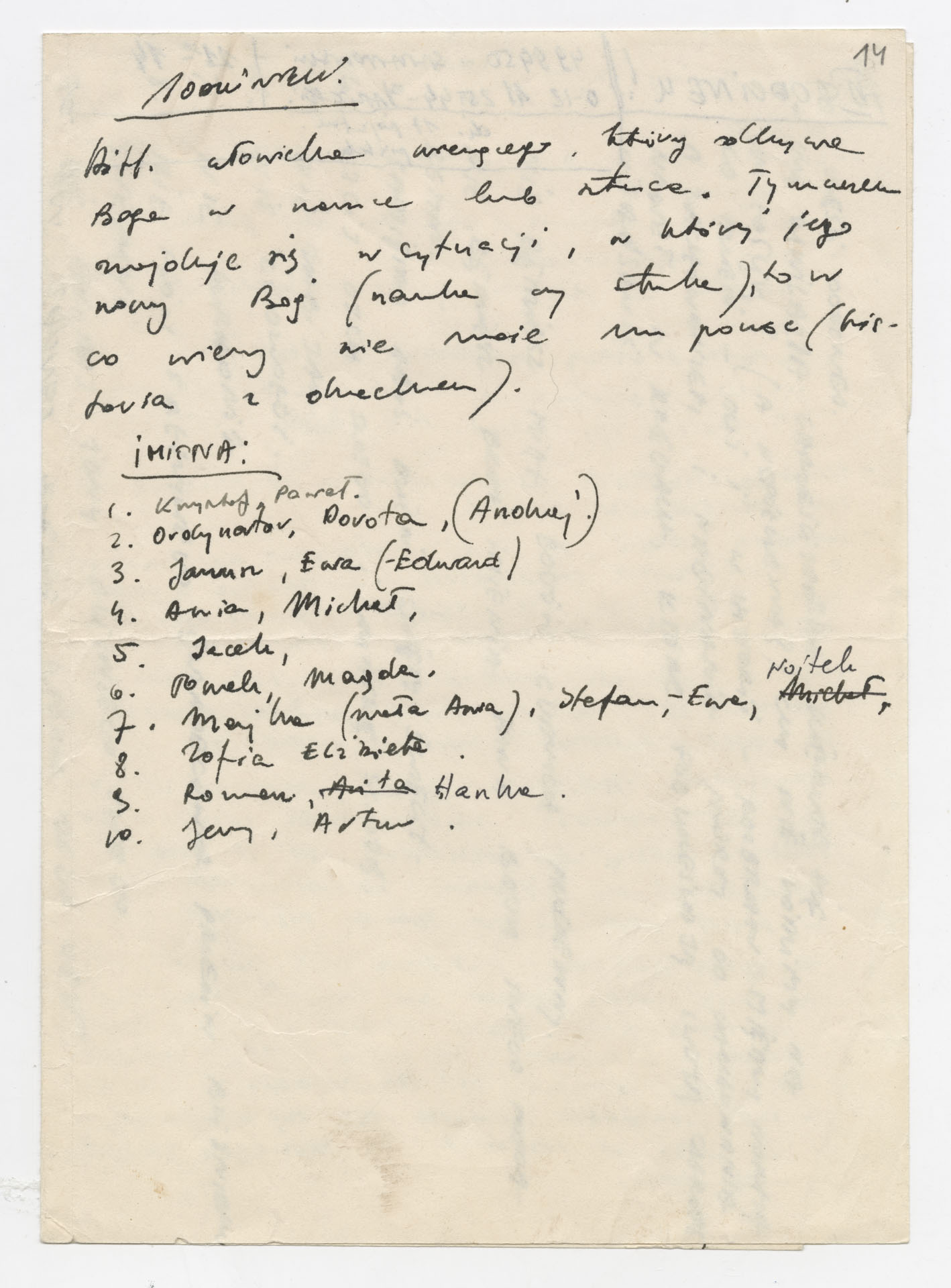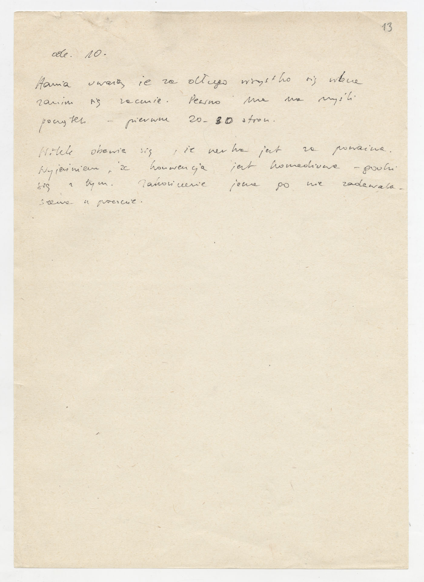 Rękopis z notatkami związanymi z pracą nad cyklem telewizyjnym “Dekalog” (1988-1989) w reżyserii Krzysztofa Kieślowskiego, zrealizowanym według scenariuszy Krzysztofa Kieślowskiego i Krzysztofa Piesiewicza i wyprodukowanym przez Zespół Filmowy Tor dla Telewizji Polskiej. Dokument ma formę kilku zapisanych stron notowanych uwag na temat poszczególnych odcinków “Dekalogu”. Notatki sporządzone w toku przygotowań lub realizacji cyklu wskazują na roboczy charakter materiału. Dokument pełni funkcję pomocniczych zapisków towarzyszących procesowi twórczemu i organizacyjnemu przy “Dekalogu”.