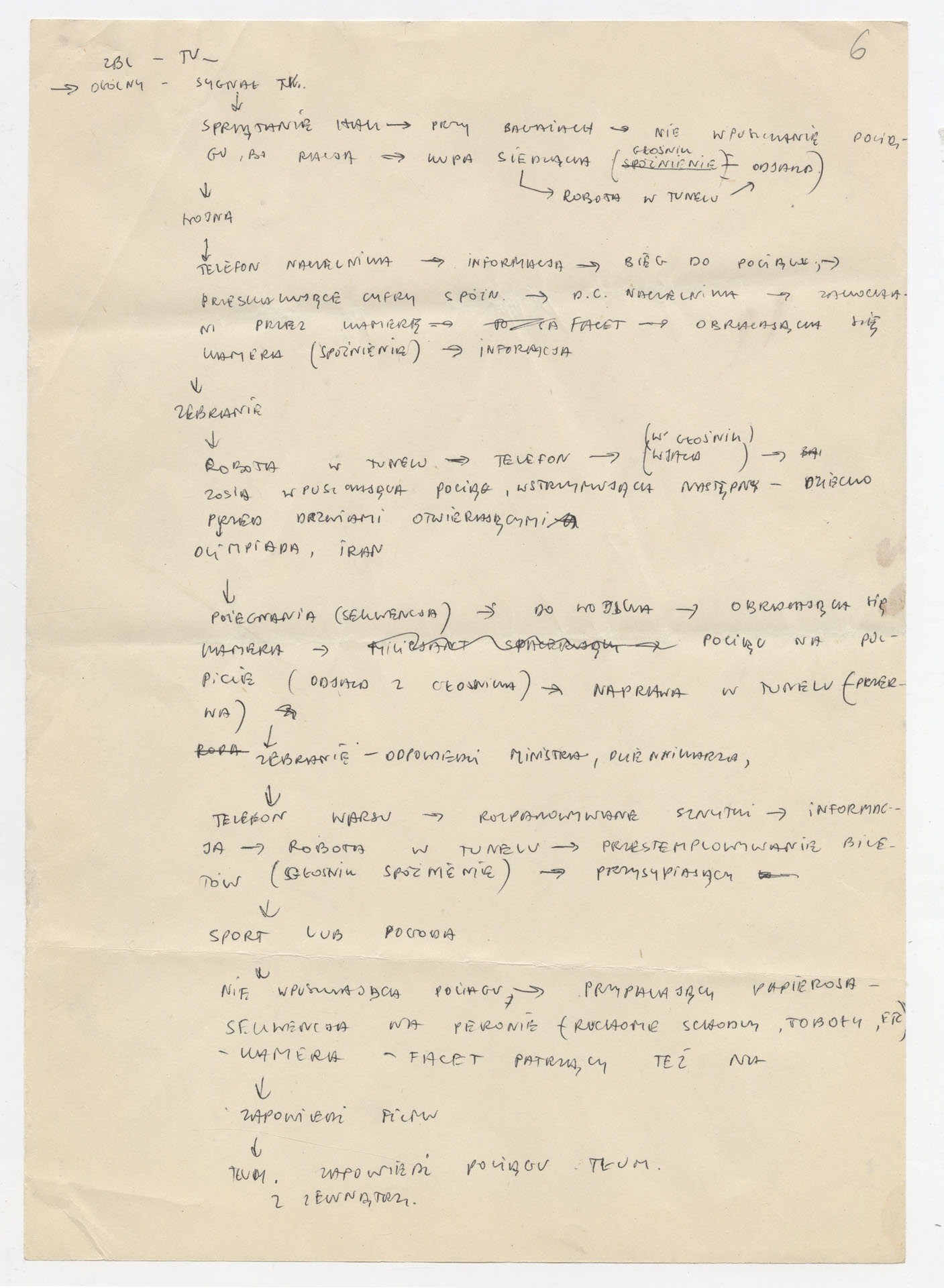 Maszynopis ze scenopisem filmu dokumentalnego Krzysztofa Kieślowskiego “Dworzec” (1980) zrealizowanego w Wytwórni Filmów Dokumentalnych i Fabularnych ze zdjęciami Witolda Stoka we współpracy z Jackiem Latałło. Film ukazuje codzienne życie na Dworcu Centralnym w Warszawie. Dokument określa film jako czarno-biały, o długości 440 m, kręcony wieczorem w naturalnych wnętrzach dworca przy trudnych warunkach oświetleniowych. Scenopis ma charakter techniczny: ponumerowane ujęcia opisują rodzaj planu (ogólny, pełny, średni, bliski), czas trwania, ruch kamery oraz podział na zdjęcia “100-procentowe” i nieme. Centralne są obrazy hali głównej, peronów, tuneli, automatów, telewizorów i monitorów przemysłowych, pracowników kolei oraz oczekujących podróżnych. W końcowych partiach pojawia się motyw nadzoru kamer i pracy dworcowych służb. Maszynopis zawiera odręczne dopiski i poprawki.