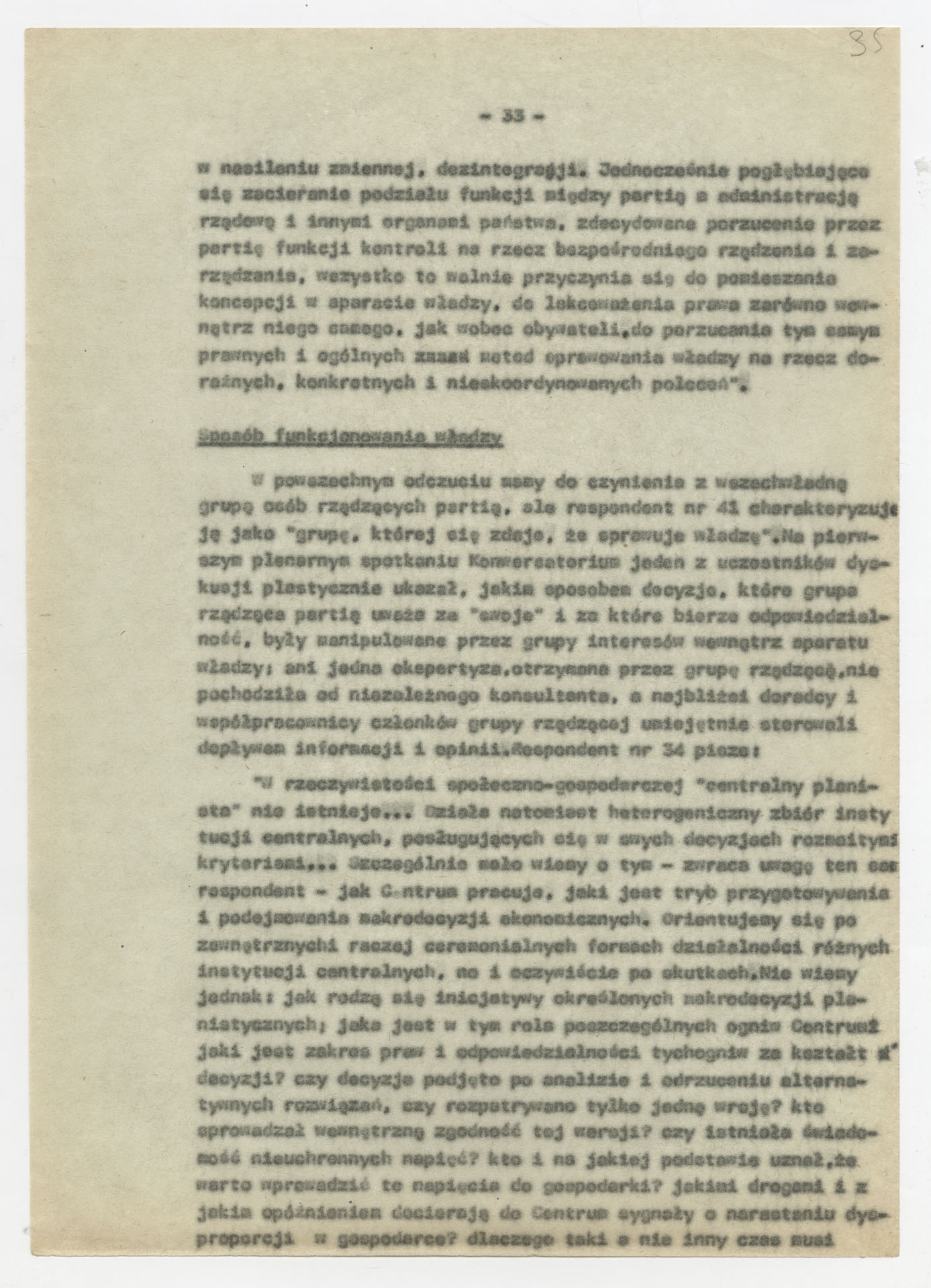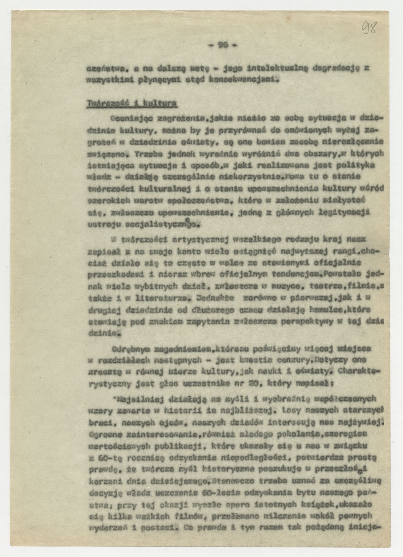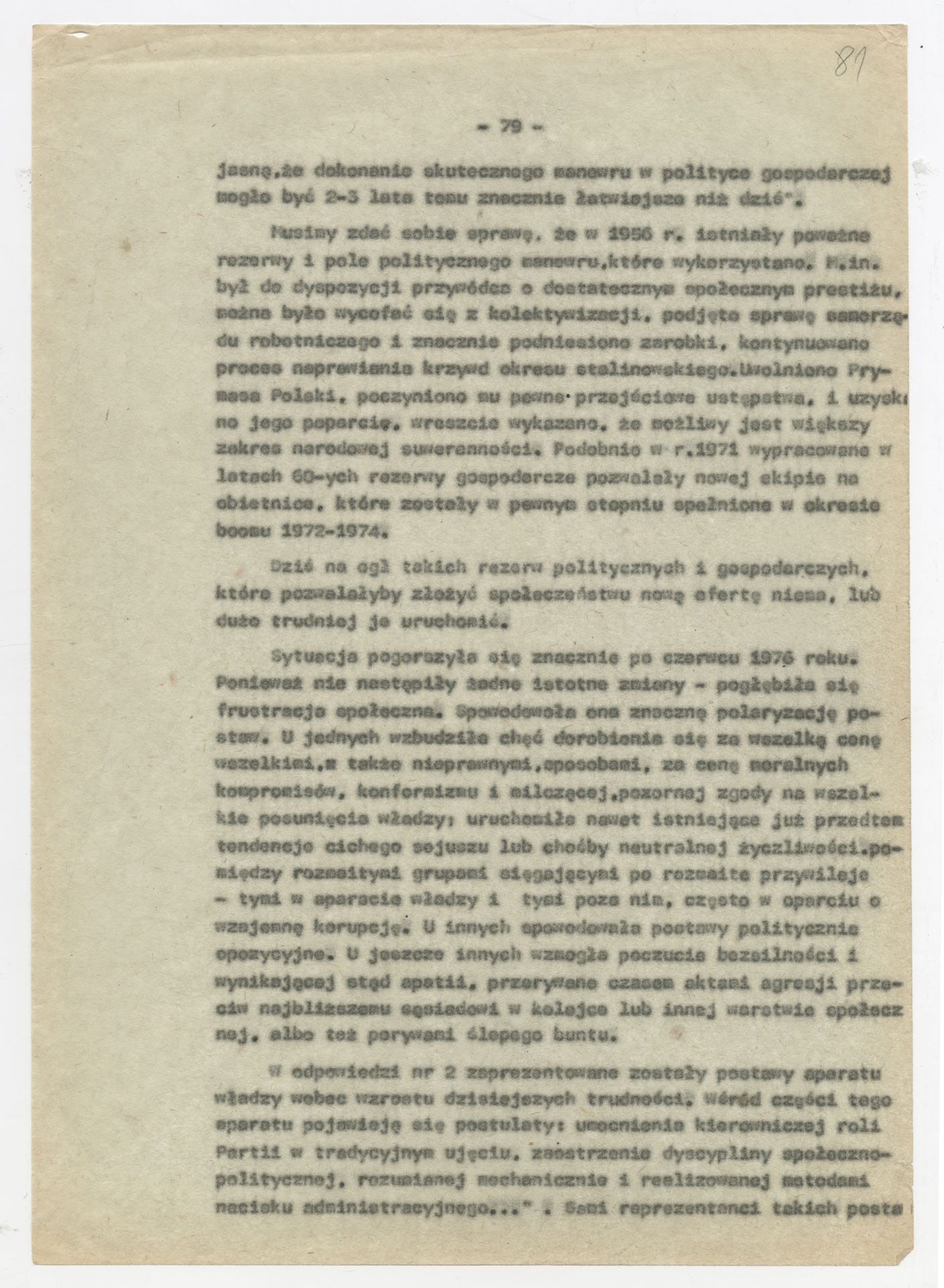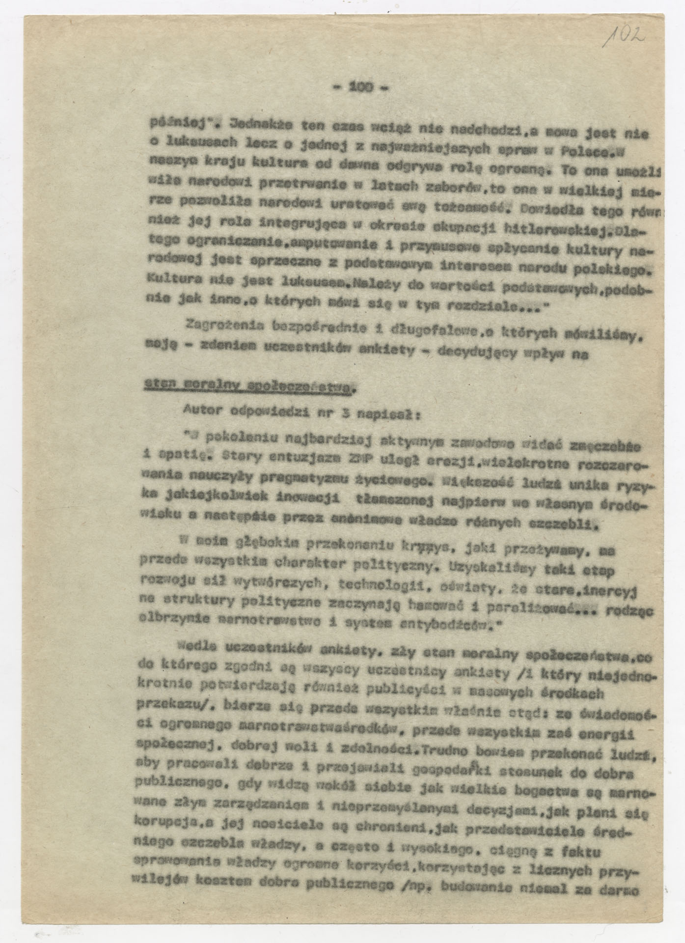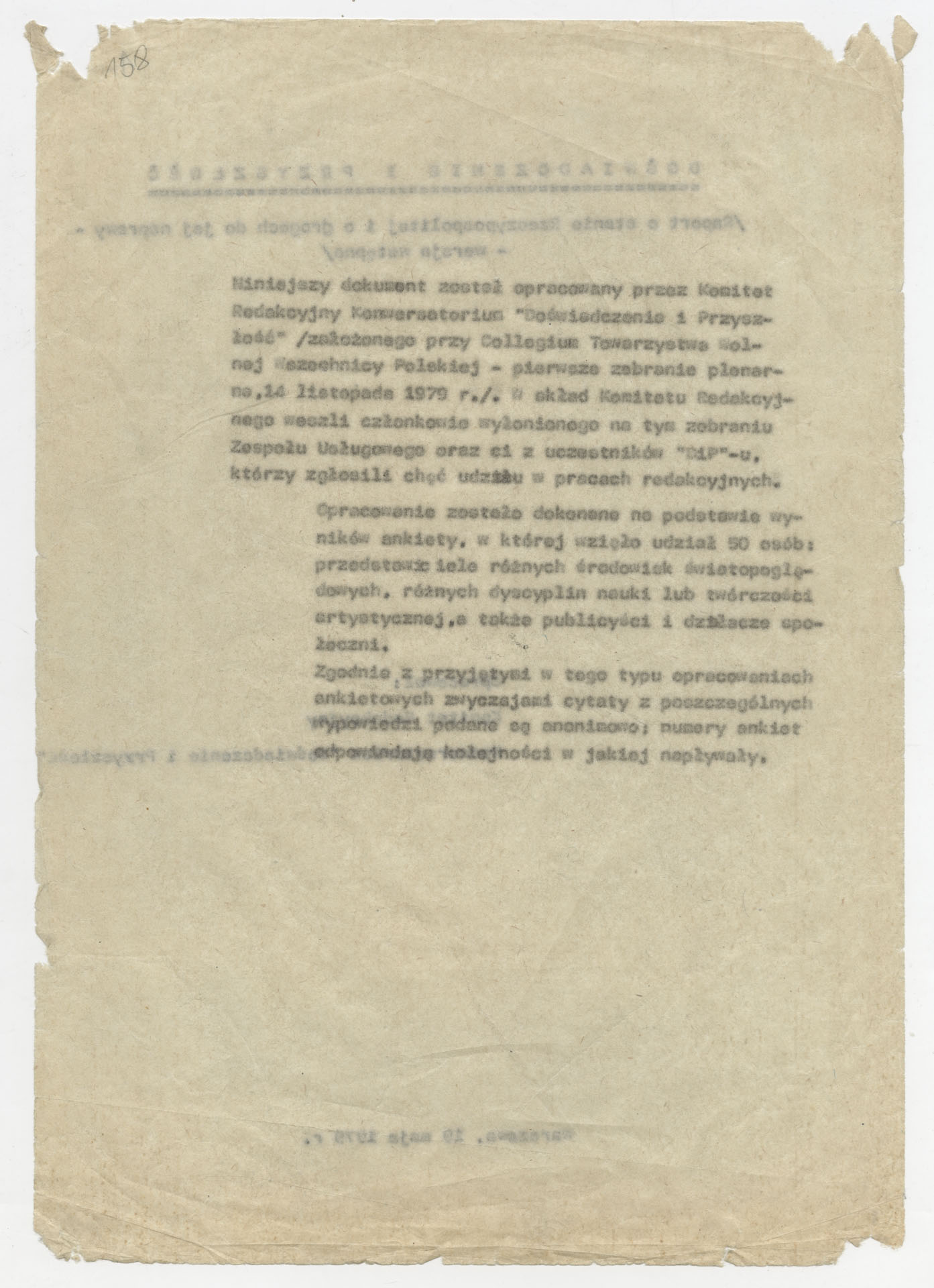 Maszynopis z opracowaniem wyników ankiety środowiskowej dotyczącej sytuacji społeczno-politycznej i kulturalnej w Polsce, związanej z pracami konwersatorium “Doświadczenie i przyszłość”. Tekst ma postać eseju analitycznego, podzielonego na części poświęcone diagnozie kryzysu gospodarczego, mechanizmom władzy, relacjom państwo-partia-społeczeństwo oraz kondycji środowisk twórczych i inteligenckich. Autorzy omawiają przyczyny narastającej frustracji i bierności, wskazują na niespójność oficjalnej polityki kulturalnej, centralizm decyzyjny i rozbieżność między deklaracjami a praktyką. W dalszych fragmentach formułują postulaty zmian: zwiększenia udziału obywateli w podejmowaniu decyzji, otwarcia debaty publicznej, odejścia od propagandowego języka i stworzenia realnych warunków rozwoju kultury. Dokument ma charakter roboczej ekspertyzy programowej, przygotowanej jako baza do dalszych dyskusji i działań.