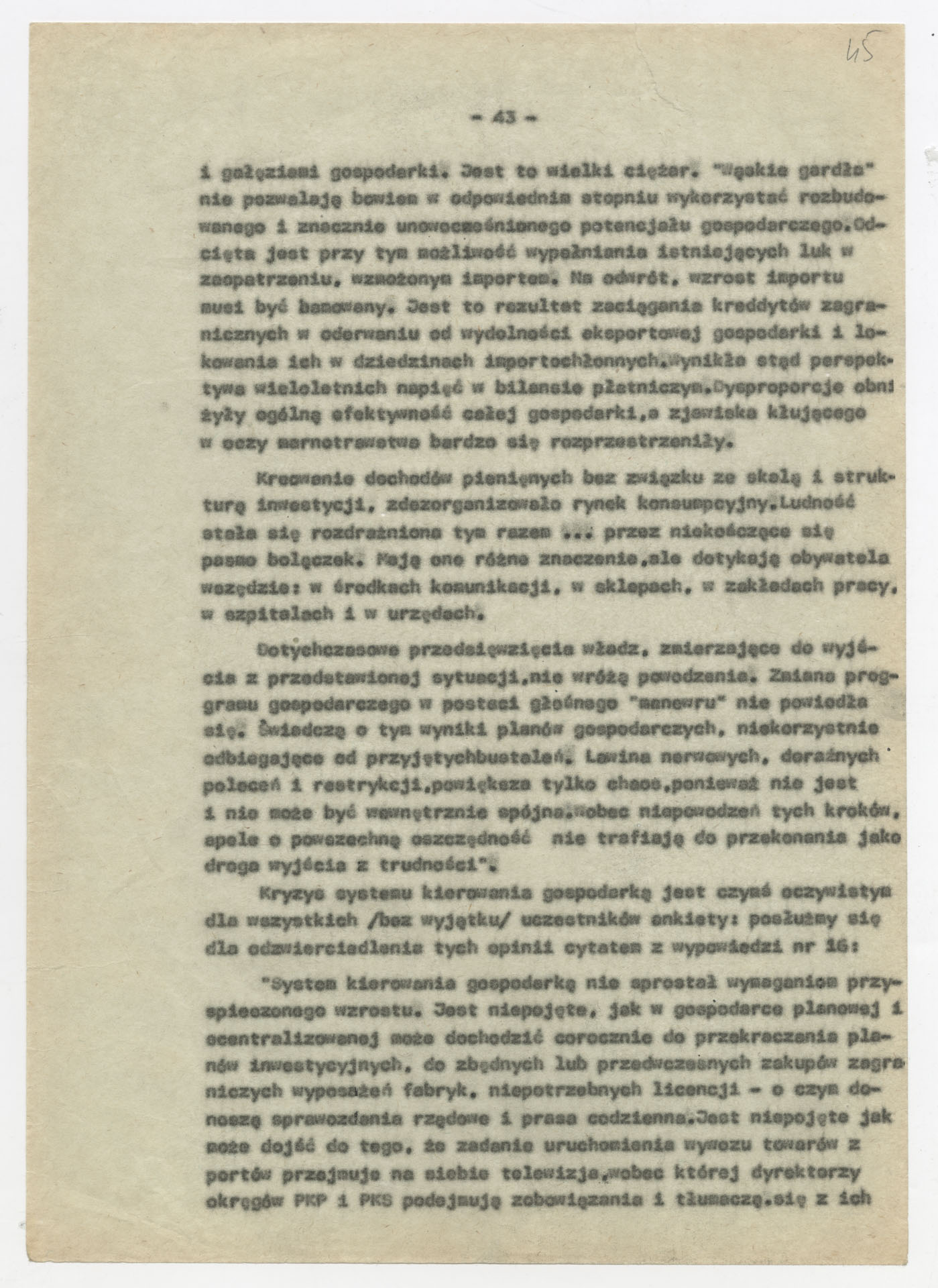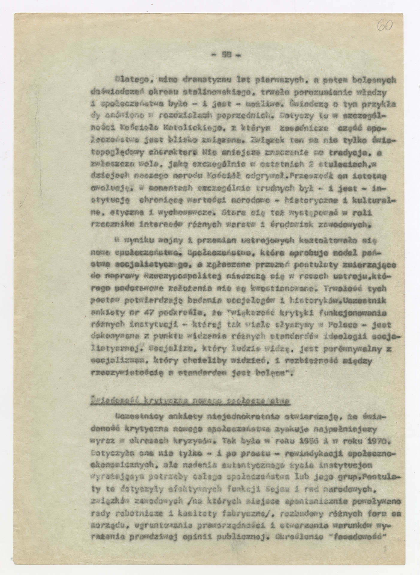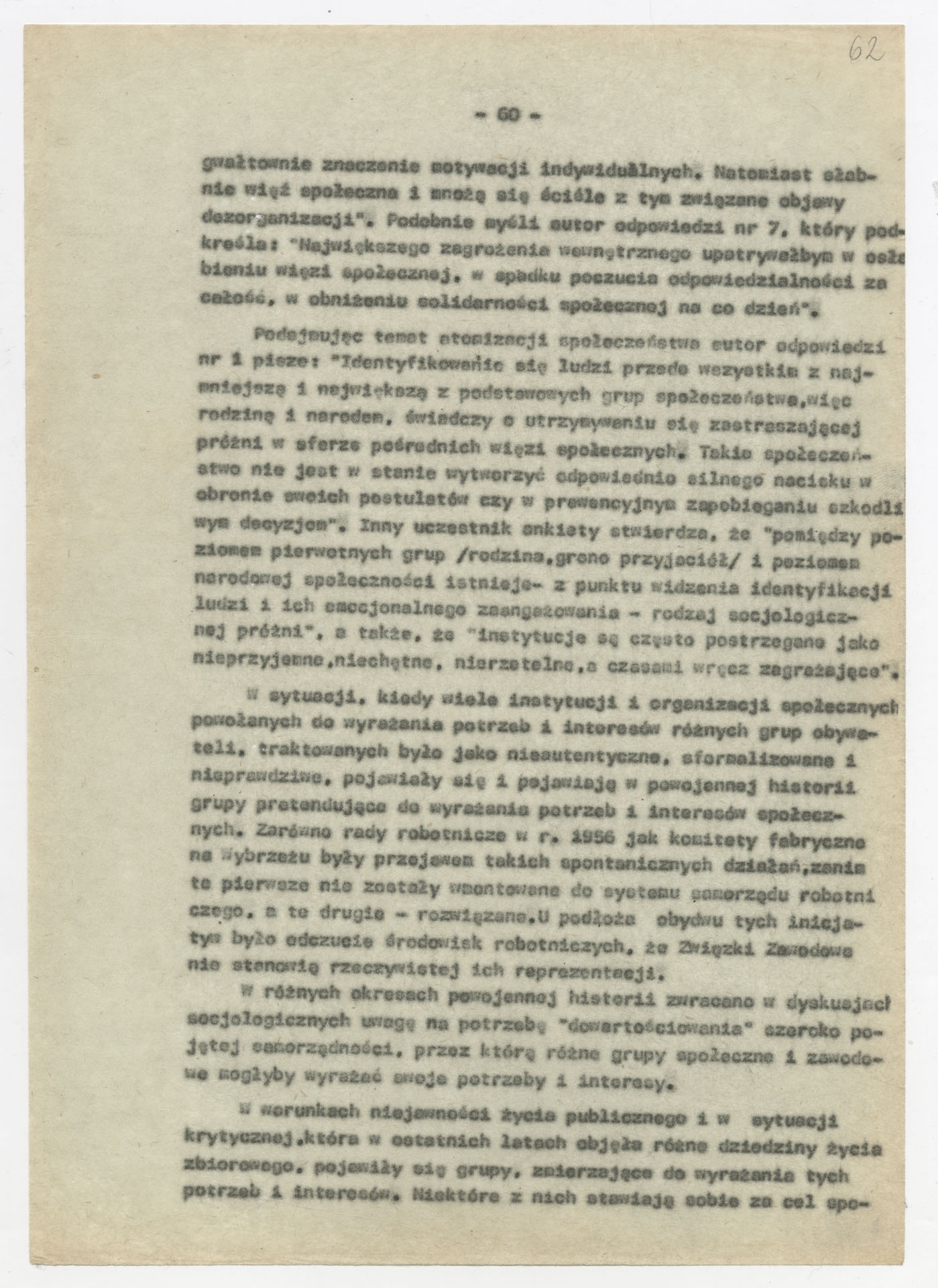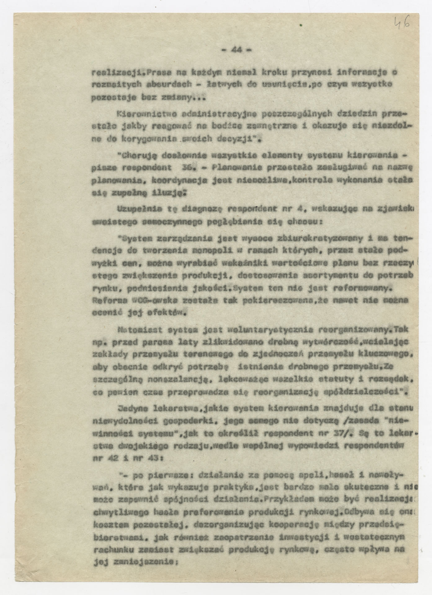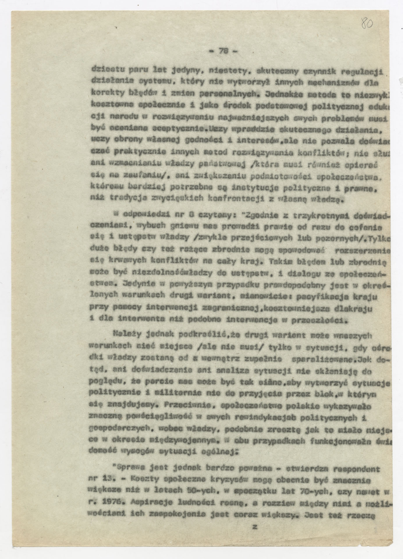 Maszynopis z opracowaniem wyników ankiety środowiskowej dotyczącej sytuacji społeczno-politycznej i kulturalnej w Polsce, związanej z pracami konwersatorium “Doświadczenie i przyszłość”. Tekst ma postać eseju analitycznego, podzielonego na części poświęcone diagnozie kryzysu gospodarczego, mechanizmom władzy, relacjom państwo-partia-społeczeństwo oraz kondycji środowisk twórczych i inteligenckich. Autorzy omawiają przyczyny narastającej frustracji i bierności, wskazują na niespójność oficjalnej polityki kulturalnej, centralizm decyzyjny i rozbieżność między deklaracjami a praktyką. W dalszych fragmentach formułują postulaty zmian: zwiększenia udziału obywateli w podejmowaniu decyzji, otwarcia debaty publicznej, odejścia od propagandowego języka i stworzenia realnych warunków rozwoju kultury. Dokument ma charakter roboczej ekspertyzy programowej, przygotowanej jako baza do dalszych dyskusji i działań.