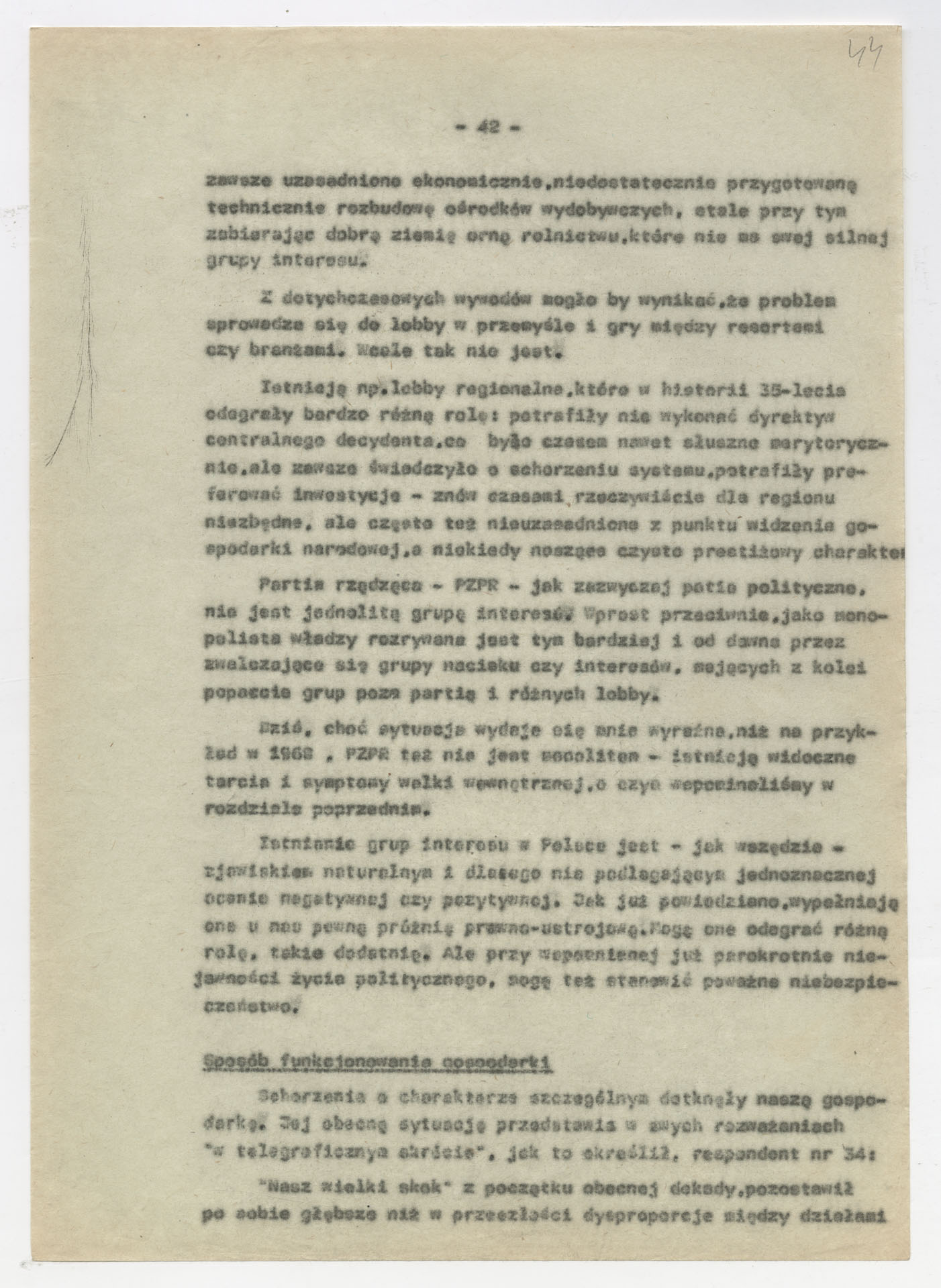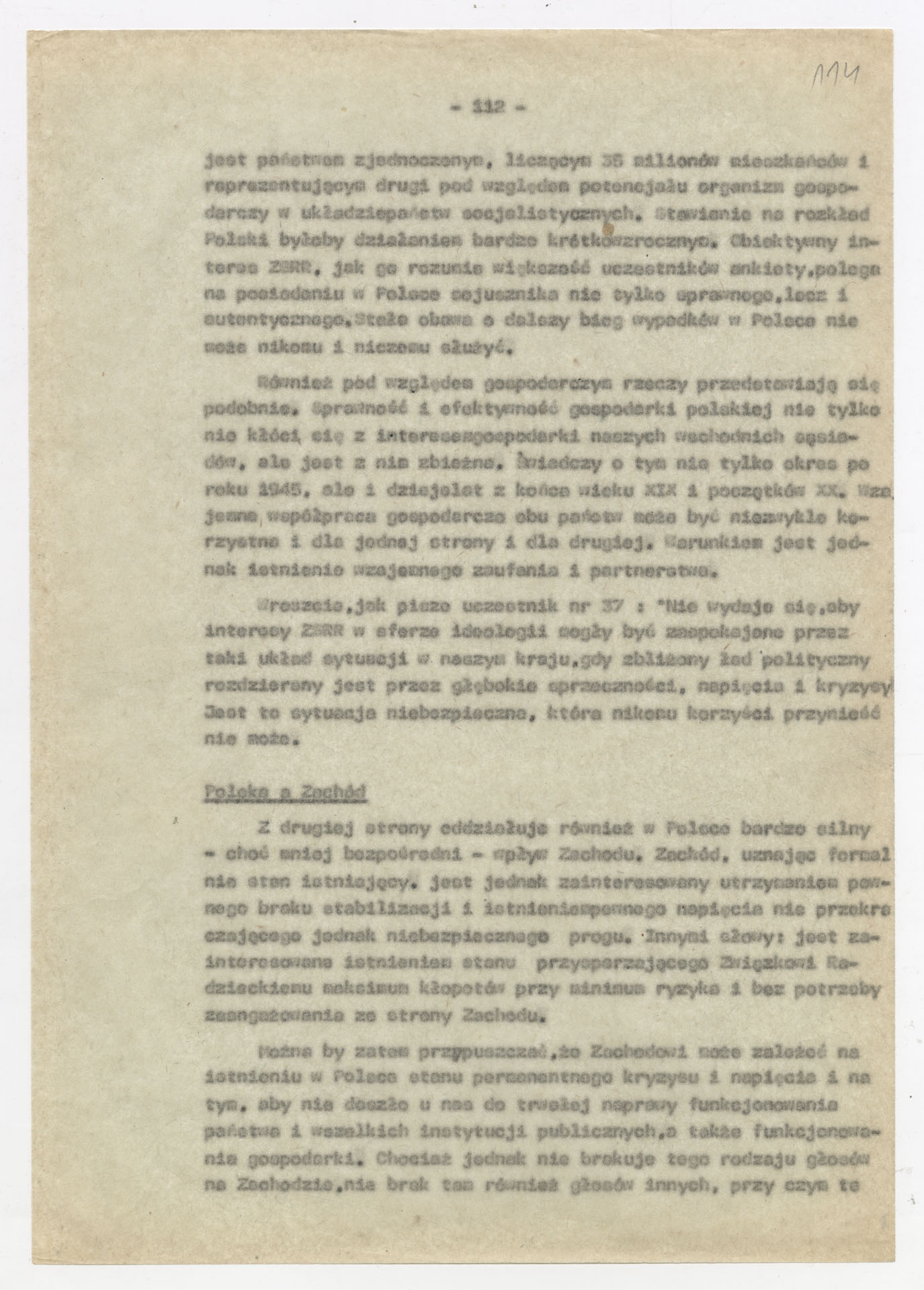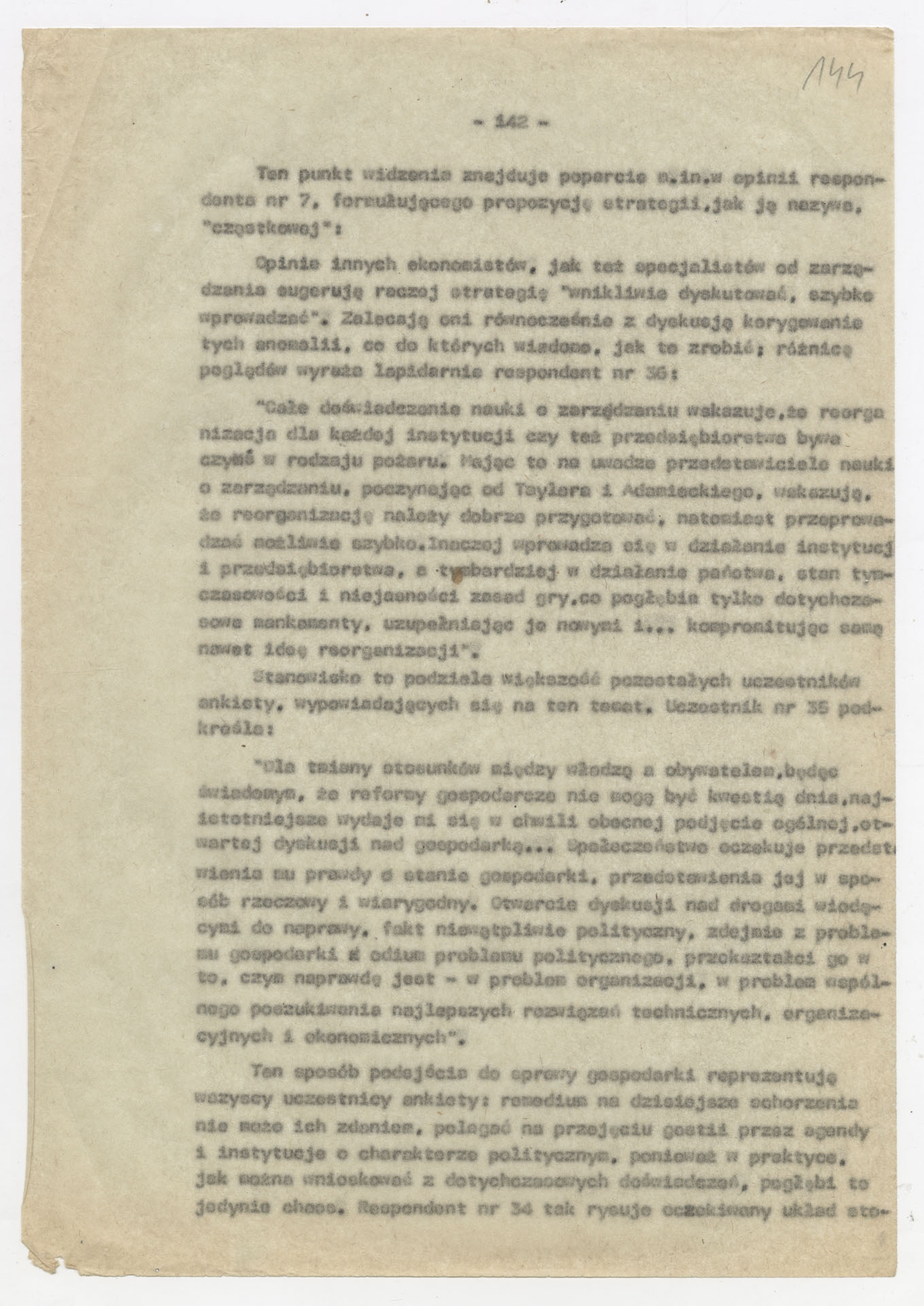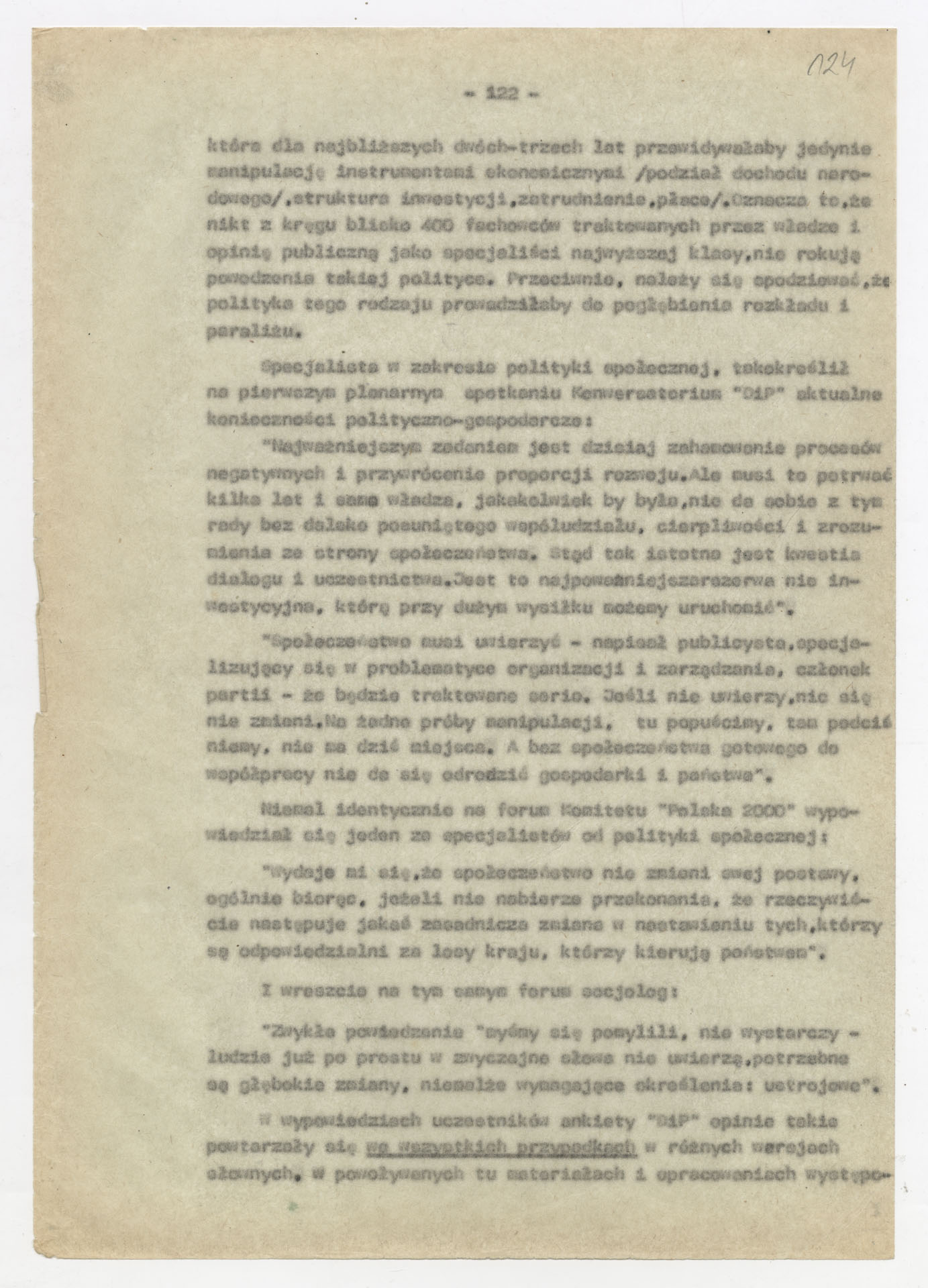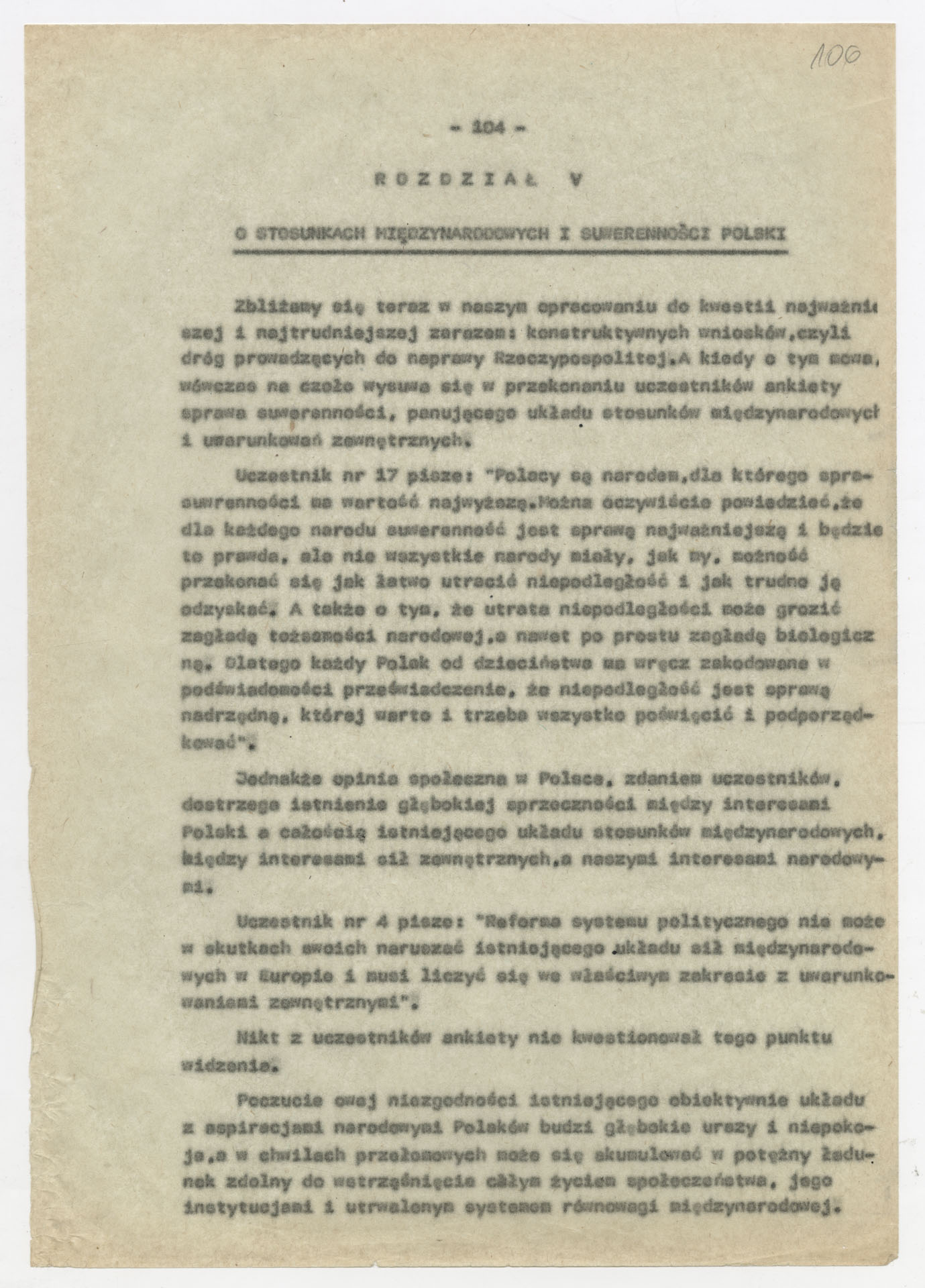 Maszynopis z opracowaniem wyników ankiety środowiskowej dotyczącej sytuacji społeczno-politycznej i kulturalnej w Polsce, związanej z pracami konwersatorium “Doświadczenie i przyszłość”. Tekst ma postać eseju analitycznego, podzielonego na części poświęcone diagnozie kryzysu gospodarczego, mechanizmom władzy, relacjom państwo-partia-społeczeństwo oraz kondycji środowisk twórczych i inteligenckich. Autorzy omawiają przyczyny narastającej frustracji i bierności, wskazują na niespójność oficjalnej polityki kulturalnej, centralizm decyzyjny i rozbieżność między deklaracjami a praktyką. W dalszych fragmentach formułują postulaty zmian: zwiększenia udziału obywateli w podejmowaniu decyzji, otwarcia debaty publicznej, odejścia od propagandowego języka i stworzenia realnych warunków rozwoju kultury. Dokument ma charakter roboczej ekspertyzy programowej, przygotowanej jako baza do dalszych dyskusji i działań.