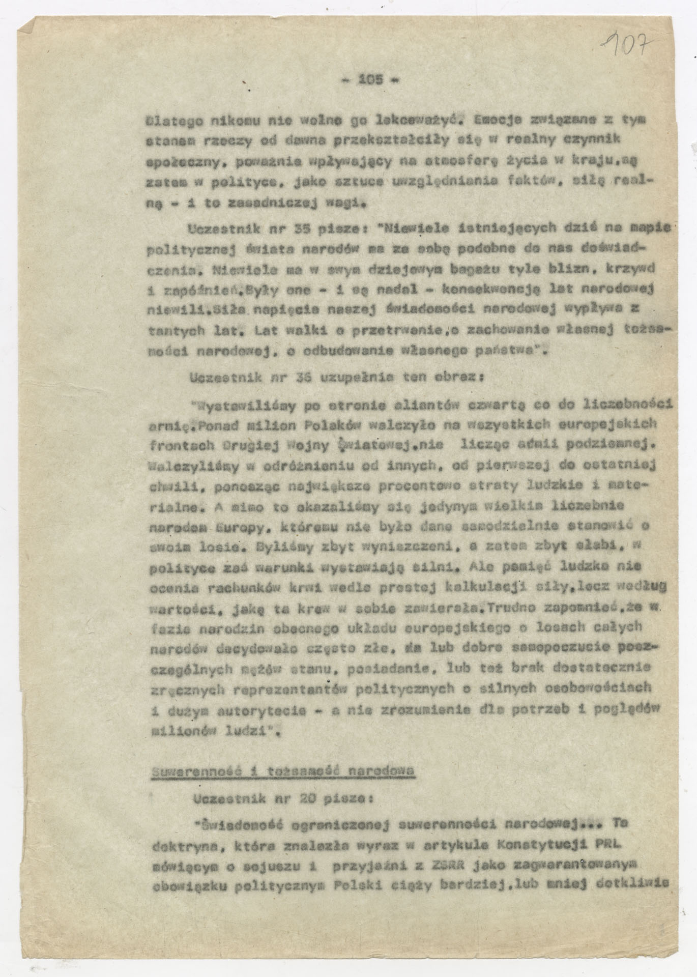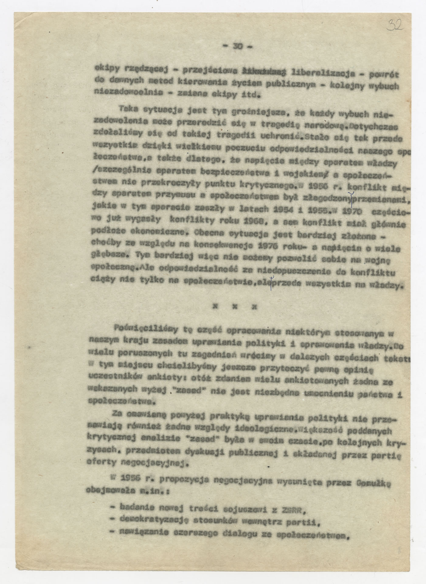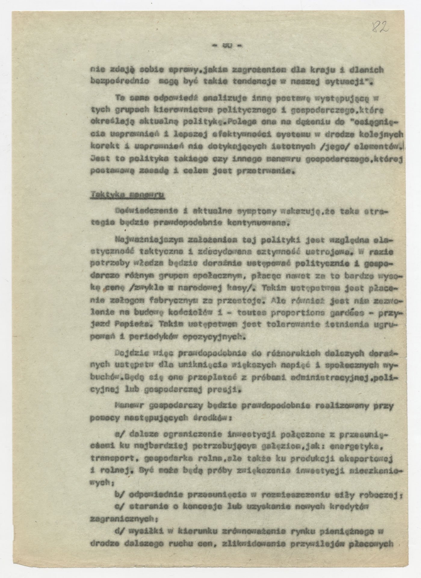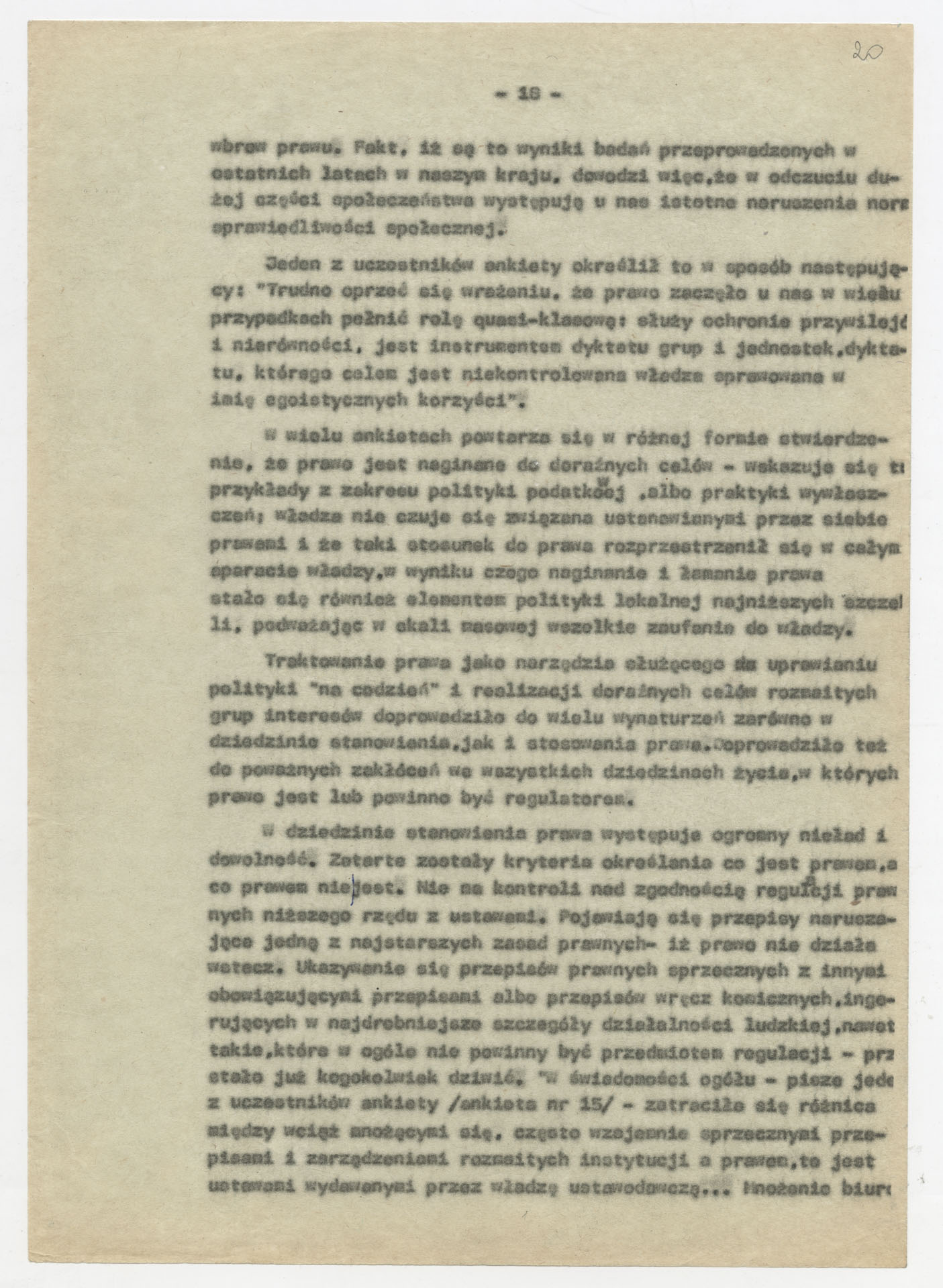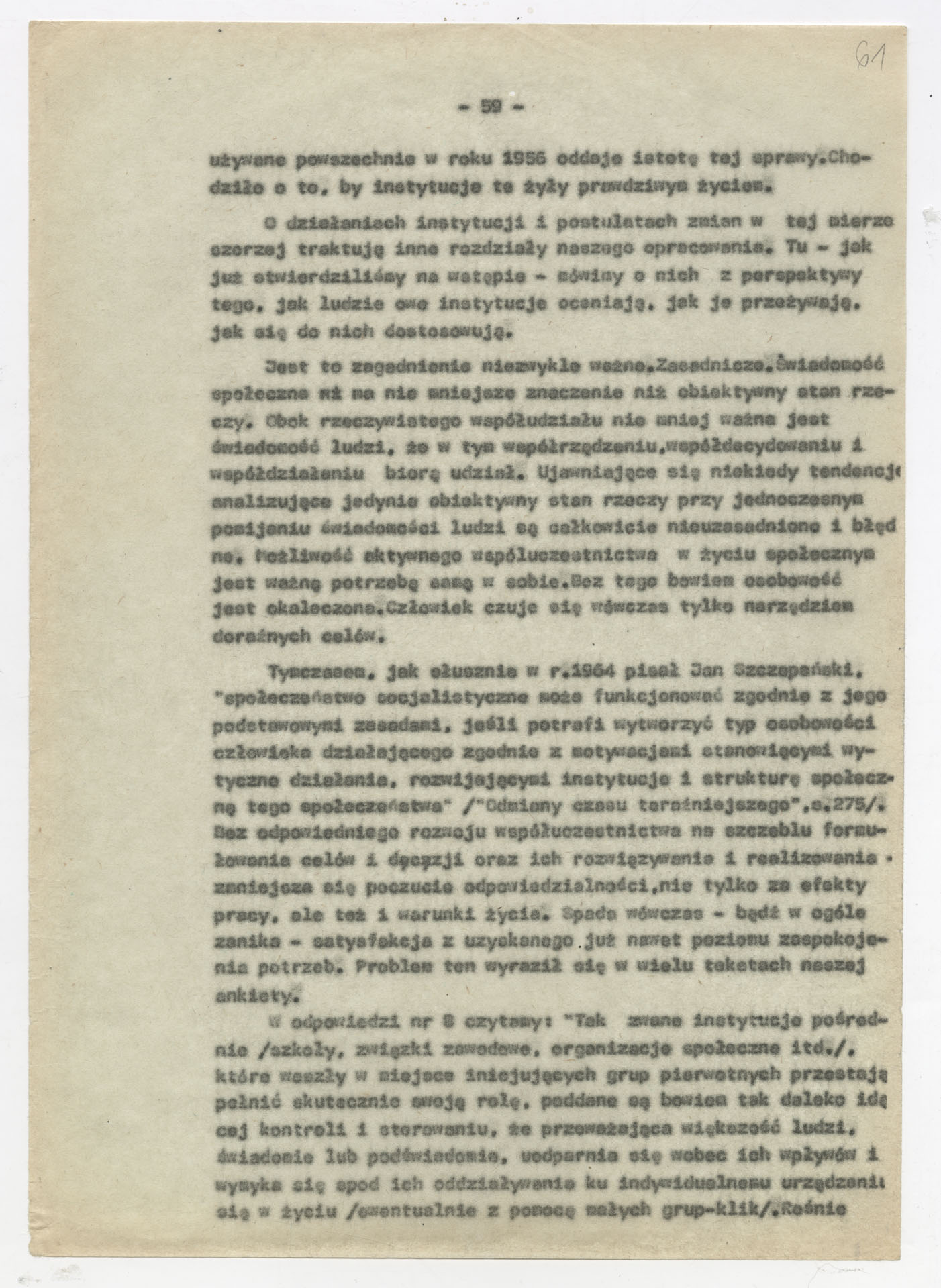 Maszynopis z opracowaniem wyników ankiety środowiskowej dotyczącej sytuacji społeczno-politycznej i kulturalnej w Polsce, związanej z pracami konwersatorium “Doświadczenie i przyszłość”. Tekst ma postać eseju analitycznego, podzielonego na części poświęcone diagnozie kryzysu gospodarczego, mechanizmom władzy, relacjom państwo-partia-społeczeństwo oraz kondycji środowisk twórczych i inteligenckich. Autorzy omawiają przyczyny narastającej frustracji i bierności, wskazują na niespójność oficjalnej polityki kulturalnej, centralizm decyzyjny i rozbieżność między deklaracjami a praktyką. W dalszych fragmentach formułują postulaty zmian: zwiększenia udziału obywateli w podejmowaniu decyzji, otwarcia debaty publicznej, odejścia od propagandowego języka i stworzenia realnych warunków rozwoju kultury. Dokument ma charakter roboczej ekspertyzy programowej, przygotowanej jako baza do dalszych dyskusji i działań.