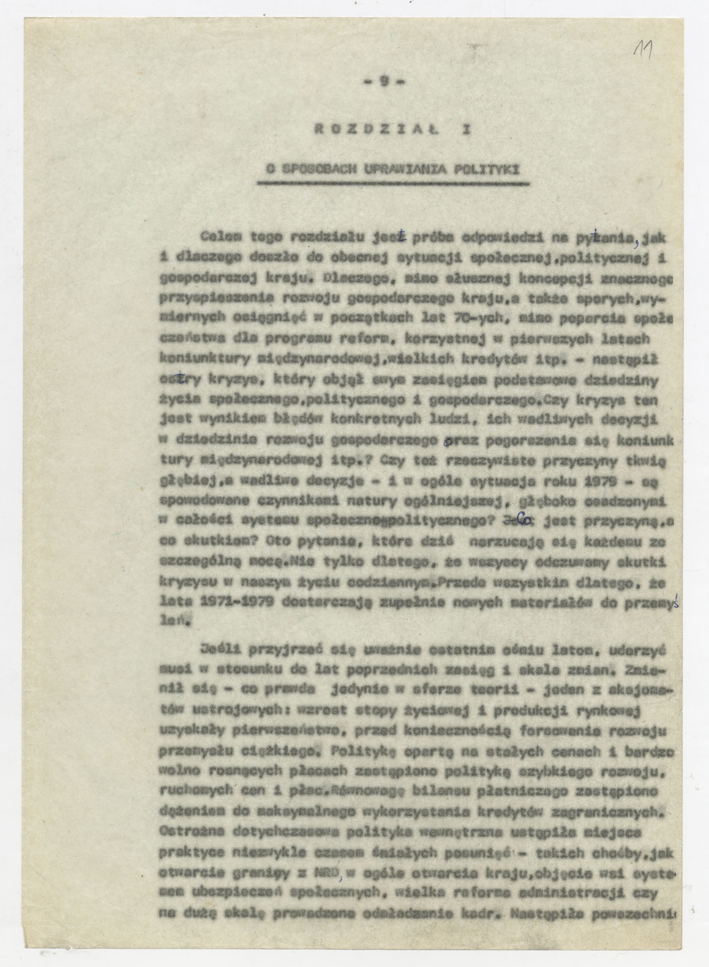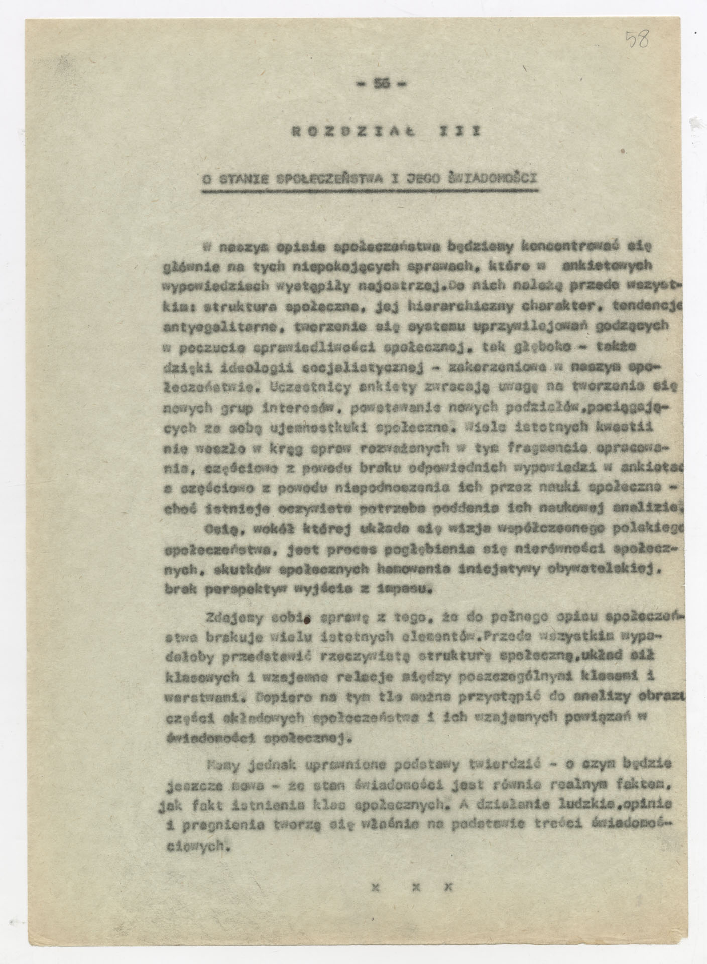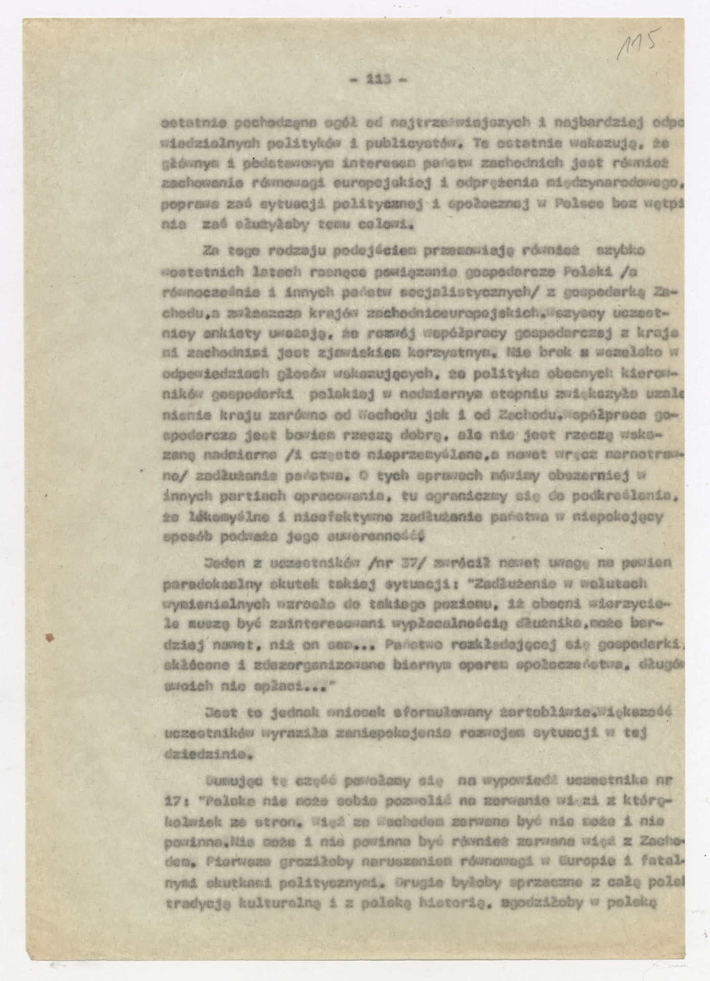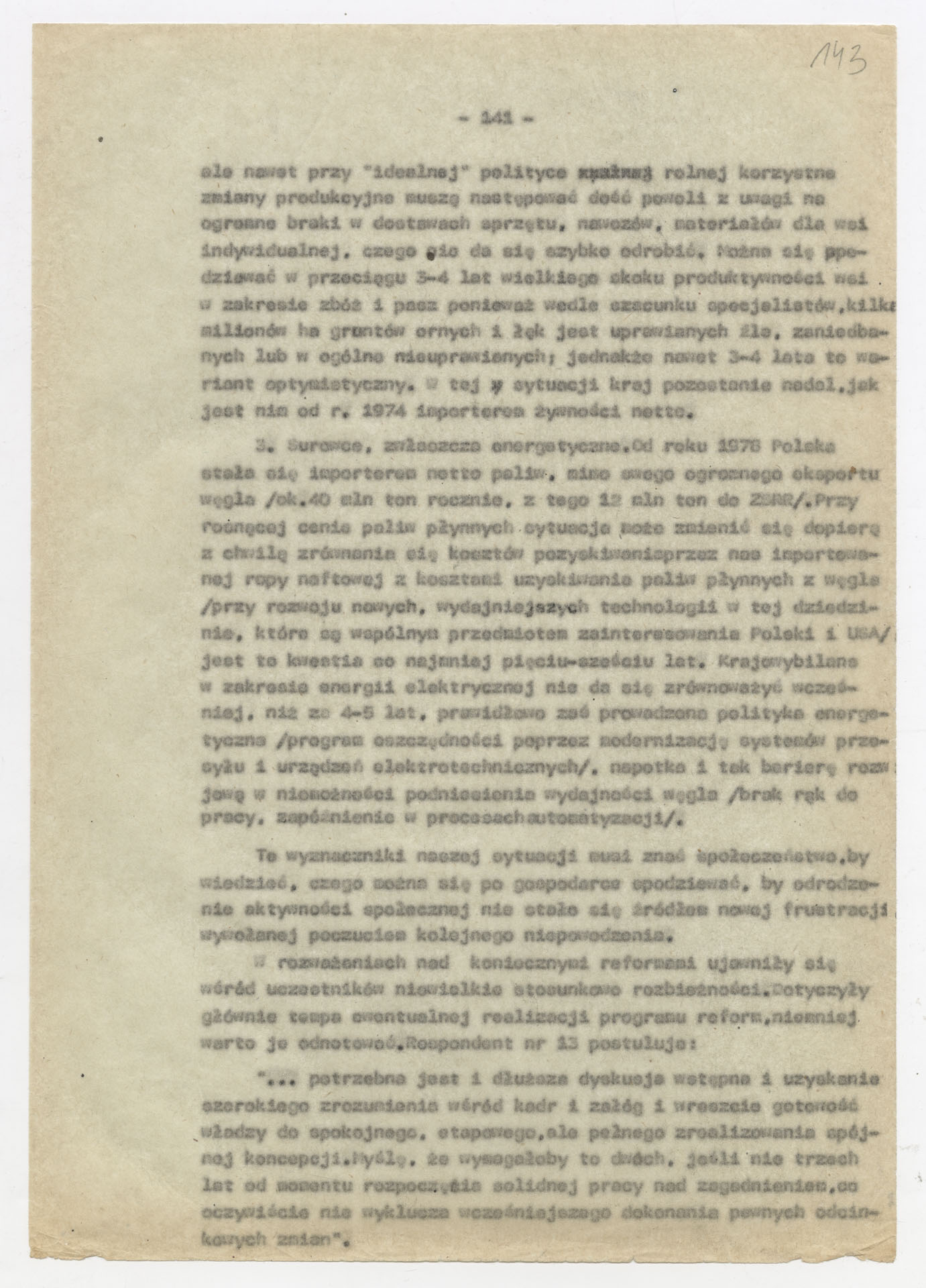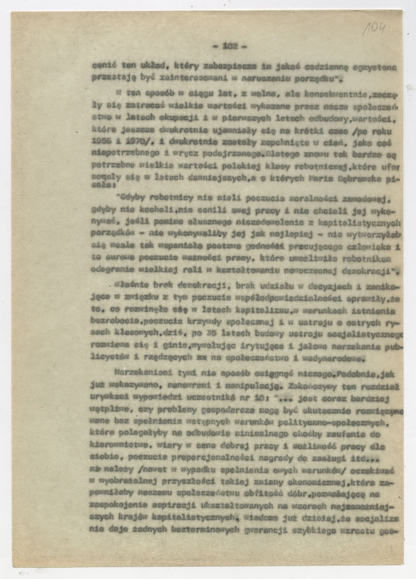 Maszynopis z opracowaniem wyników ankiety środowiskowej dotyczącej sytuacji społeczno-politycznej i kulturalnej w Polsce, związanej z pracami konwersatorium “Doświadczenie i przyszłość”. Tekst ma postać eseju analitycznego, podzielonego na części poświęcone diagnozie kryzysu gospodarczego, mechanizmom władzy, relacjom państwo-partia-społeczeństwo oraz kondycji środowisk twórczych i inteligenckich. Autorzy omawiają przyczyny narastającej frustracji i bierności, wskazują na niespójność oficjalnej polityki kulturalnej, centralizm decyzyjny i rozbieżność między deklaracjami a praktyką. W dalszych fragmentach formułują postulaty zmian: zwiększenia udziału obywateli w podejmowaniu decyzji, otwarcia debaty publicznej, odejścia od propagandowego języka i stworzenia realnych warunków rozwoju kultury. Dokument ma charakter roboczej ekspertyzy programowej, przygotowanej jako baza do dalszych dyskusji i działań.