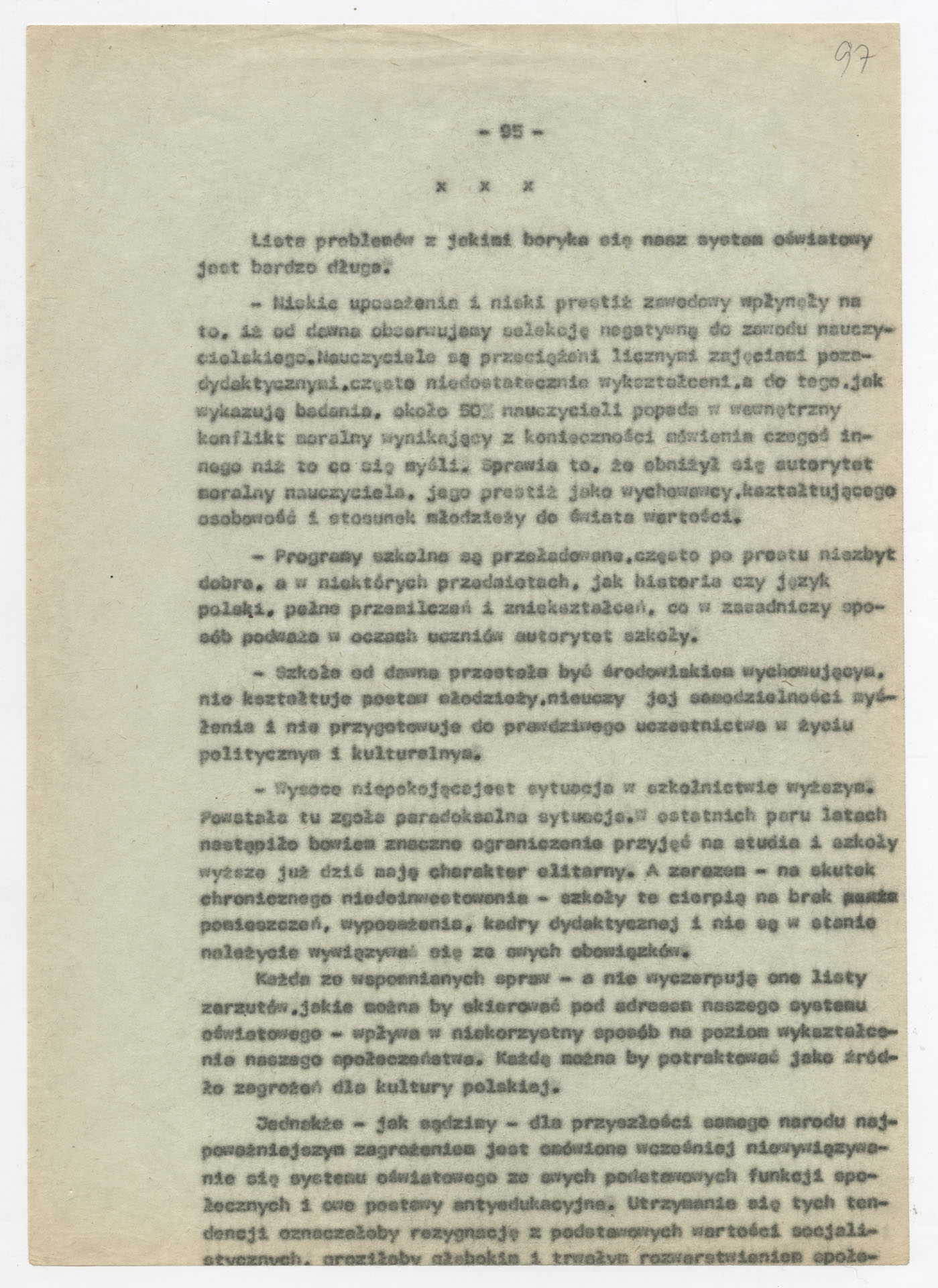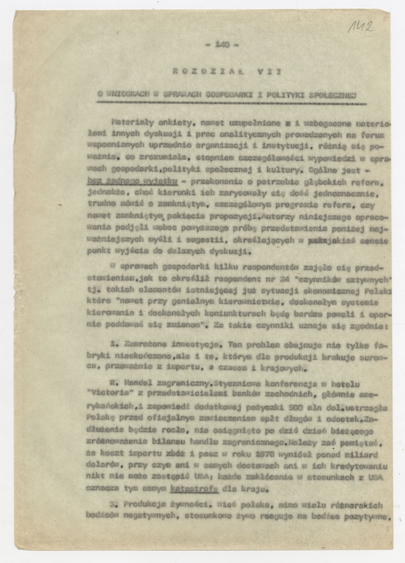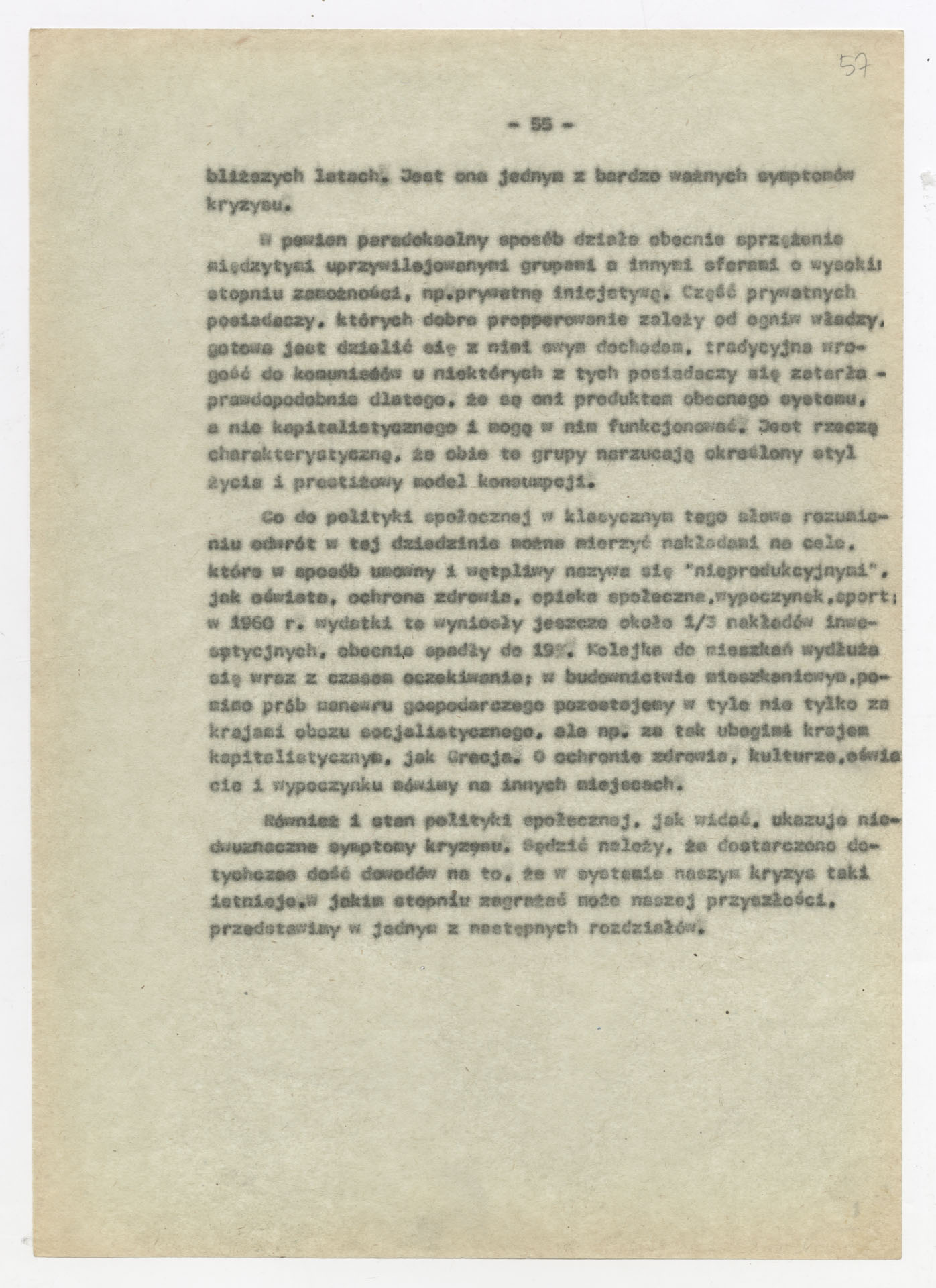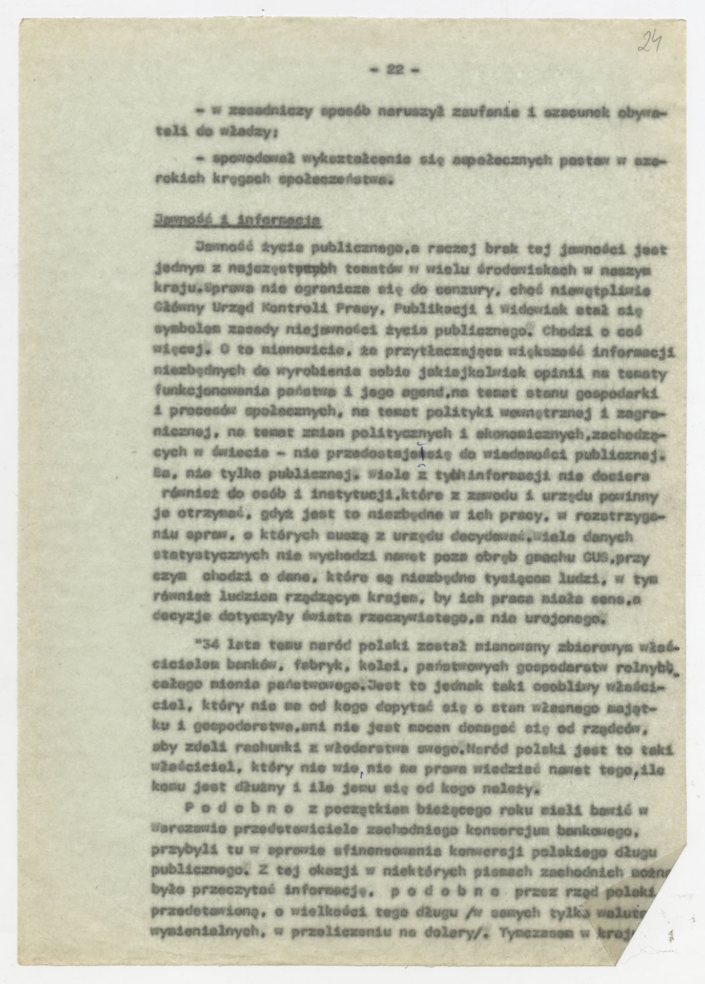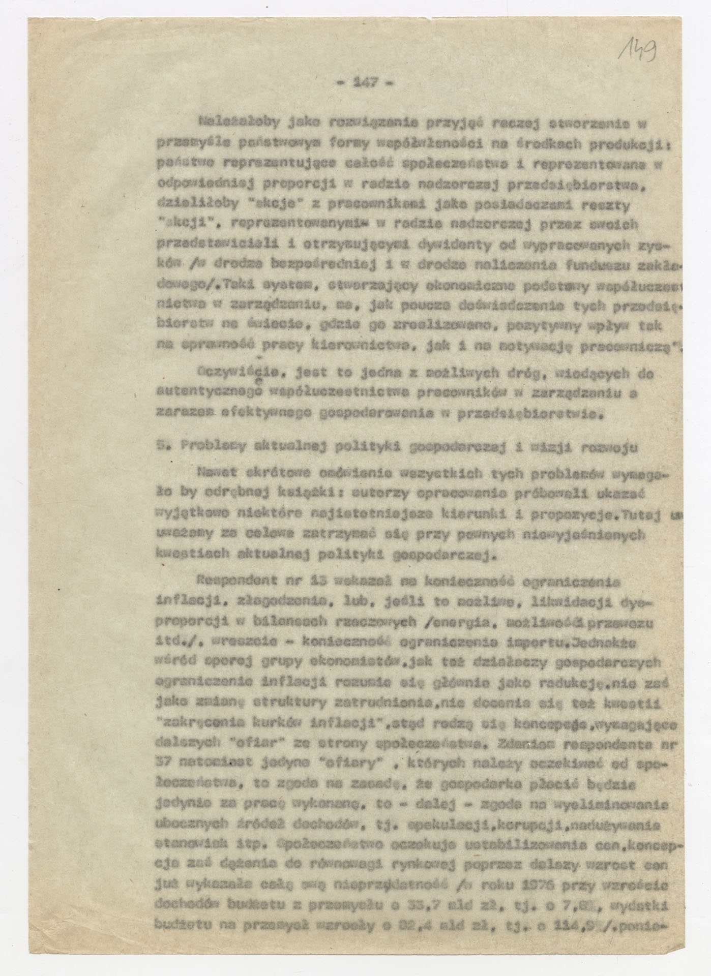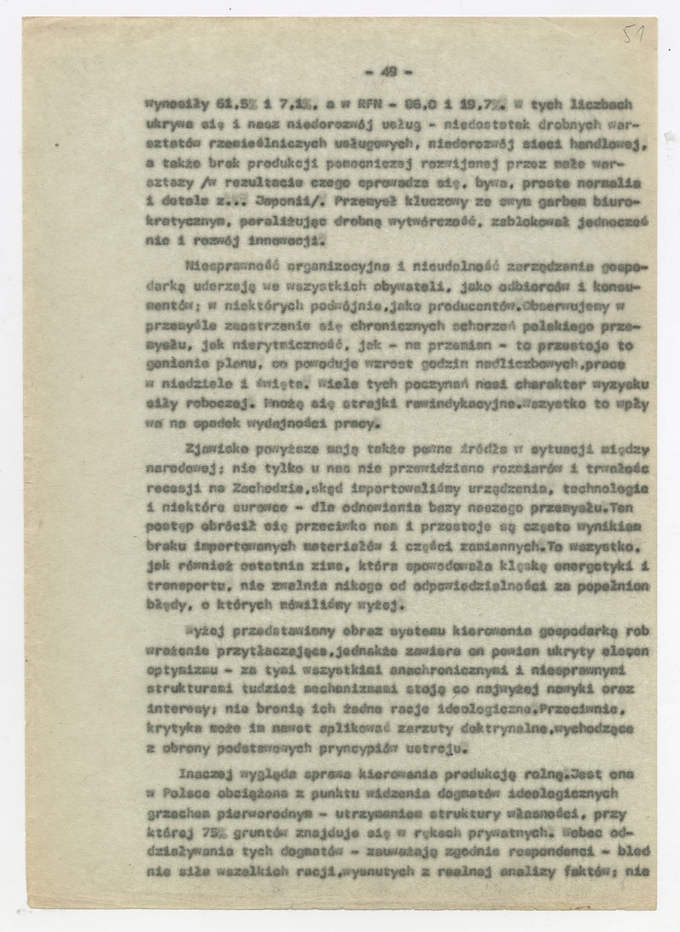Maszynopis z opracowaniem wyników ankiety środowiskowej dotyczącej sytuacji społeczno-politycznej i kulturalnej w Polsce, związanej z pracami konwersatorium “Doświadczenie i przyszłość”. Tekst ma postać eseju analitycznego, podzielonego na części poświęcone diagnozie kryzysu gospodarczego, mechanizmom władzy, relacjom państwo-partia-społeczeństwo oraz kondycji środowisk twórczych i inteligenckich. Autorzy omawiają przyczyny narastającej frustracji i bierności, wskazują na niespójność oficjalnej polityki kulturalnej, centralizm decyzyjny i rozbieżność między deklaracjami a praktyką. W dalszych fragmentach formułują postulaty zmian: zwiększenia udziału obywateli w podejmowaniu decyzji, otwarcia debaty publicznej, odejścia od propagandowego języka i stworzenia realnych warunków rozwoju kultury. Dokument ma charakter roboczej ekspertyzy programowej, przygotowanej jako baza do dalszych dyskusji i działań.