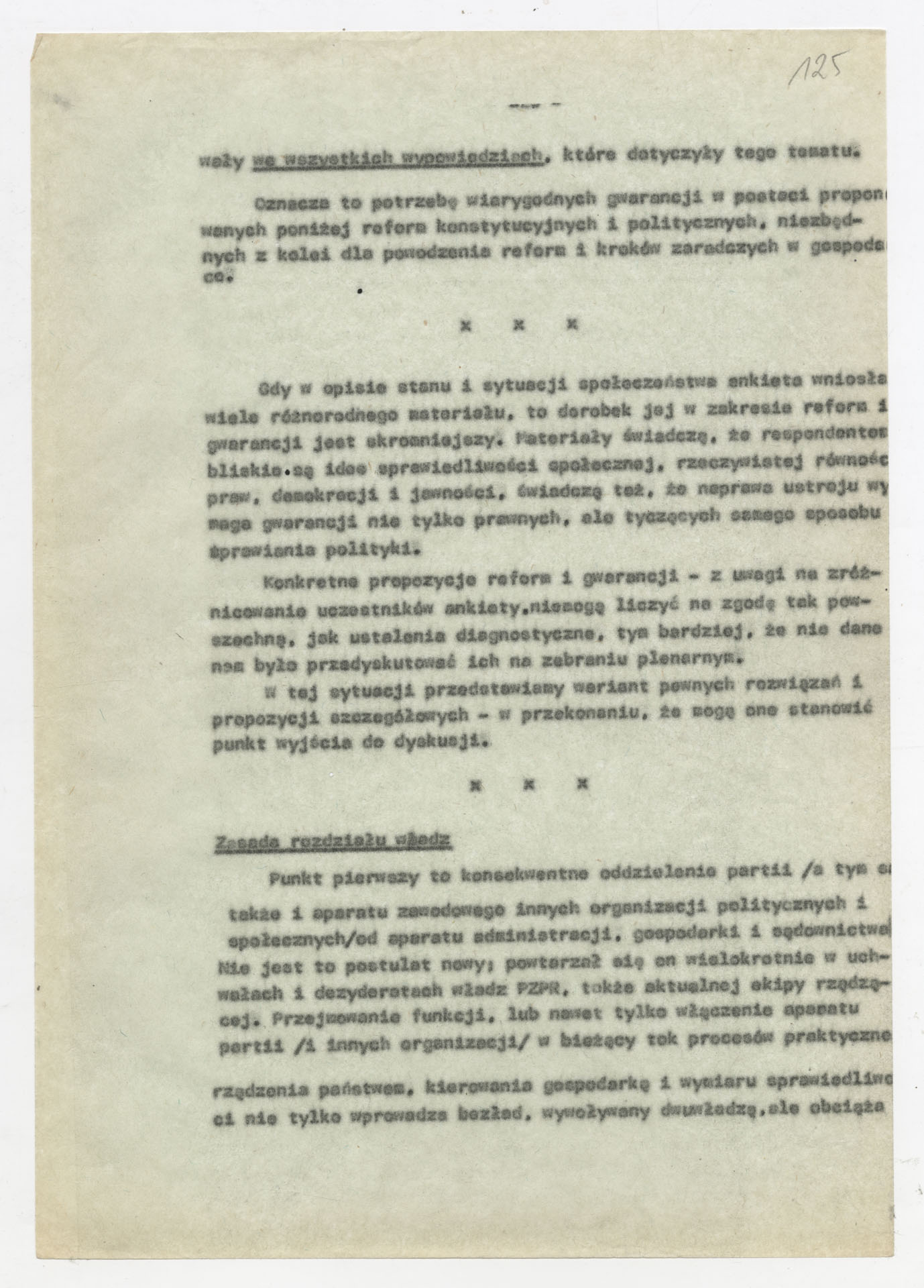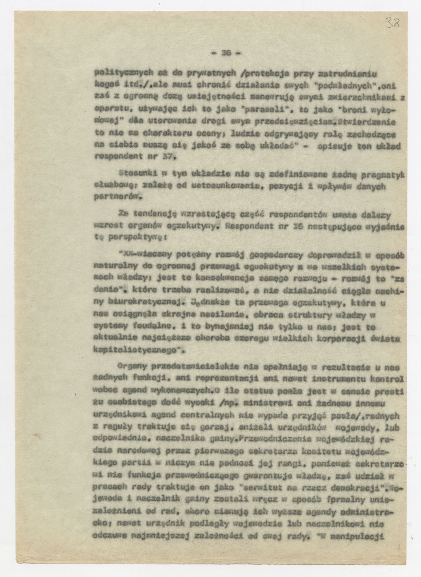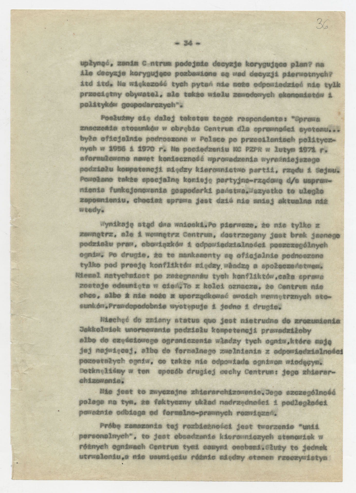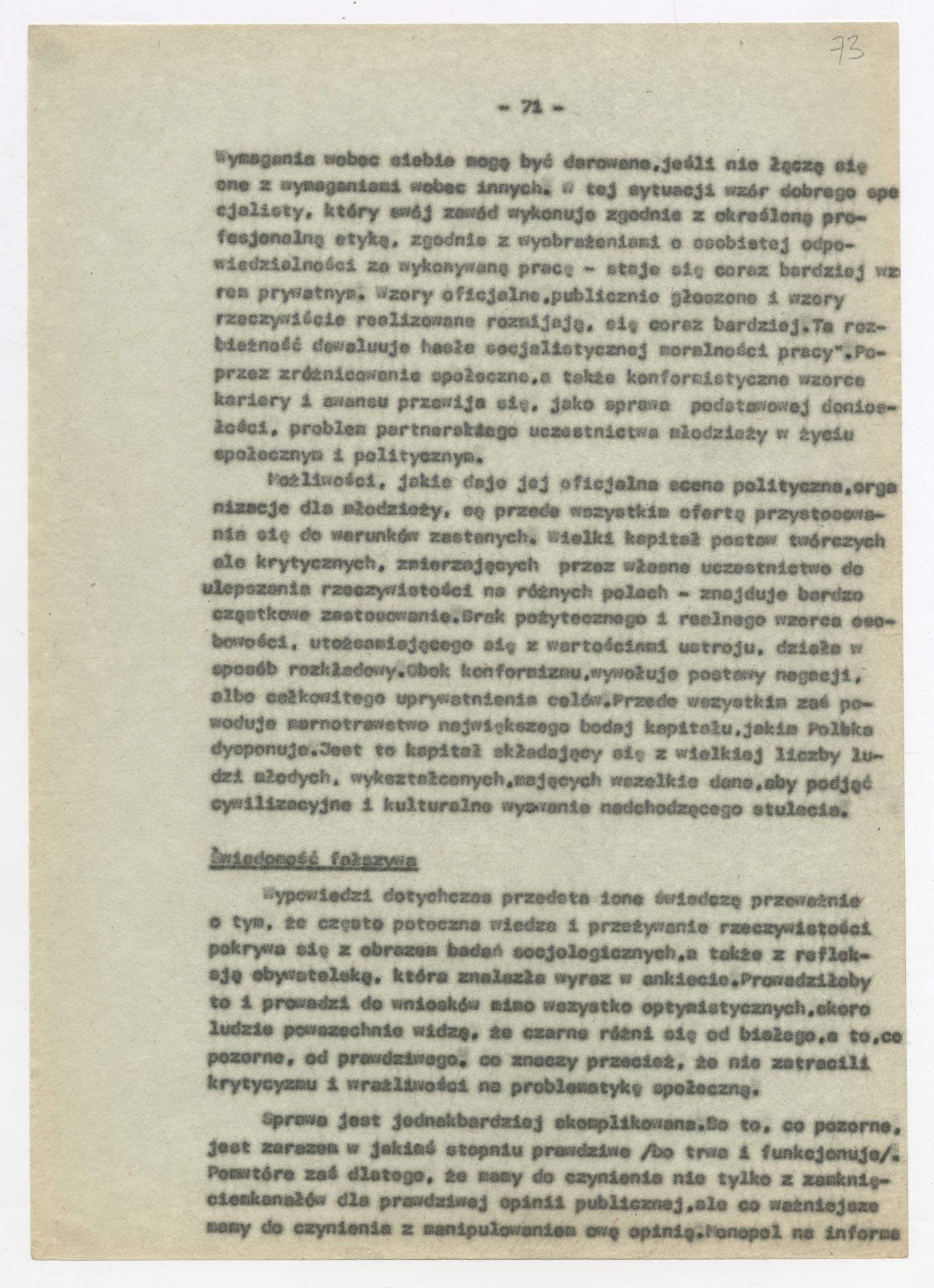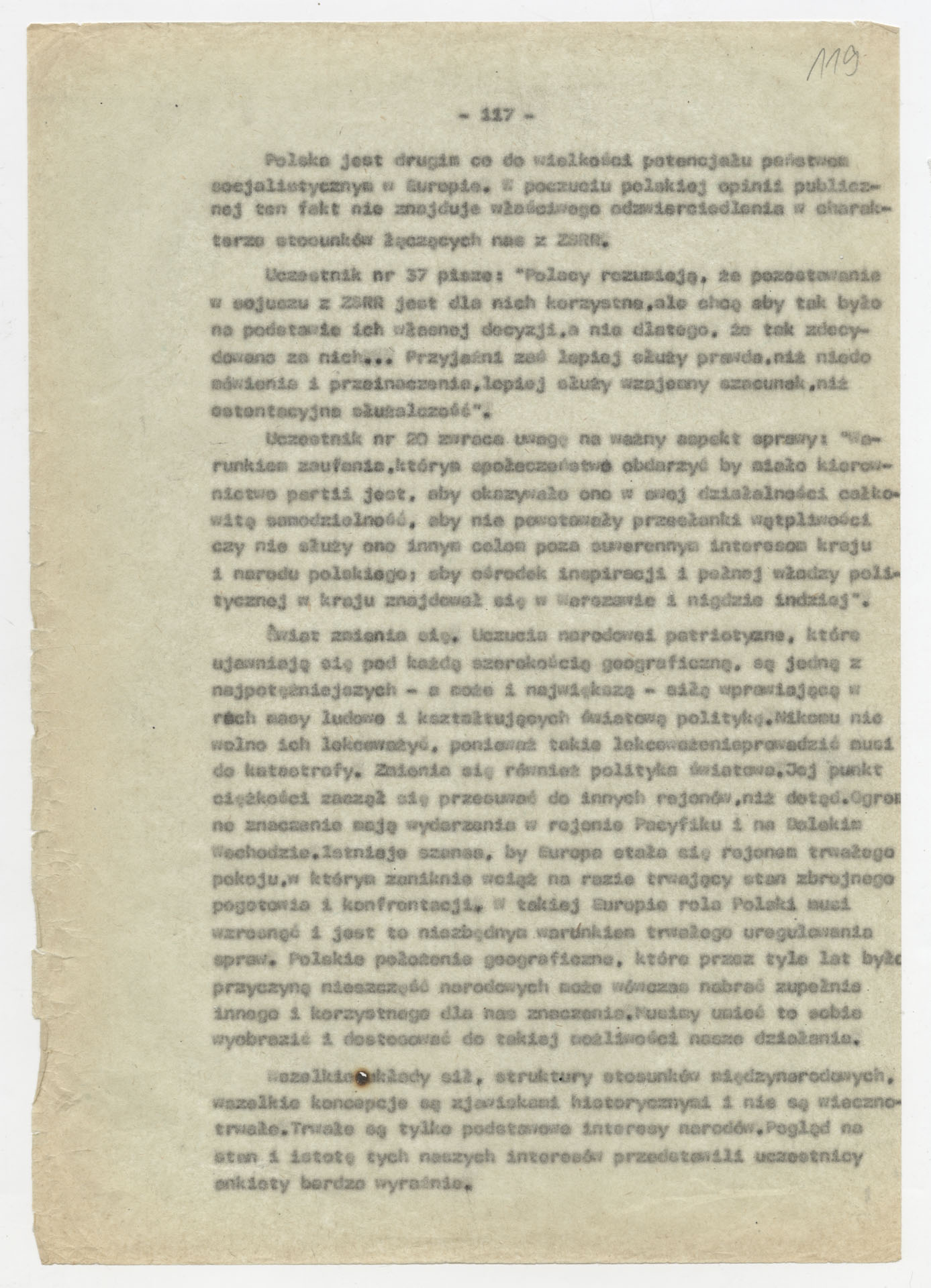 Maszynopis z opracowaniem wyników ankiety środowiskowej dotyczącej sytuacji społeczno-politycznej i kulturalnej w Polsce, związanej z pracami konwersatorium “Doświadczenie i przyszłość”. Tekst ma postać eseju analitycznego, podzielonego na części poświęcone diagnozie kryzysu gospodarczego, mechanizmom władzy, relacjom państwo-partia-społeczeństwo oraz kondycji środowisk twórczych i inteligenckich. Autorzy omawiają przyczyny narastającej frustracji i bierności, wskazują na niespójność oficjalnej polityki kulturalnej, centralizm decyzyjny i rozbieżność między deklaracjami a praktyką. W dalszych fragmentach formułują postulaty zmian: zwiększenia udziału obywateli w podejmowaniu decyzji, otwarcia debaty publicznej, odejścia od propagandowego języka i stworzenia realnych warunków rozwoju kultury. Dokument ma charakter roboczej ekspertyzy programowej, przygotowanej jako baza do dalszych dyskusji i działań.